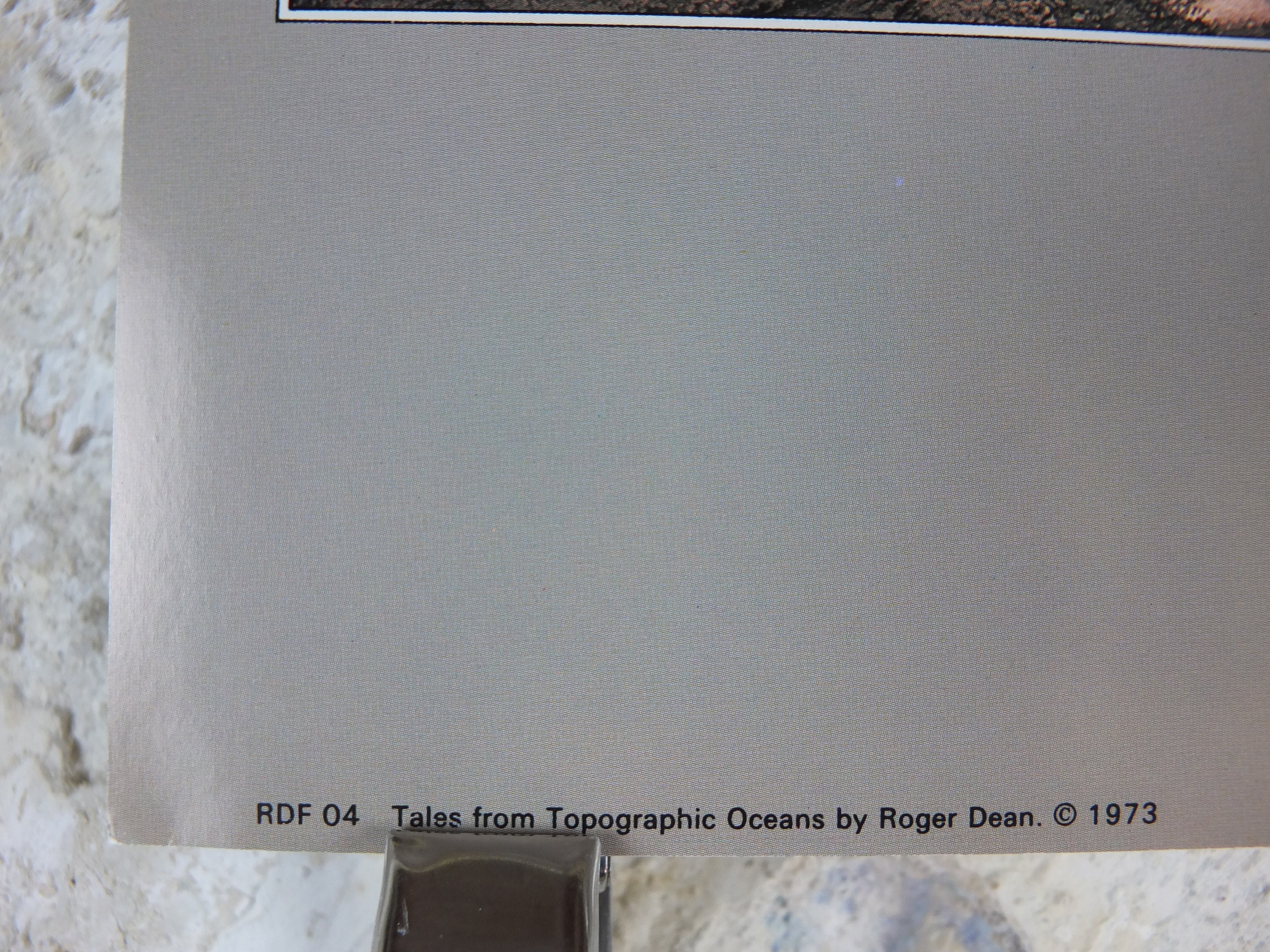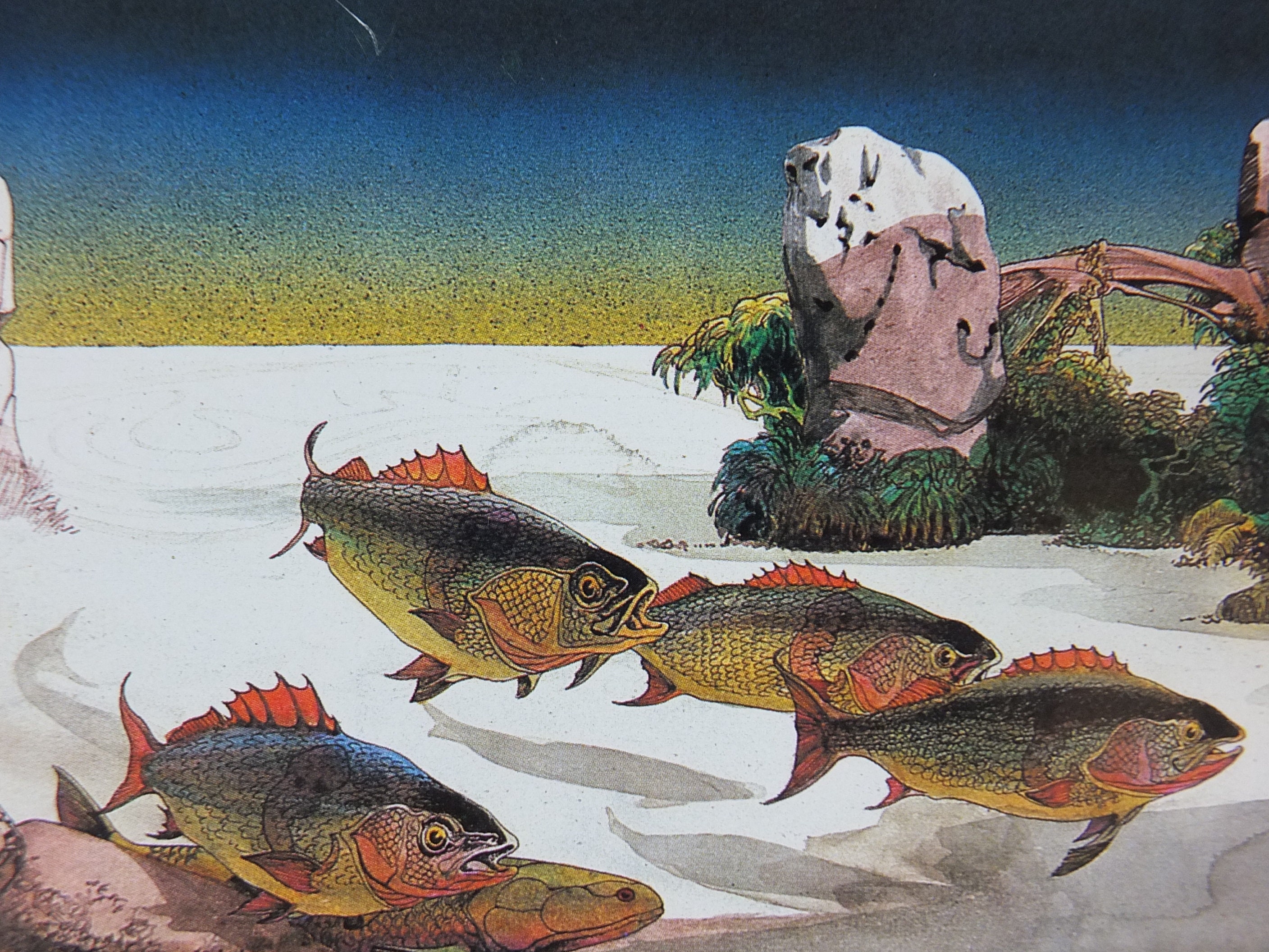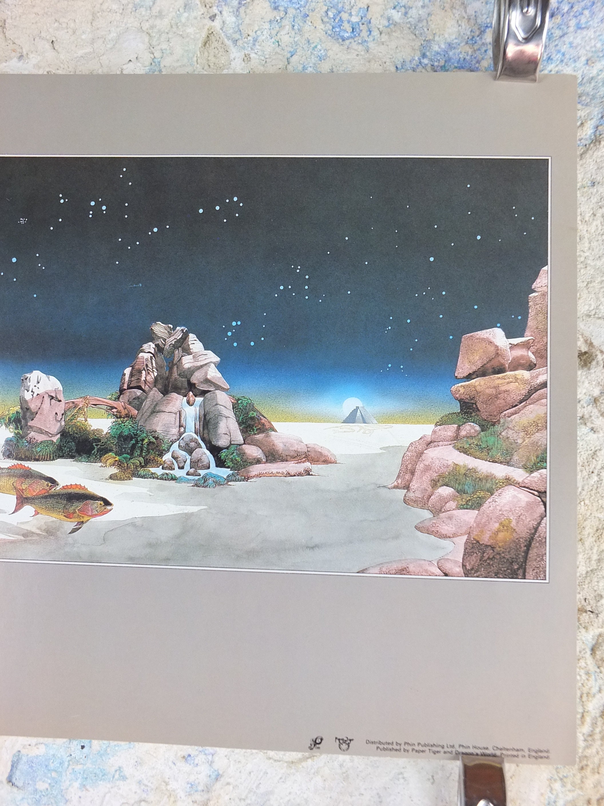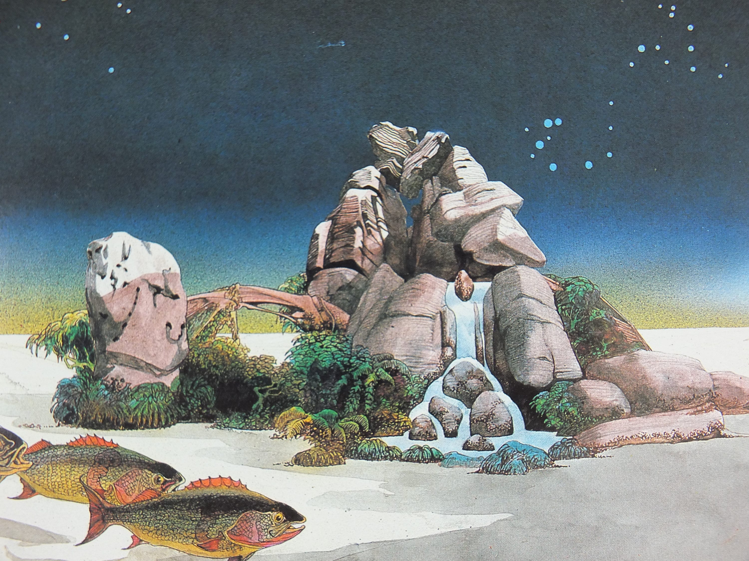 This is a poster from 1973 by Roger Dean showing fish swimming without water along a liquidless landscape apart from a waterfall. In the distance, a moon rises over a pyramid.