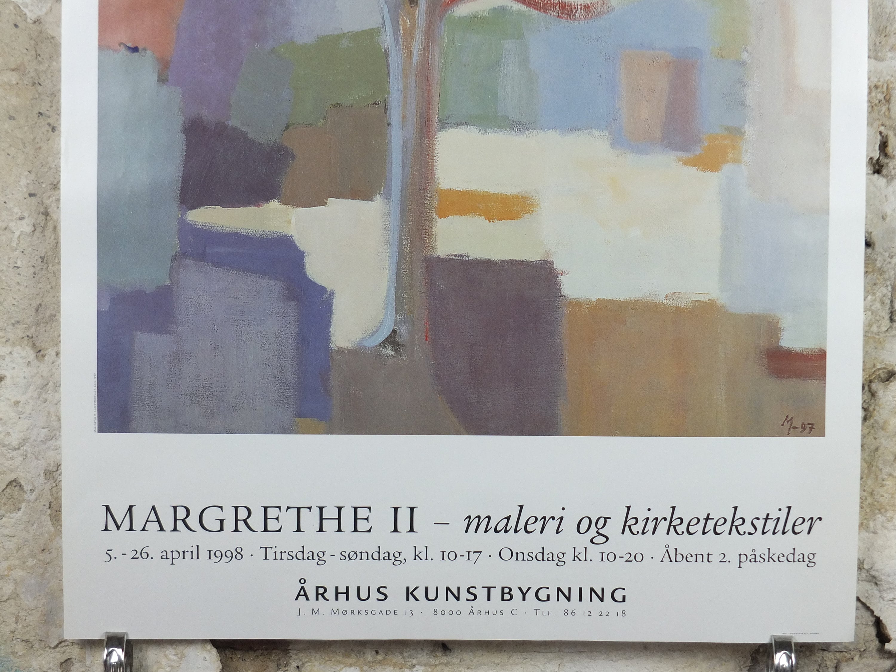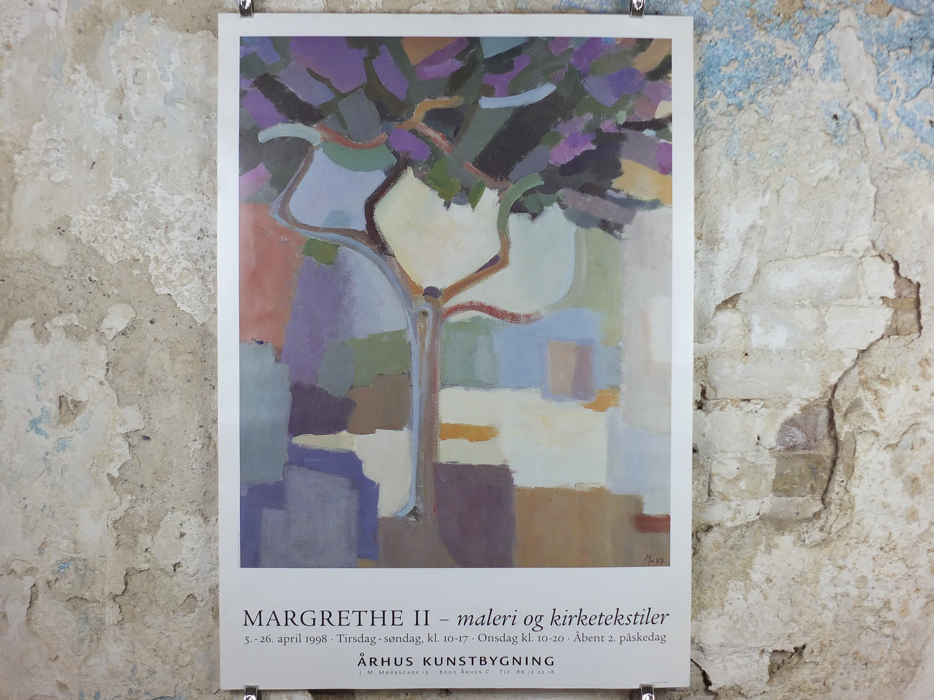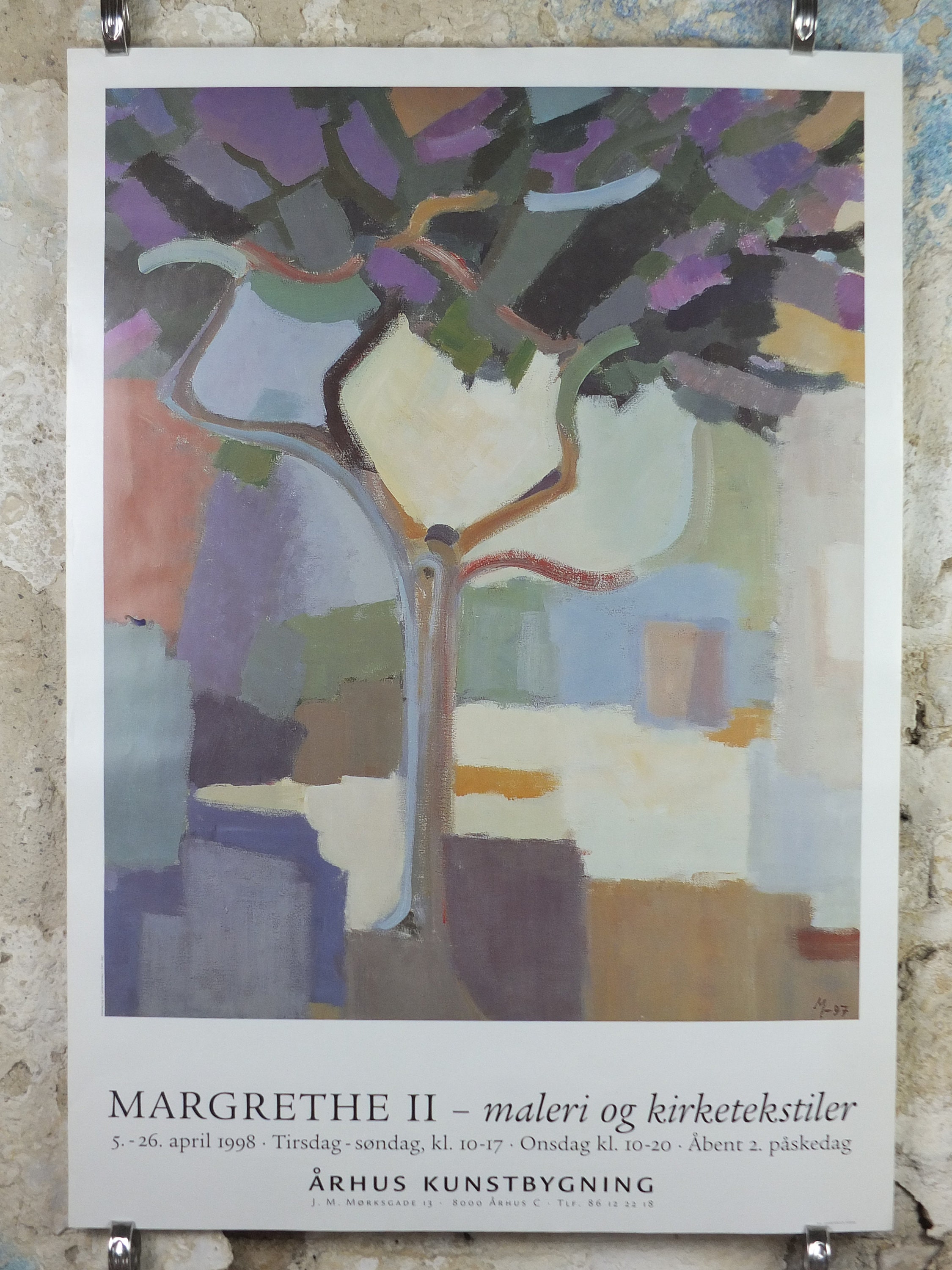 This exhibition poster for a 1998 exhibition by Queen Margaret 2, the queen of Denmark at the Aarhus arthouse featuring her painting and church textiles. This image is named "Lagerstromia" the genus of the Crepe Myrtle tree, on a patchwork pastel background.