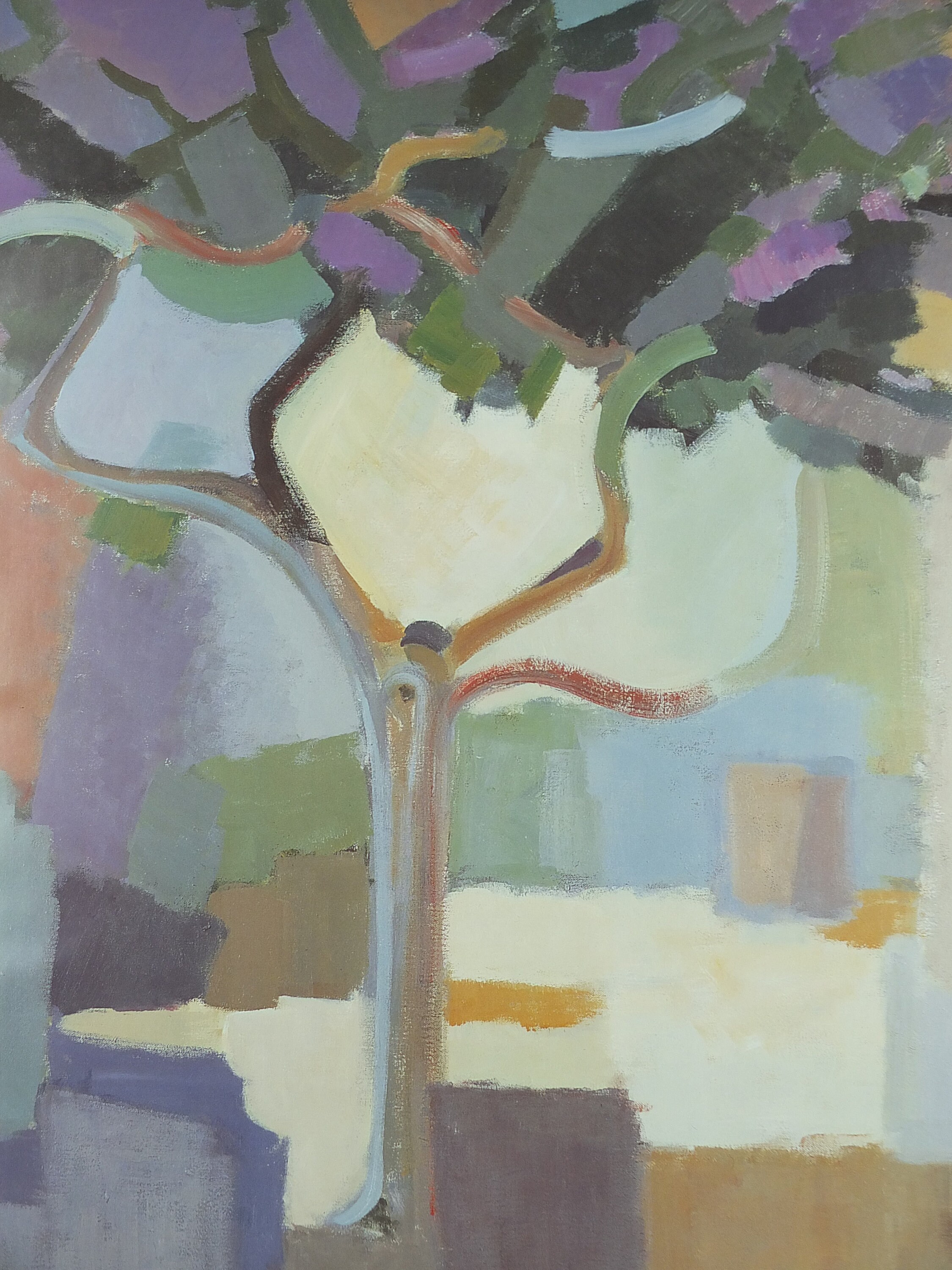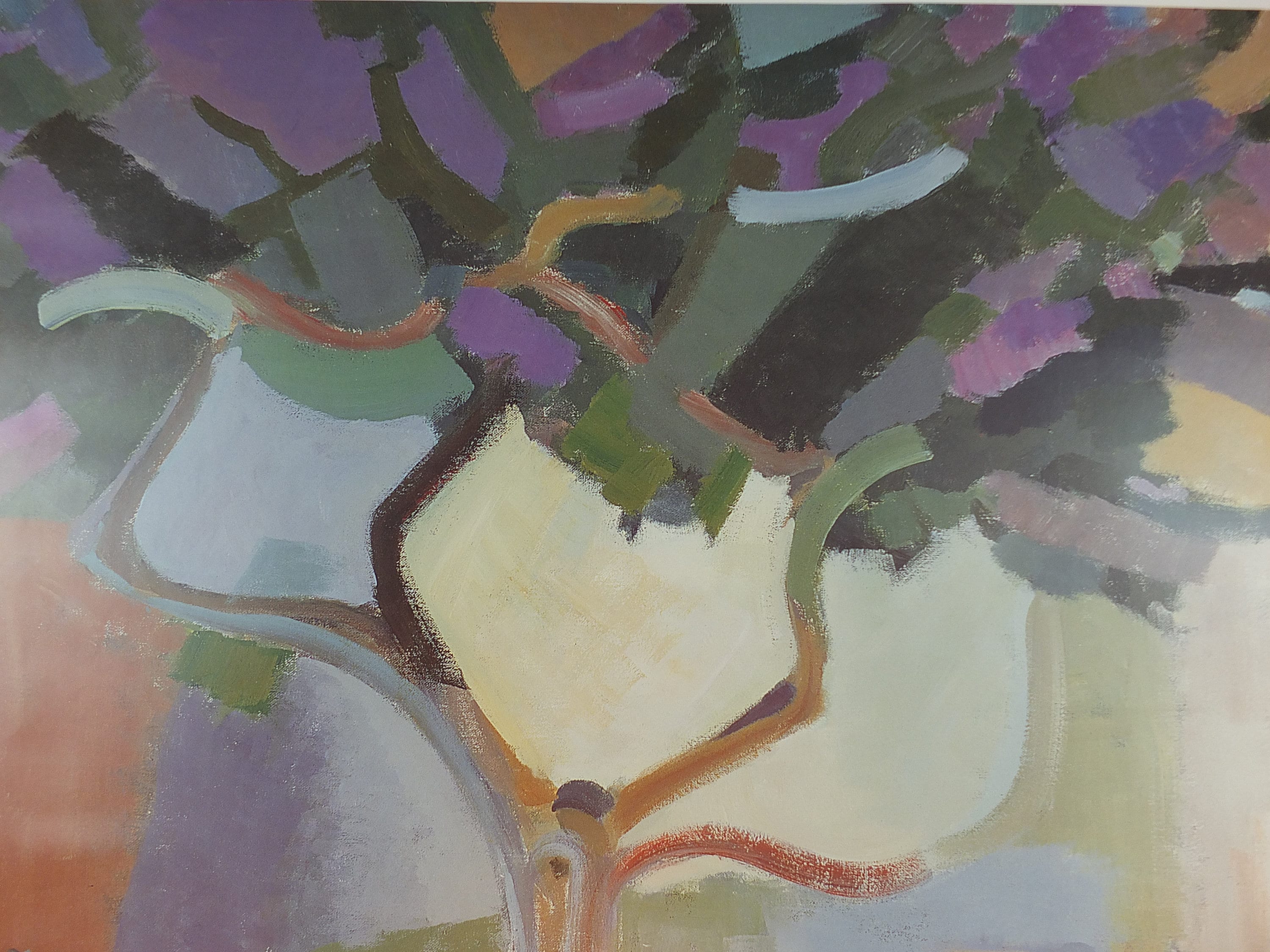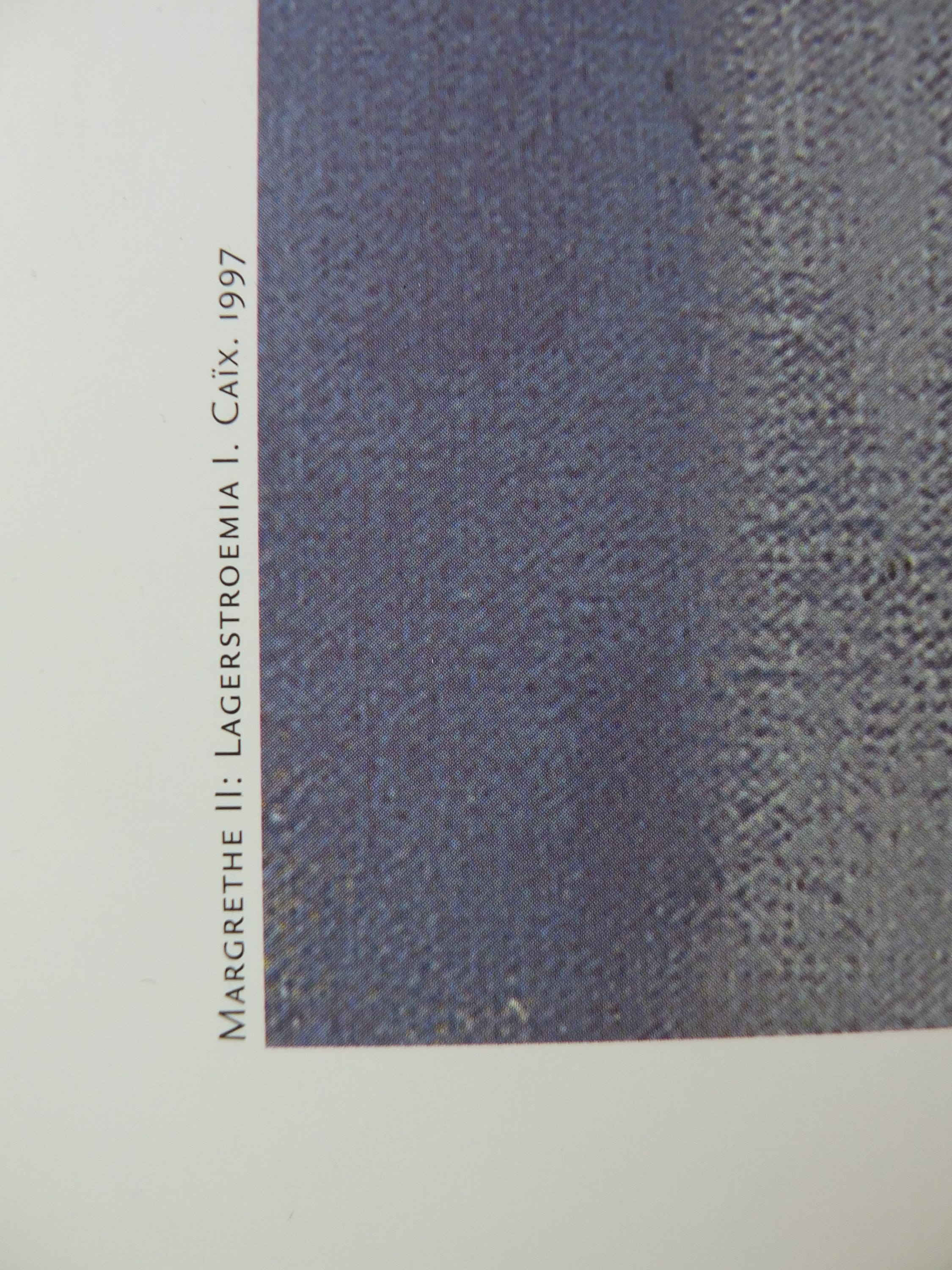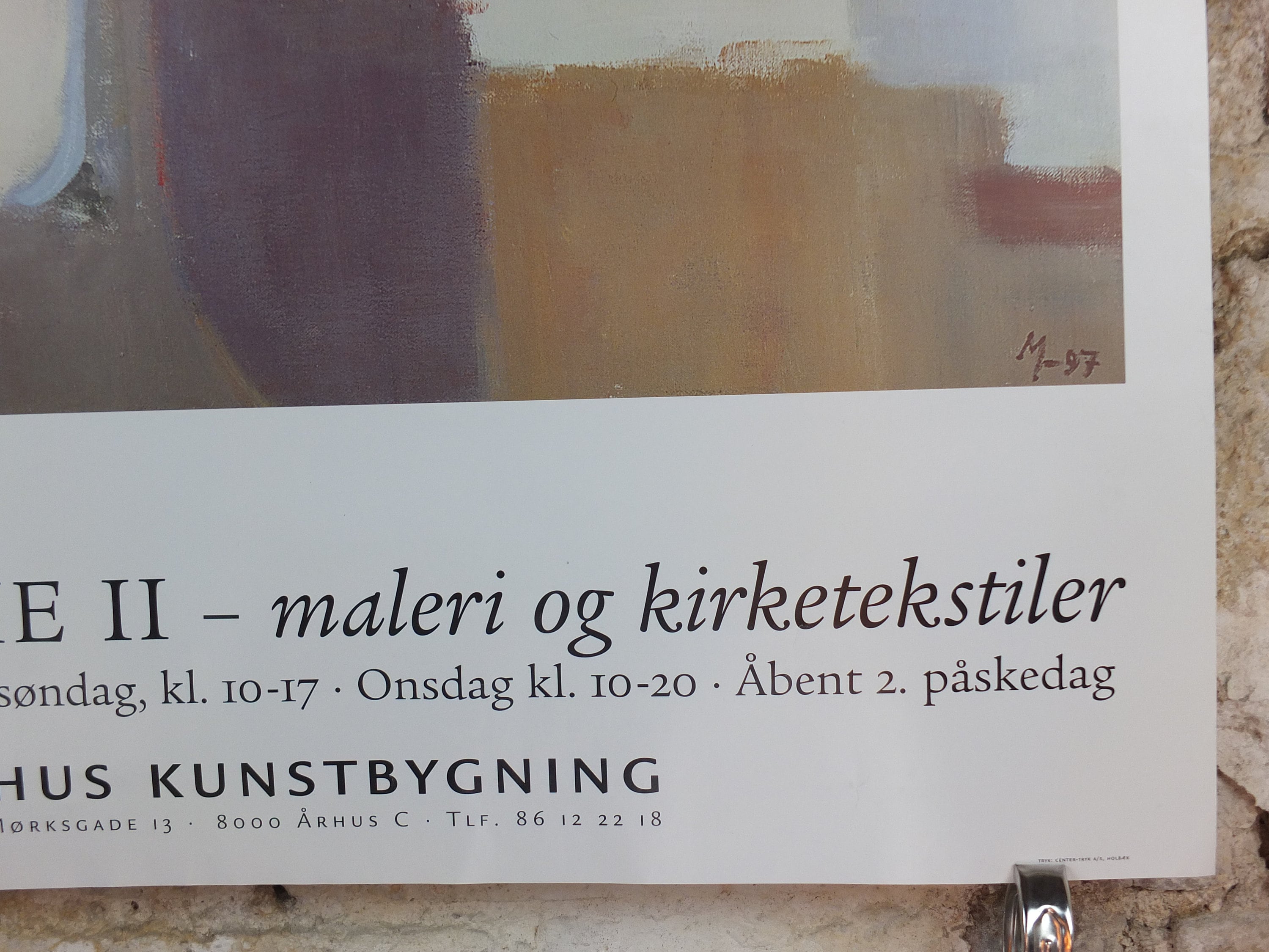 This exhibition poster for a 1998 exhibition by Queen Margaret 2, the queen of Denmark at the Aarhus arthouse featuring her painting and church textiles. This image is named "Lagerstromia" the genus of the Crepe Myrtle tree, on a patchwork pastel background.
