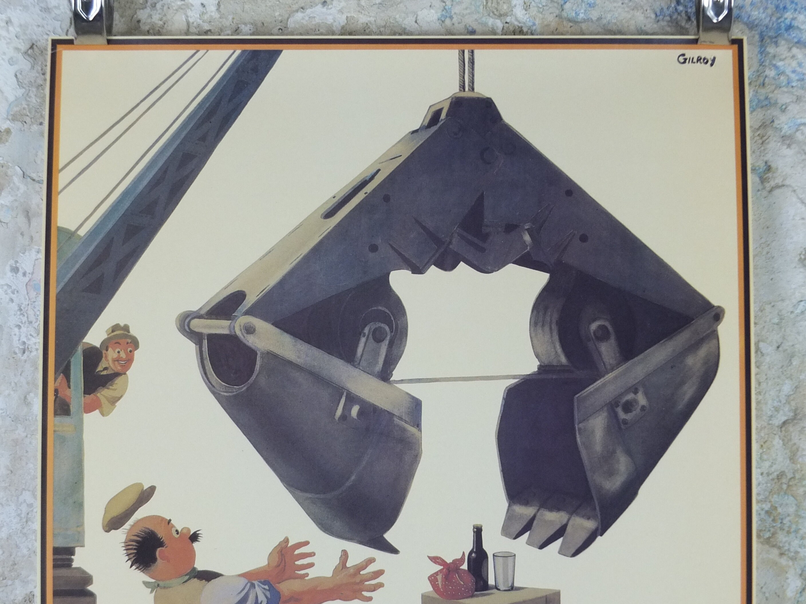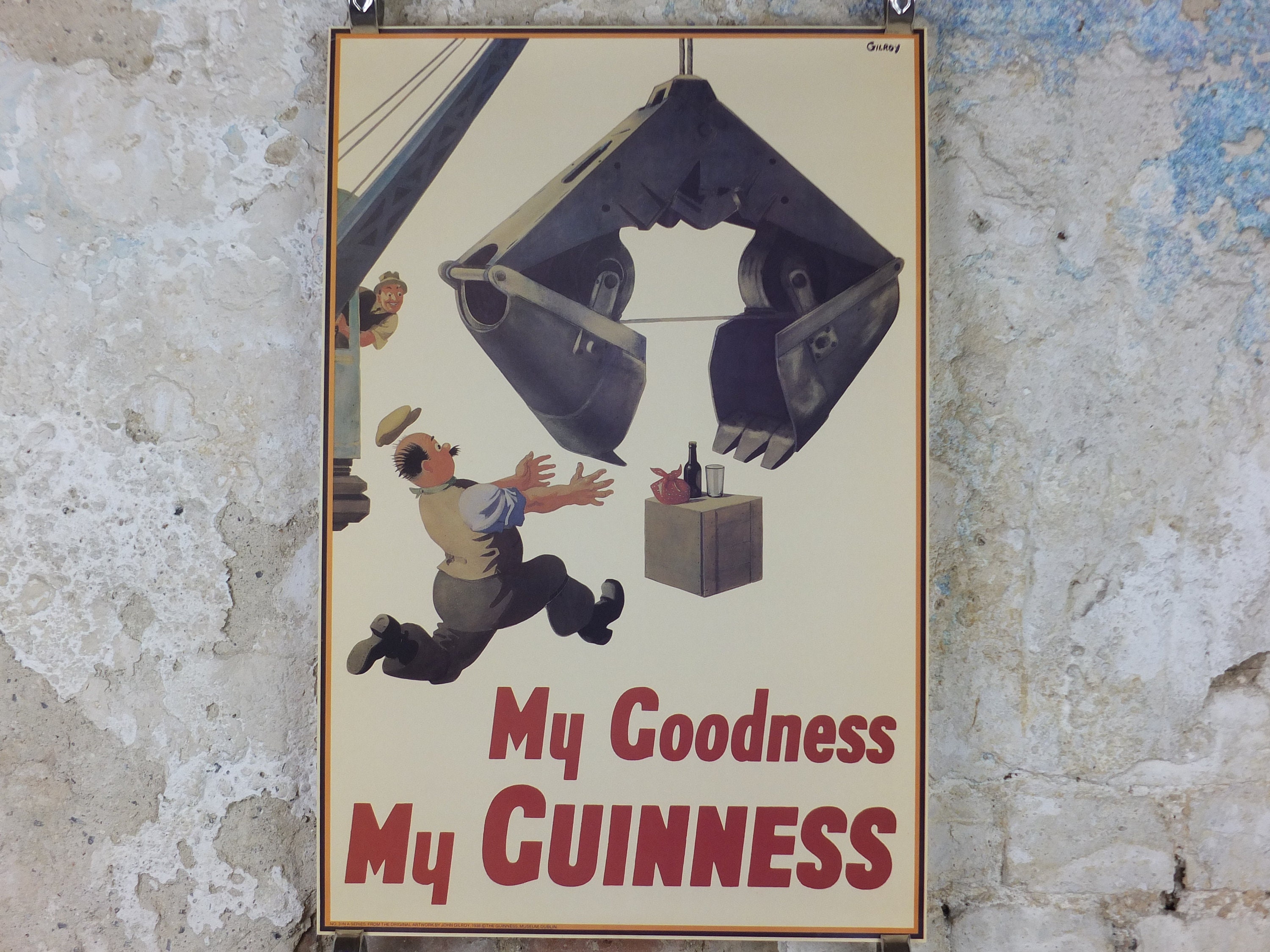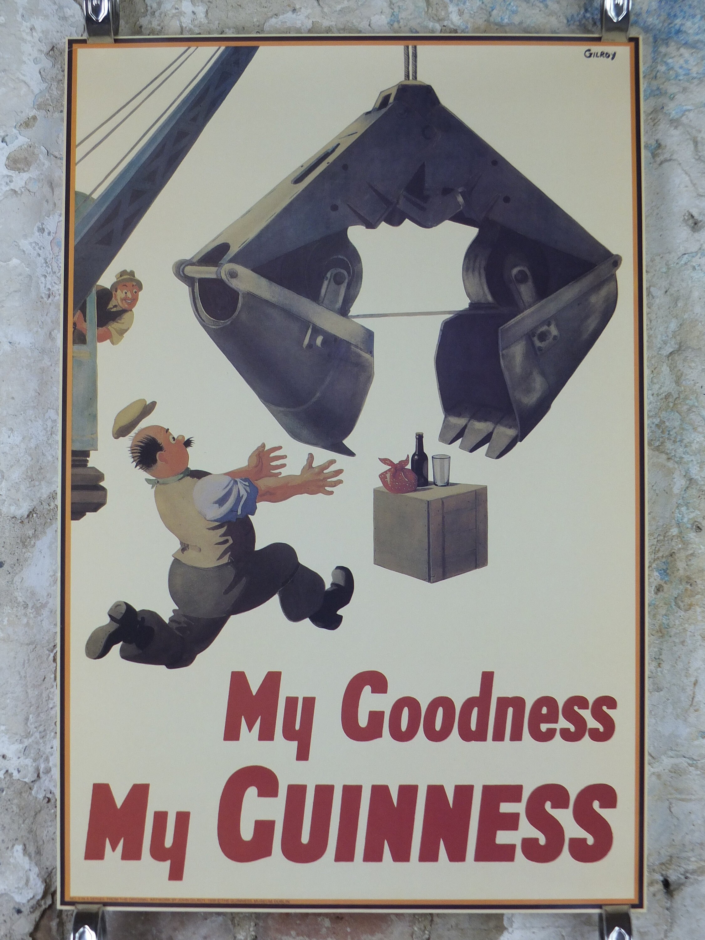 This is a mid 1990s poster from the Guinness Museum in Dublin. It shows a construction worker who has put his Guinness with his lunch on a crate, and an enterprising mechanised crane operater has spied an opportunity to land himself a picnic.