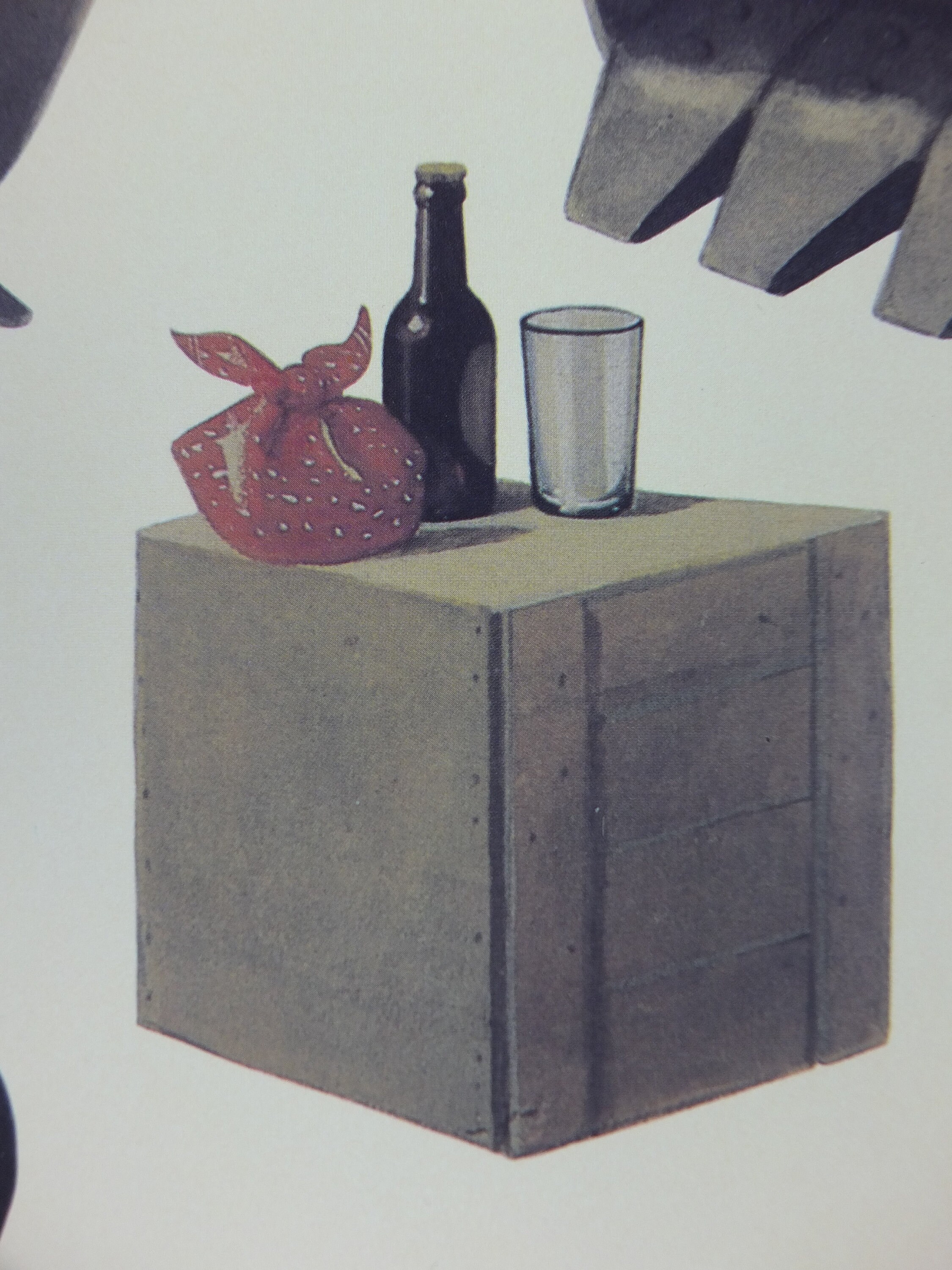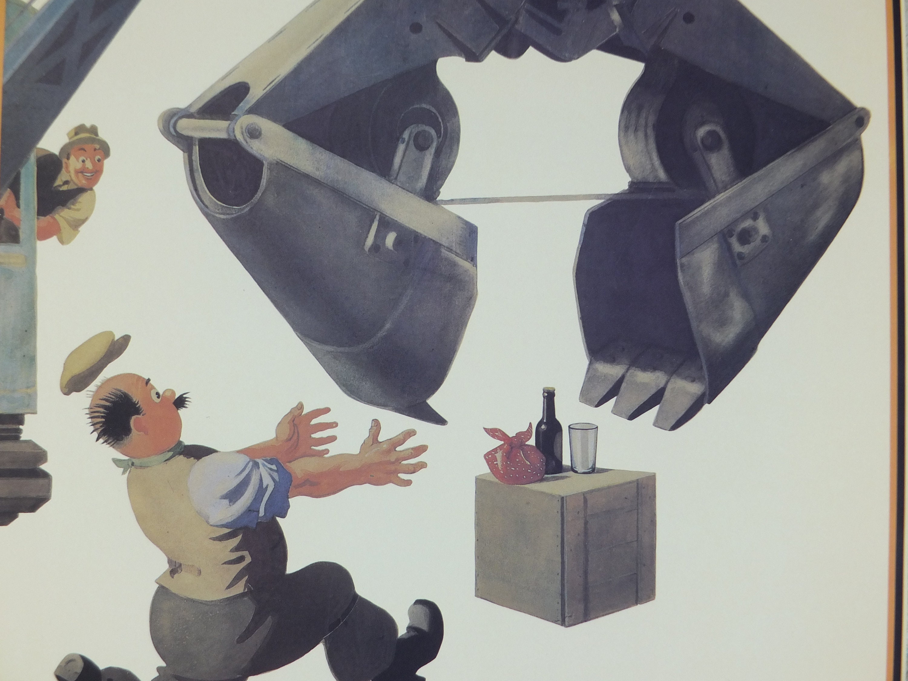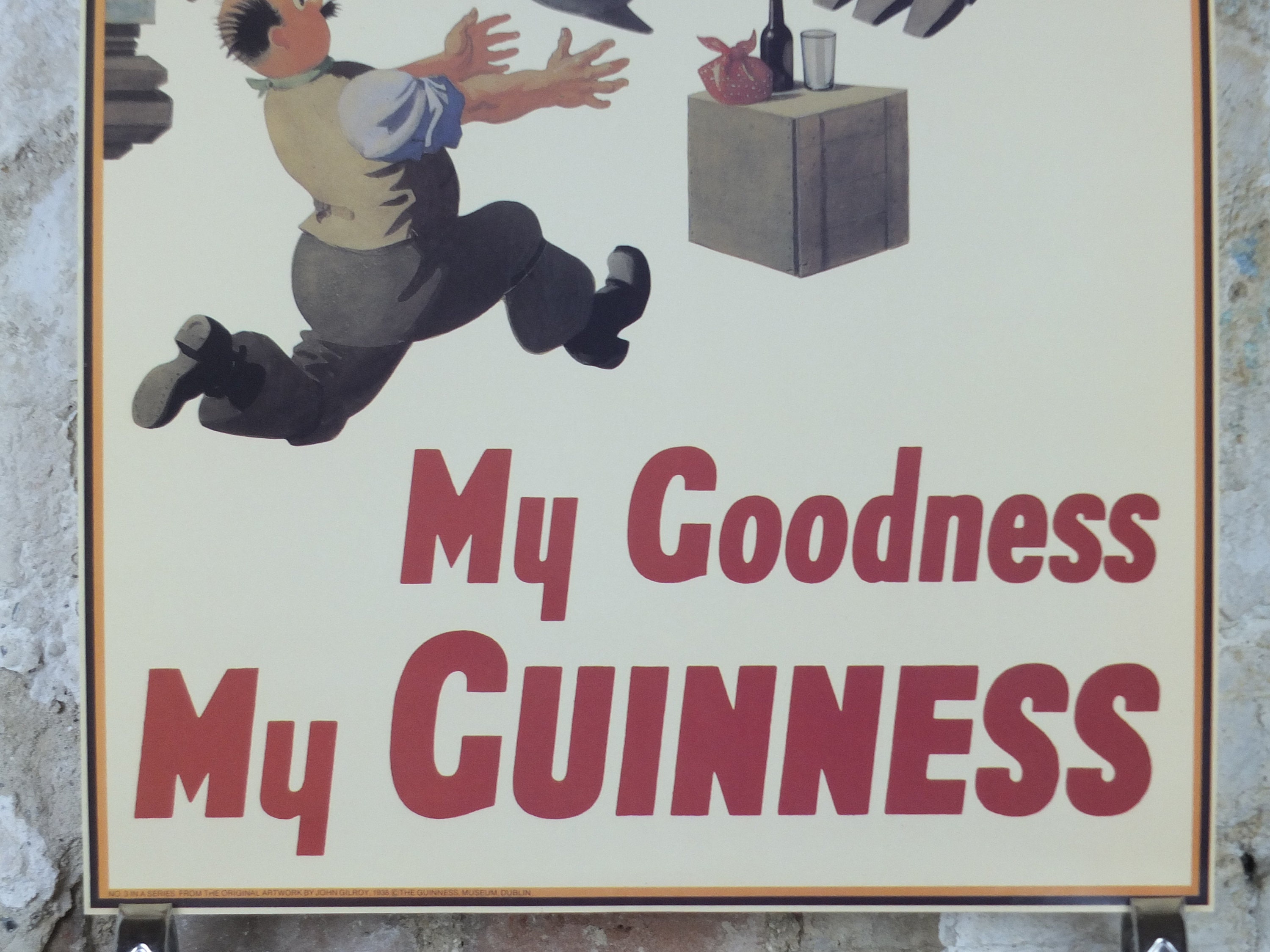 This is a mid 1990s poster from the Guinness Museum in Dublin. It shows a construction worker who has put his Guinness with his lunch on a crate, and an enterprising mechanised crane operater has spied an opportunity to land himself a picnic.