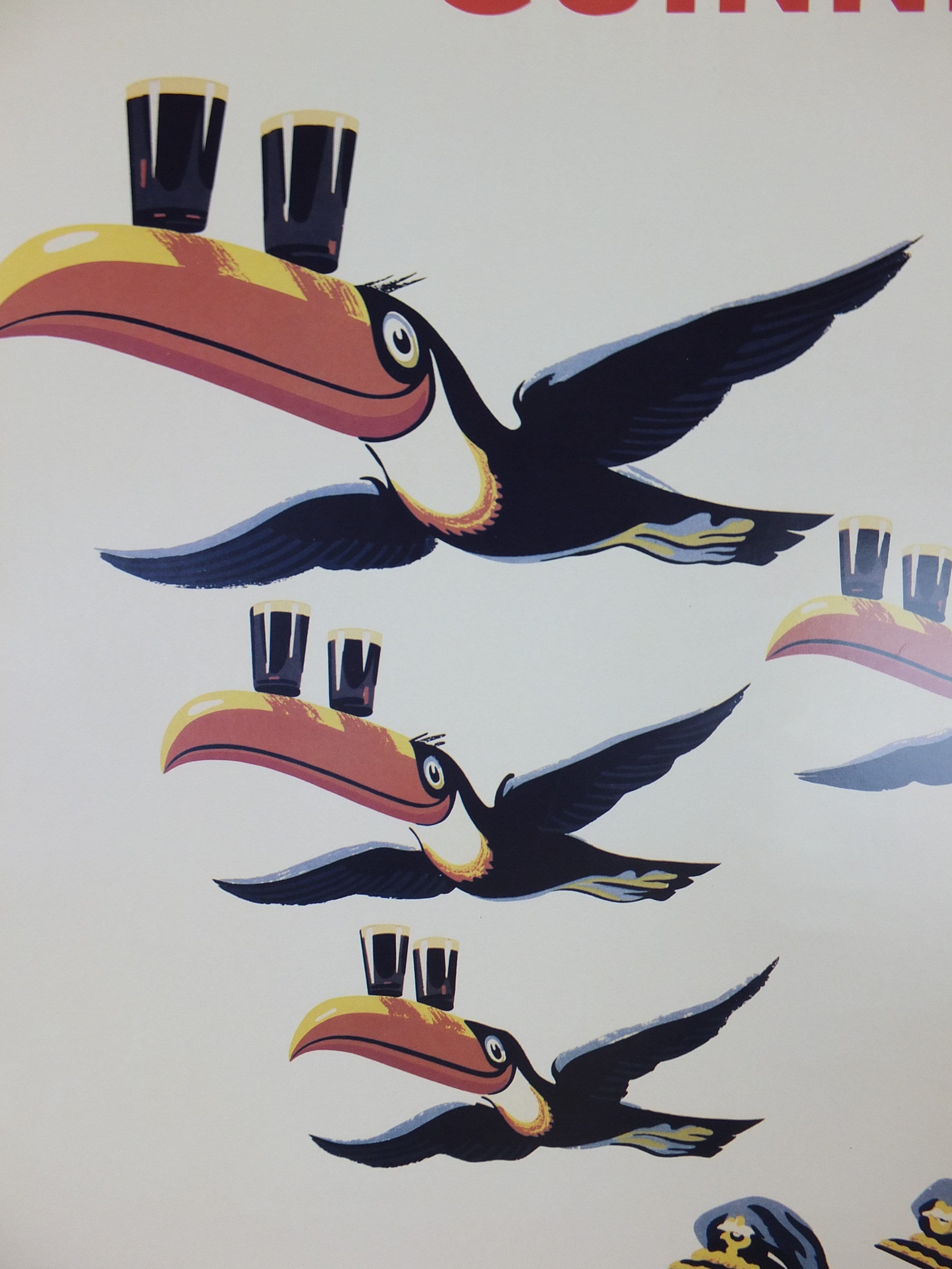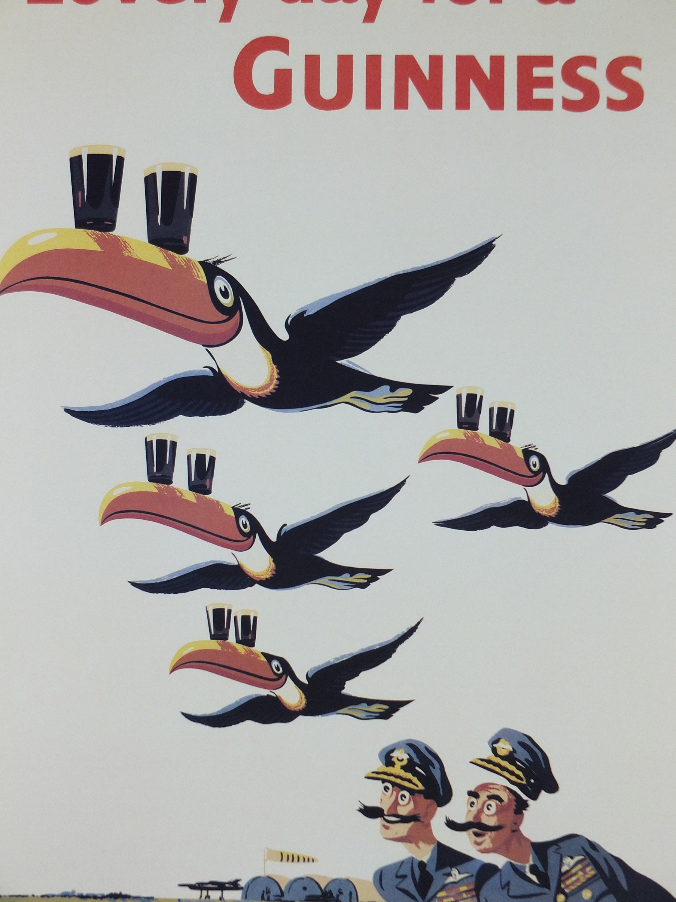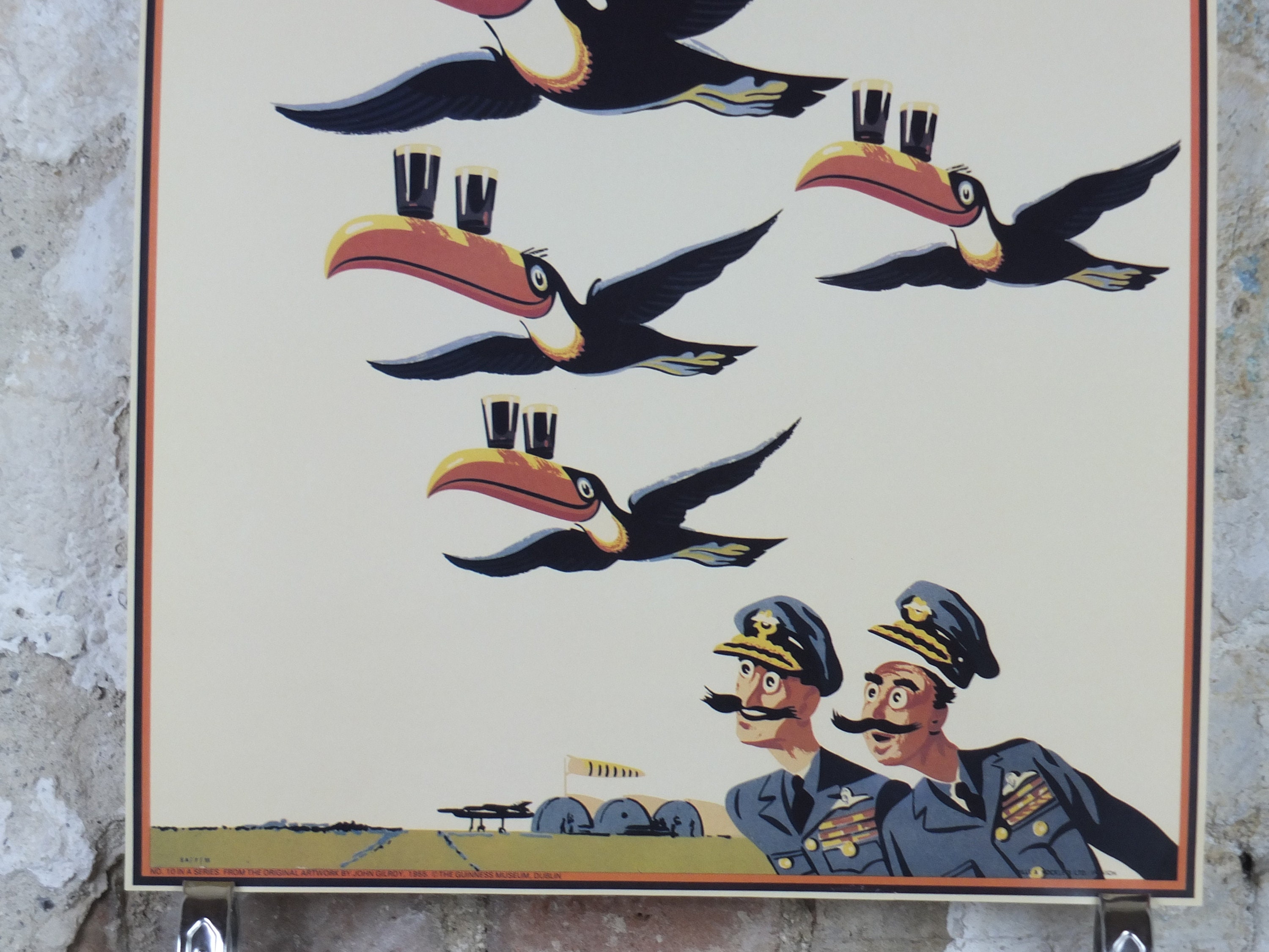 This is a mid 1990s poster from the Guinness Museum in Dublin. It shows two flight officers watching on while a squadron flight of toucans fly by with two pints of Guinness on each beak. A neat trick if you can pull it off.