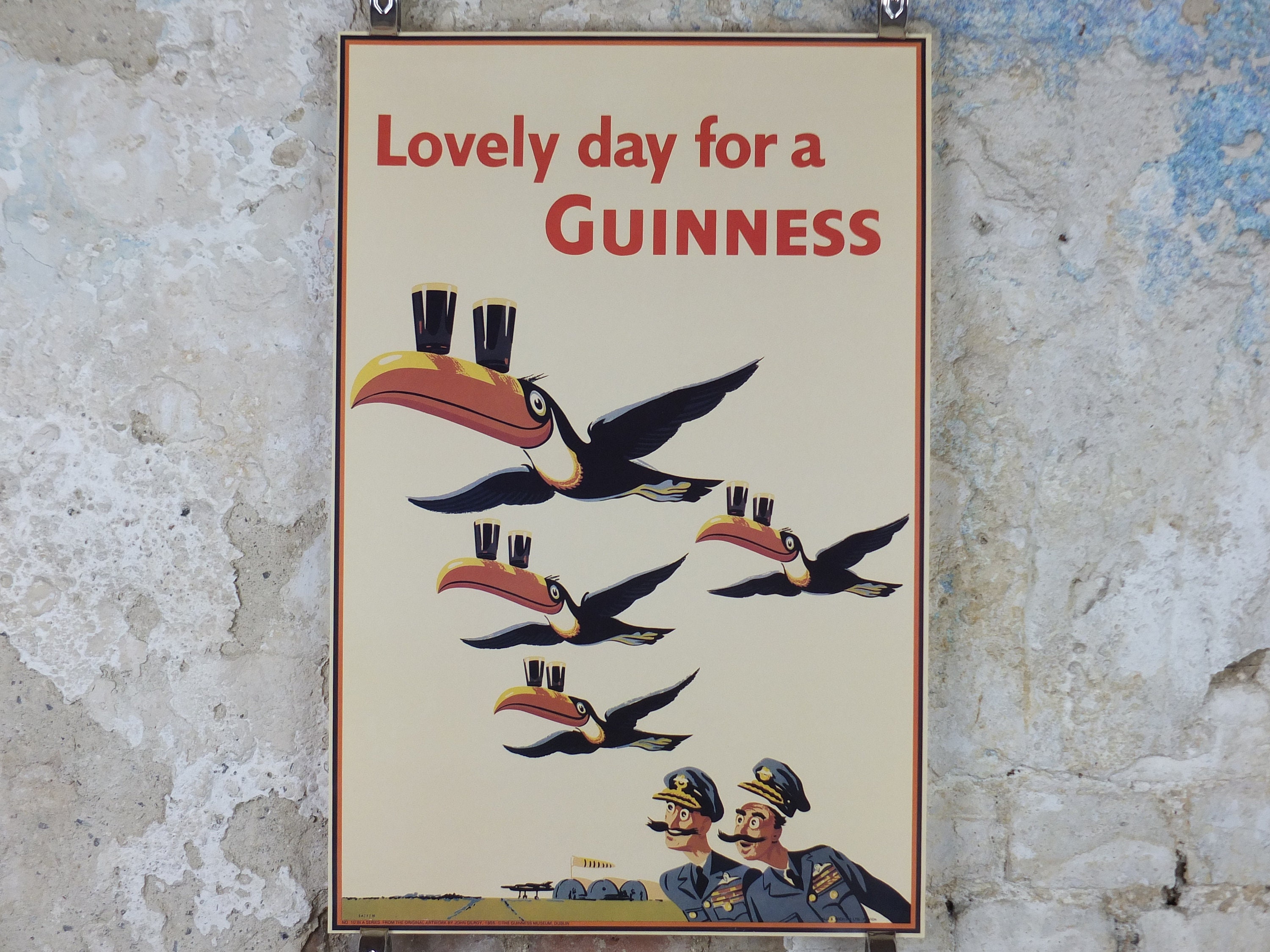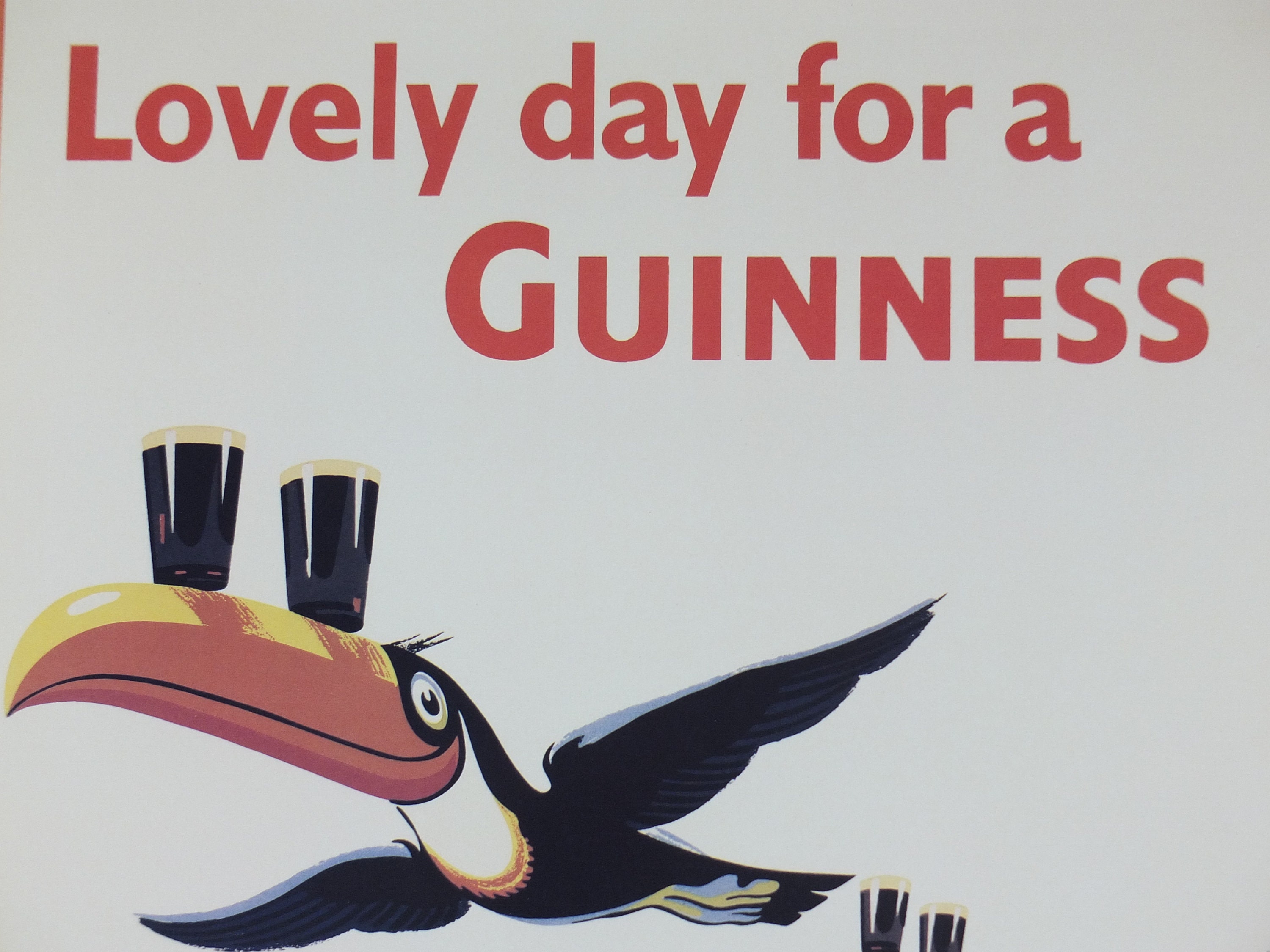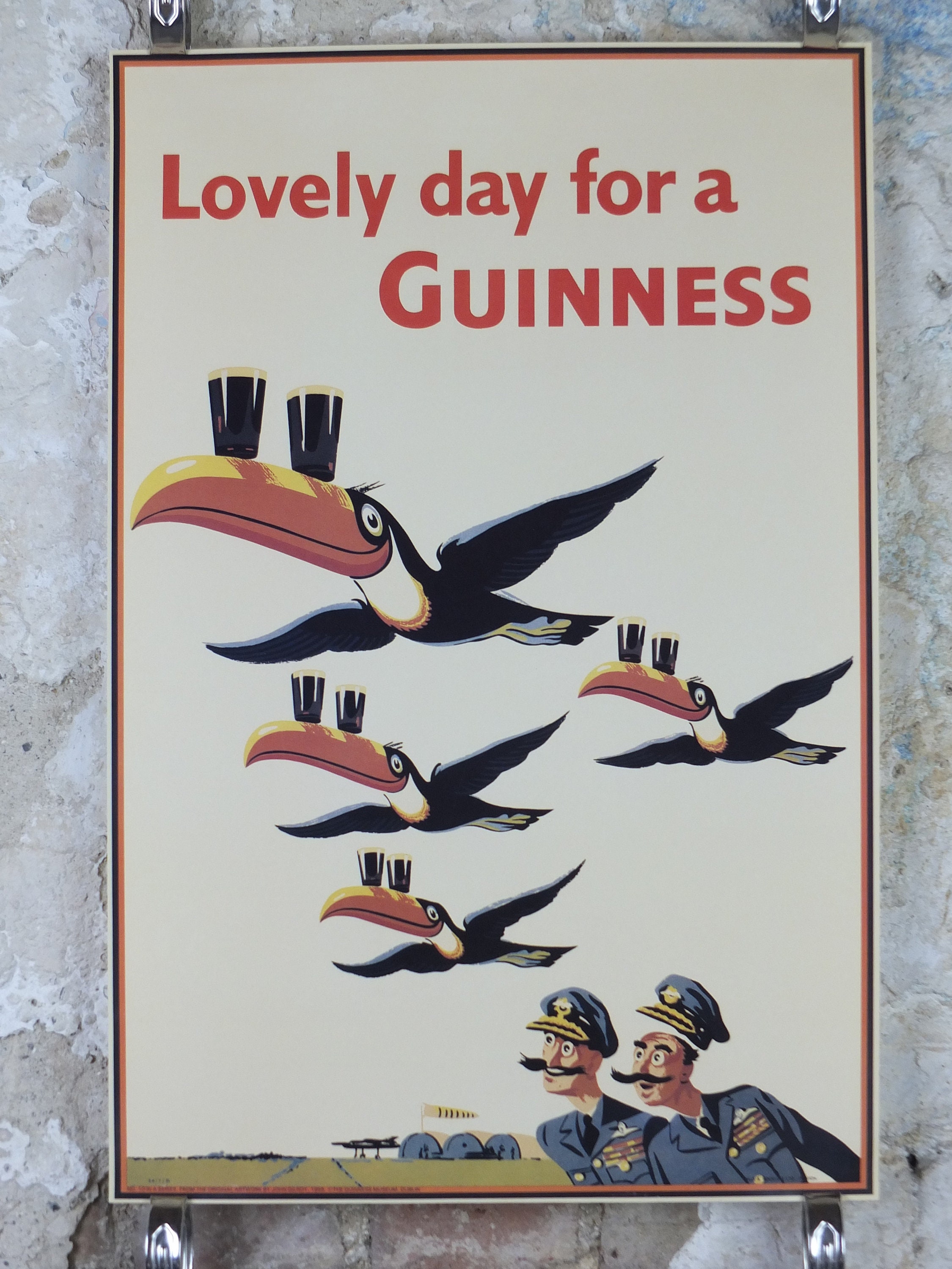 This is a mid 1990s poster from the Guinness Museum in Dublin. It shows two flight officers watching on while a squadron flight of toucans fly by with two pints of Guinness on each beak. A neat trick if you can pull it off.