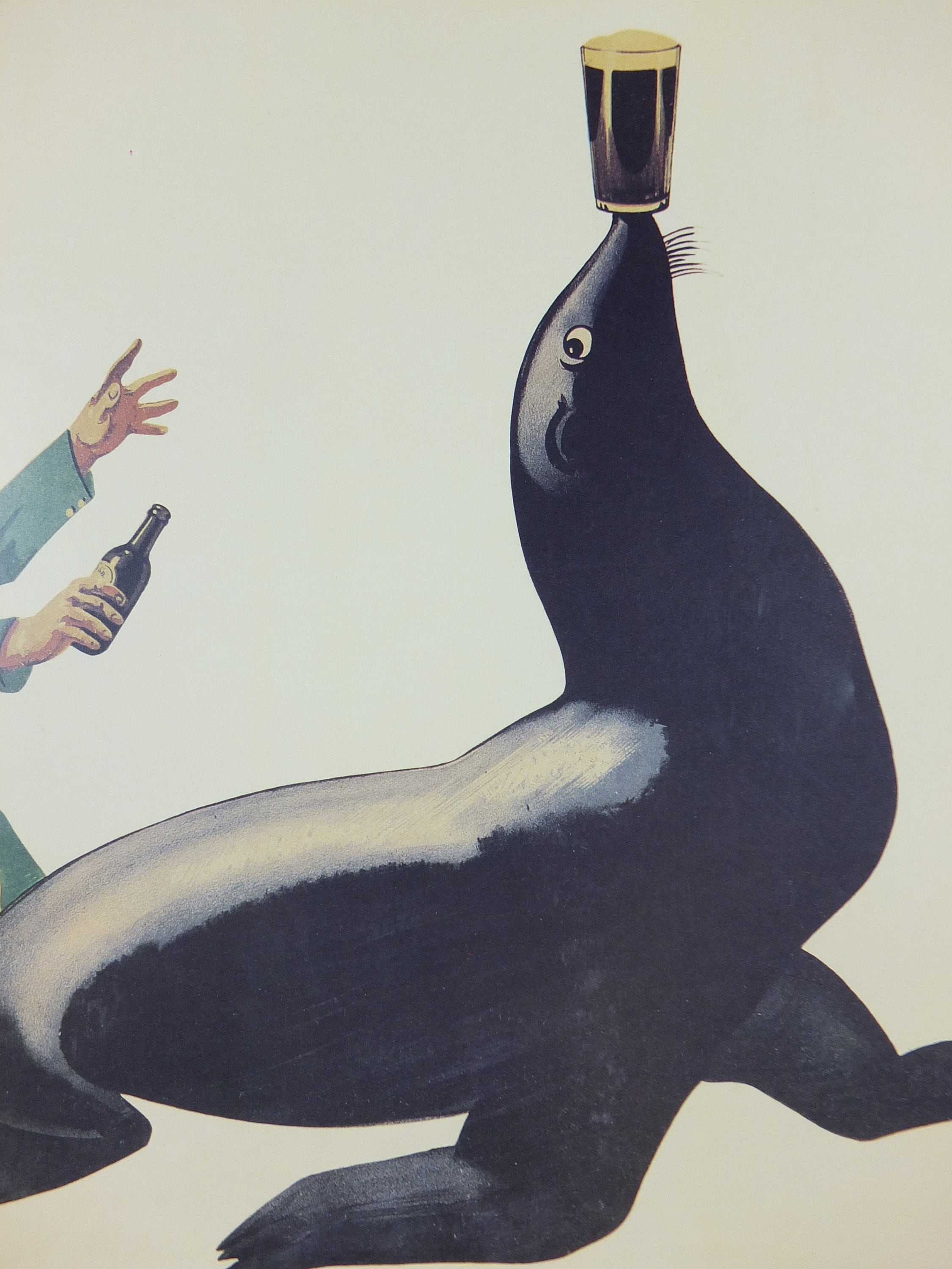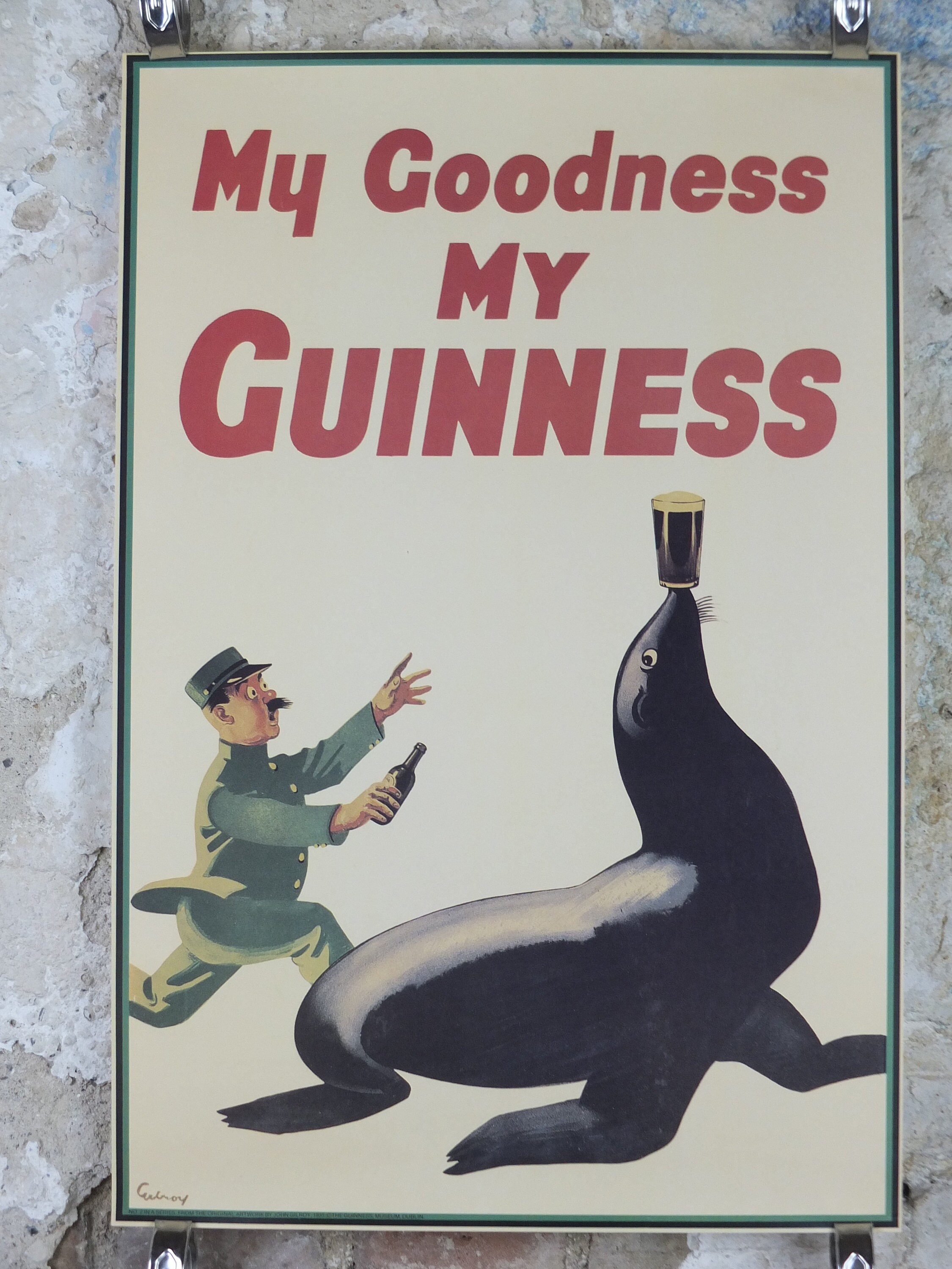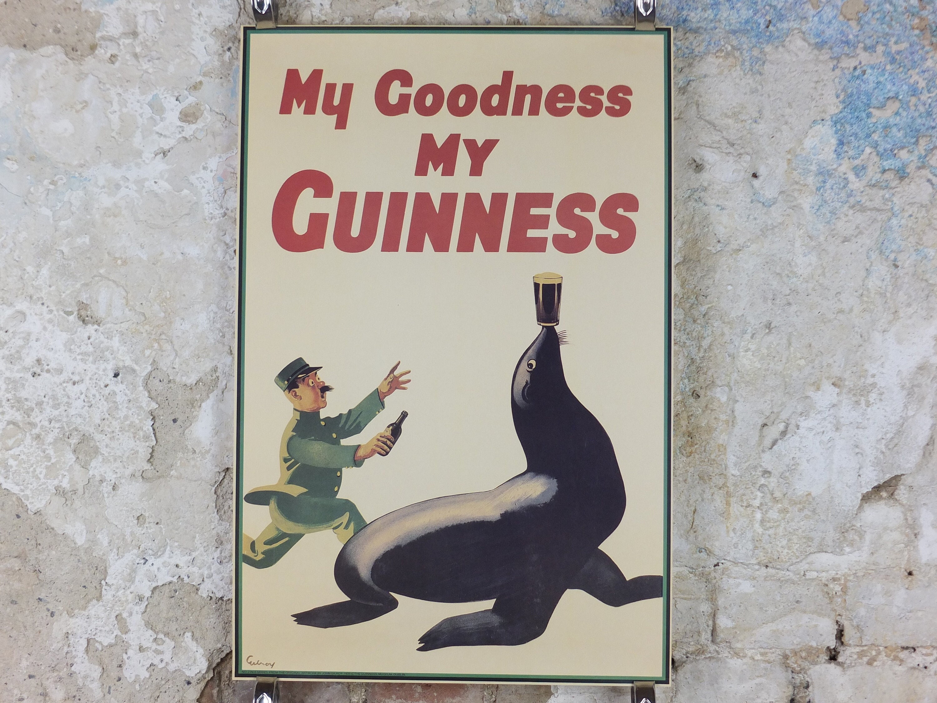 This is a mid 1990s poster from the Guinness Museum in Dublin. It shows the zookeeper chasing his pint of Guinness down from a seal who has run off with it and is not balancing it on his nose! Apparently a clever sea lion started all this for John Gilroy who thought the animal was so smart it could have balanced a pint on his nose. The rest is history.