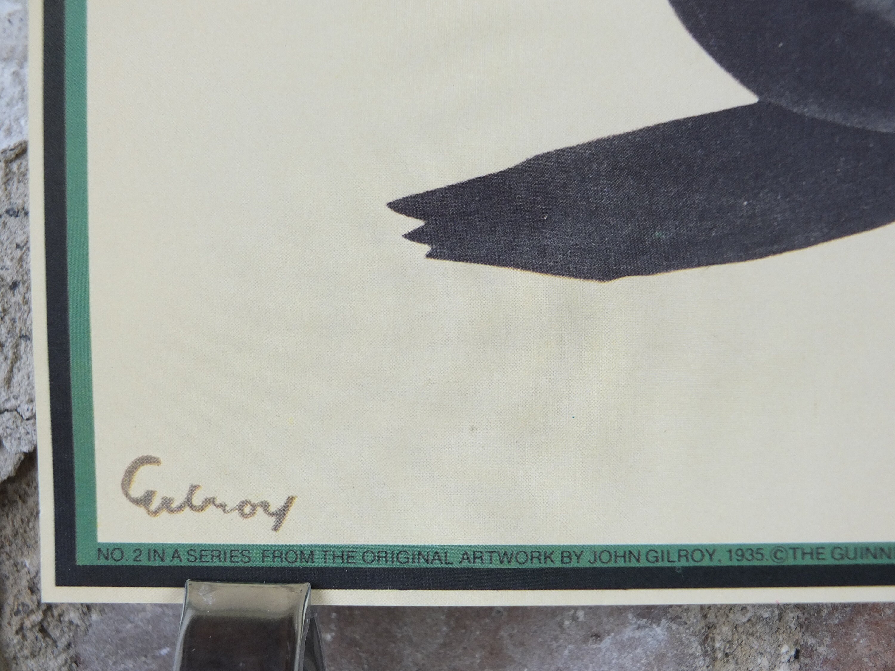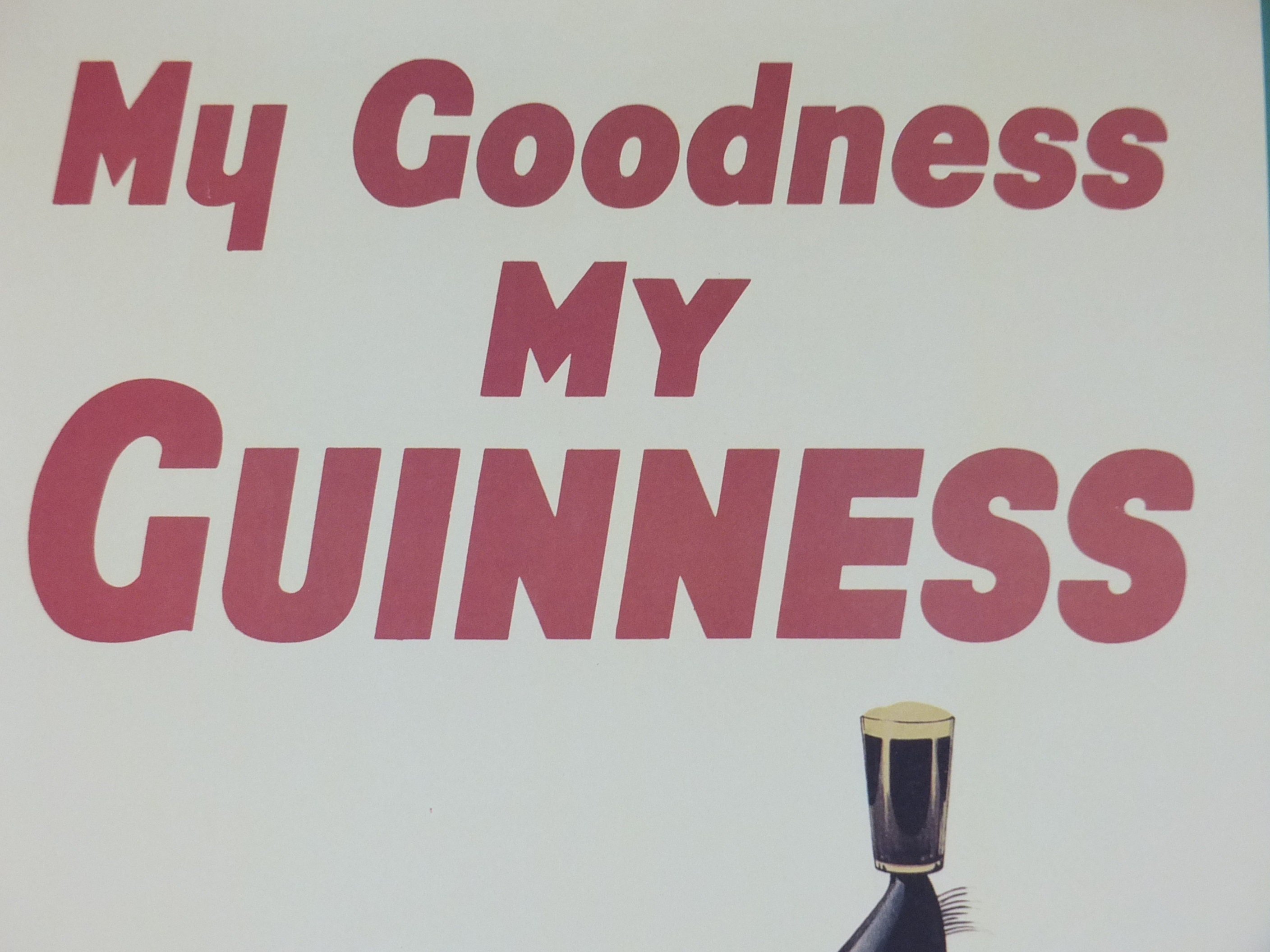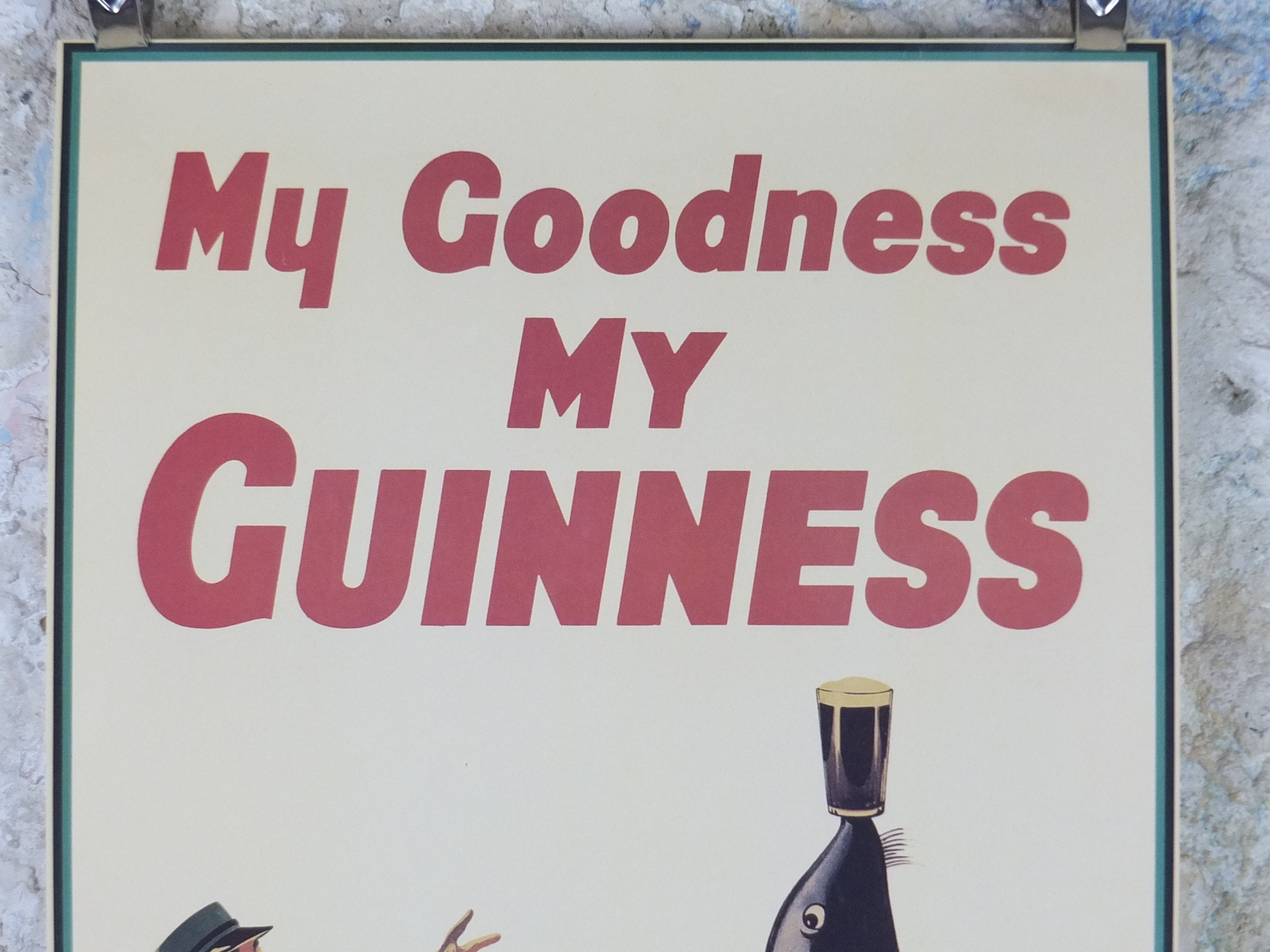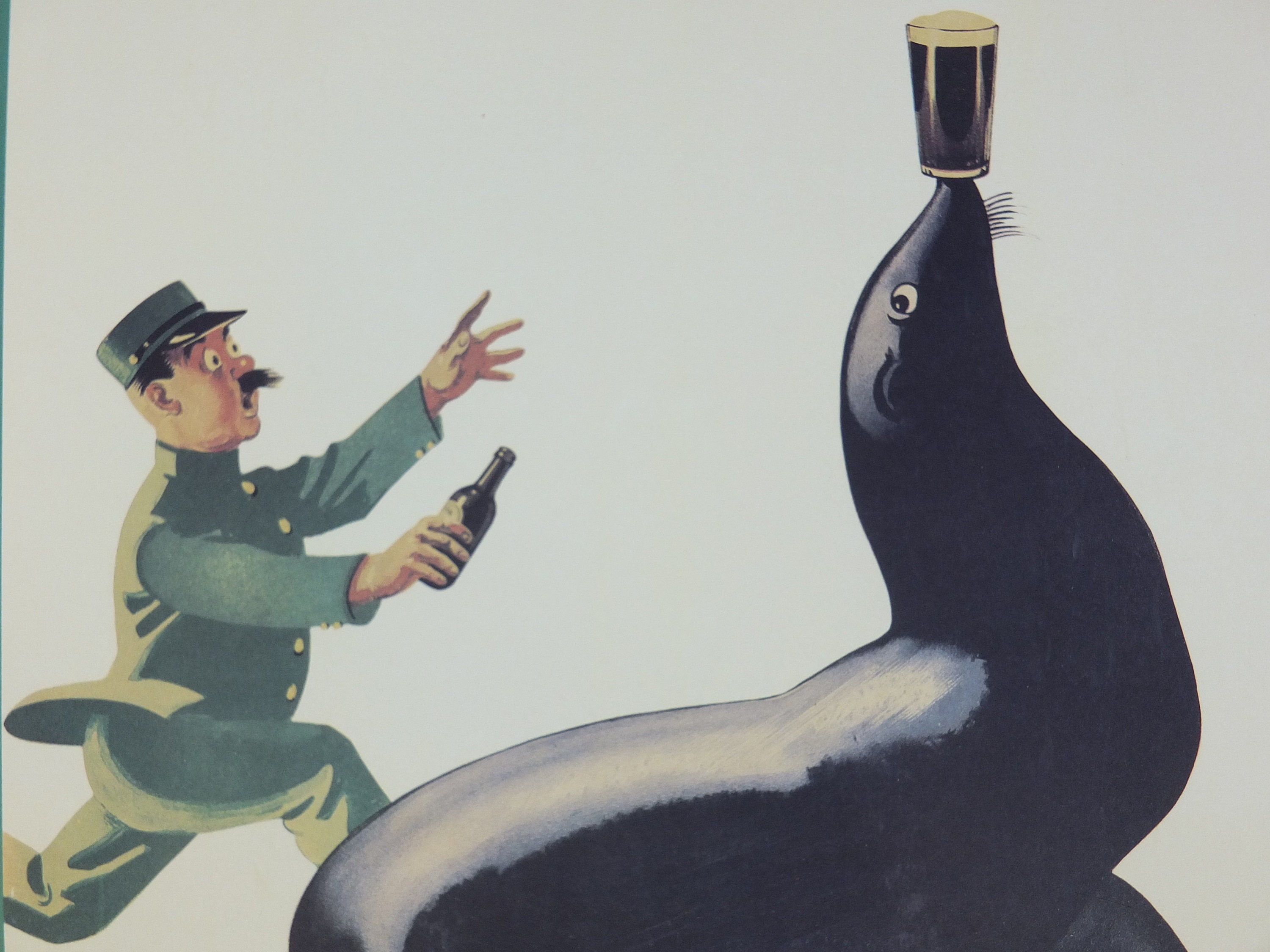 This is a mid 1990s poster from the Guinness Museum in Dublin. It shows the zookeeper chasing his pint of Guinness down from a seal who has run off with it and is not balancing it on his nose! Apparently a clever sea lion started all this for John Gilroy who thought the animal was so smart it could have balanced a pint on his nose. The rest is history.