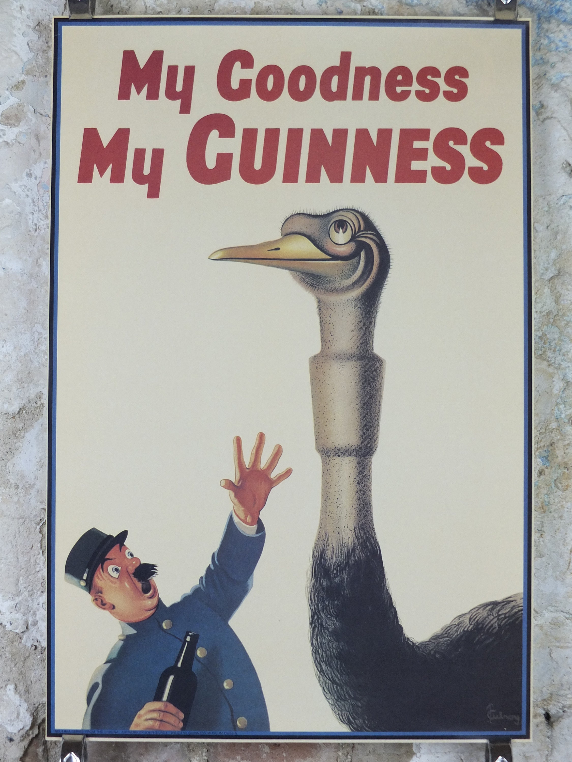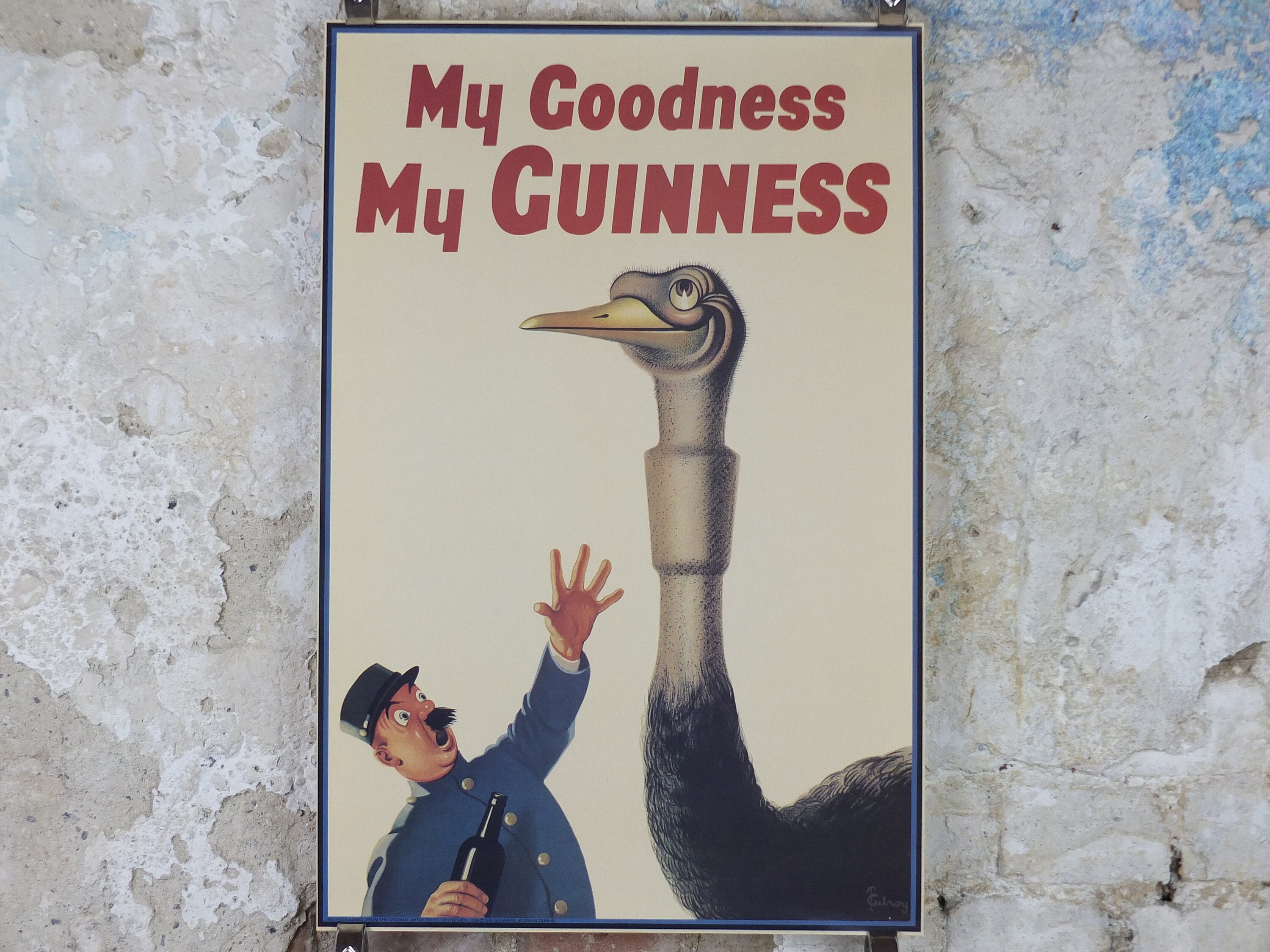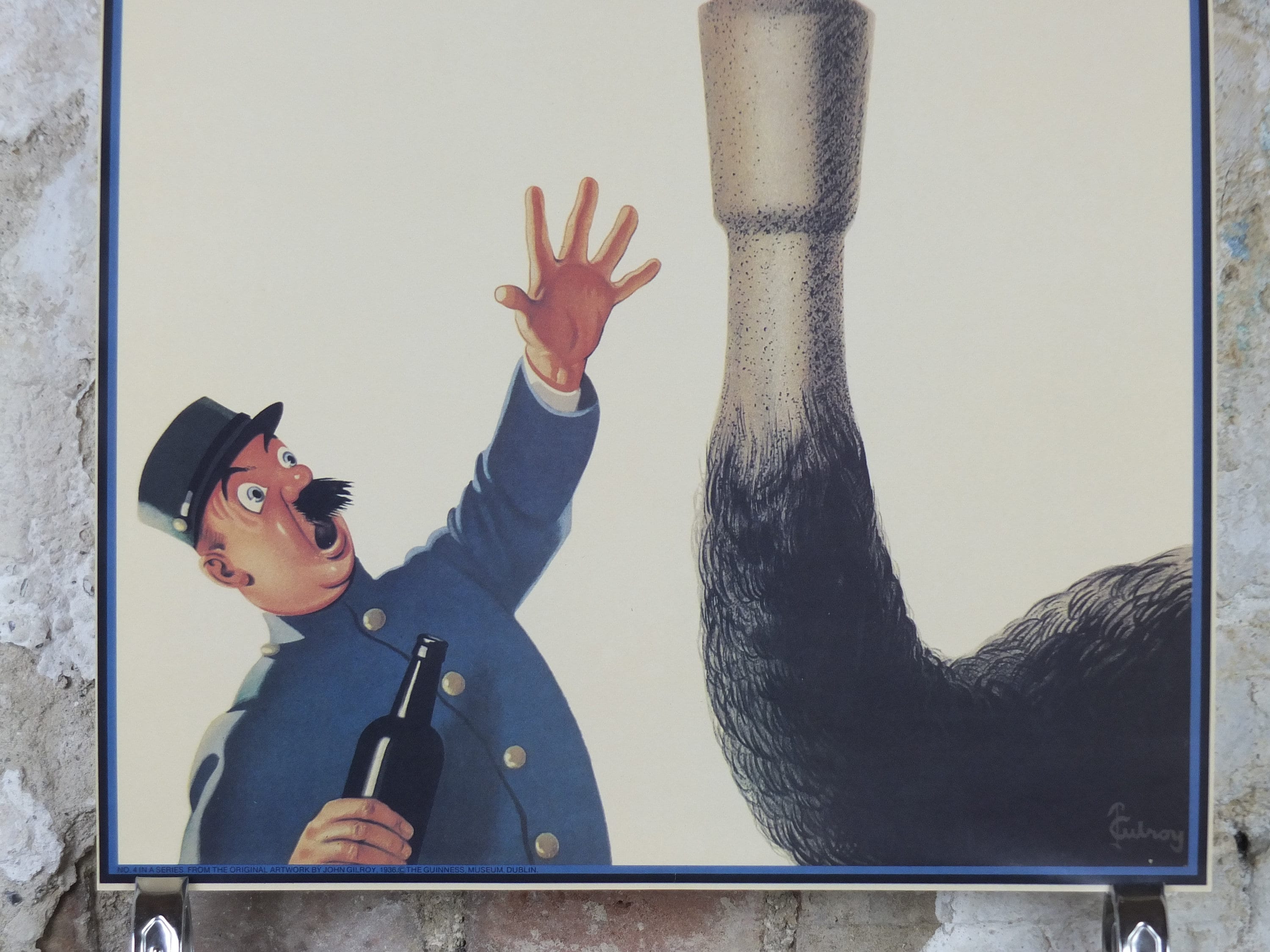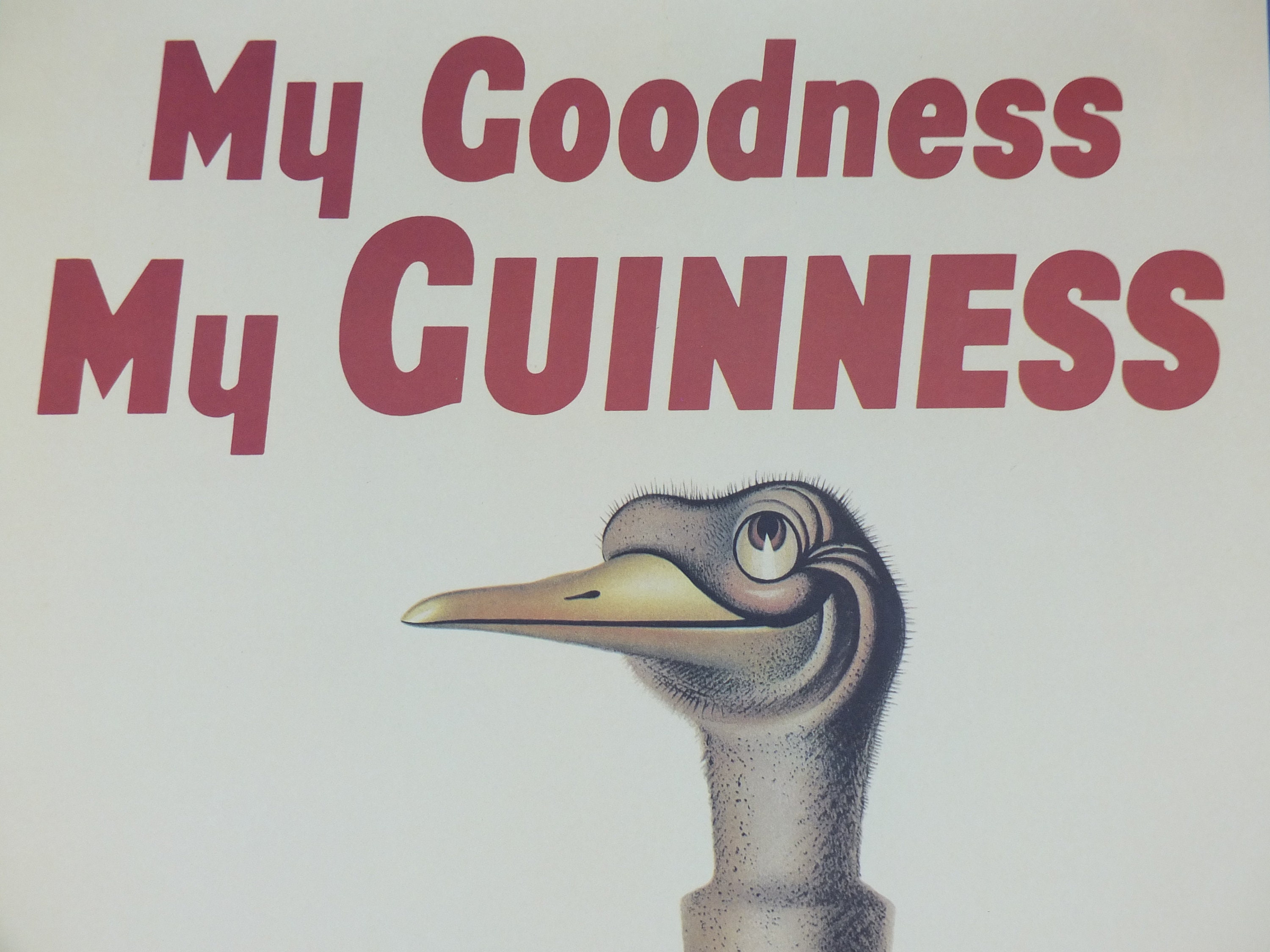 This is a mid 1990s poster from the Guinness Museum in Dublin. It shows an ostrich which has swallowed the zookeepers's pint glass of Guinness and looking rather pleased with itself.