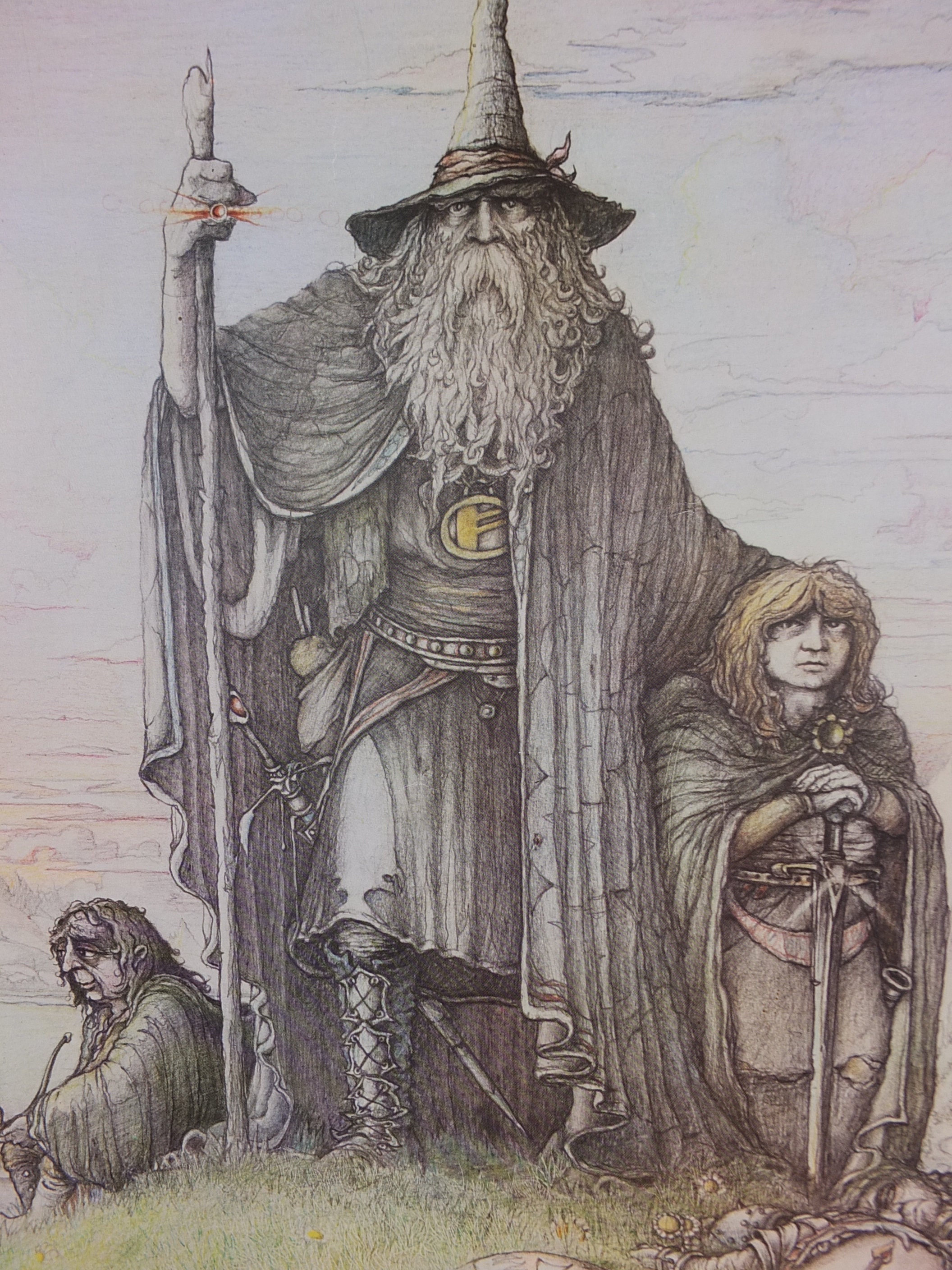It shows Gandalf mentoring Frodo, who is holding Sting, with Sam on the opposite side. Flowing letters at the top of the poster present "Lord of the Rings" and the One Ring is wrapped up in that.