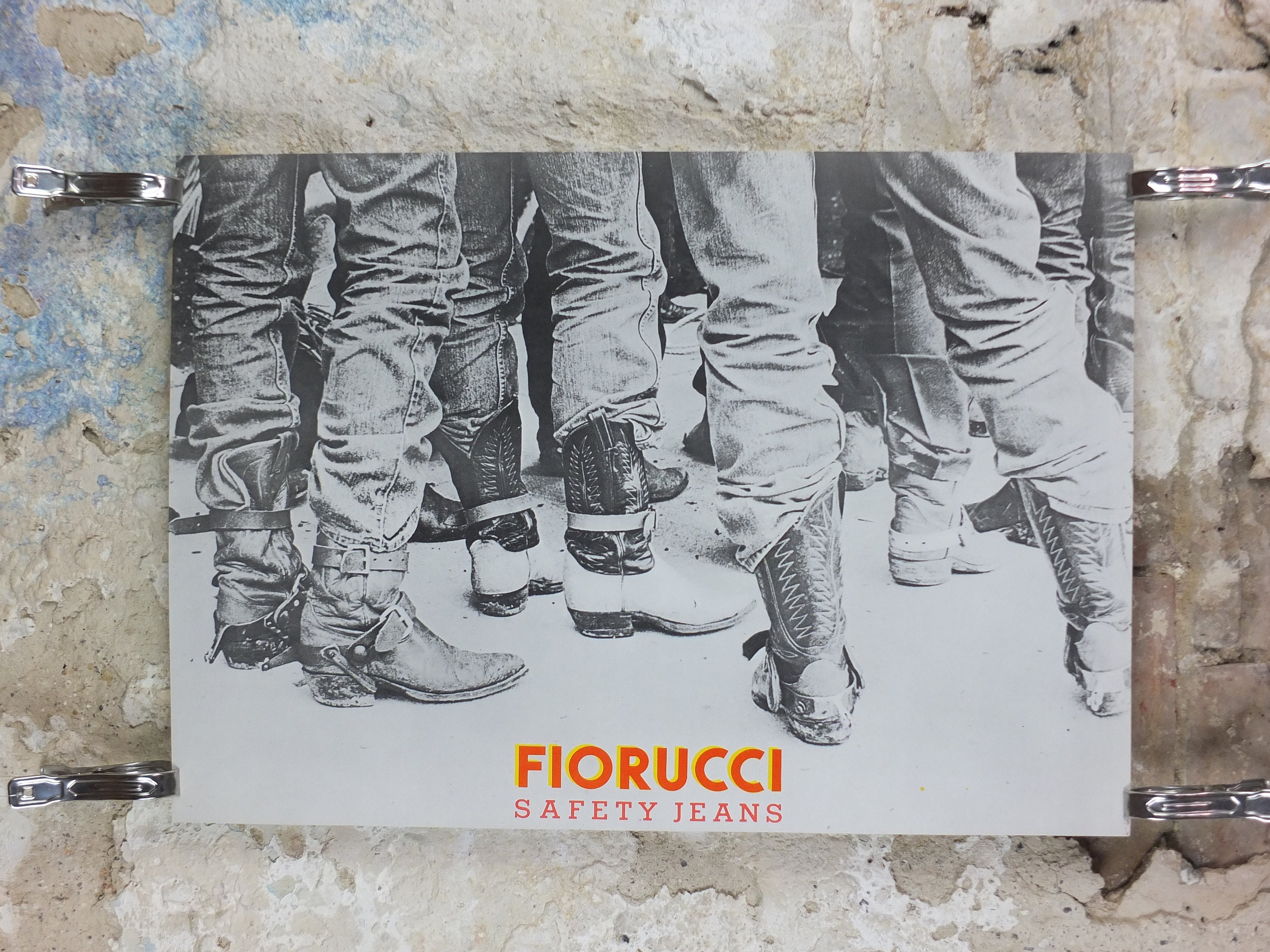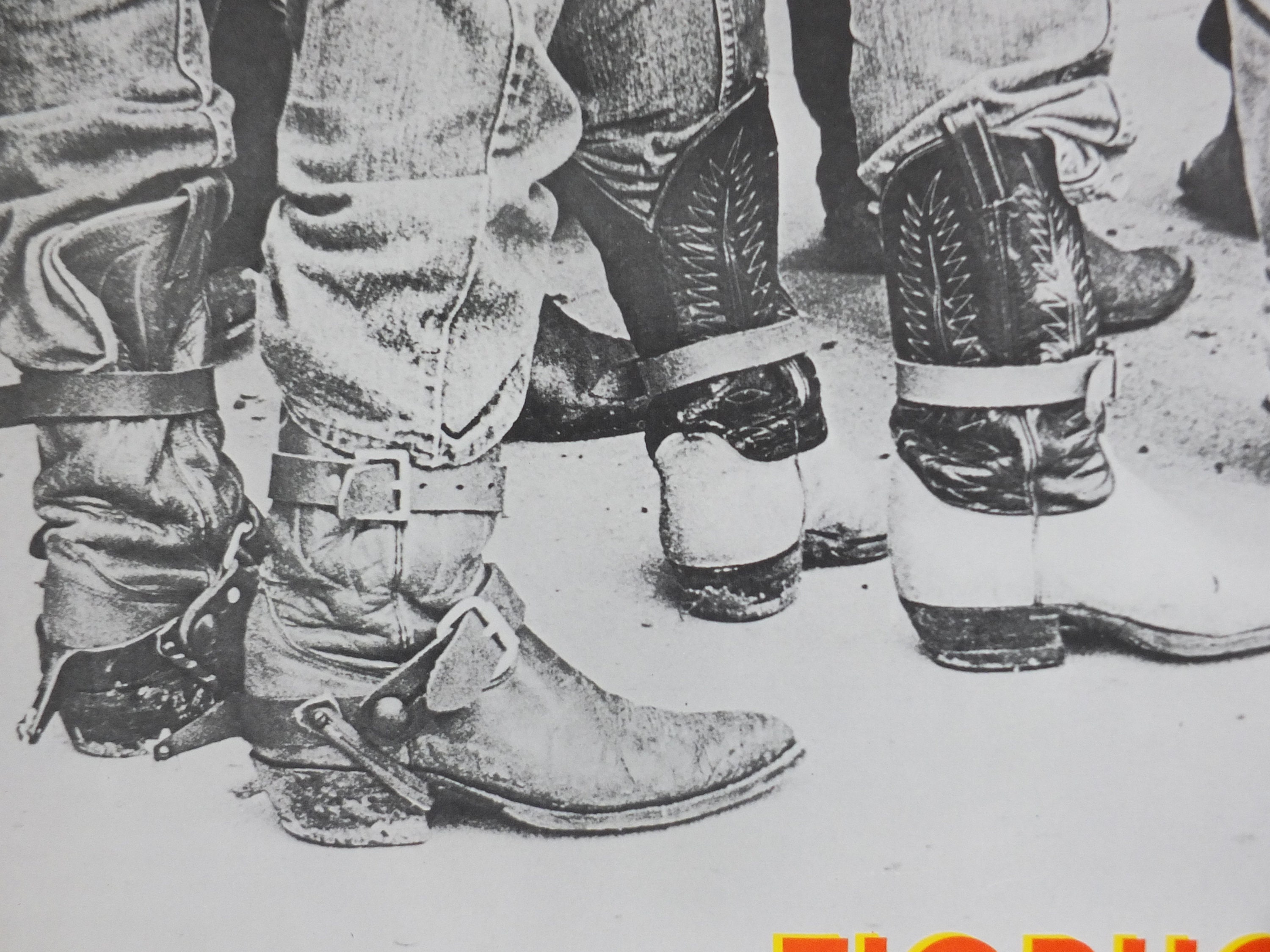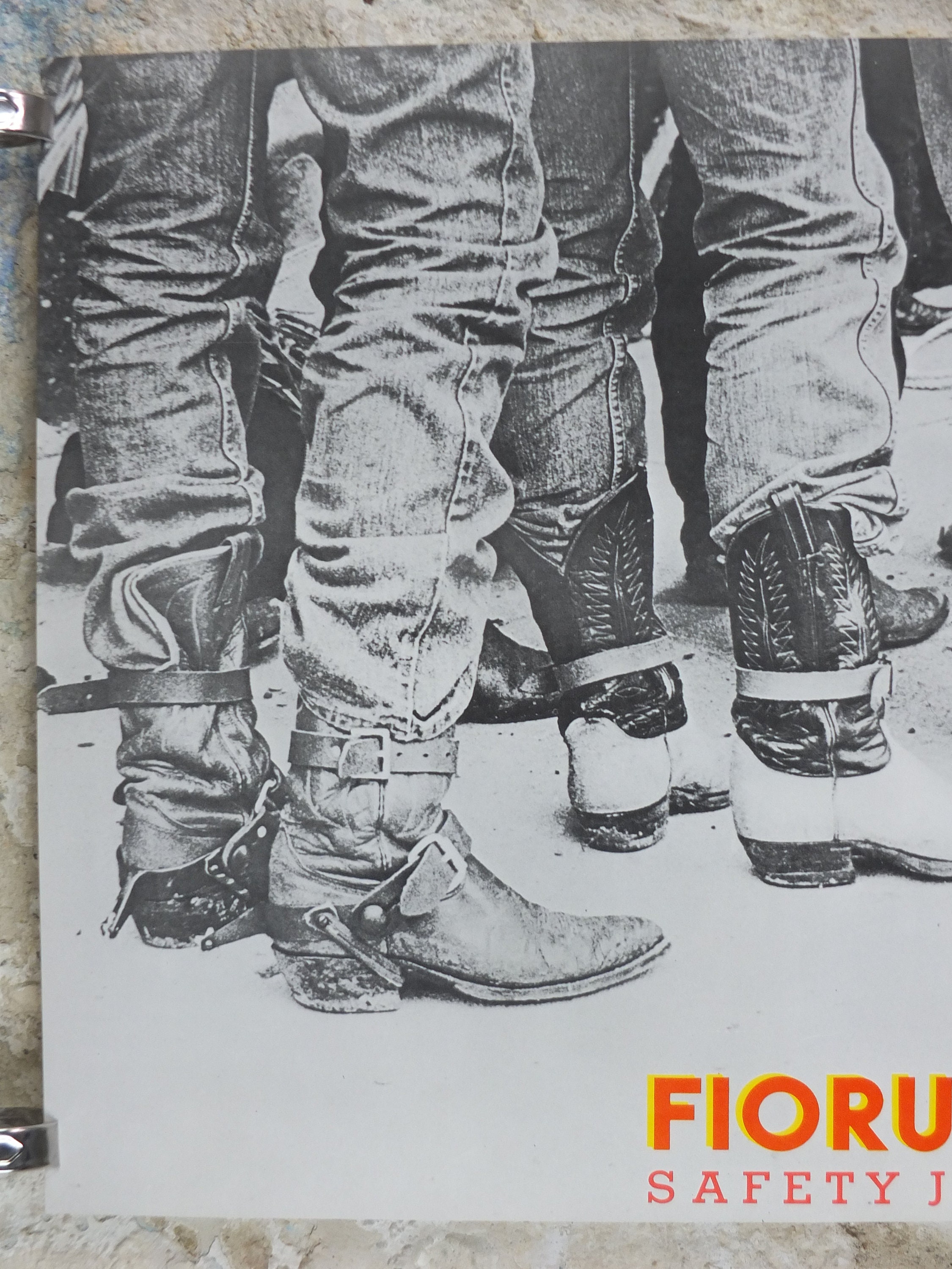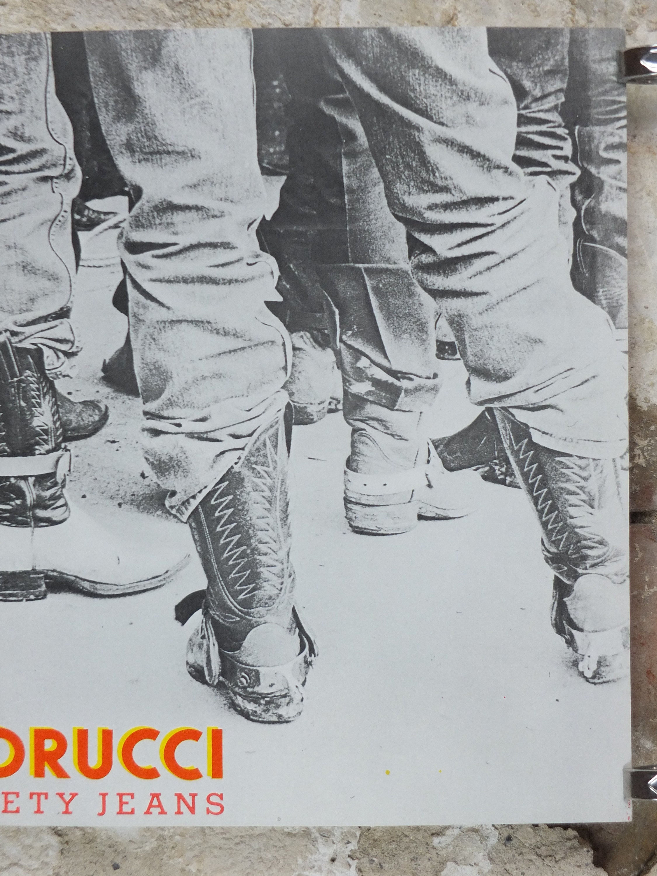 This is a 1980s Fiorucci fashion label poster was produced to advertise Fiorucci's signature 5-pocket "Safety Jeans" of the mid-70s. The photo is from Douglas Kent Hall called "Mesquite, Texas 1973" an American rodeo photo.