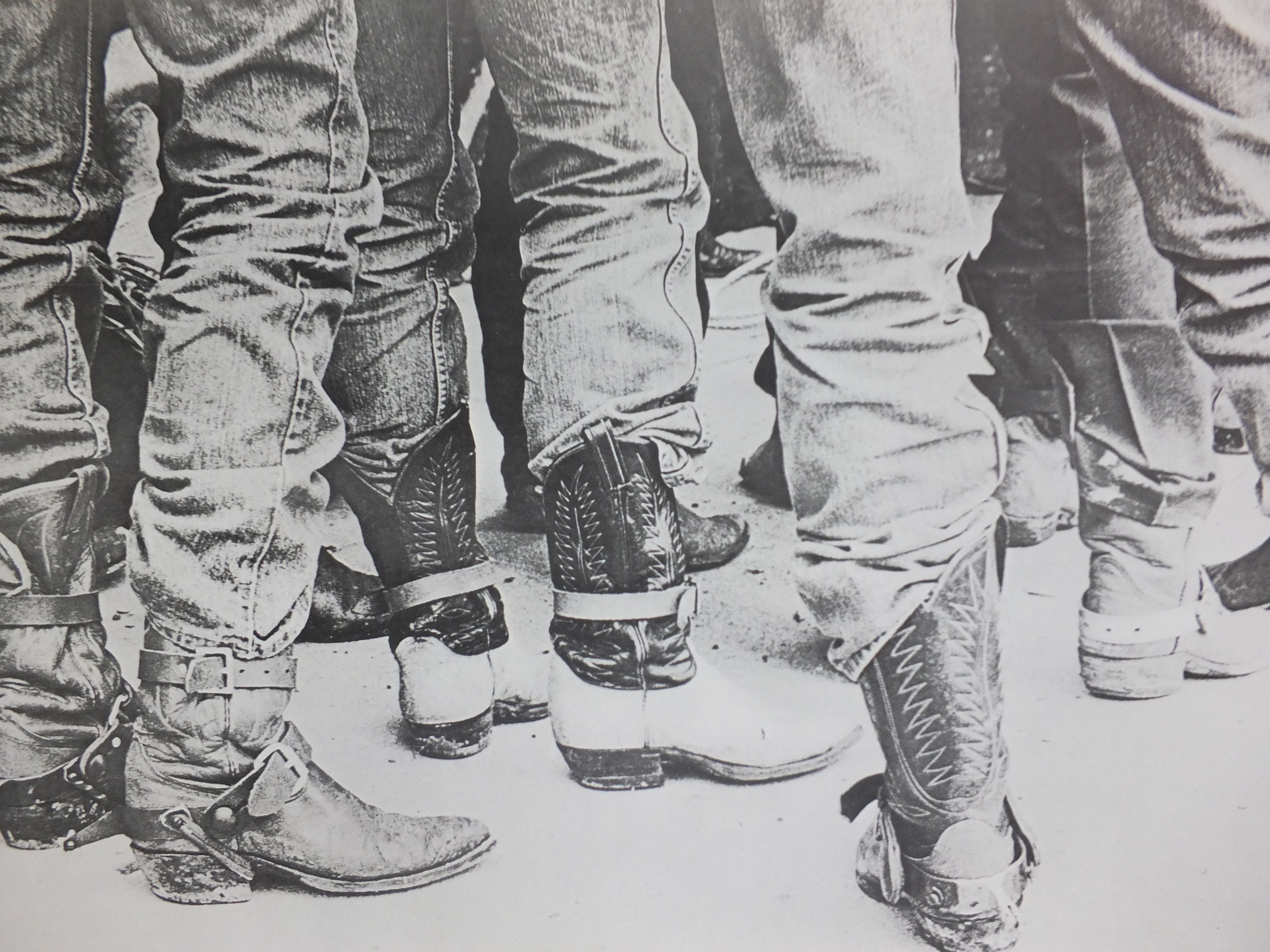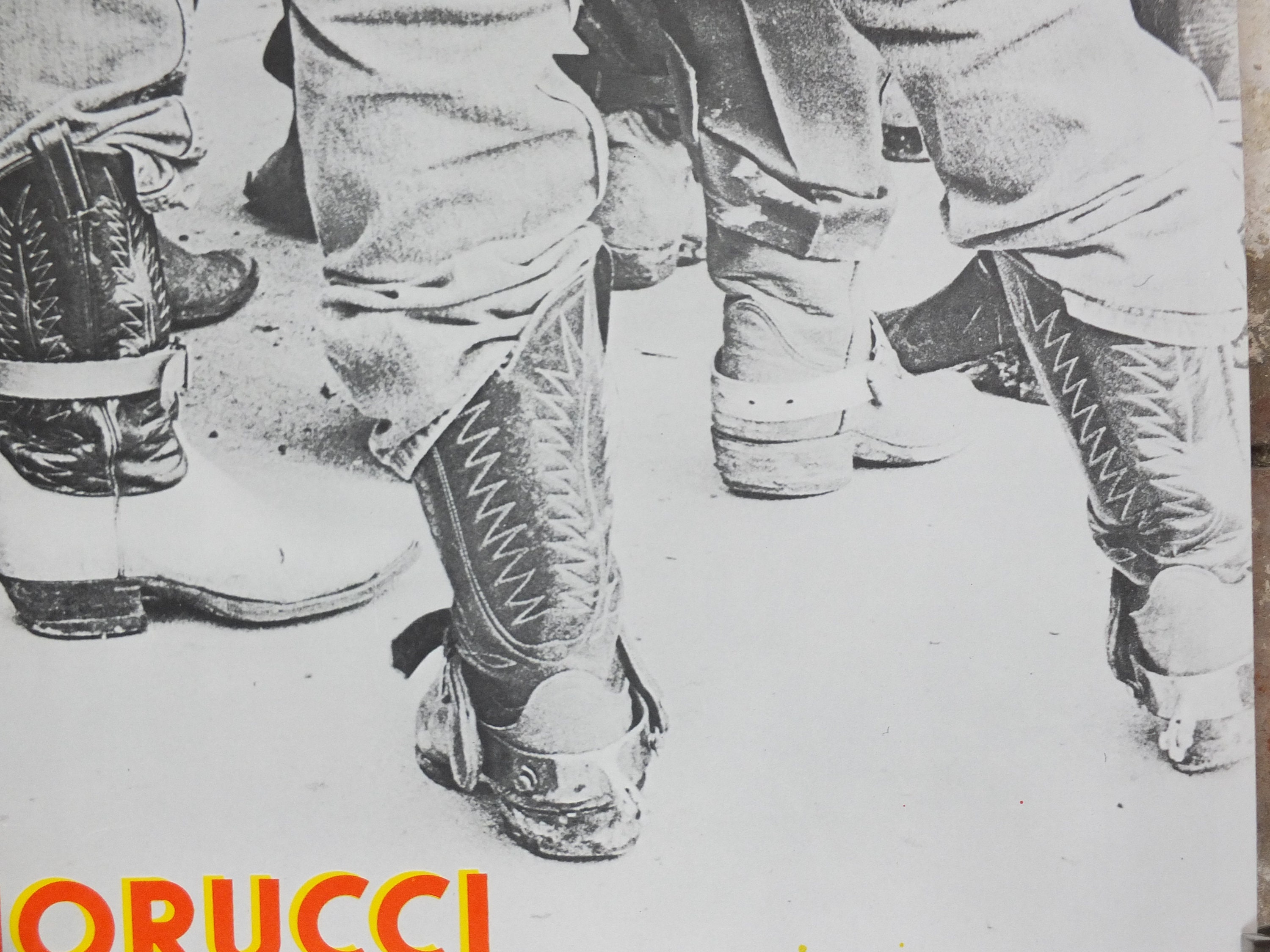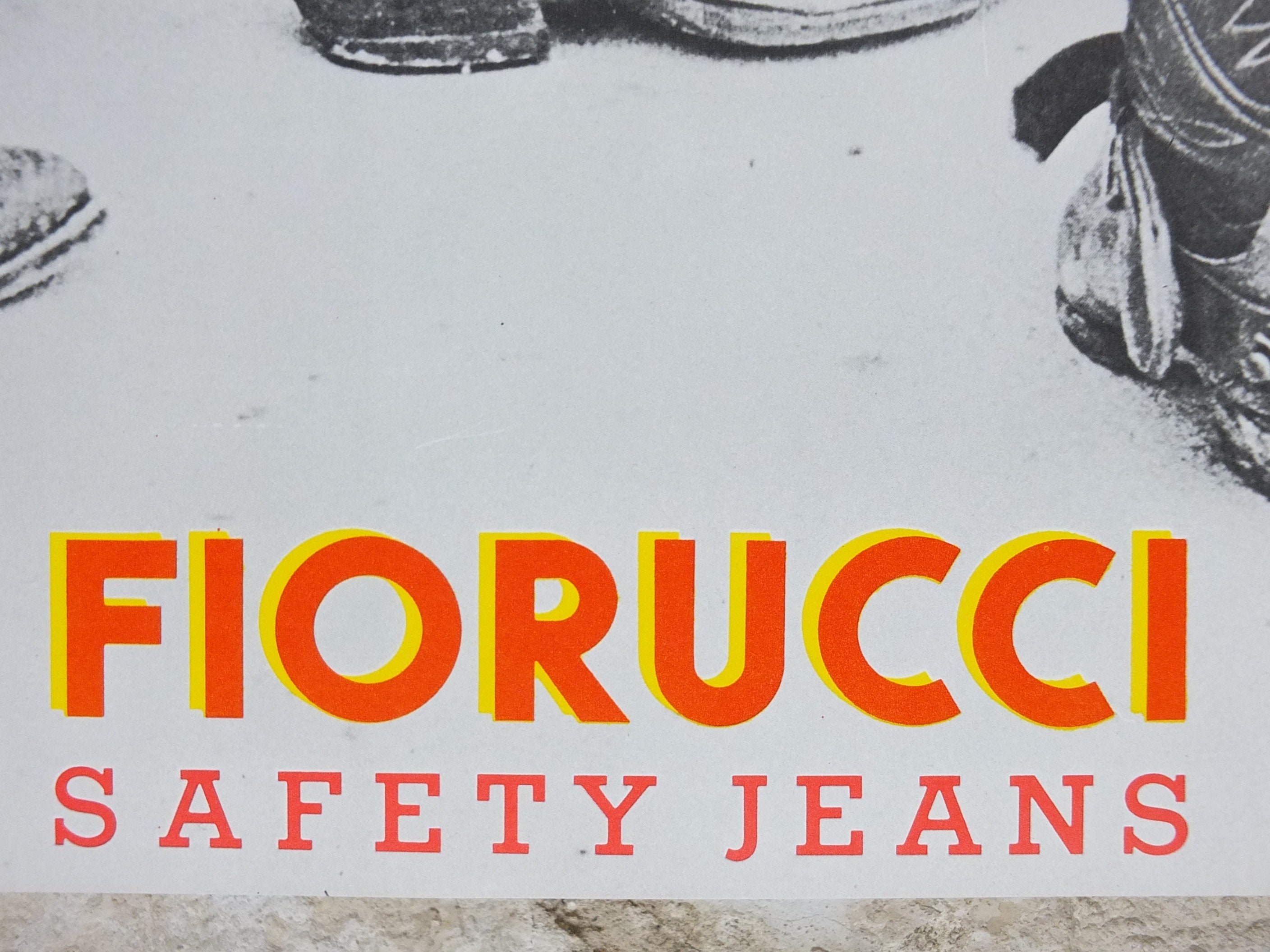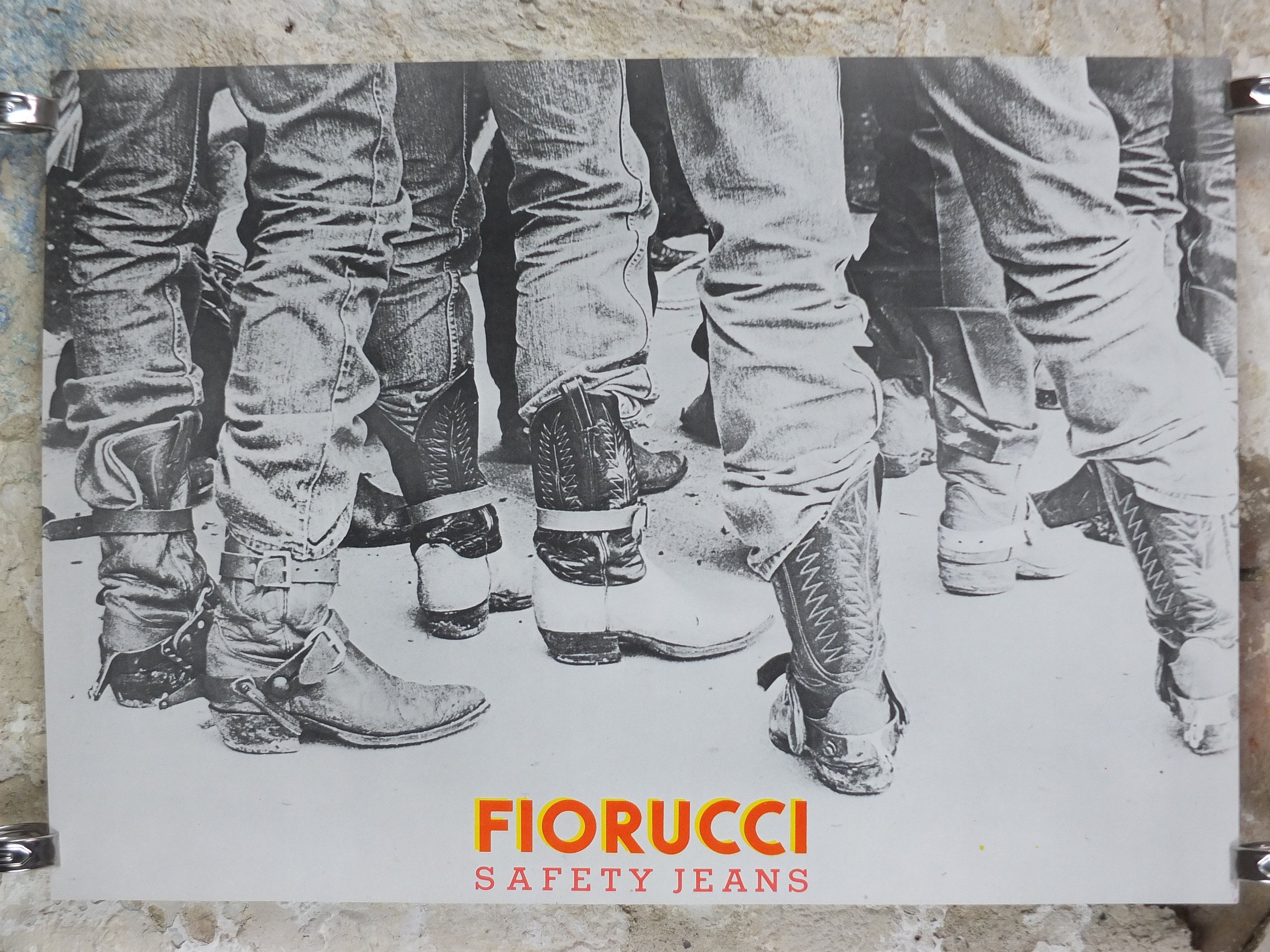 This is a 1980s Fiorucci fashion label poster was produced to advertise Fiorucci's signature 5-pocket "Safety Jeans" of the mid-70s. The photo is from Douglas Kent Hall called "Mesquite, Texas 1973" an American rodeo photo.
