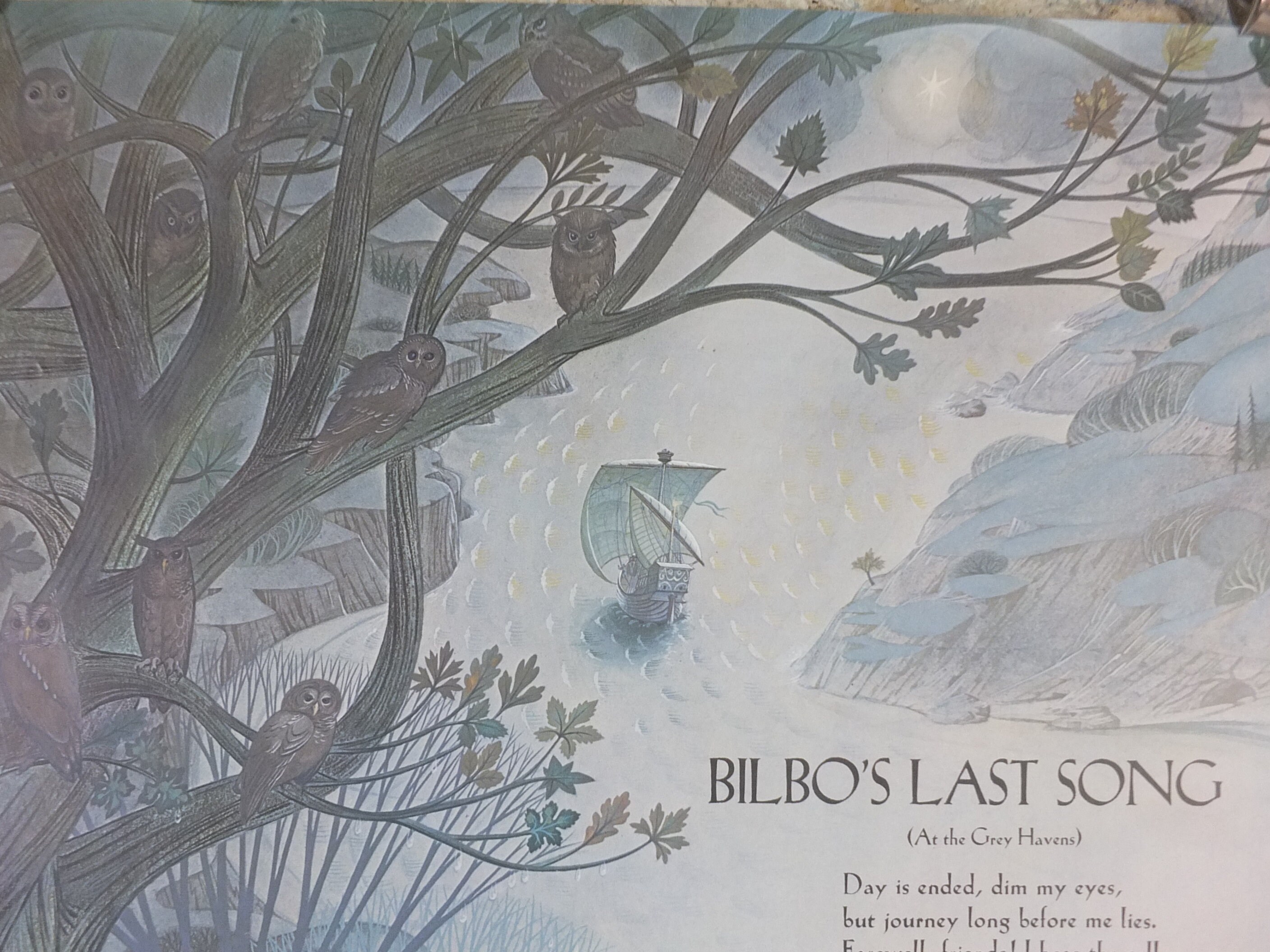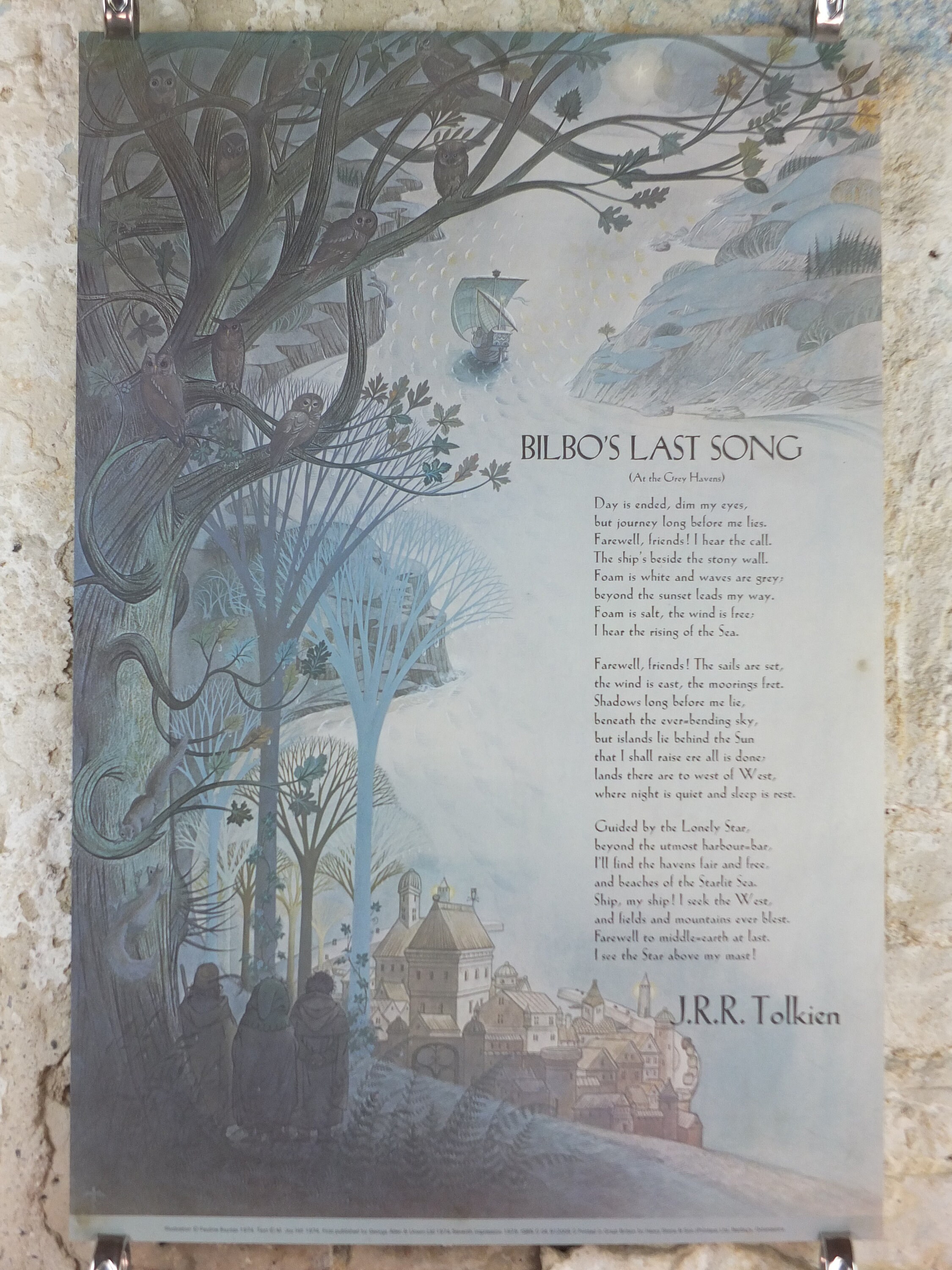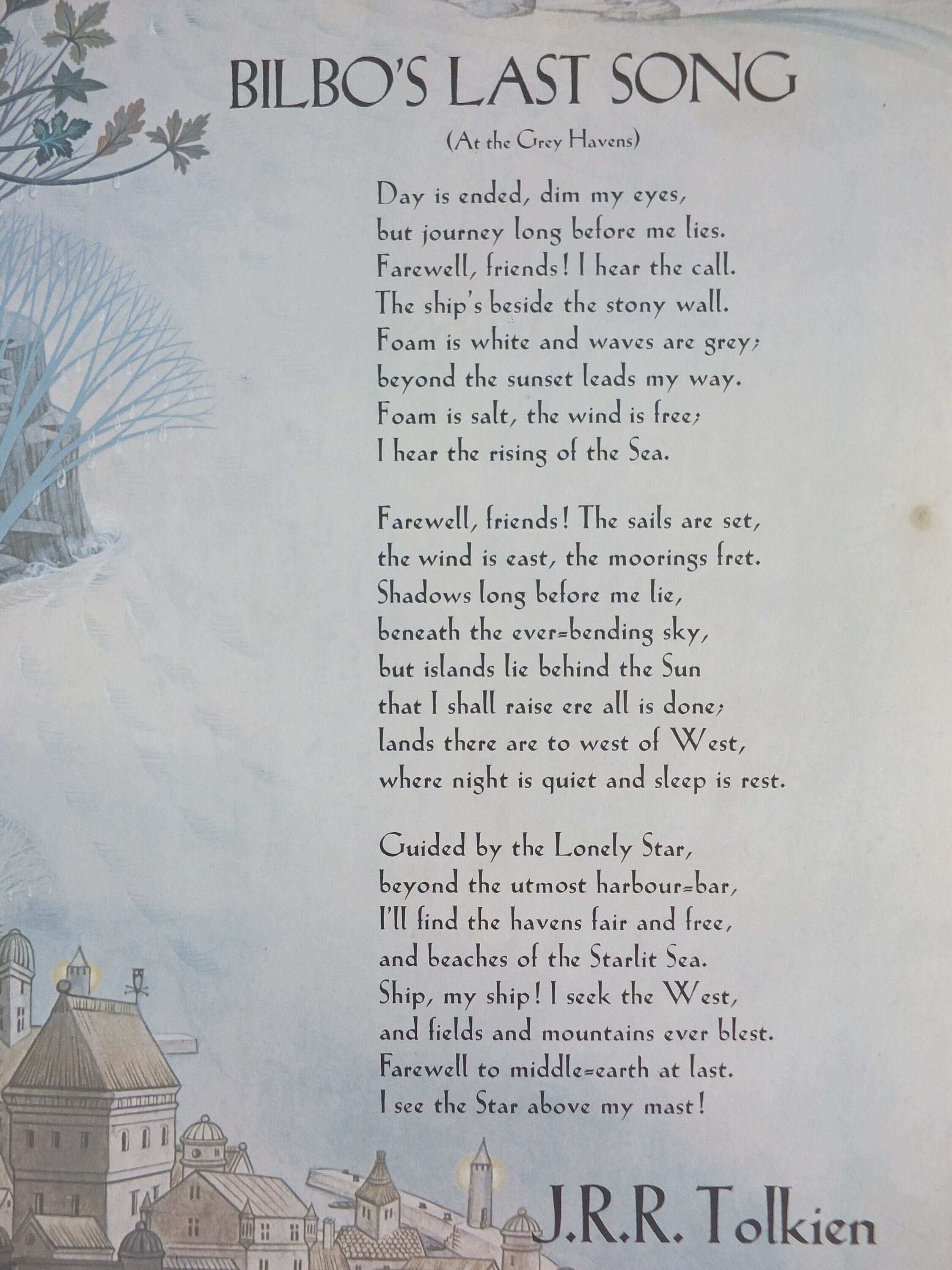 Bilbo's Last Song (at the Grey Havens) is a poem by J. R. R. Tolkien, written as a pendant to his fantasy The Lord of the Rings. It was first published in a Dutch translation in 1973, subsequently appearing in English on posters in 1974 and as a picture-book in 1990. It was illustrated by Pauline Baynes, and set to music by Donald Swann and Stephen Oliver. The poem's copyright was owned by Tolkien's secretary, to whom he gave it in gratitude for her work for him.