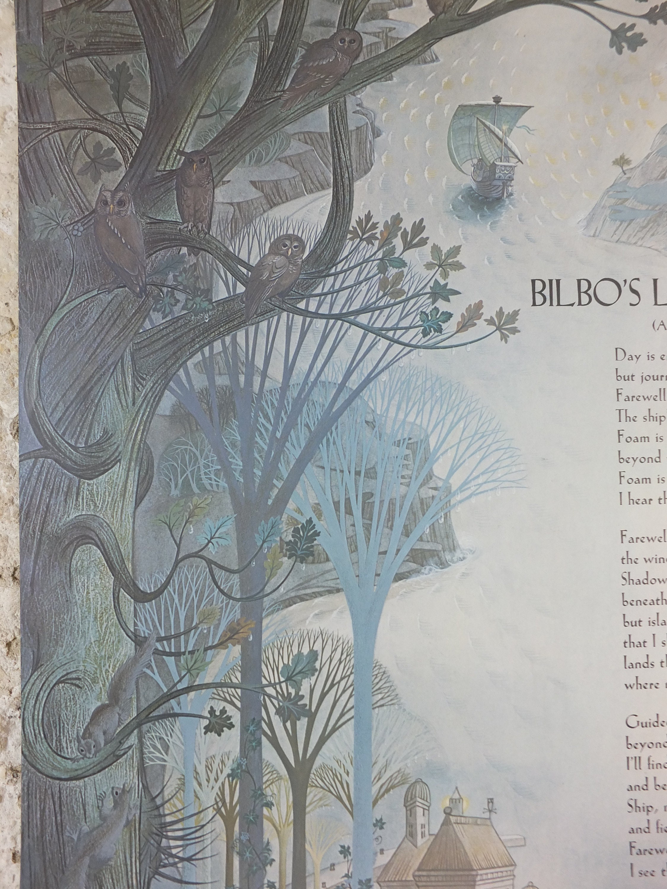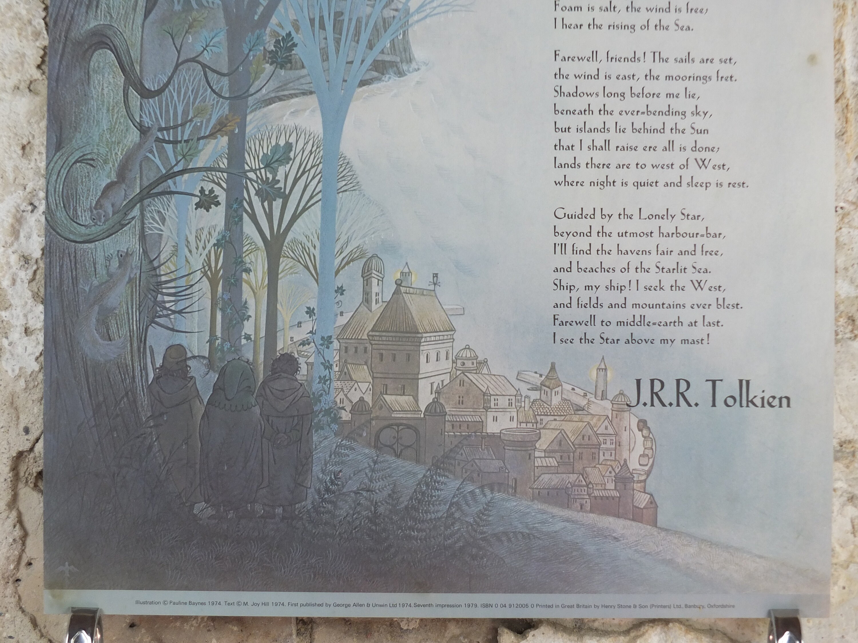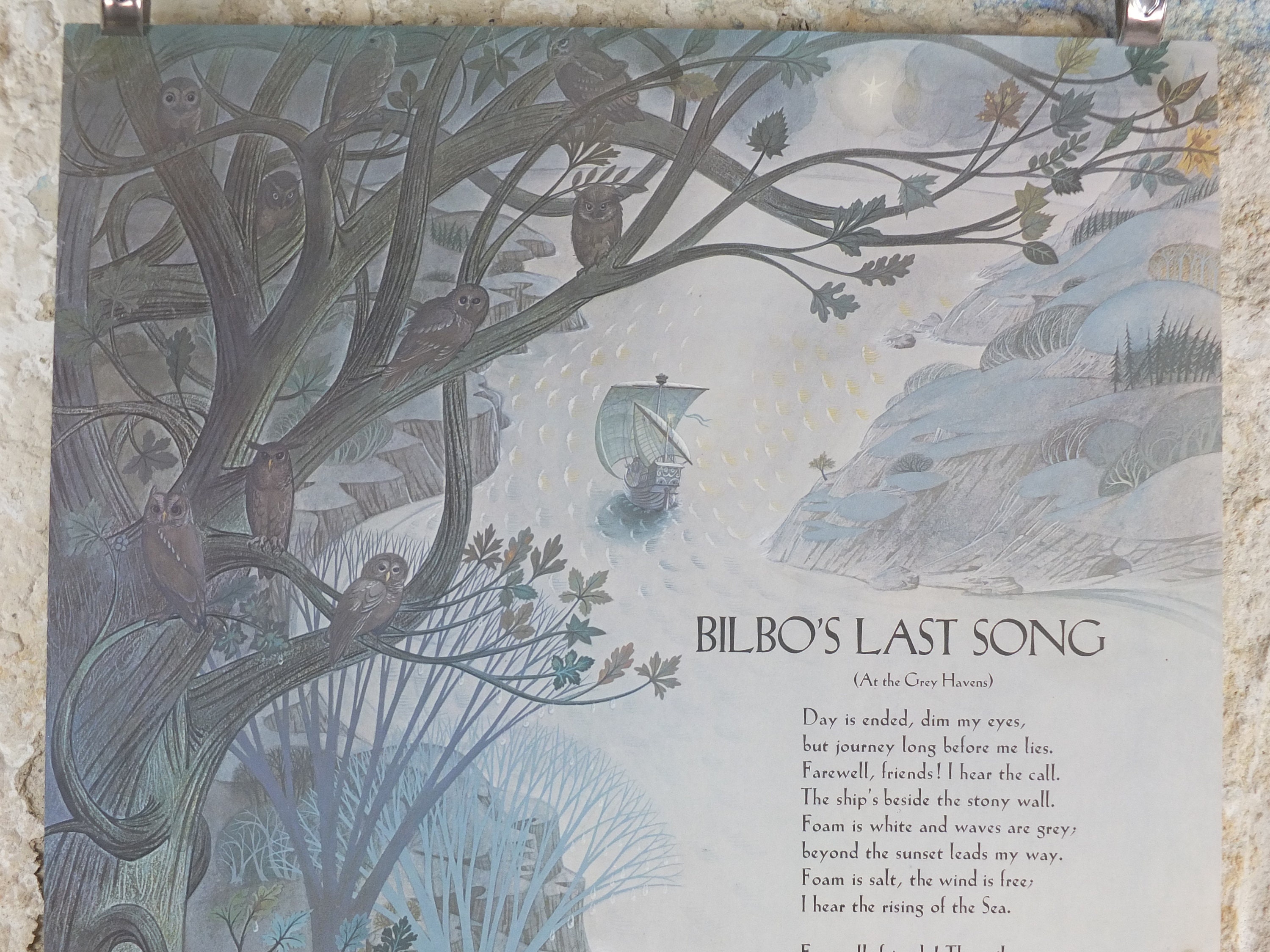 Bilbo's Last Song (at the Grey Havens) is a poem by J. R. R. Tolkien, written as a pendant to his fantasy The Lord of the Rings. It was first published in a Dutch translation in 1973, subsequently appearing in English on posters in 1974 and as a picture-book in 1990. It was illustrated by Pauline Baynes, and set to music by Donald Swann and Stephen Oliver. The poem's copyright was owned by Tolkien's secretary, to whom he gave it in gratitude for her work for him.