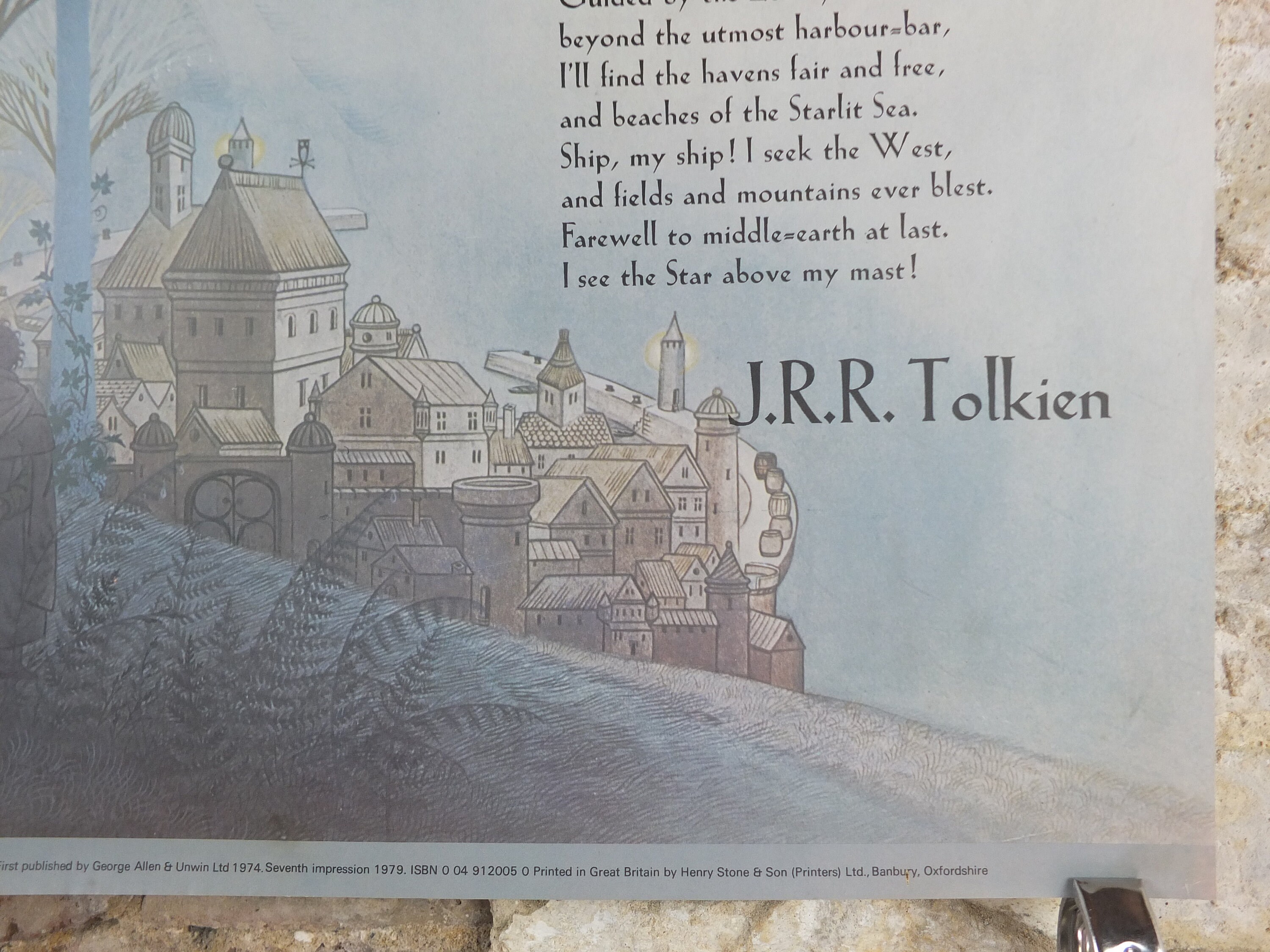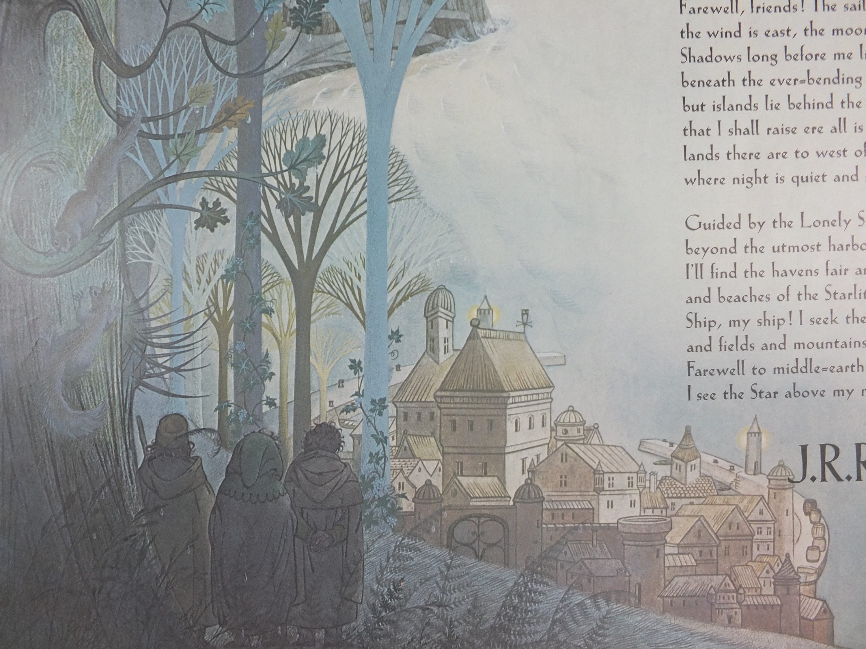 This is a 1979 image of Bilbo's farewell to Middle Earth at the end of the Third Age when he leaves with Frodo, Gandalf and the last of the Elves from the Gray Havens as they depart to the West.