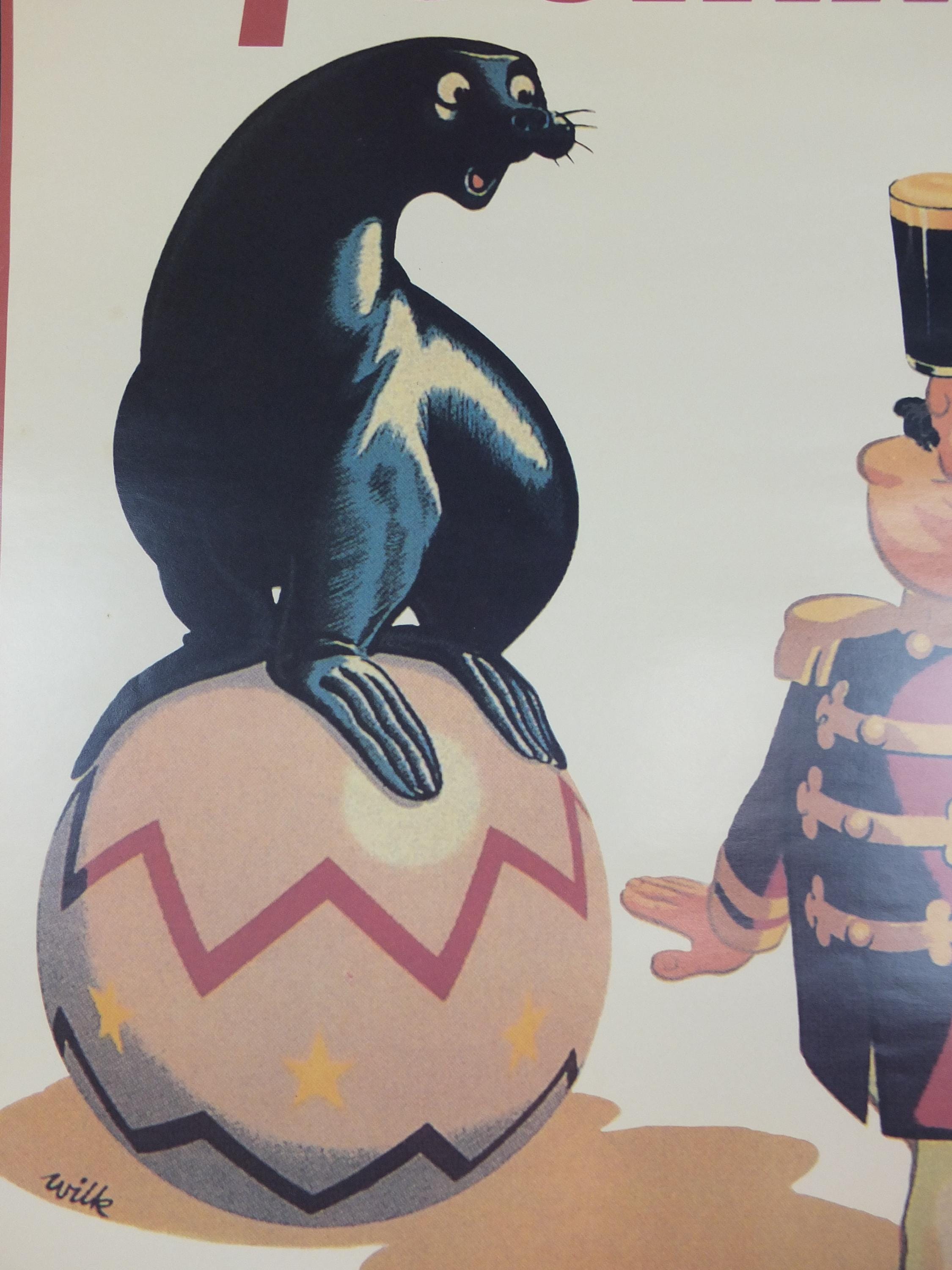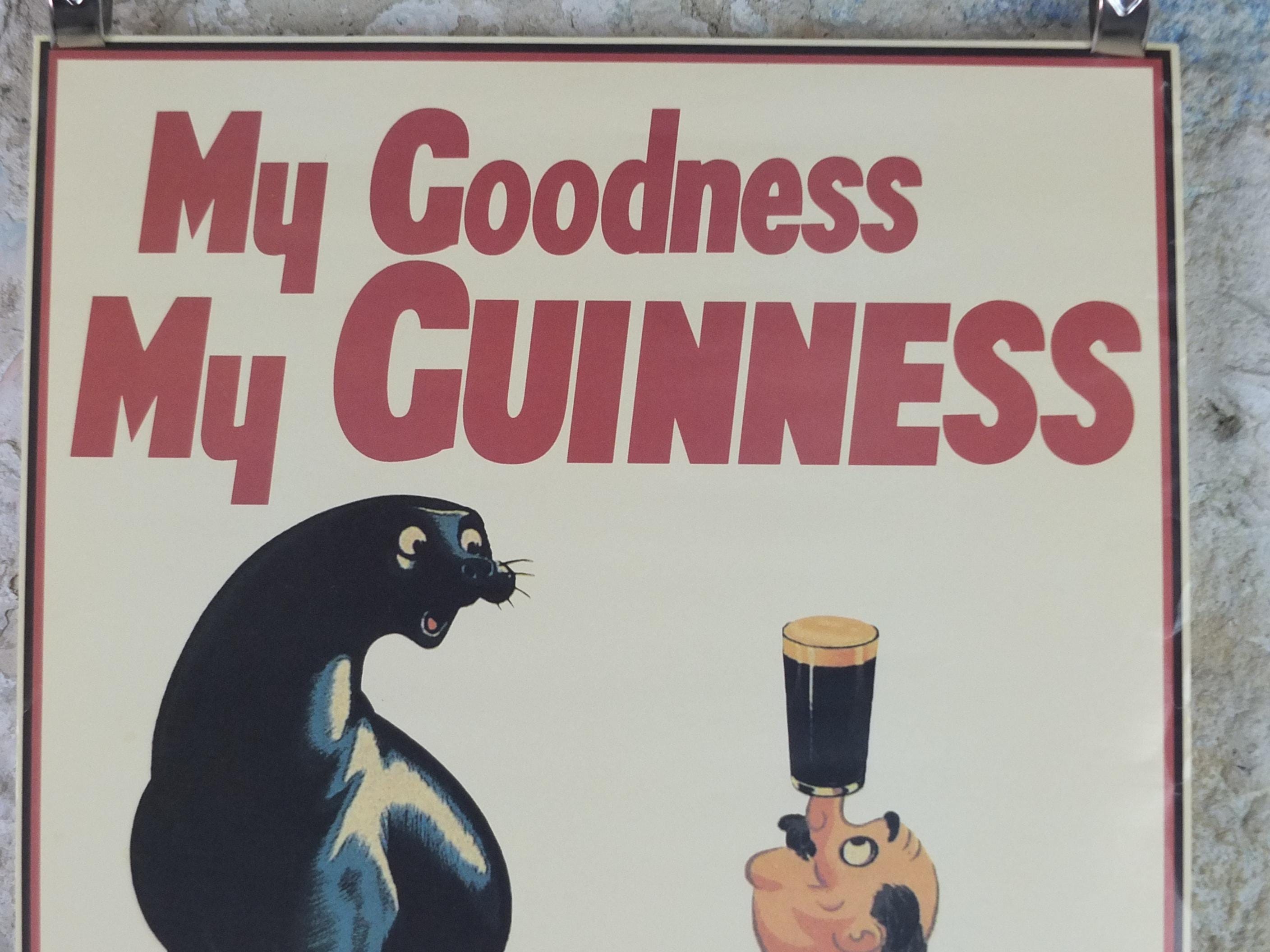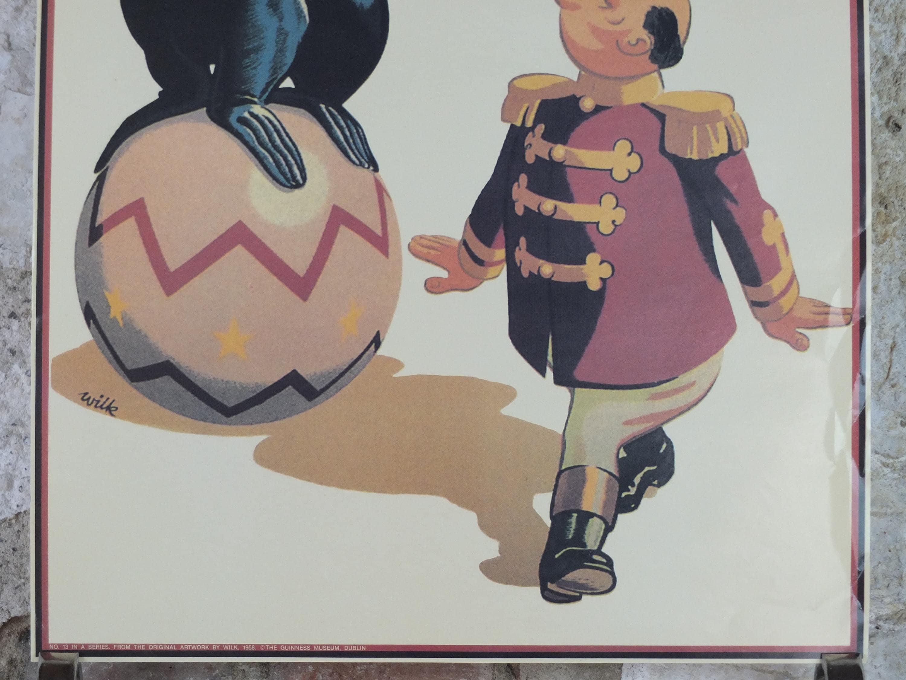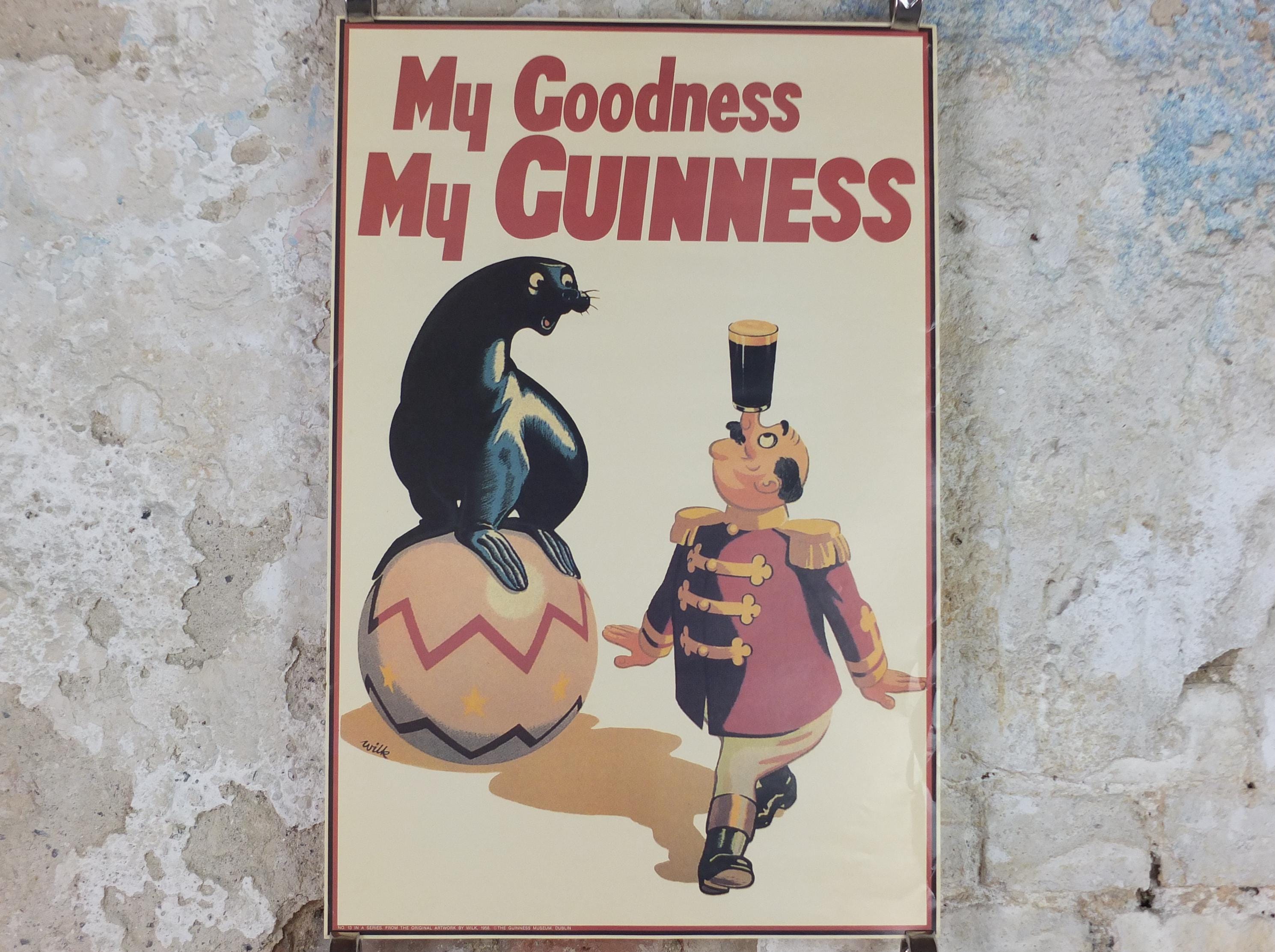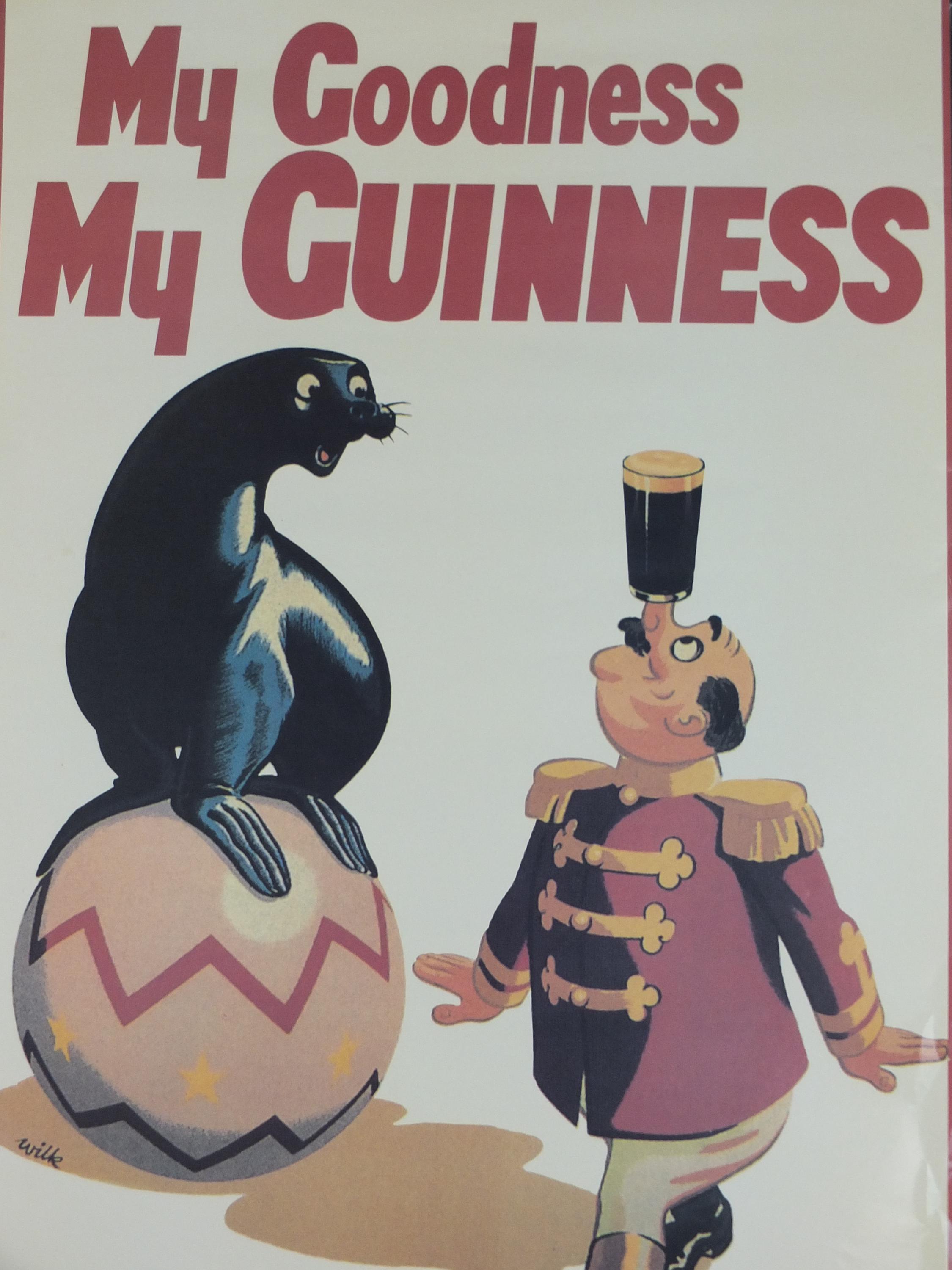 This is a mid 1990s poster from the Guinness Museum in Dublin. It shows the zookeeper balancing his pint of Guinness on his nose. A seal looks on balancing on a ball. The zookeeper is trying to outdo the seal. Apparently a clever sea lion started all this for John Gilroy who thought the animal was so smart it could have balanced a pint on his nose. The rest is history.