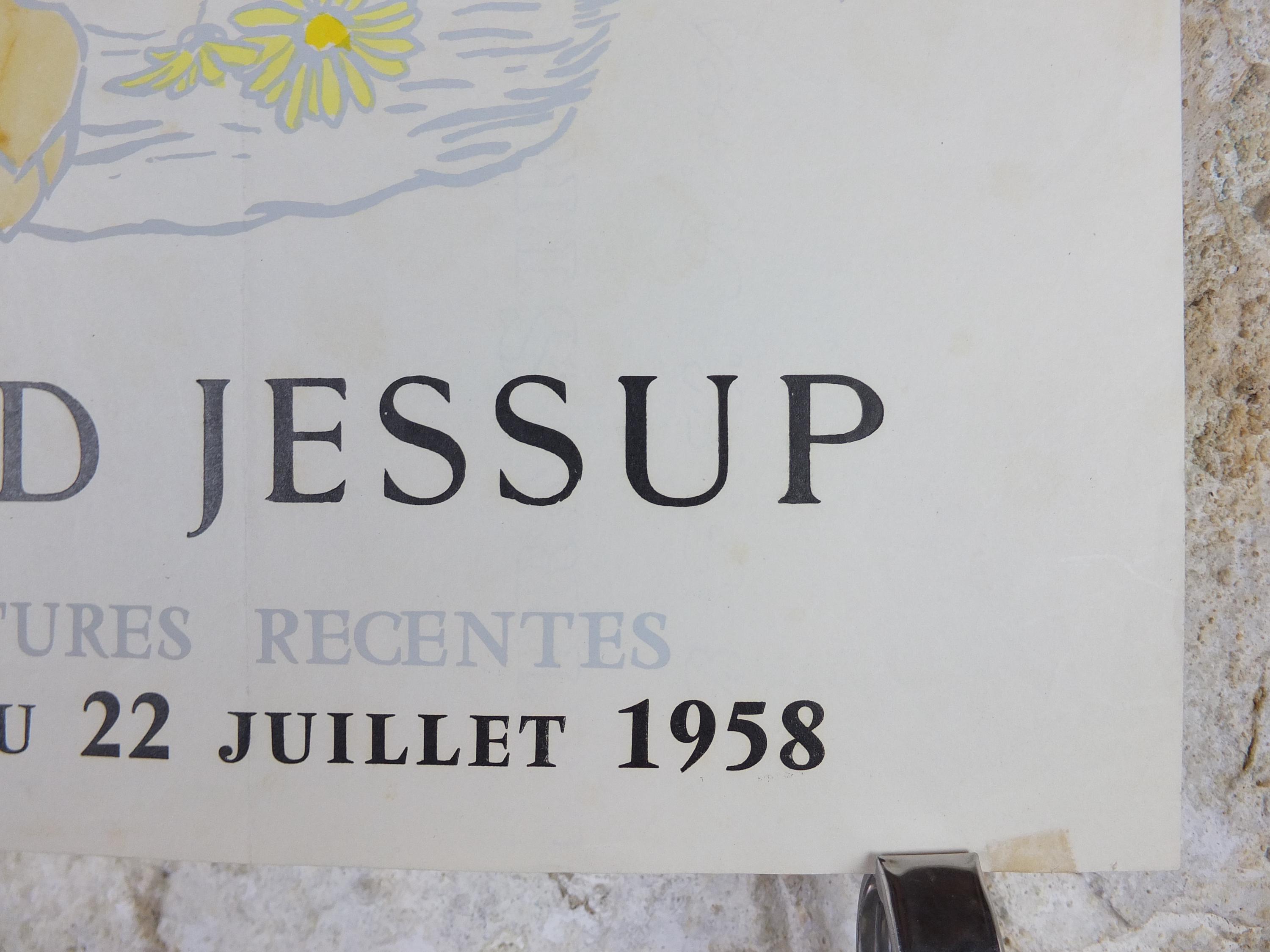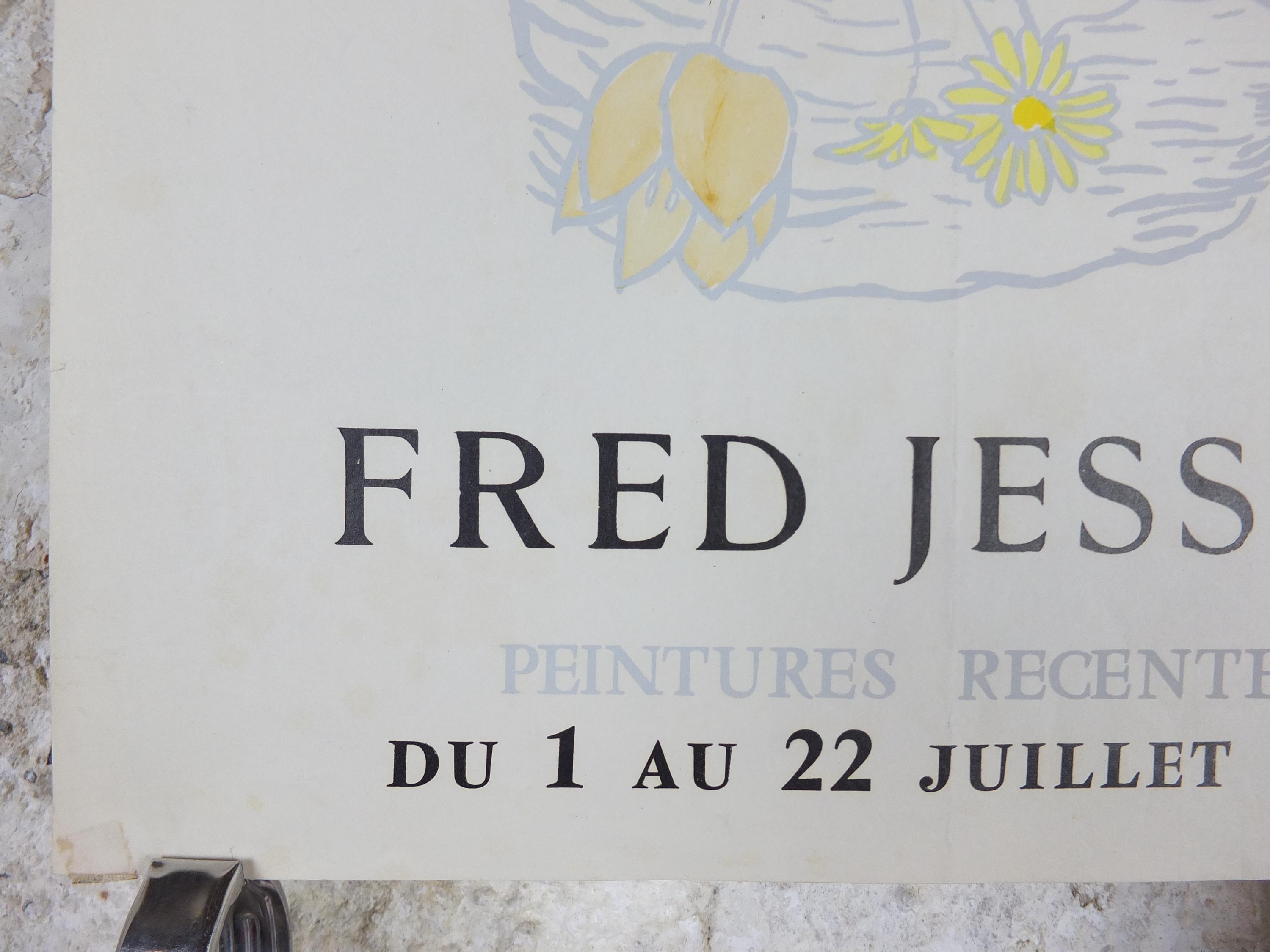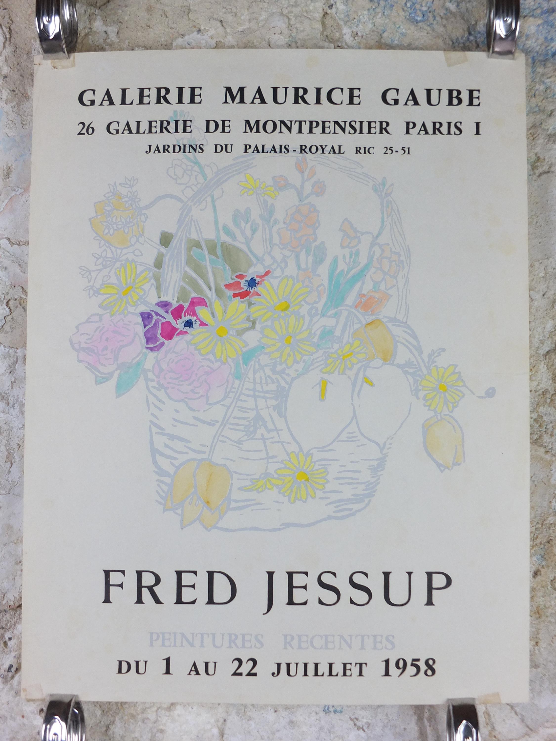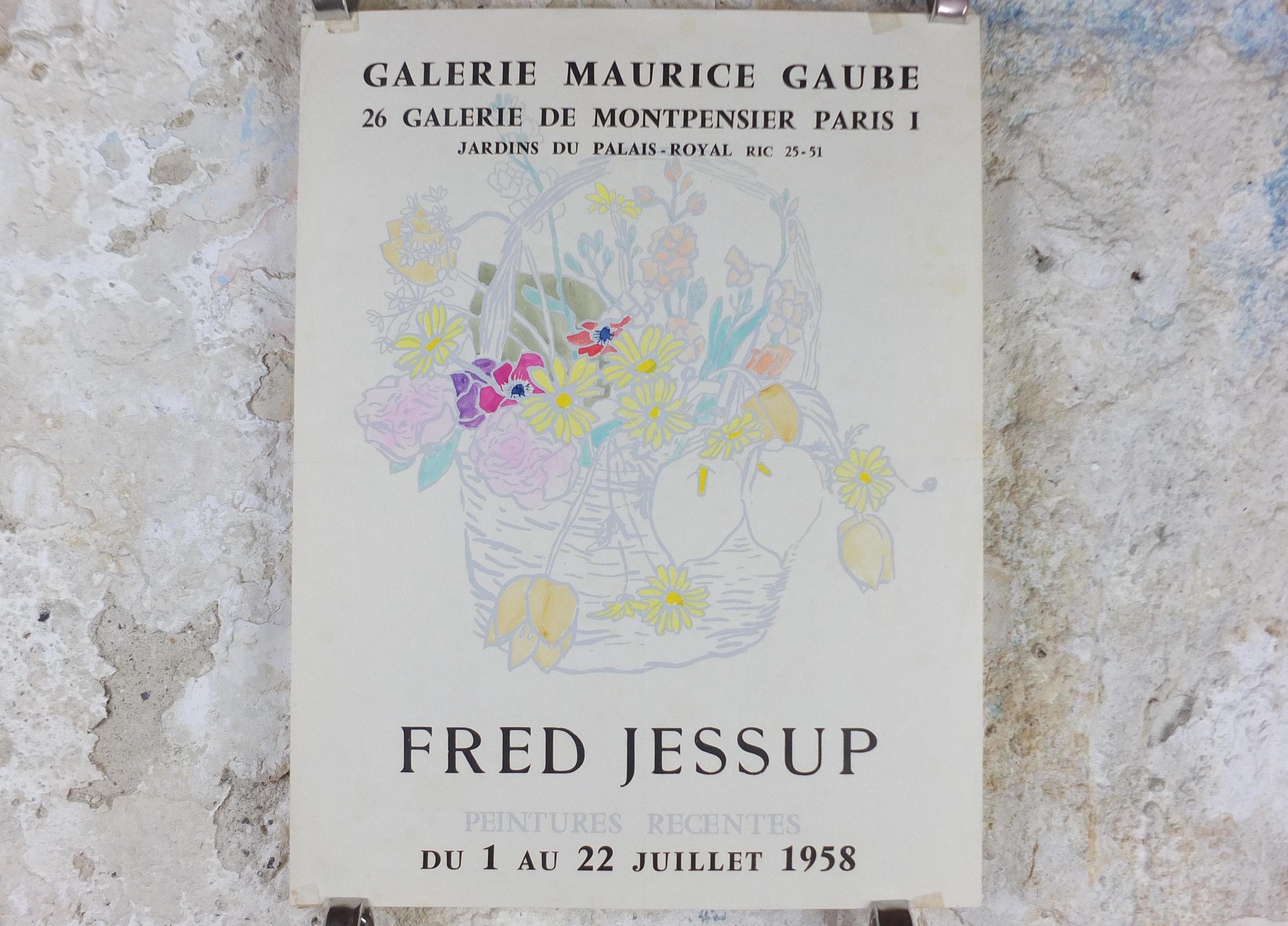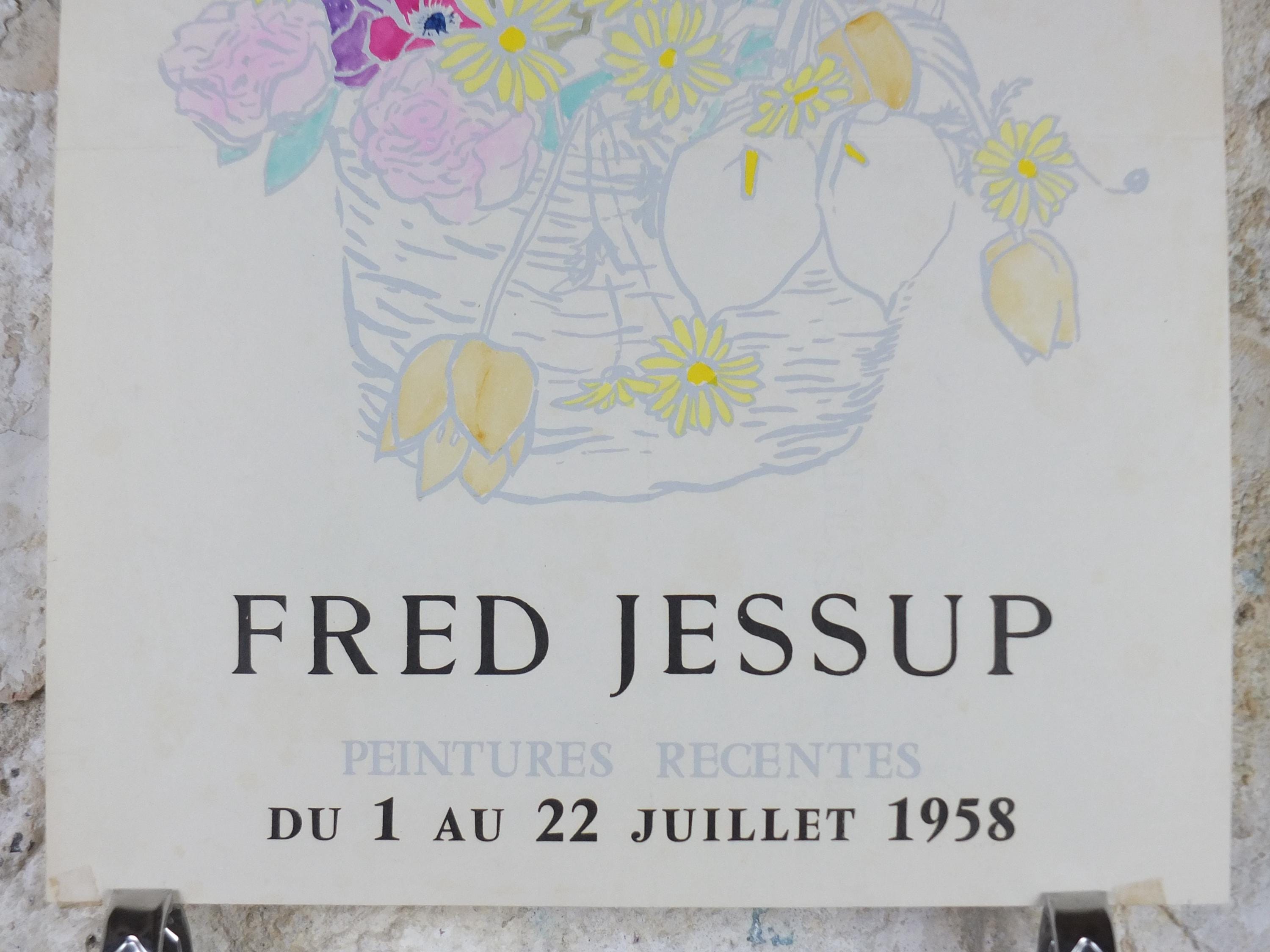 This original Fred Jessup 1958 exhibition poster is from Paris, France for an exhibition featuring a light still life painting of a basket of flowers including roses, lilies, tulips and dandelions.