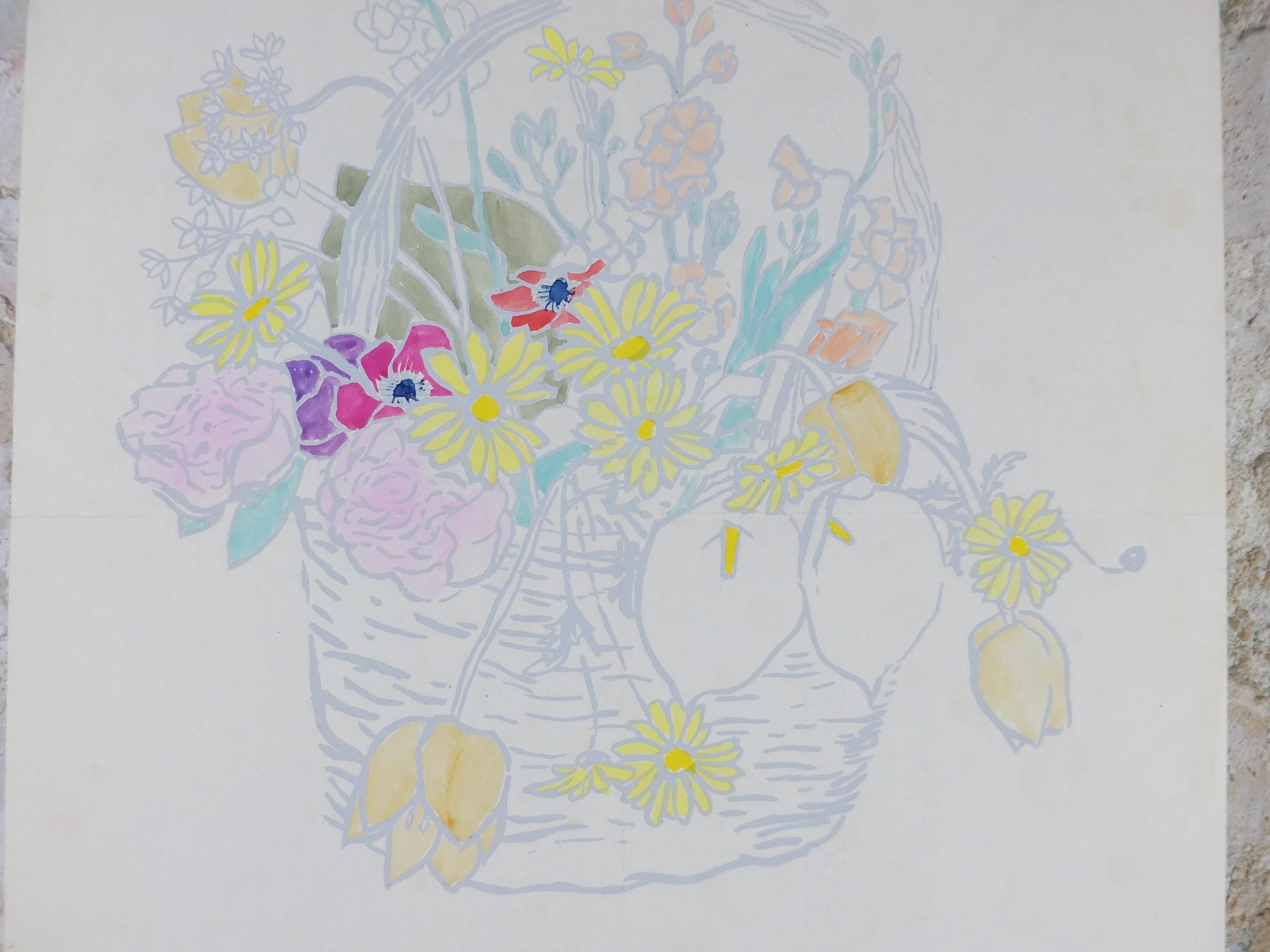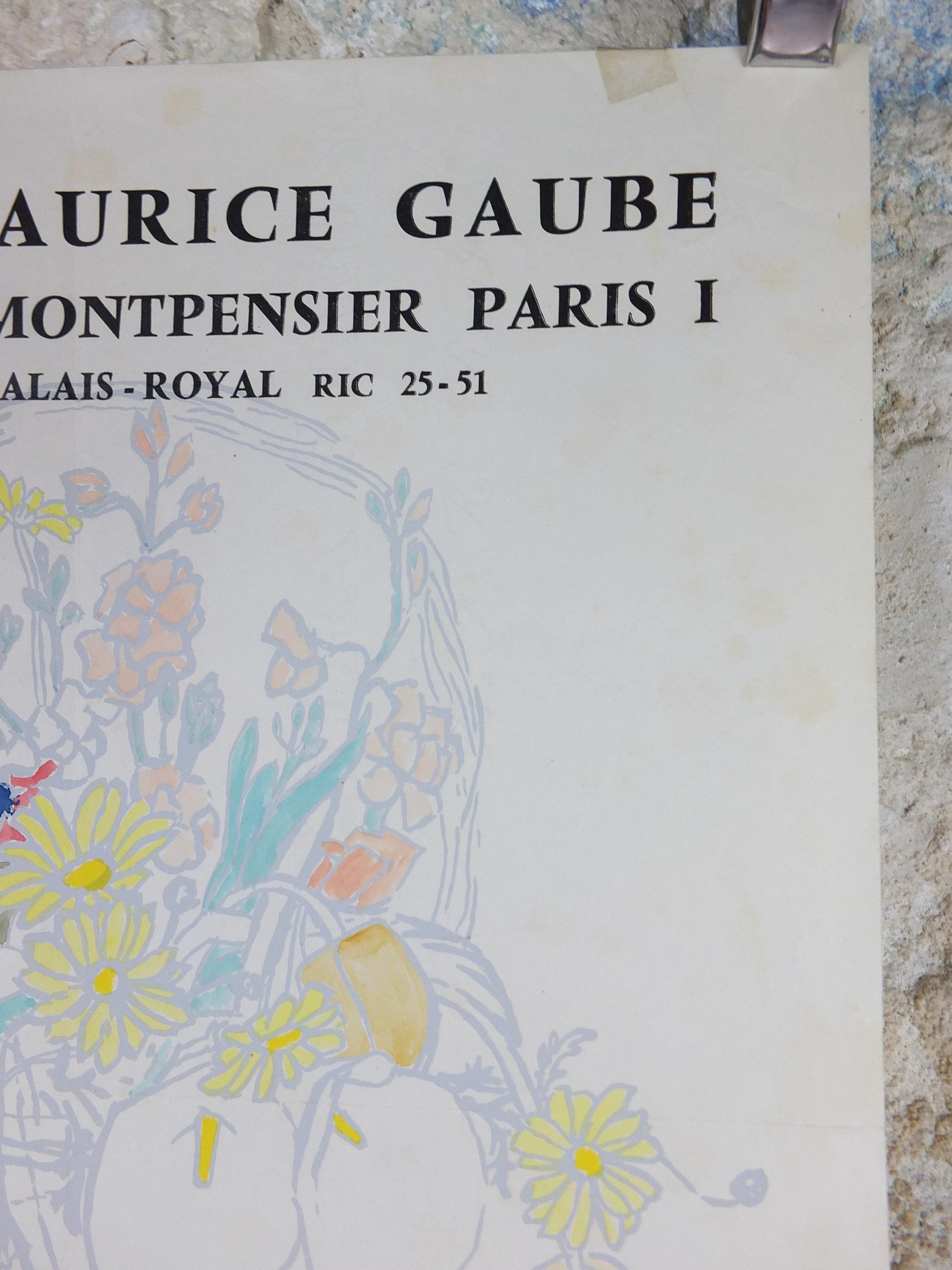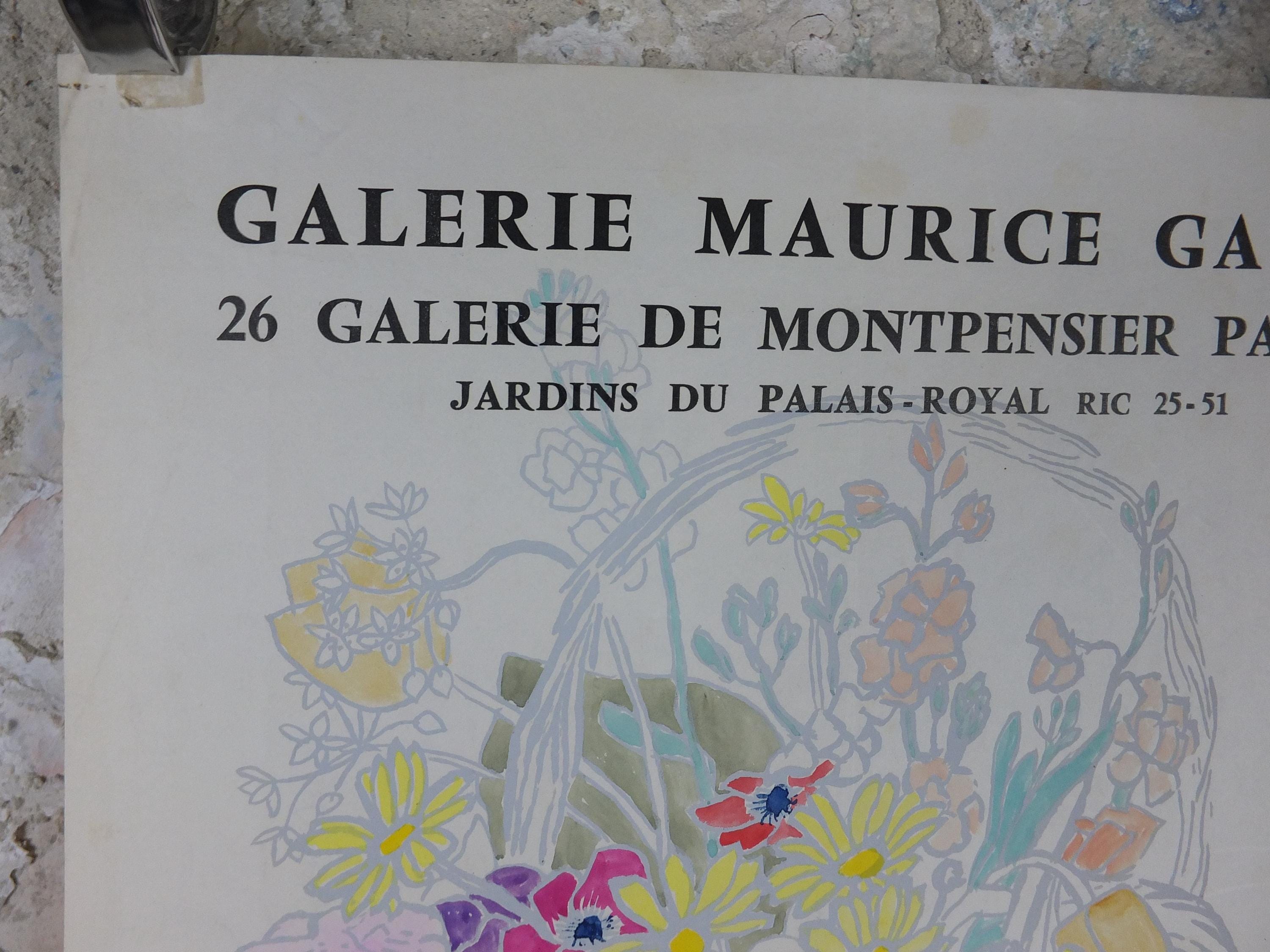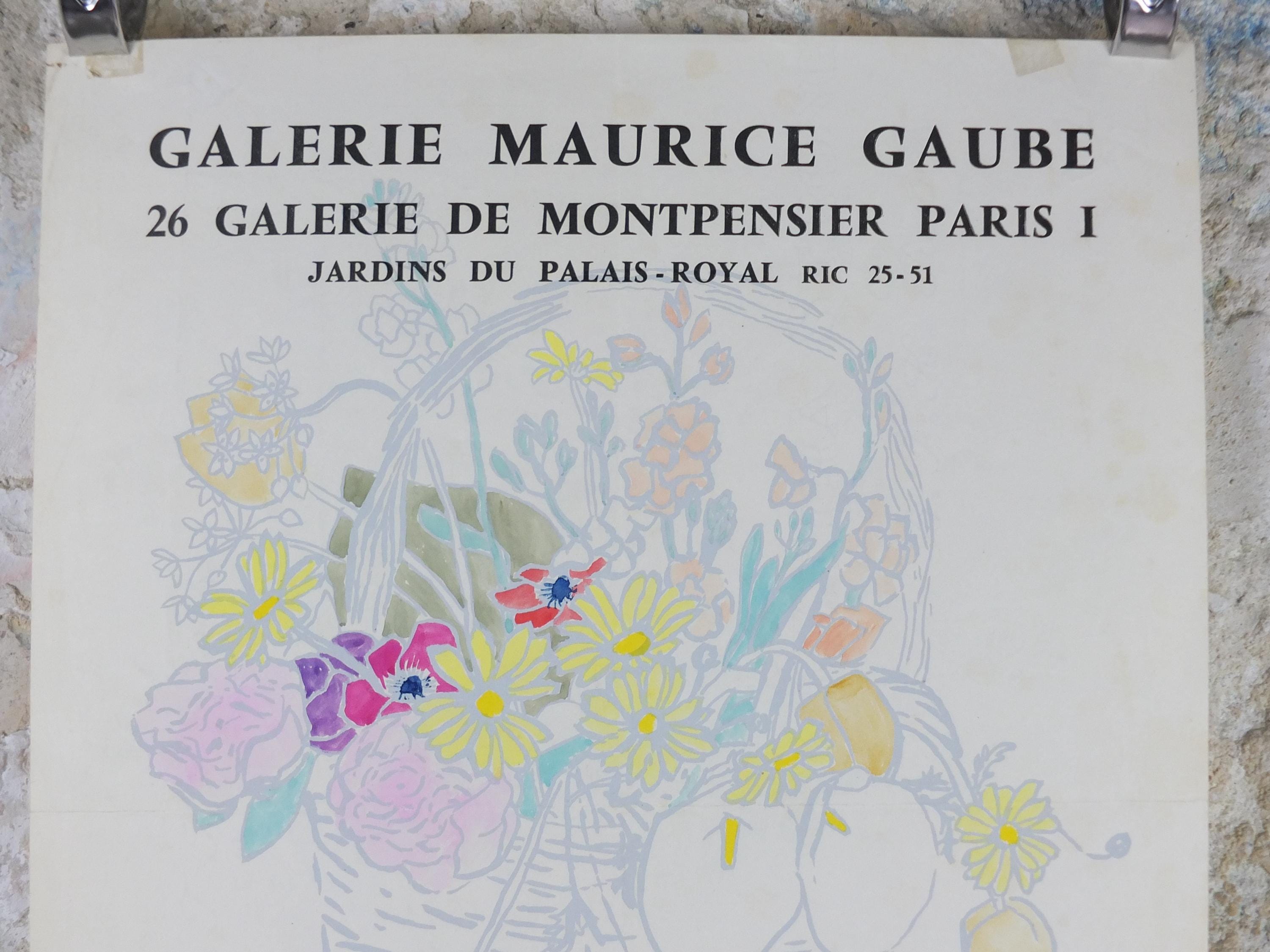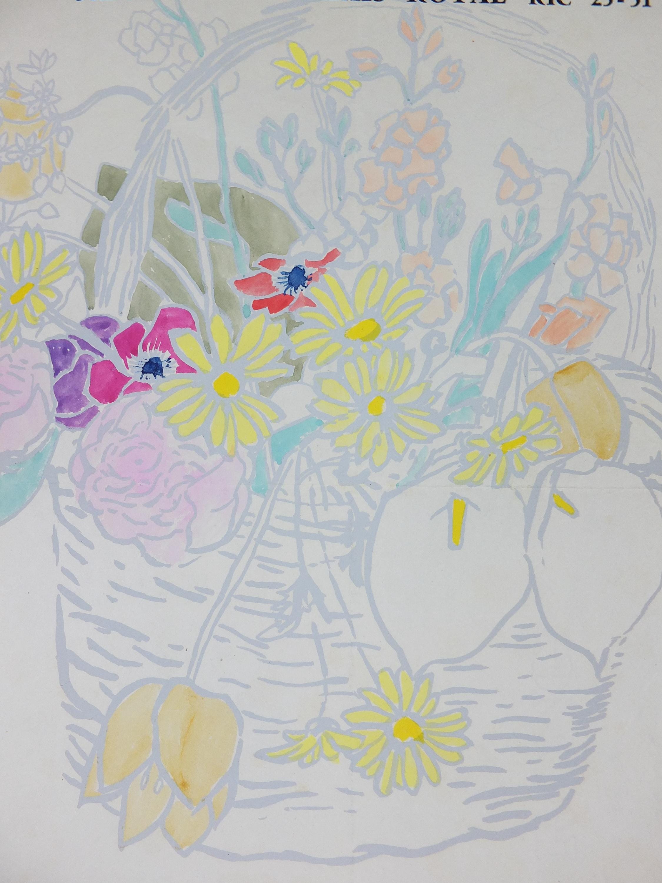 This original Fred Jessup 1958 exhibition poster is from Paris, France for an exhibition featuring a light still life painting of a basket of flowers including roses, lilies, tulips and dandelions.