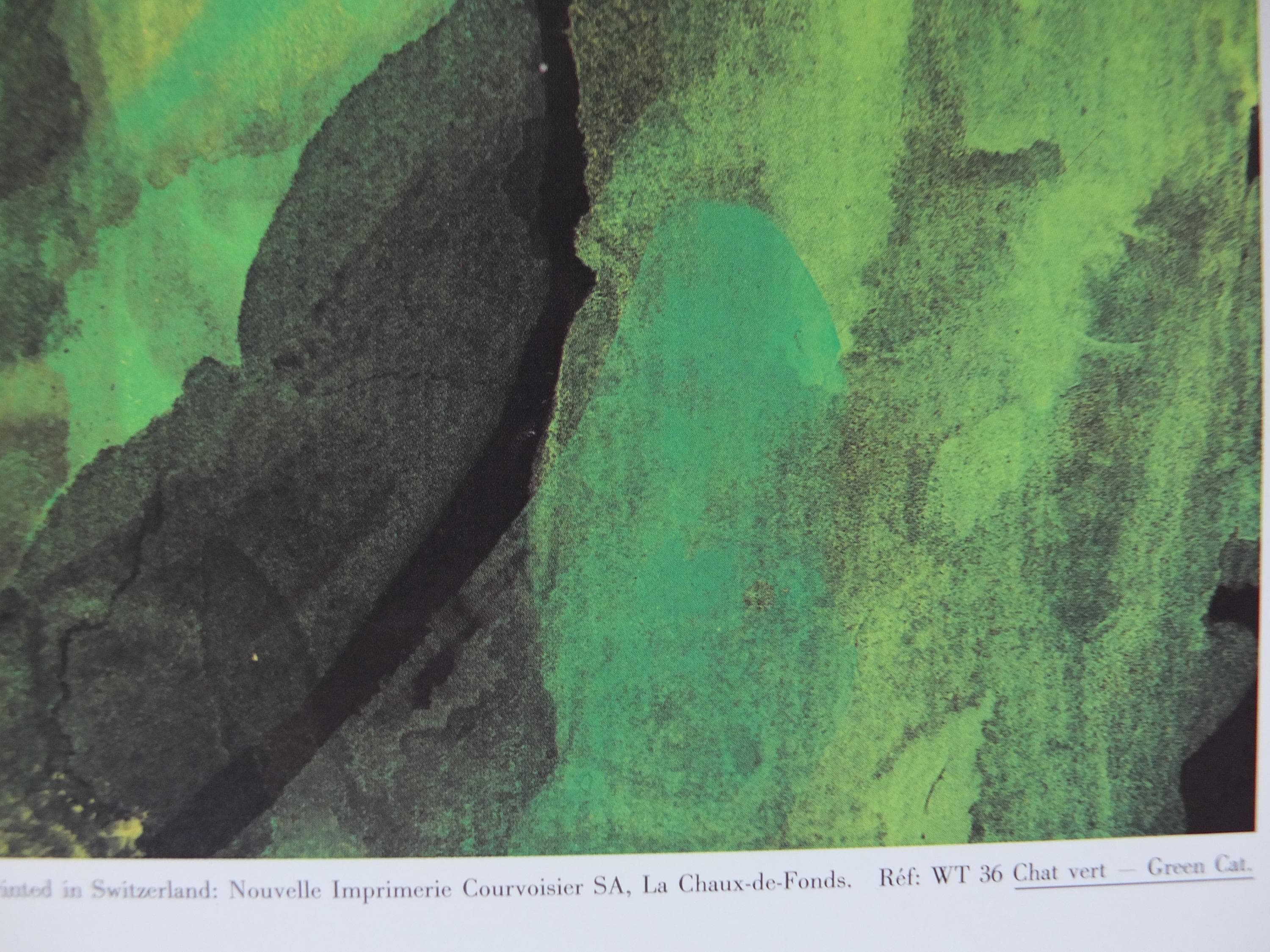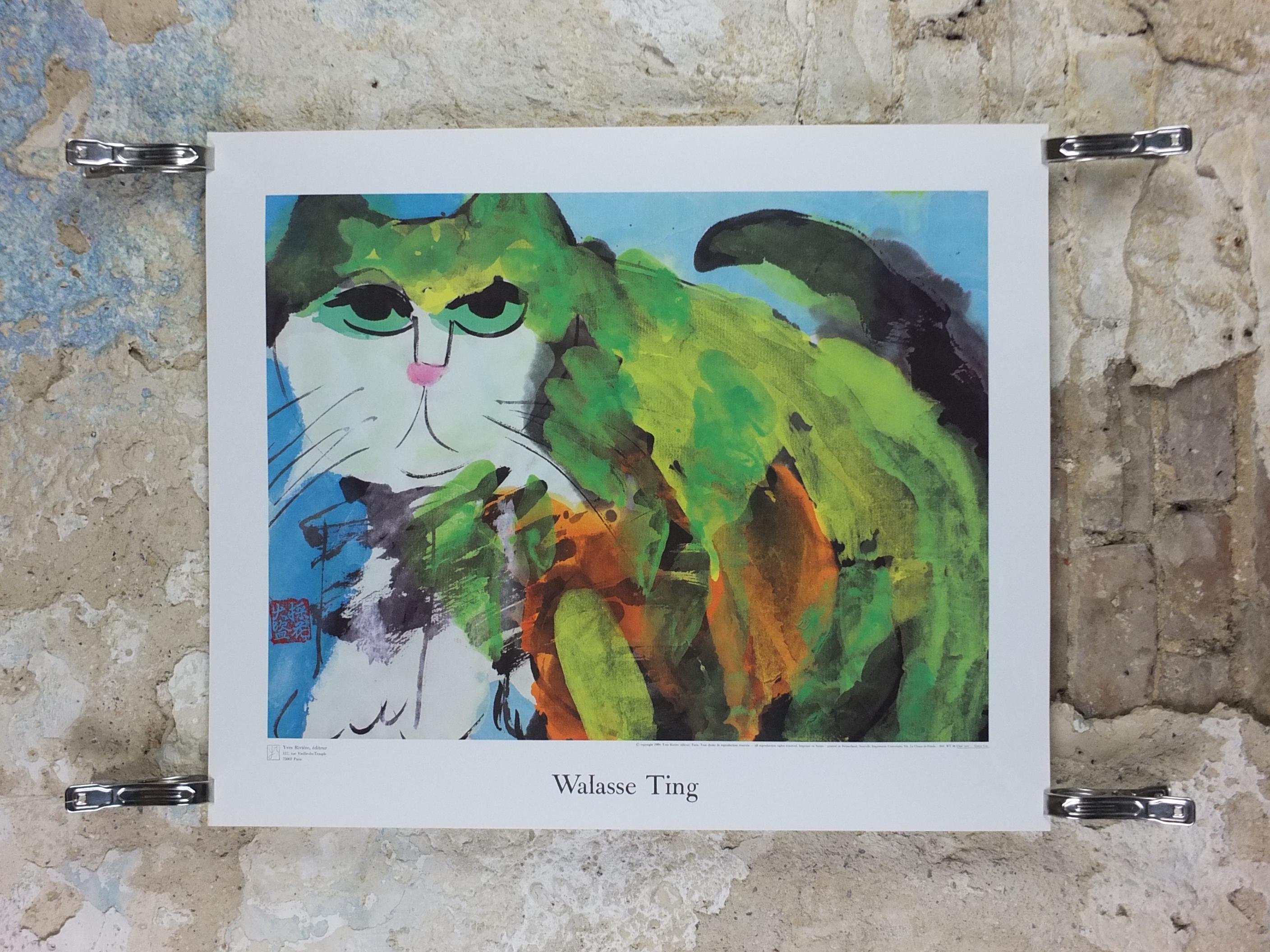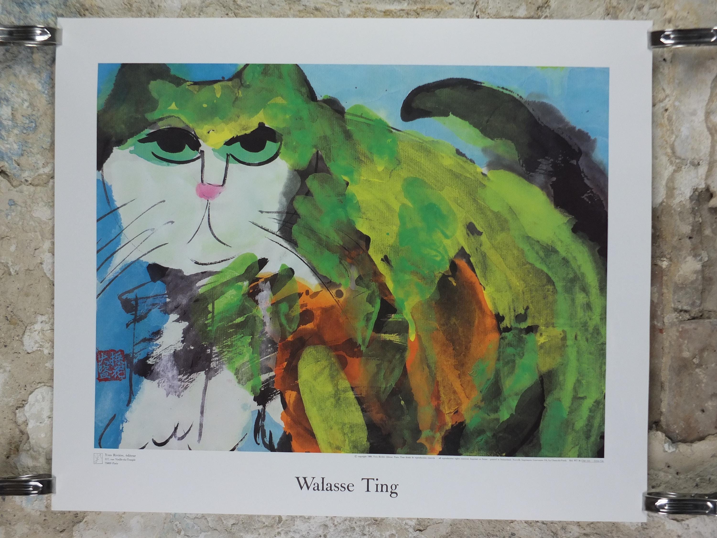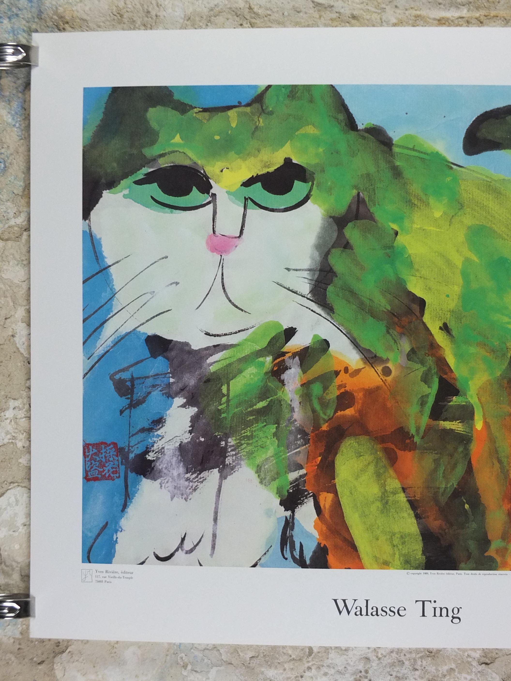 This colourful Walasse Ting exhibition poster is from the Yves Riviere in Paris, France for an exhibition in 1989 featuring "Green Cat" and shows a pleasant looking cat comprised of broad, thick strokes of green with a little orange.