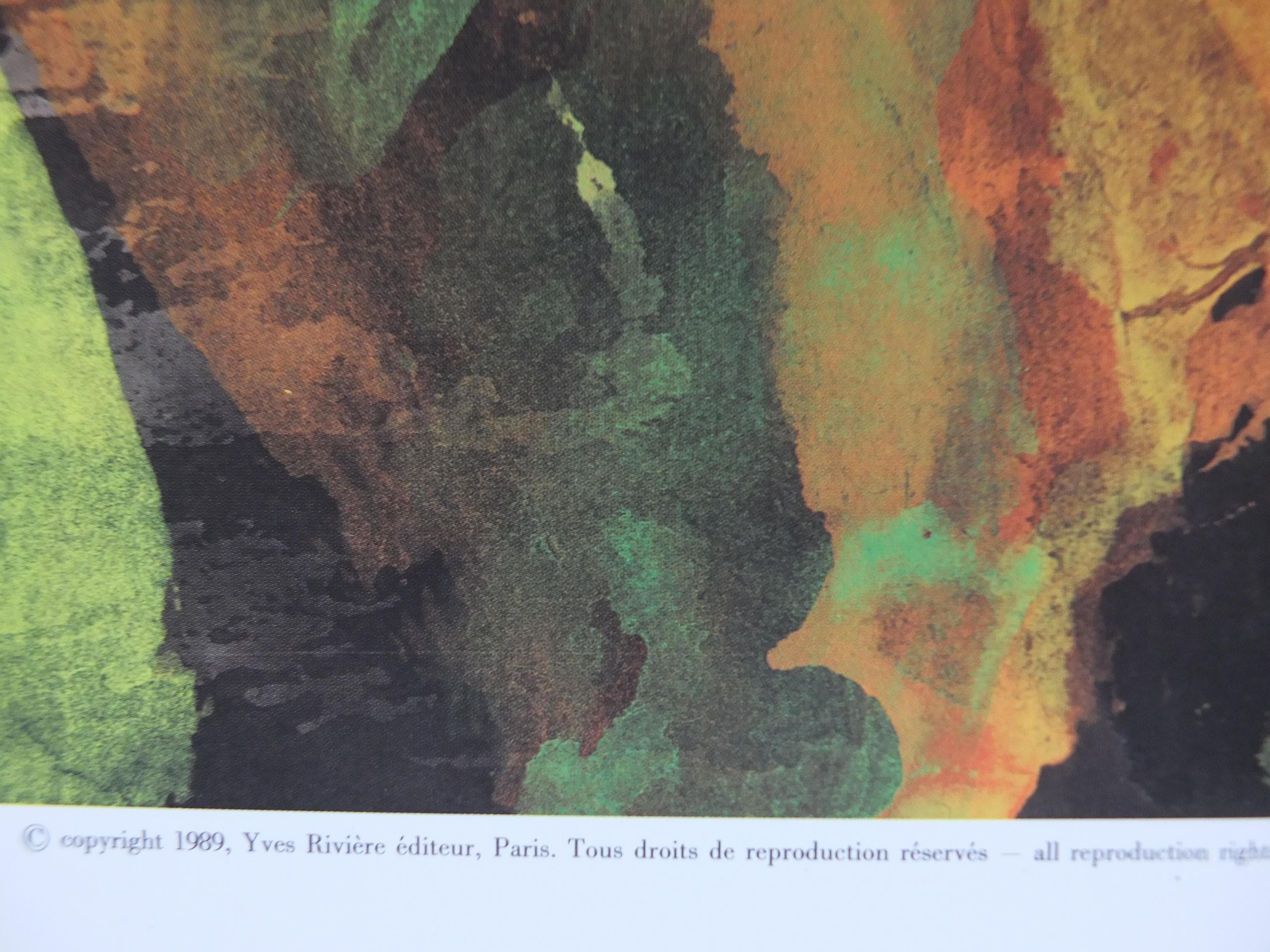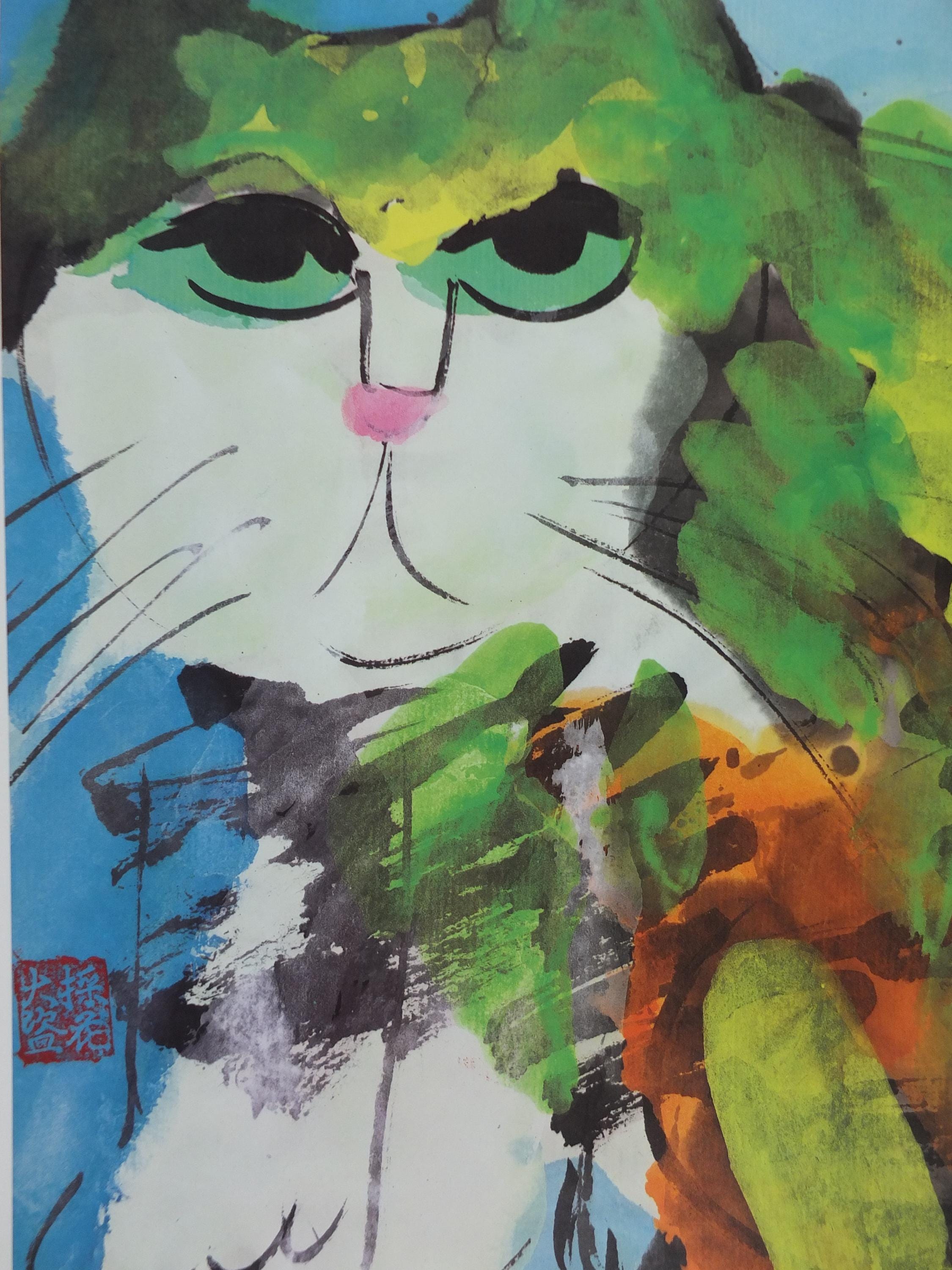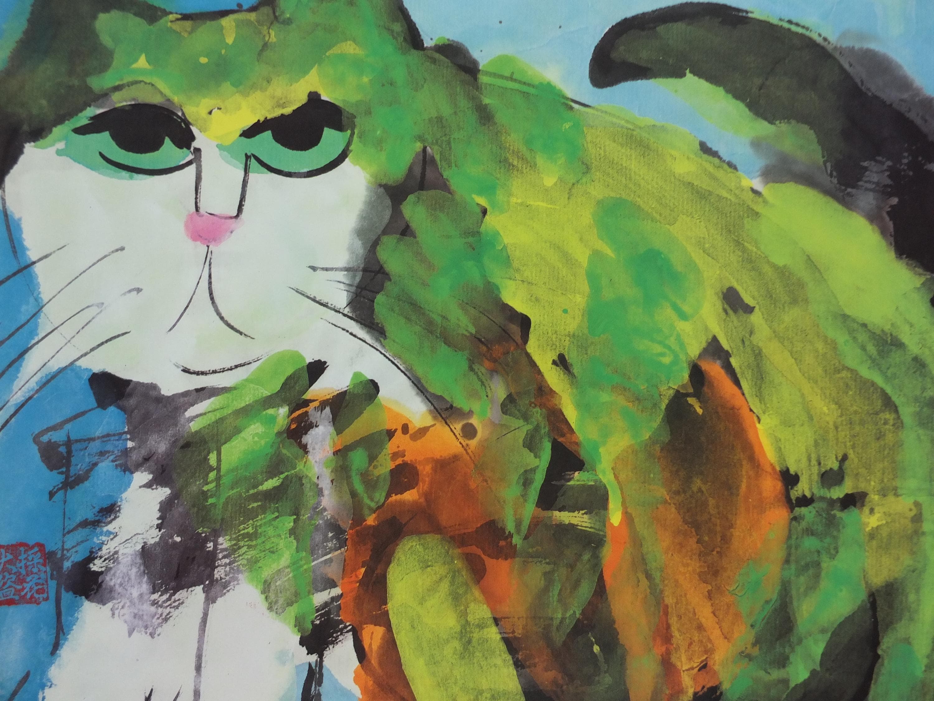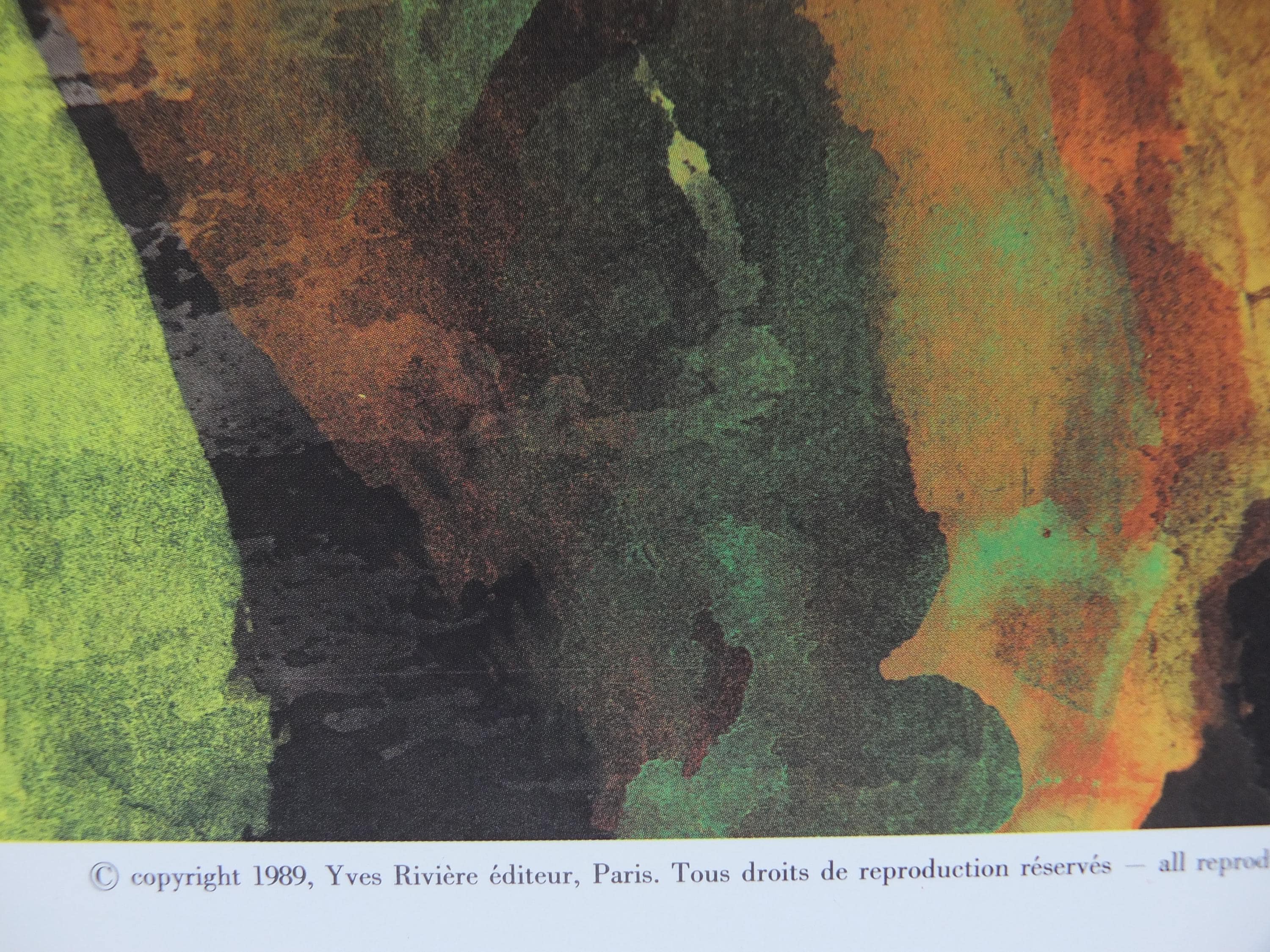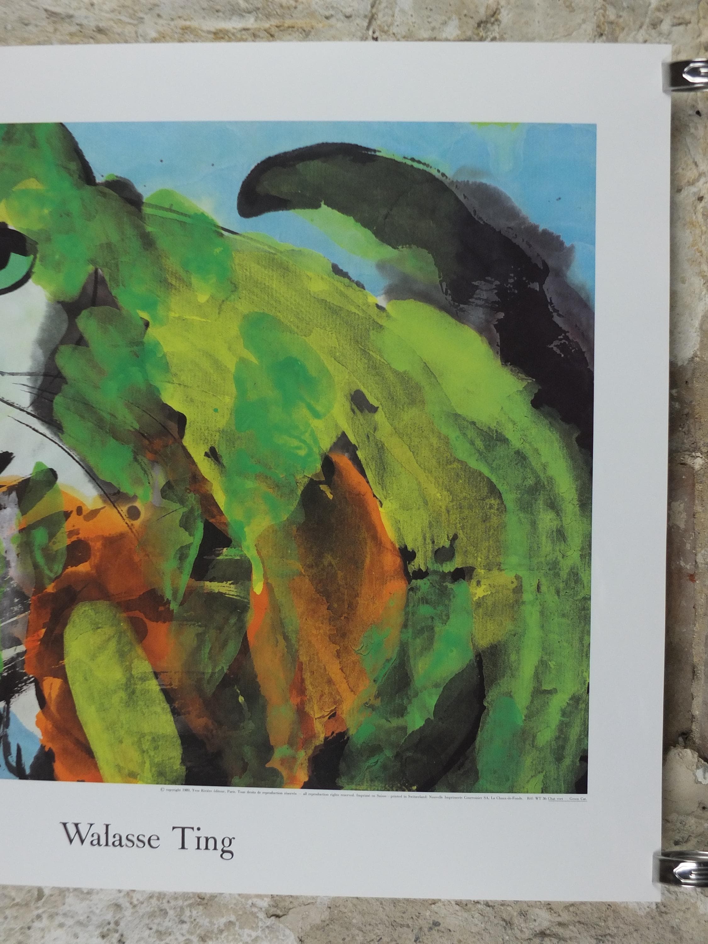 This colourful Walasse Ting exhibition poster is from the Yves Riviere in Paris, France for an exhibition in 1989 featuring "Green Cat" and shows a pleasant looking cat comprised of broad, thick strokes of green with a little orange.