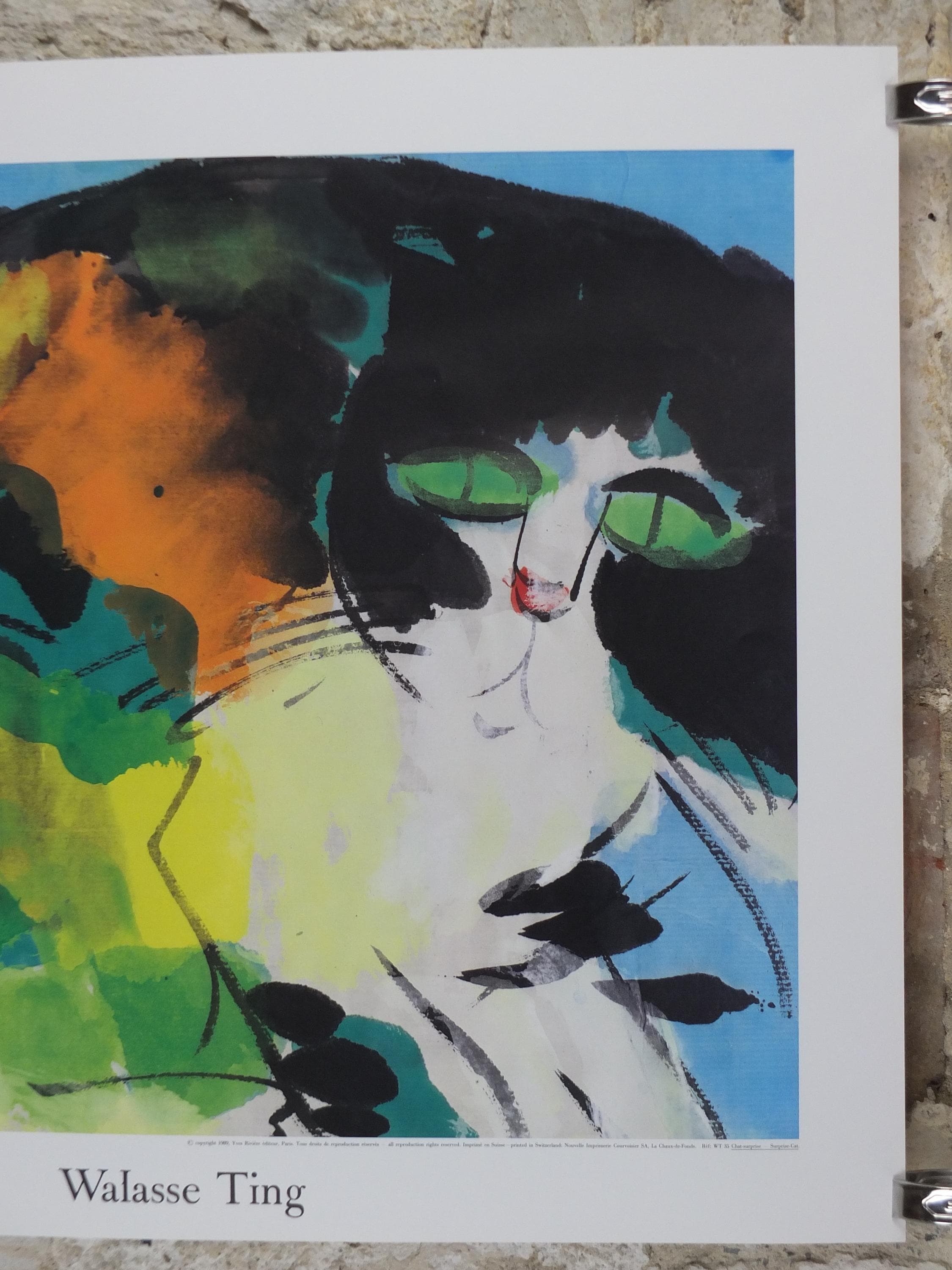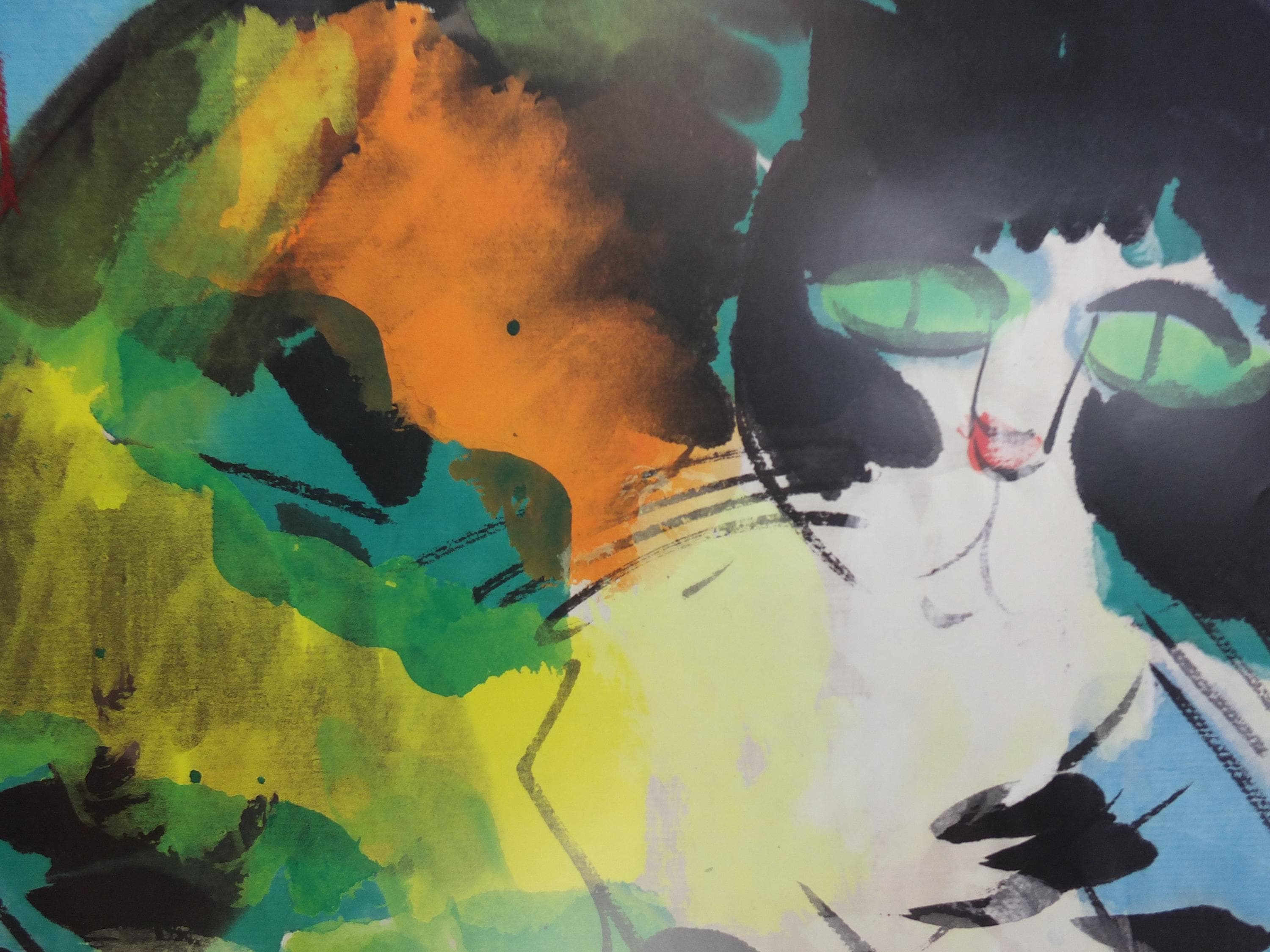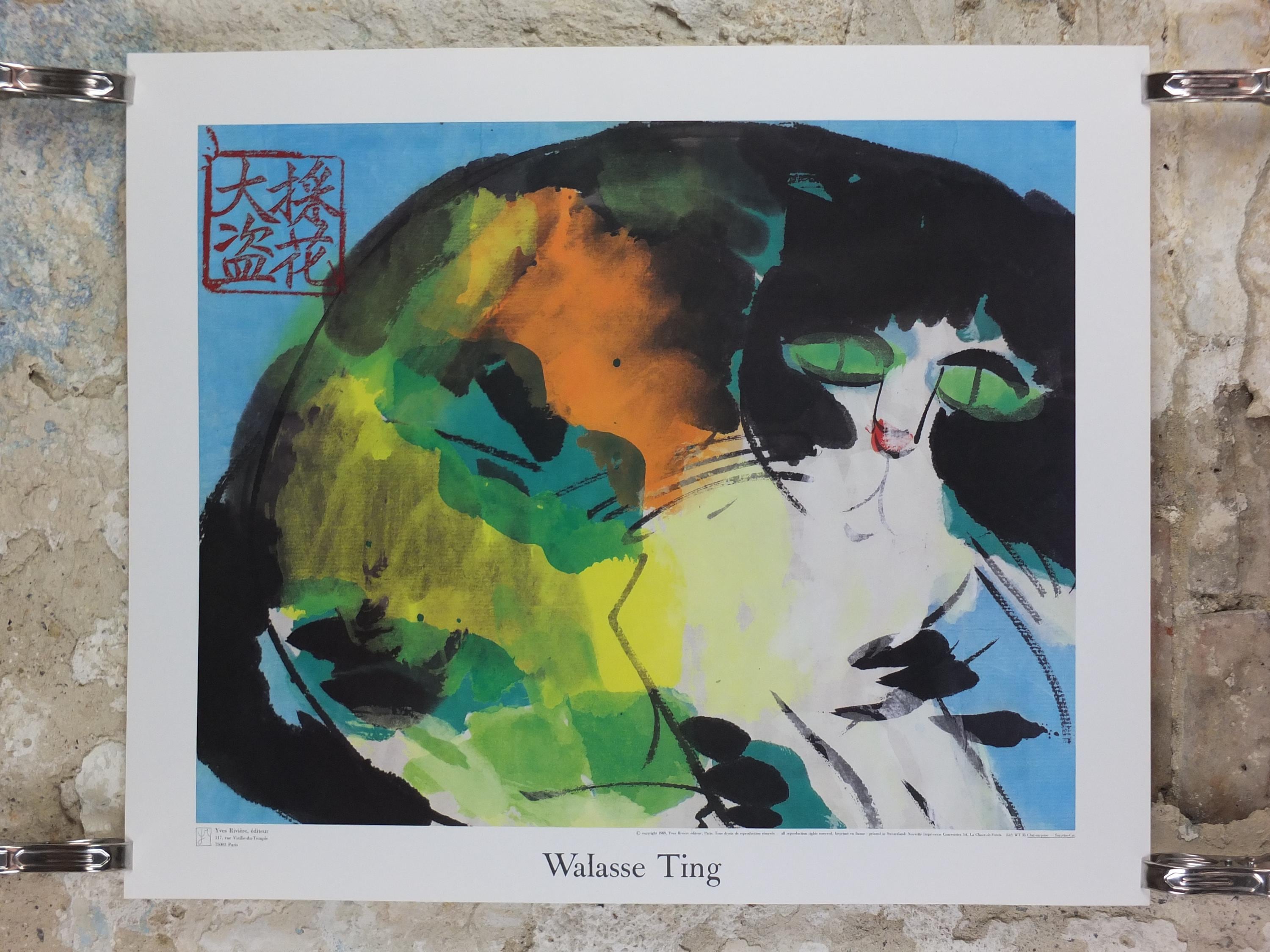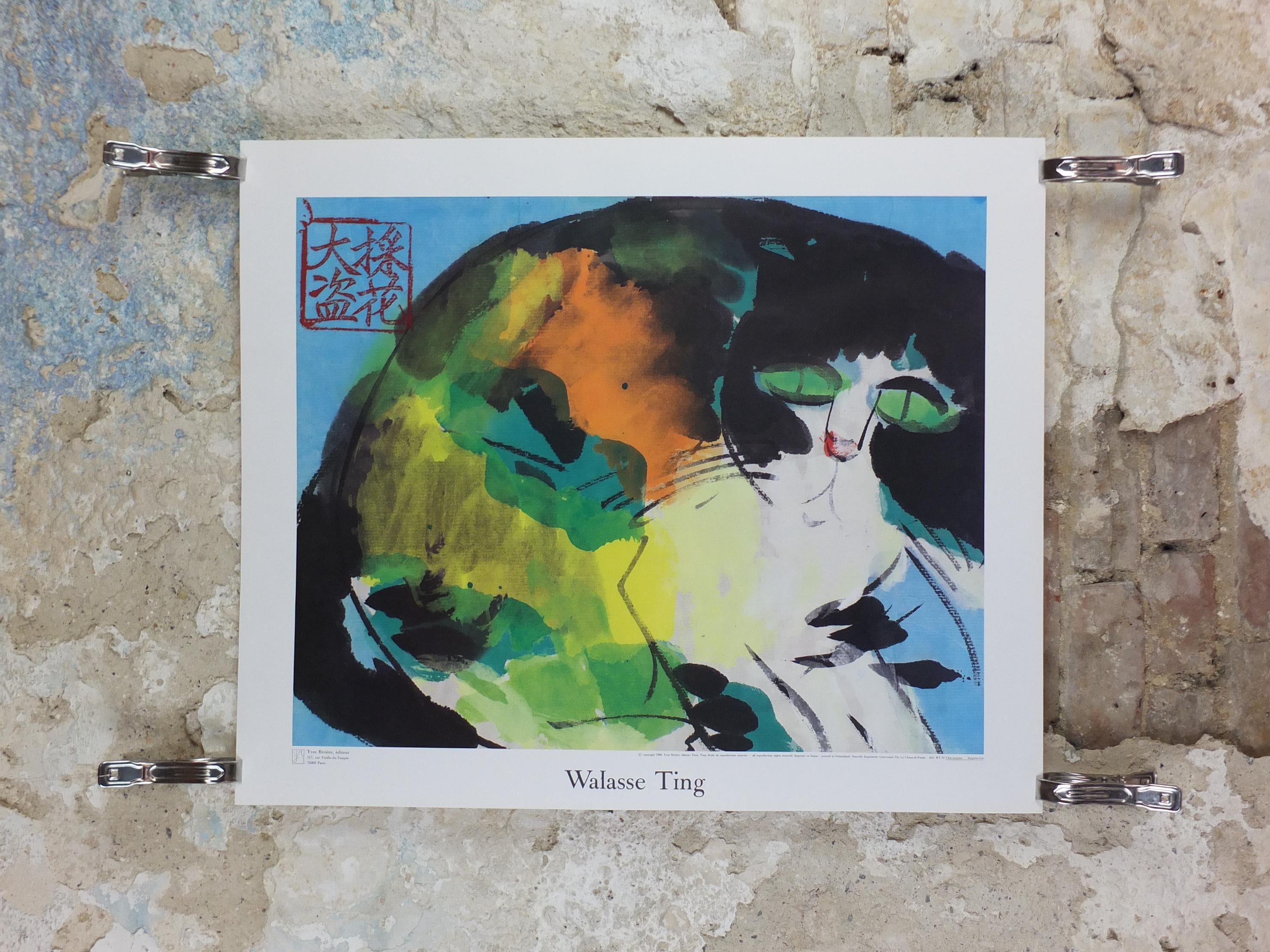 This colourful Walasse Ting exhibition poster is from the Yves Riviere in Paris, France for an exhibition in 1989 featuring "Surprise Cat" and shows a pleasant looking cat comprised of broad, thick strokes of black, orange, green, yellow and blue.
