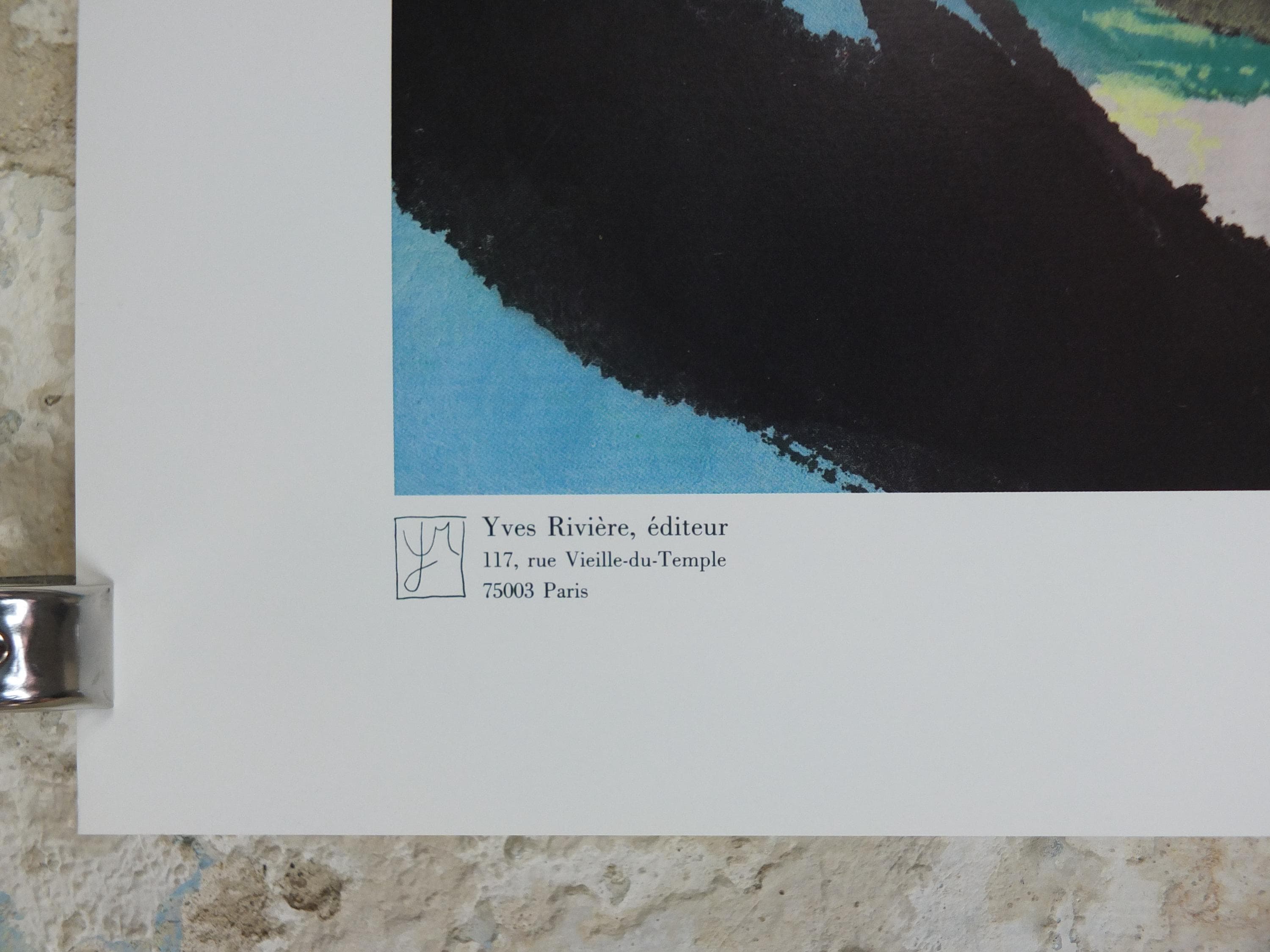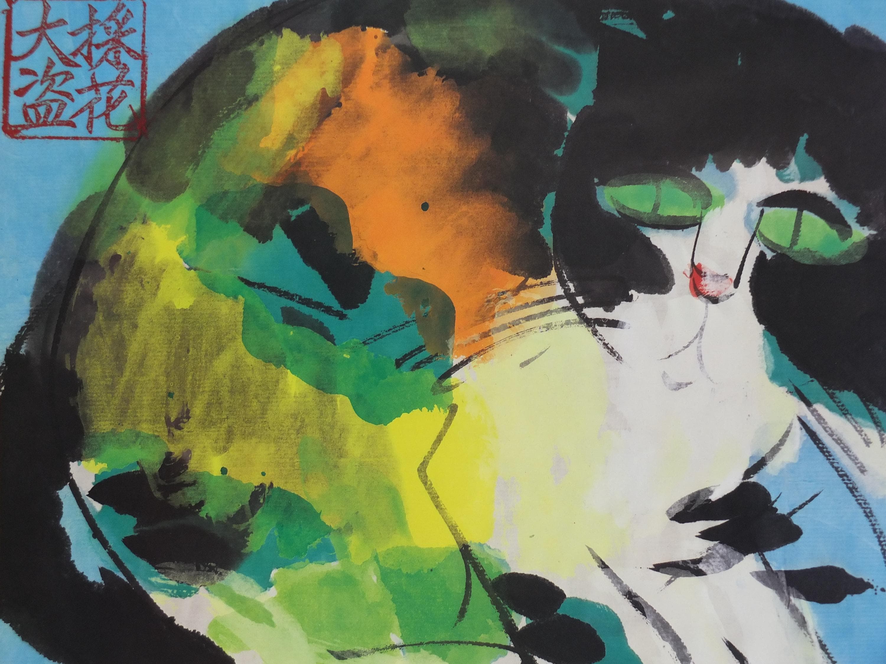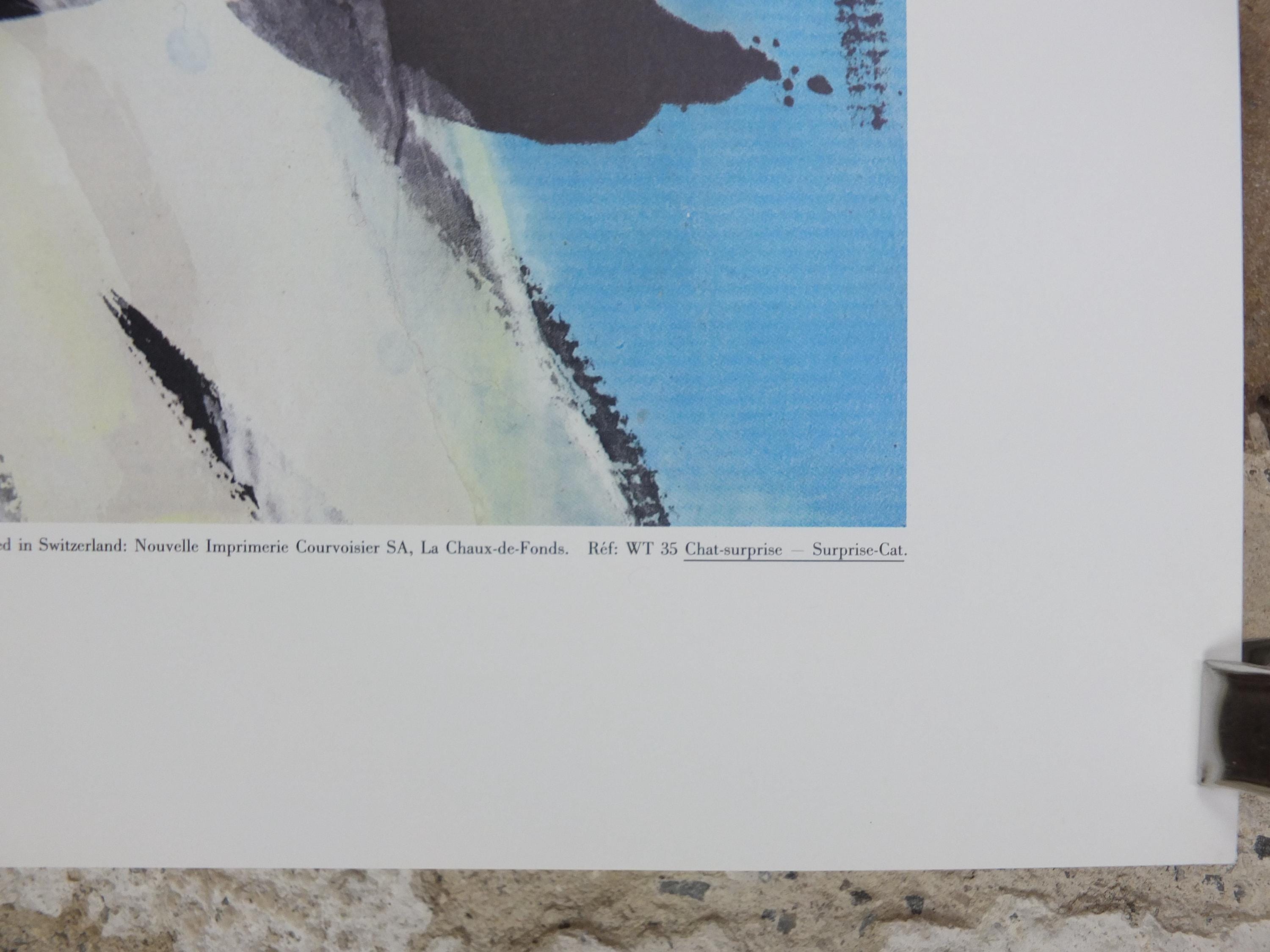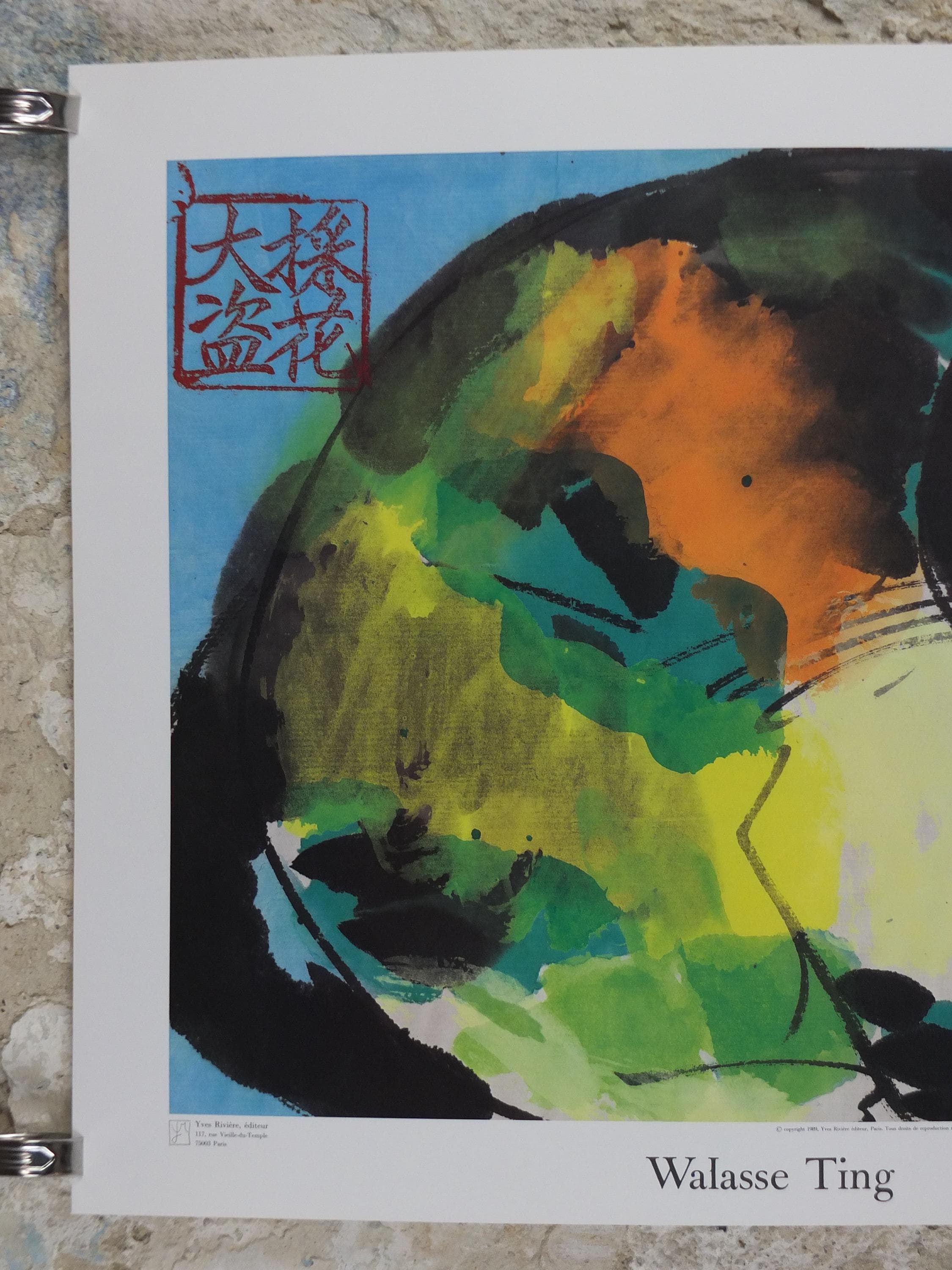 This colourful Walasse Ting exhibition poster is from the Yves Riviere in Paris, France for an exhibition in 1989 featuring "Surprise Cat" and shows a pleasant looking cat comprised of broad, thick strokes of black, orange, green, yellow and blue.