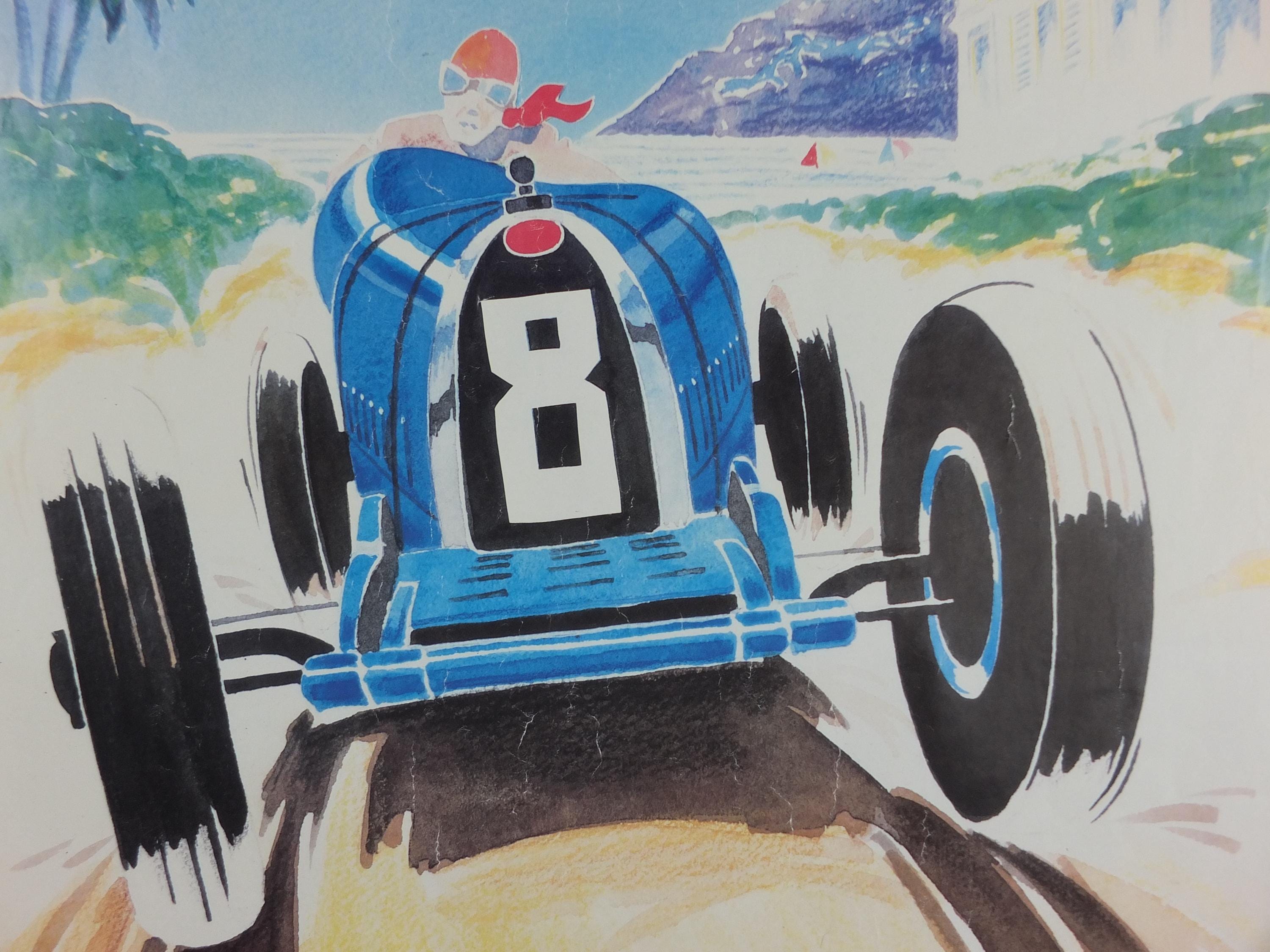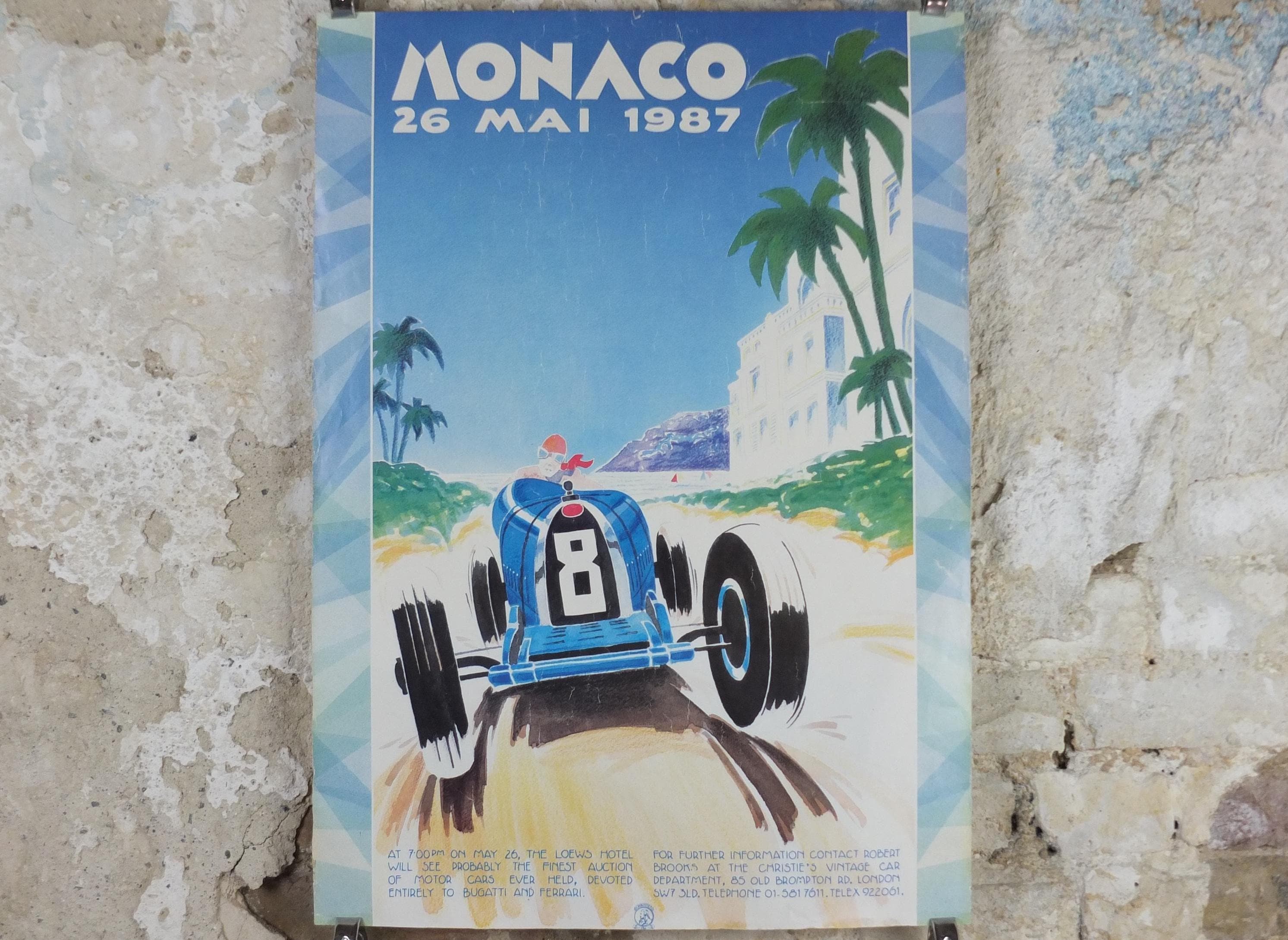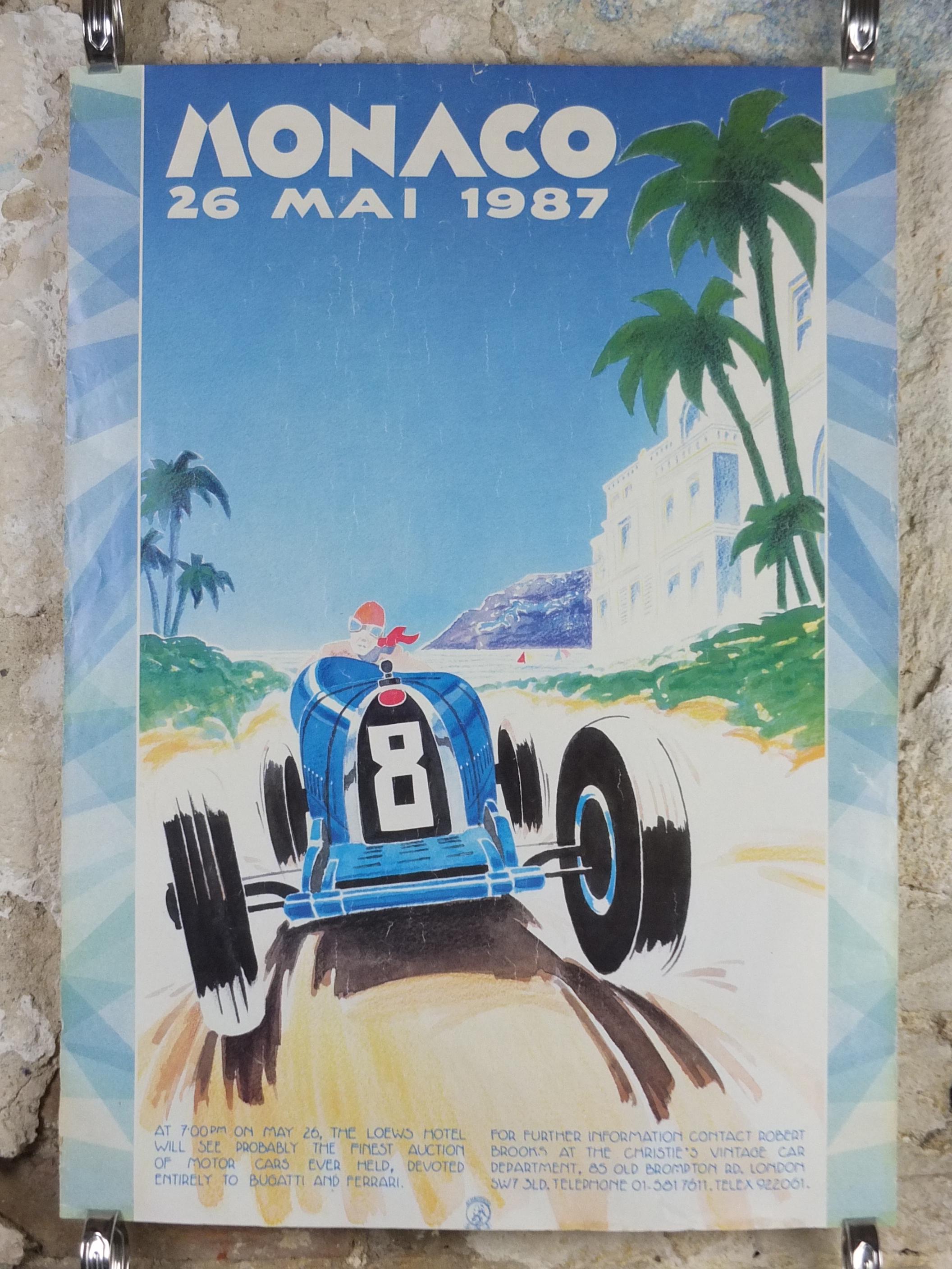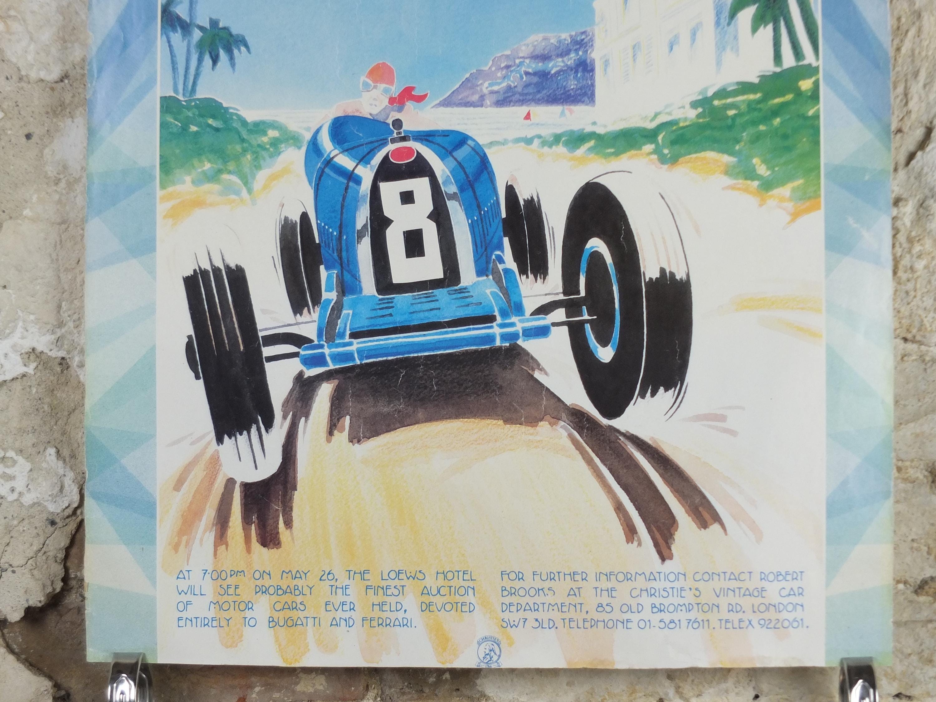 This is a Christie's auction poster from 1987 for the vintage Bugatti and Ferrari cars. This poster features classic cars, specifically Bugatti and Ferrari models, as it advertised an auction of these luxury automobiles. It features a driver in a racing car speeding along a seaside road with palm trees.