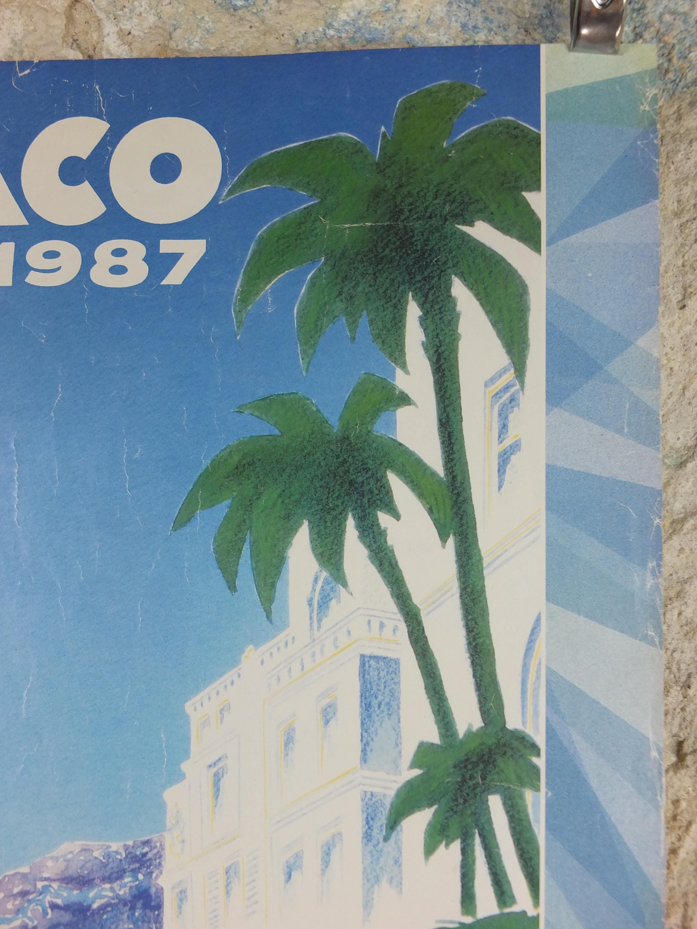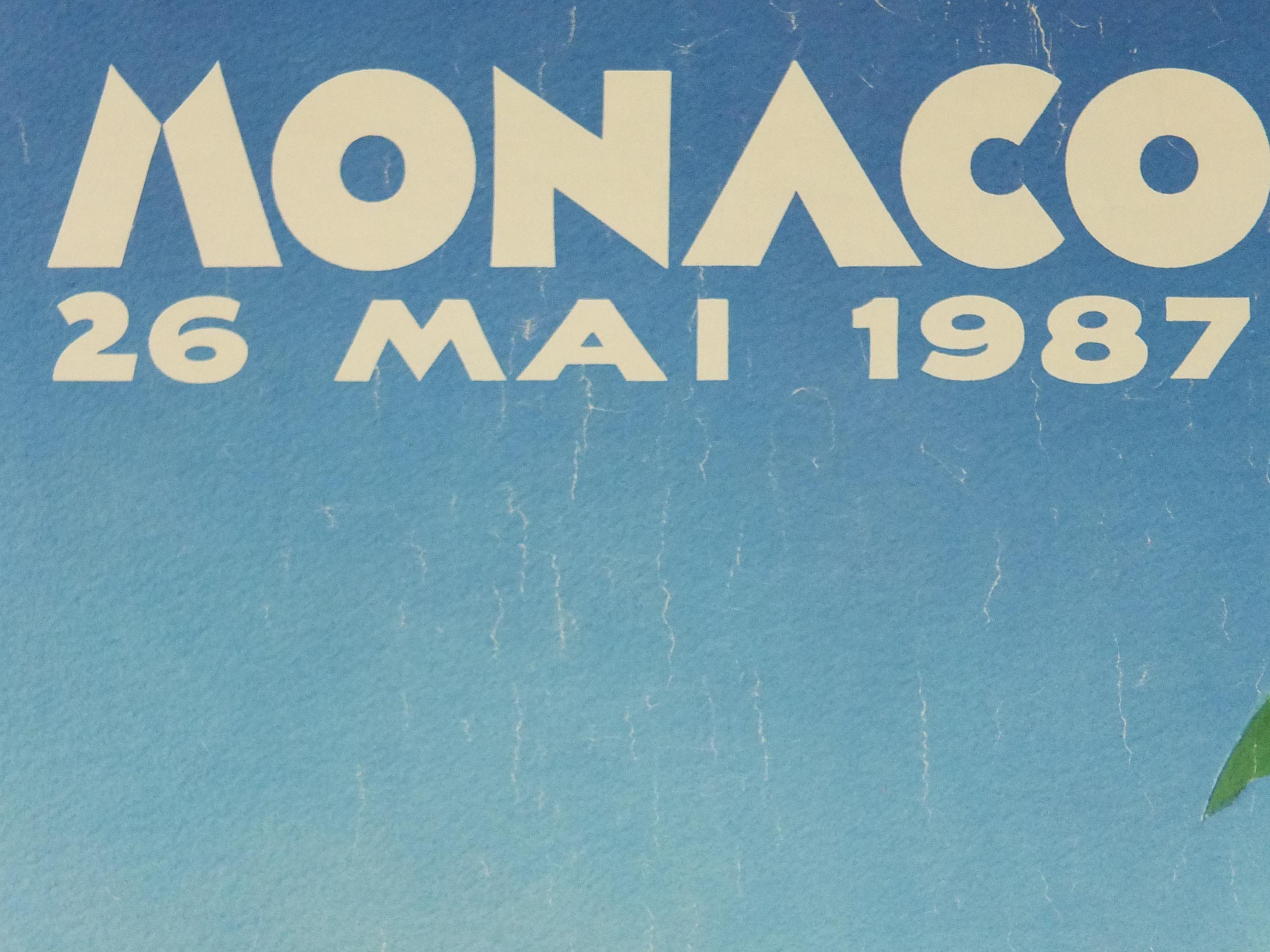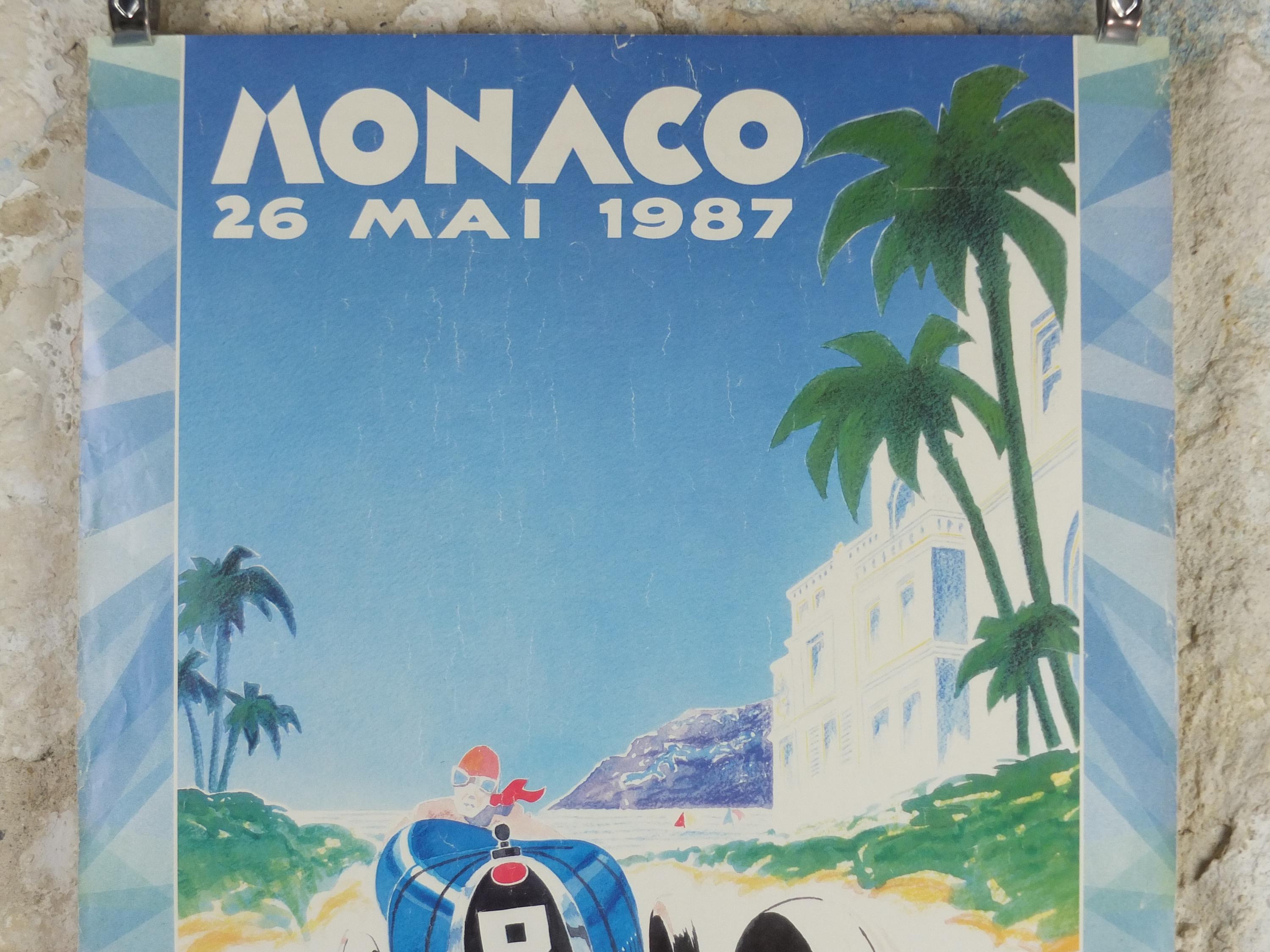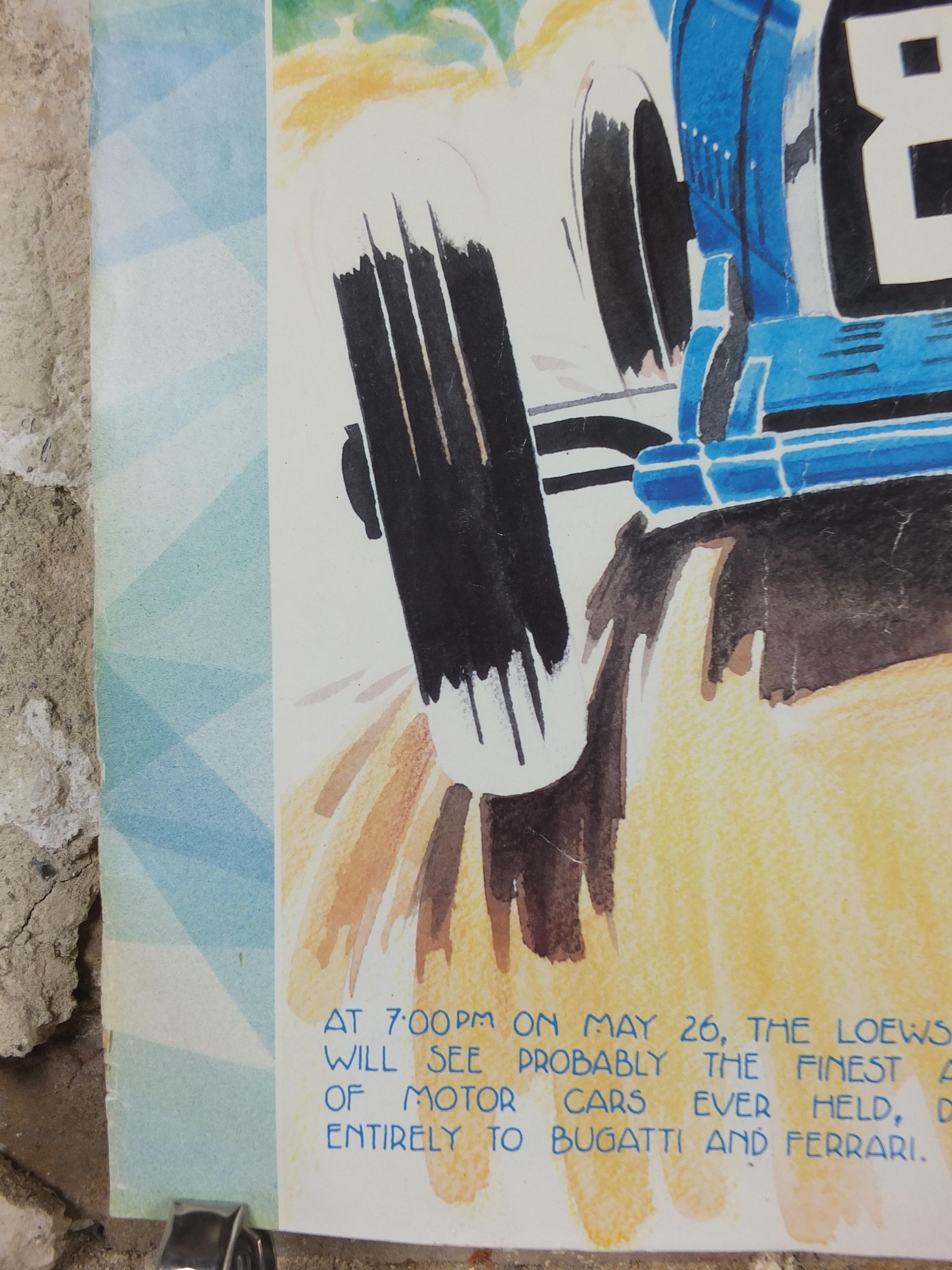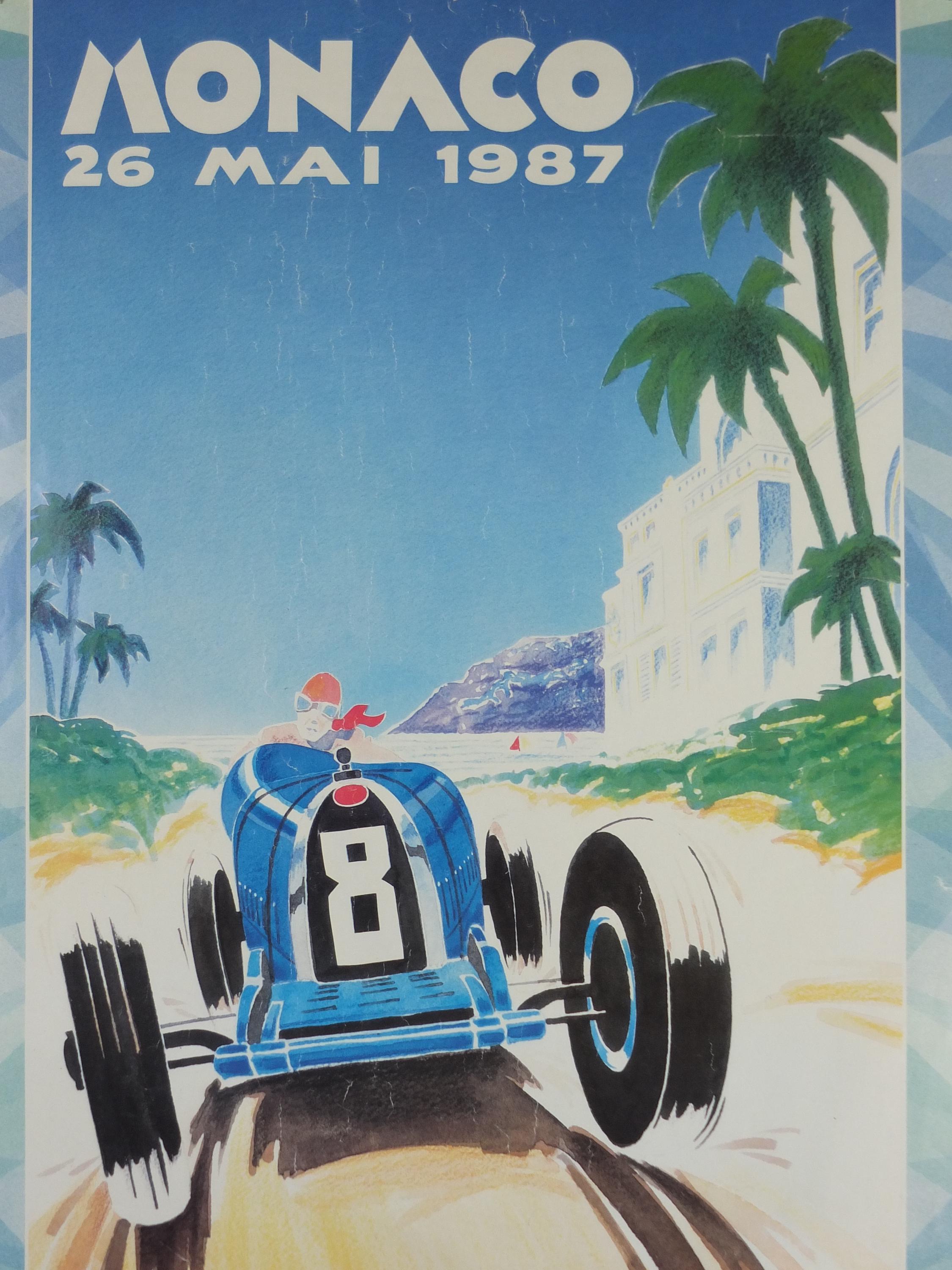 This is a Christie's auction poster from 1987 for the vintage Bugatti and Ferrari cars. This poster features classic cars, specifically Bugatti and Ferrari models, as it advertised an auction of these luxury automobiles. It features a driver in a racing car speeding along a seaside road with palm trees.