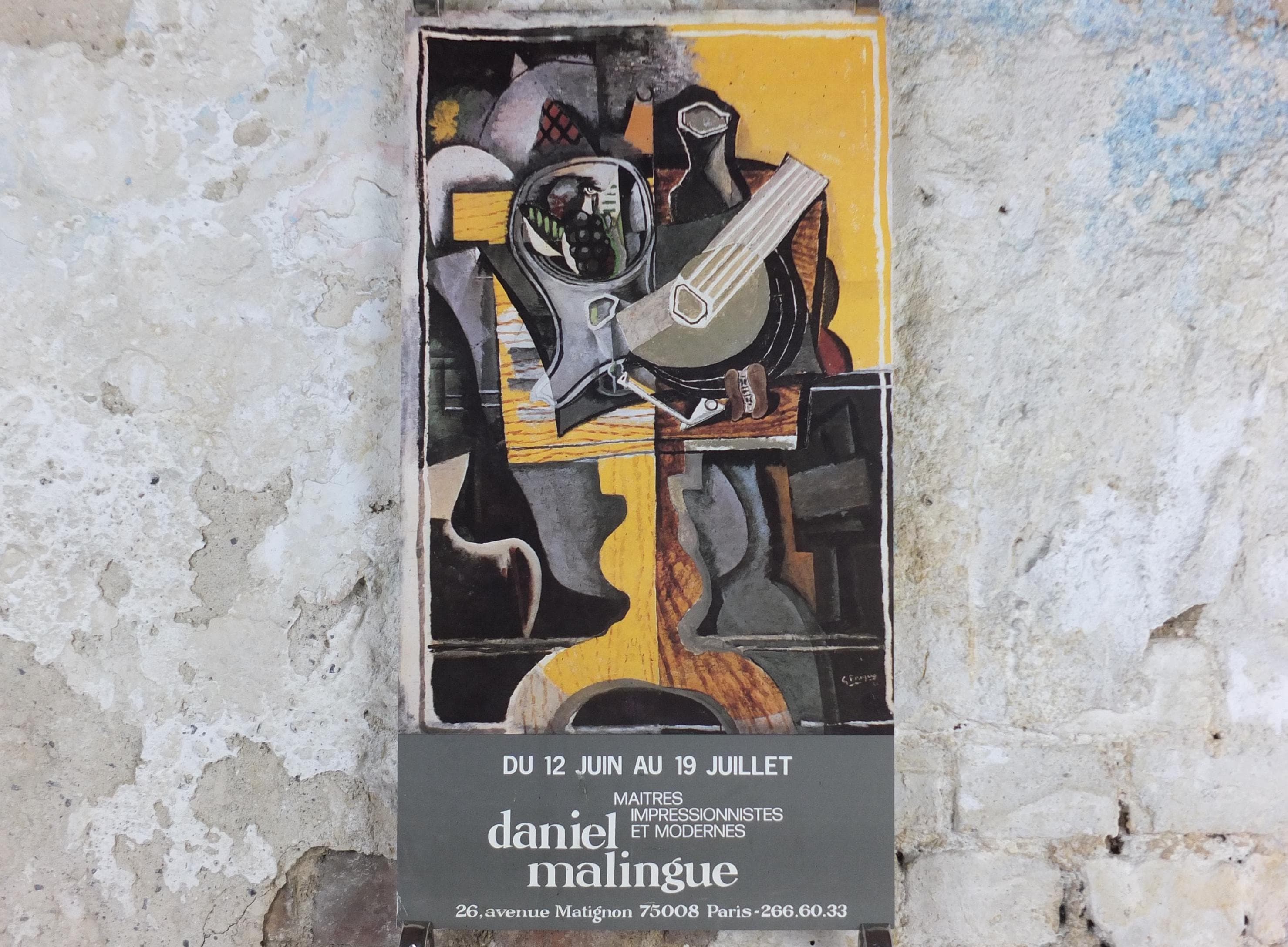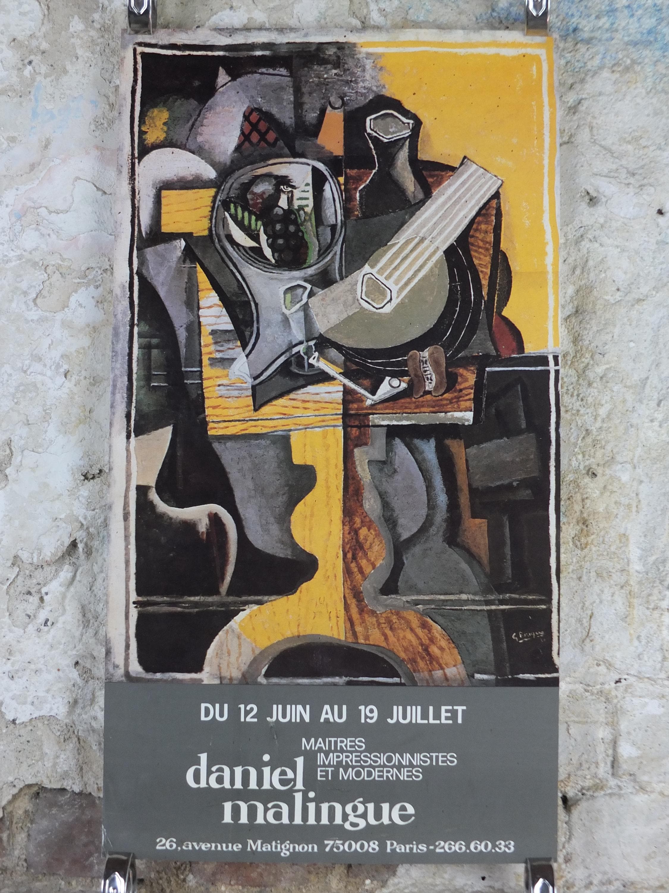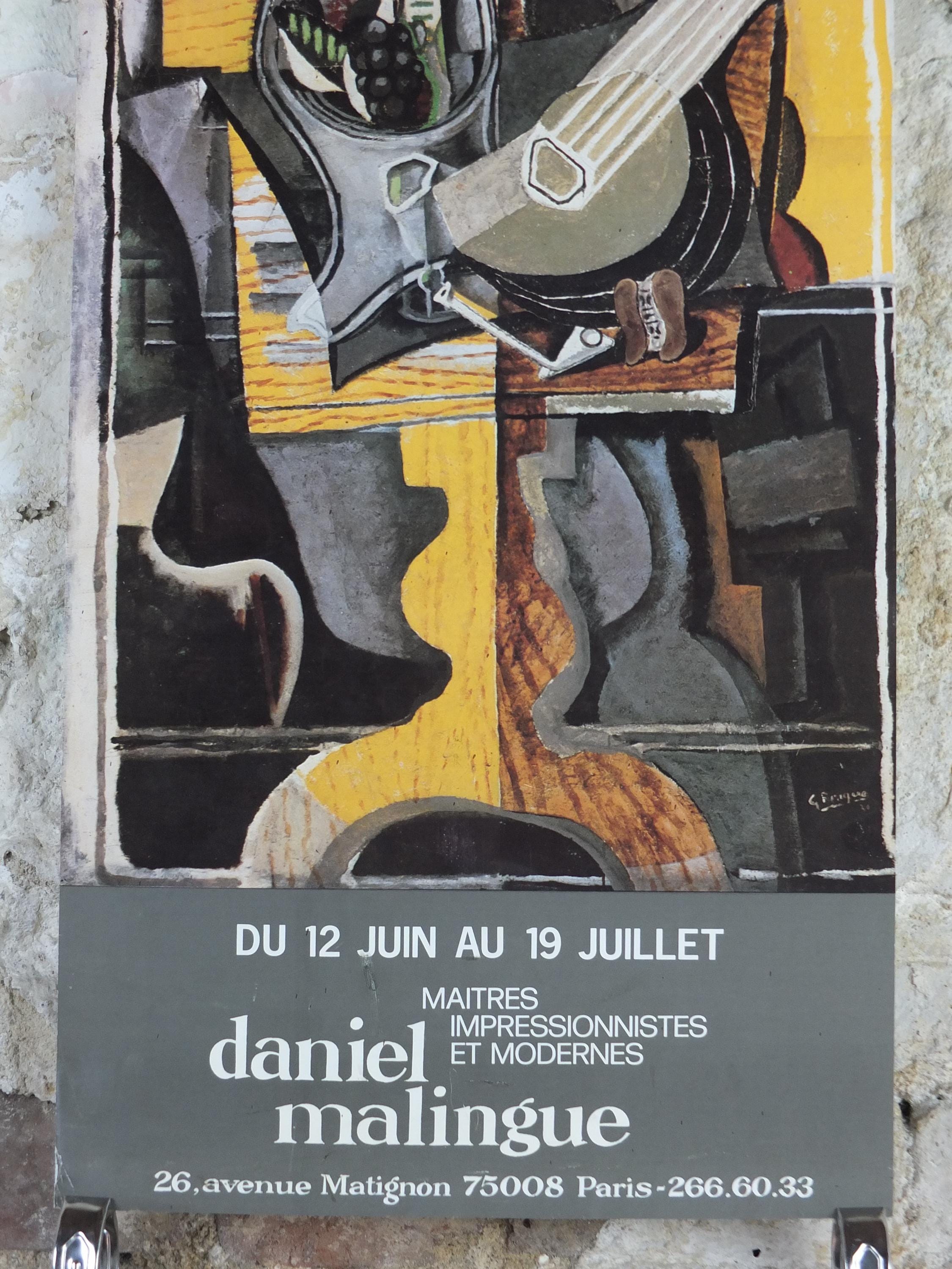 This original 1970s exhibition poster is from Daniel Malingue Gallery in Paris for an exhibition featuring a still life piece with fruit and a guiotar or mandolin from the early 20th century by Georges Braque.