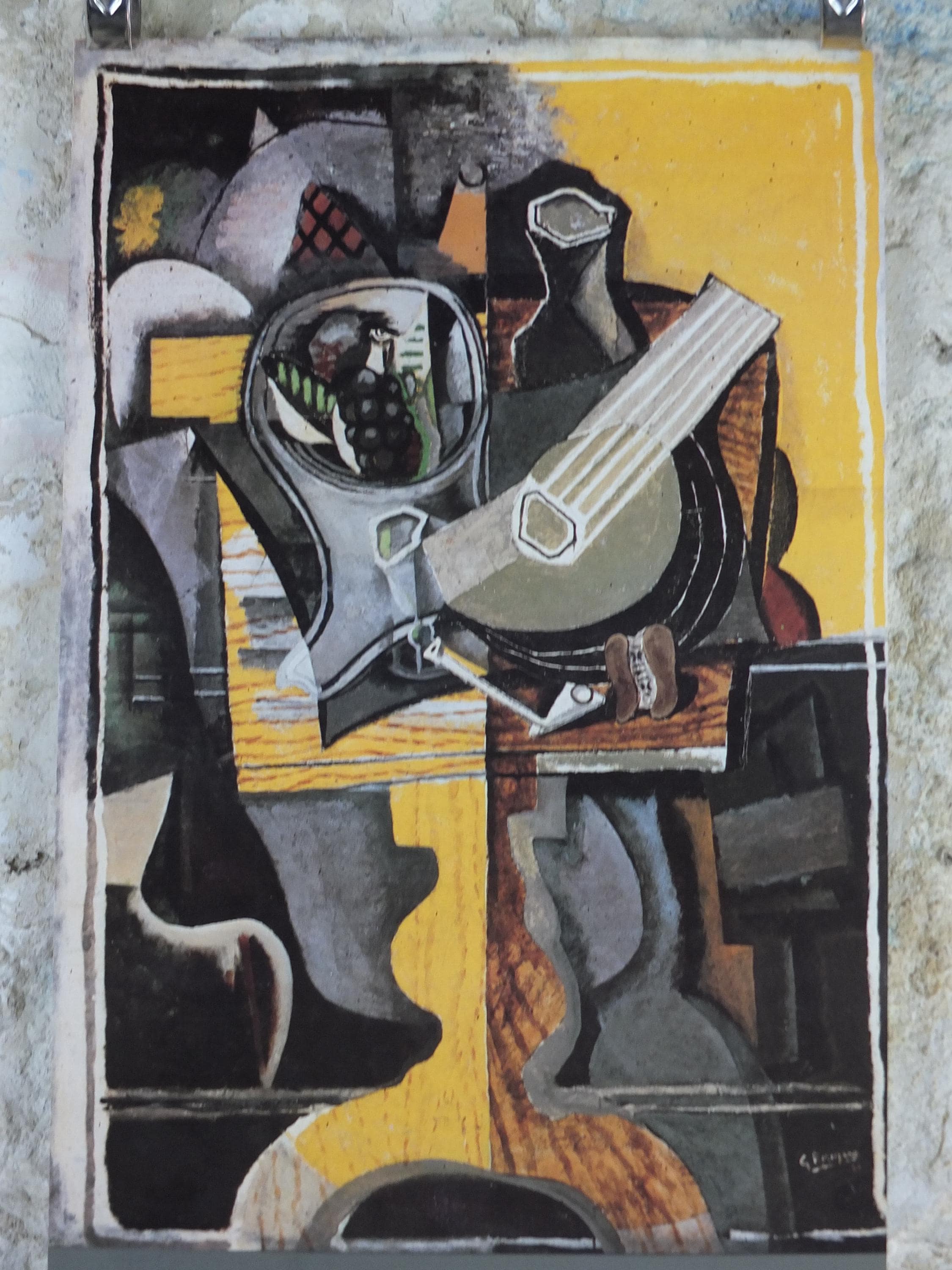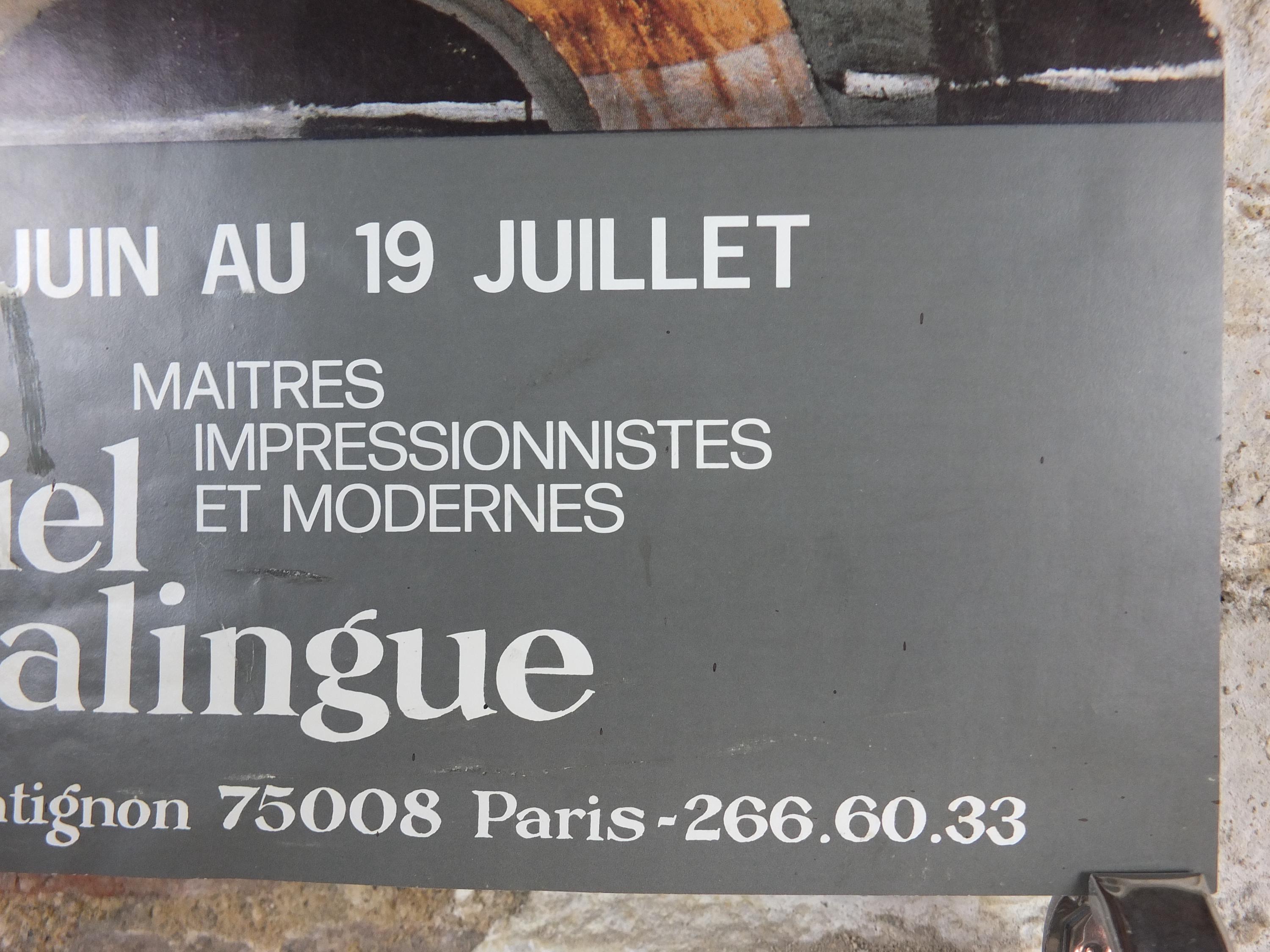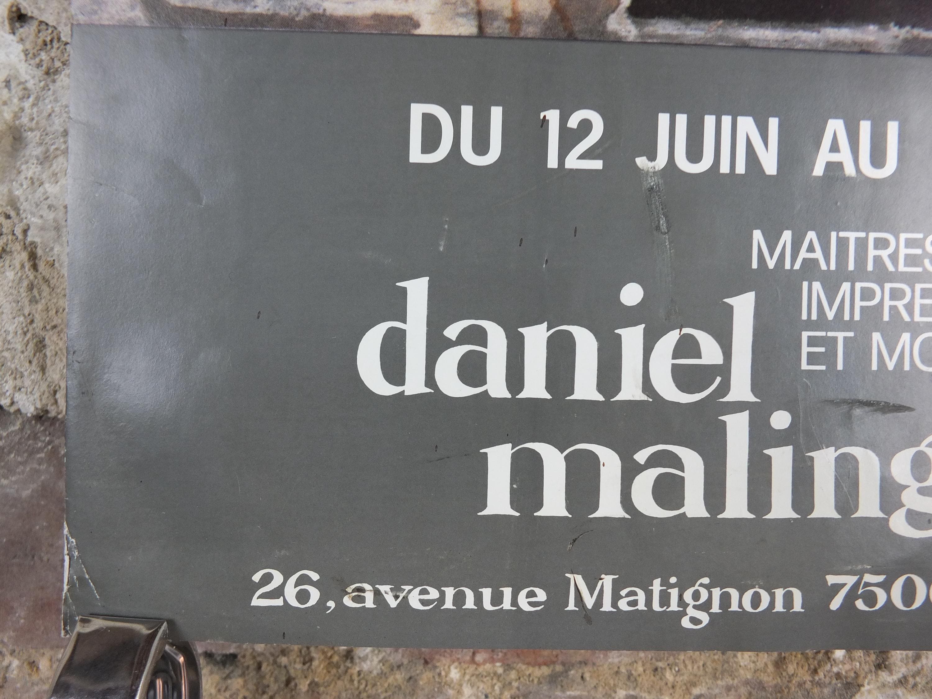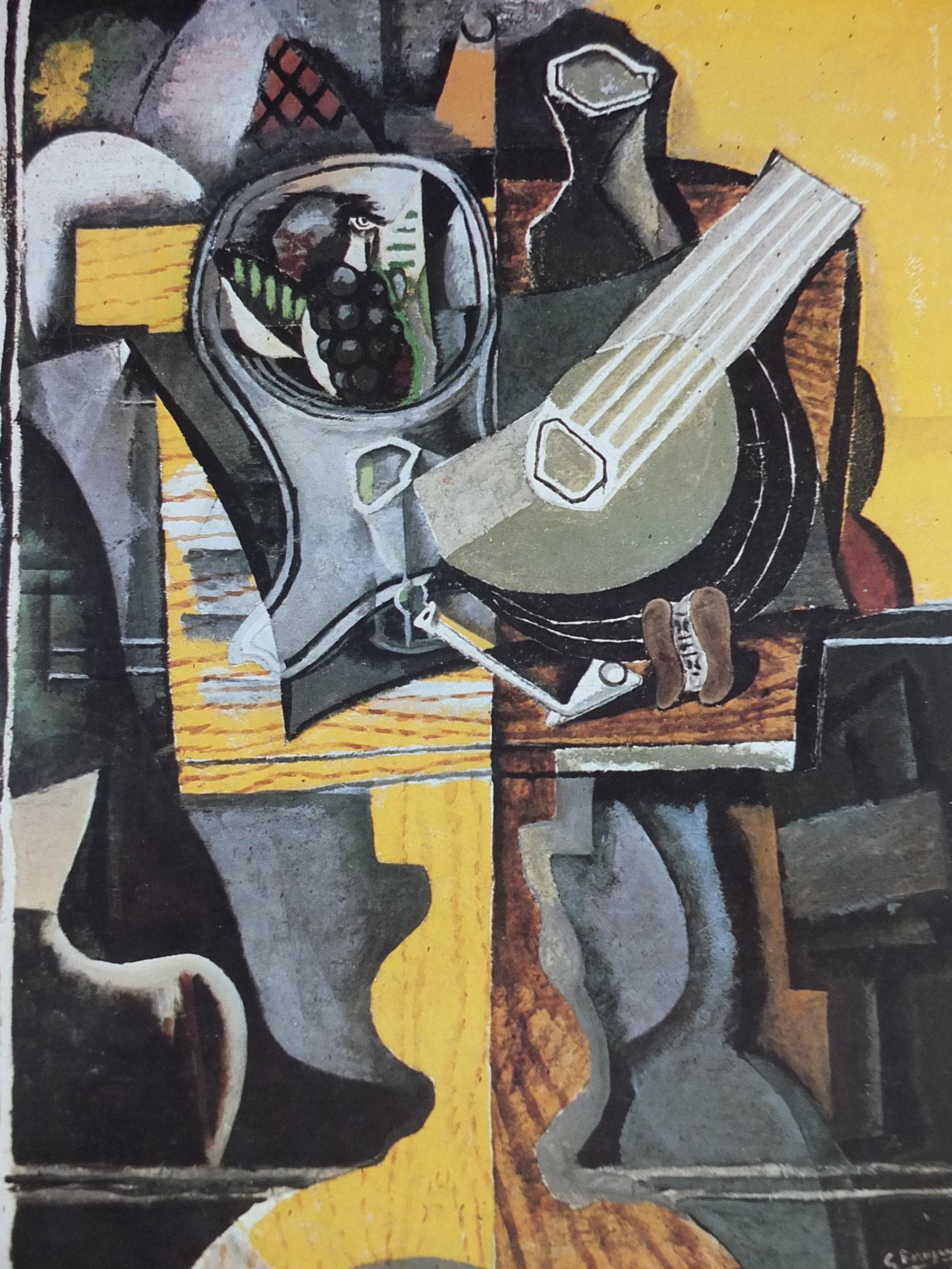 This original 1970s exhibition poster is from Daniel Malingue Gallery in Paris for an exhibition featuring a still life piece with fruit and a guiotar or mandolin from the early 20th century by Georges Braque.