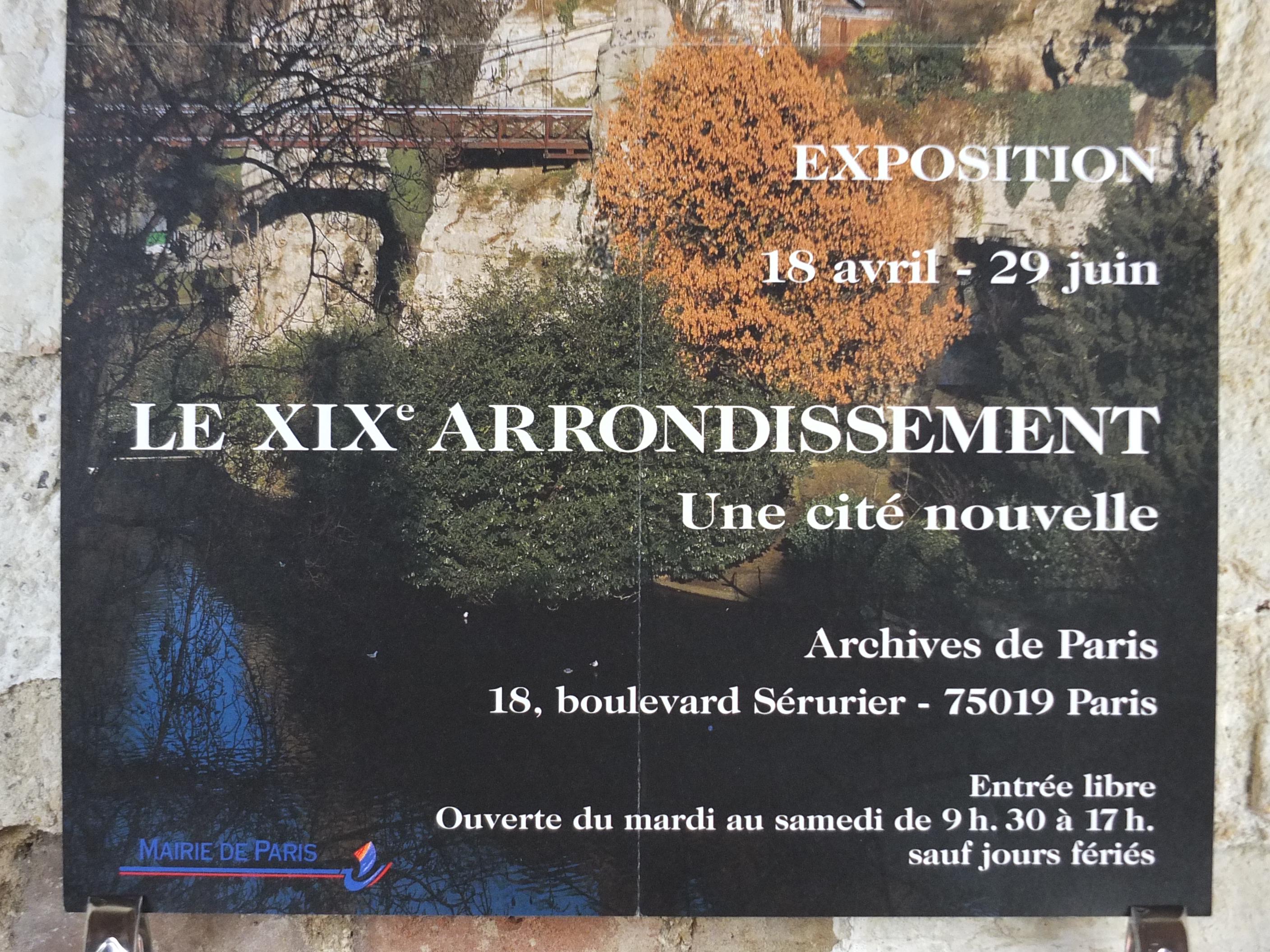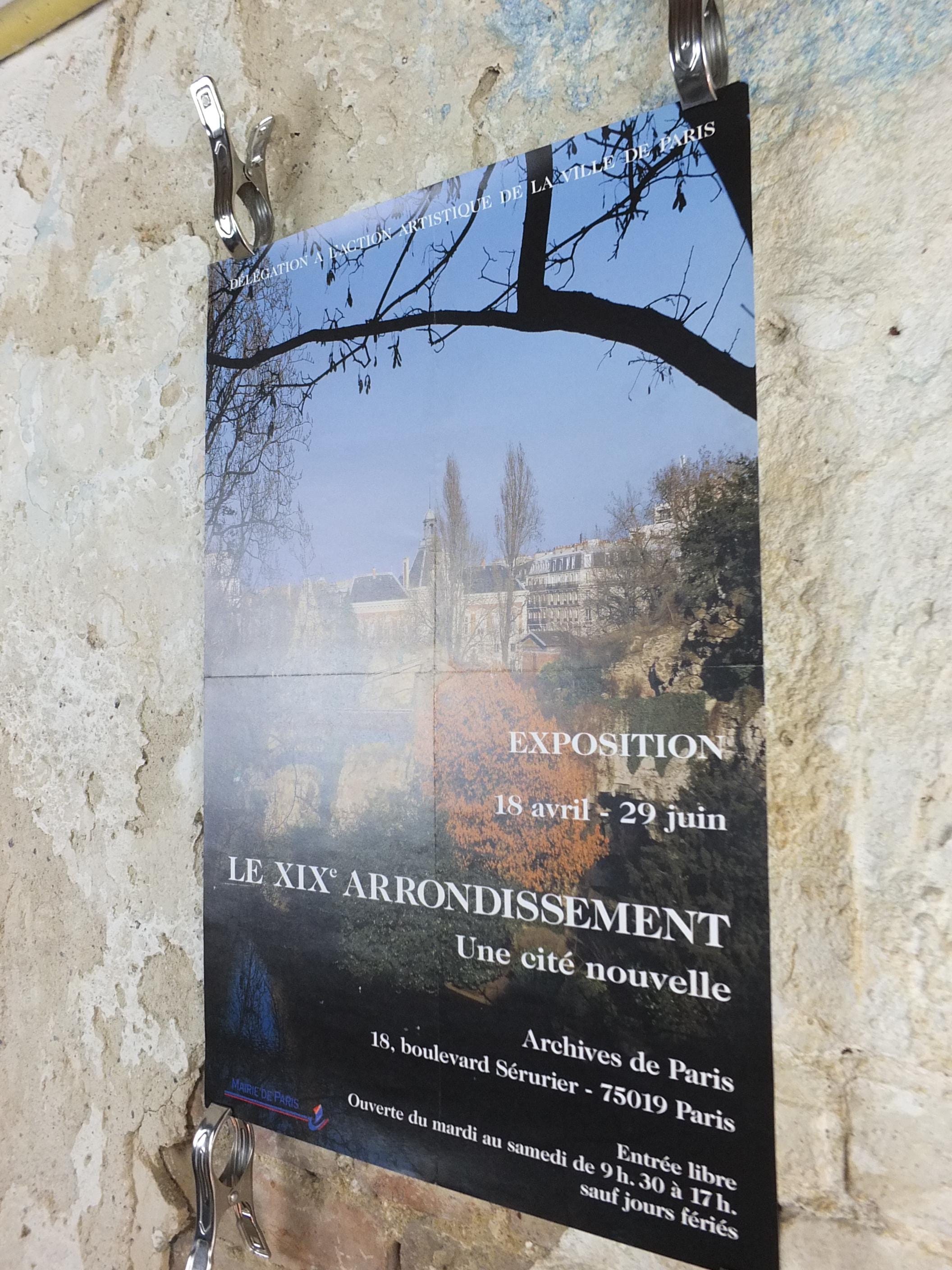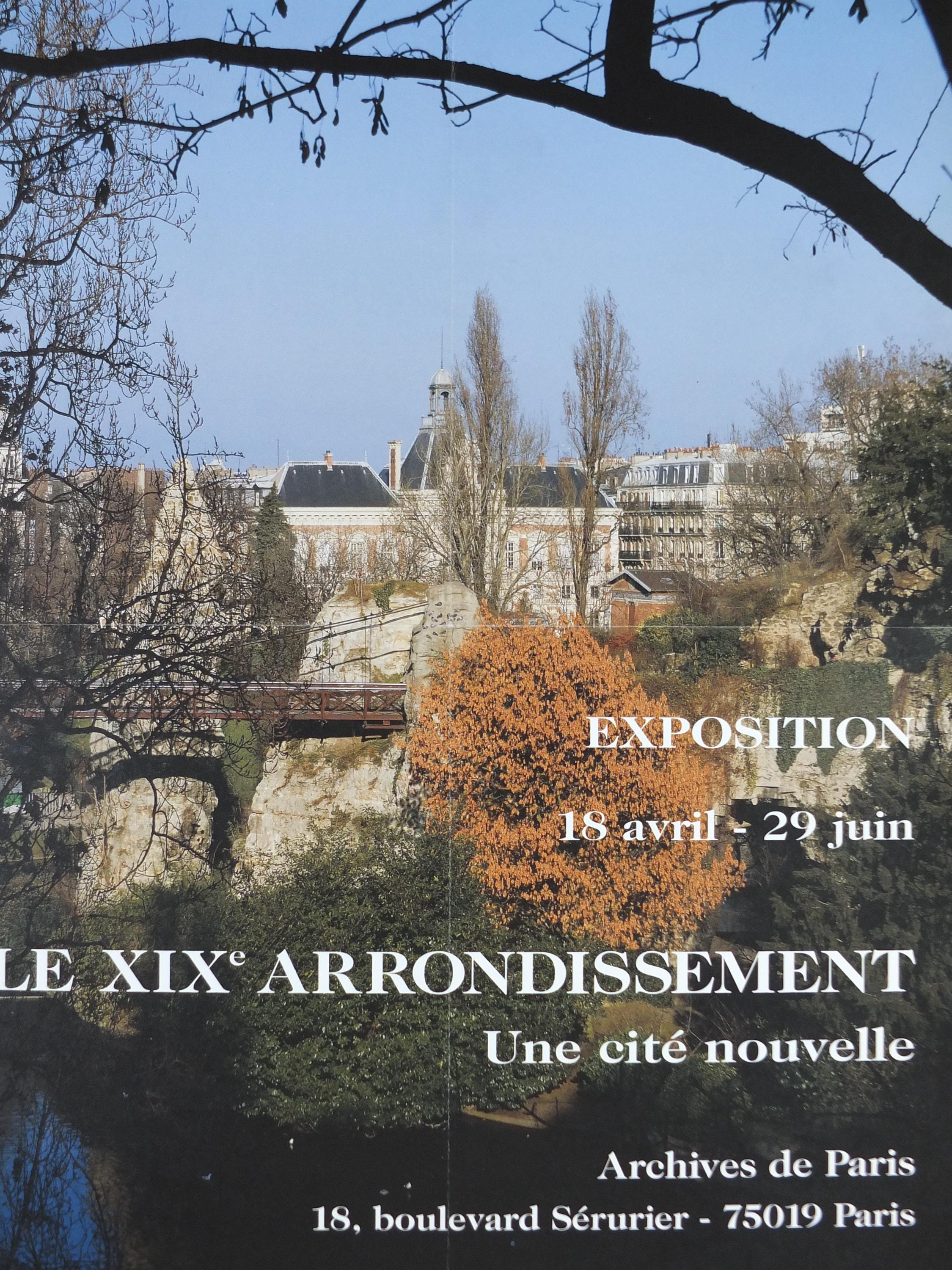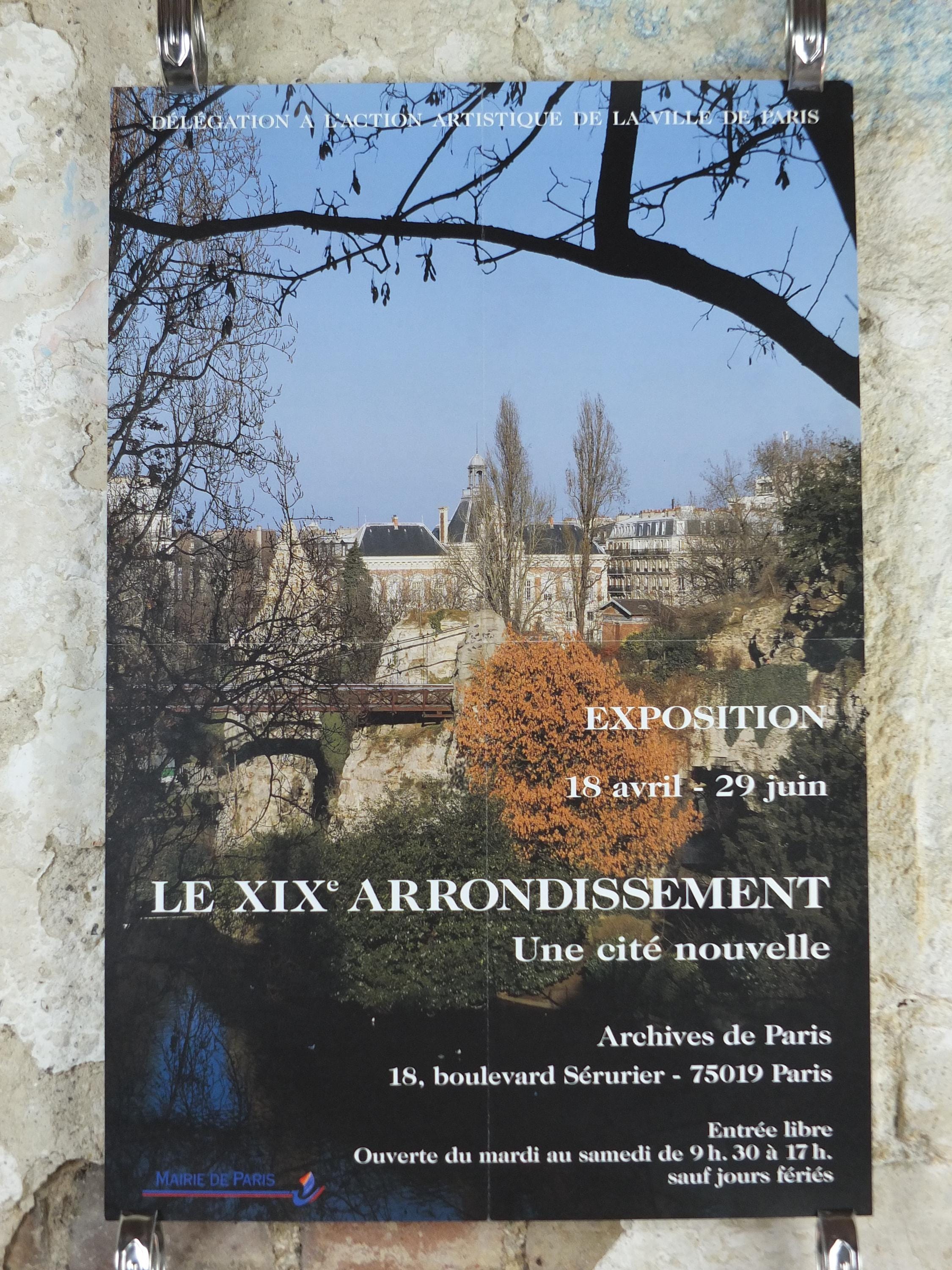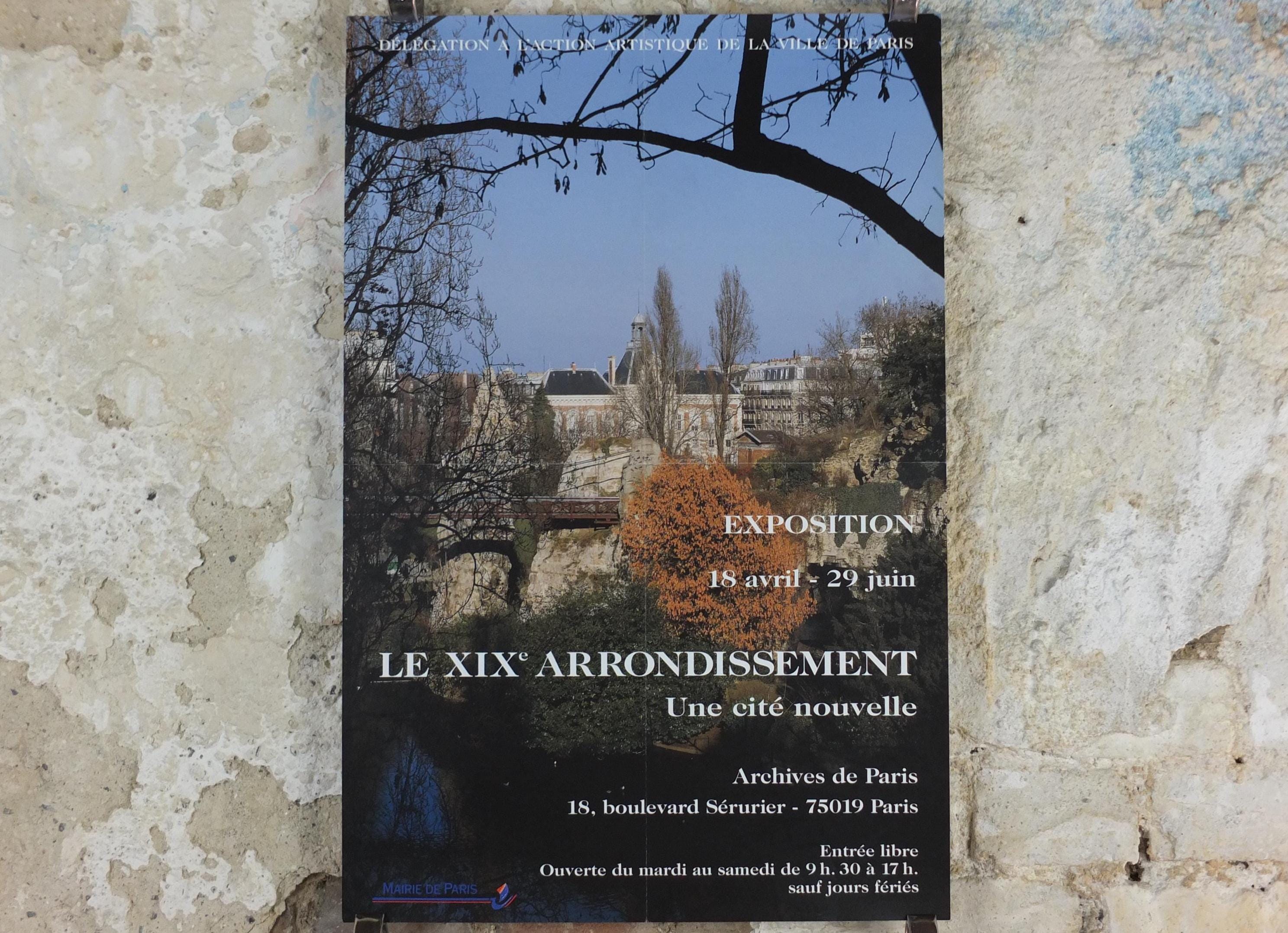 This is an advertising poster for the Paris 19th arrondissement with a photograph of a green space in Paris, showing a view up a small hill toward some classic Parisian buildings, with a small bridge and a reflection in water below.