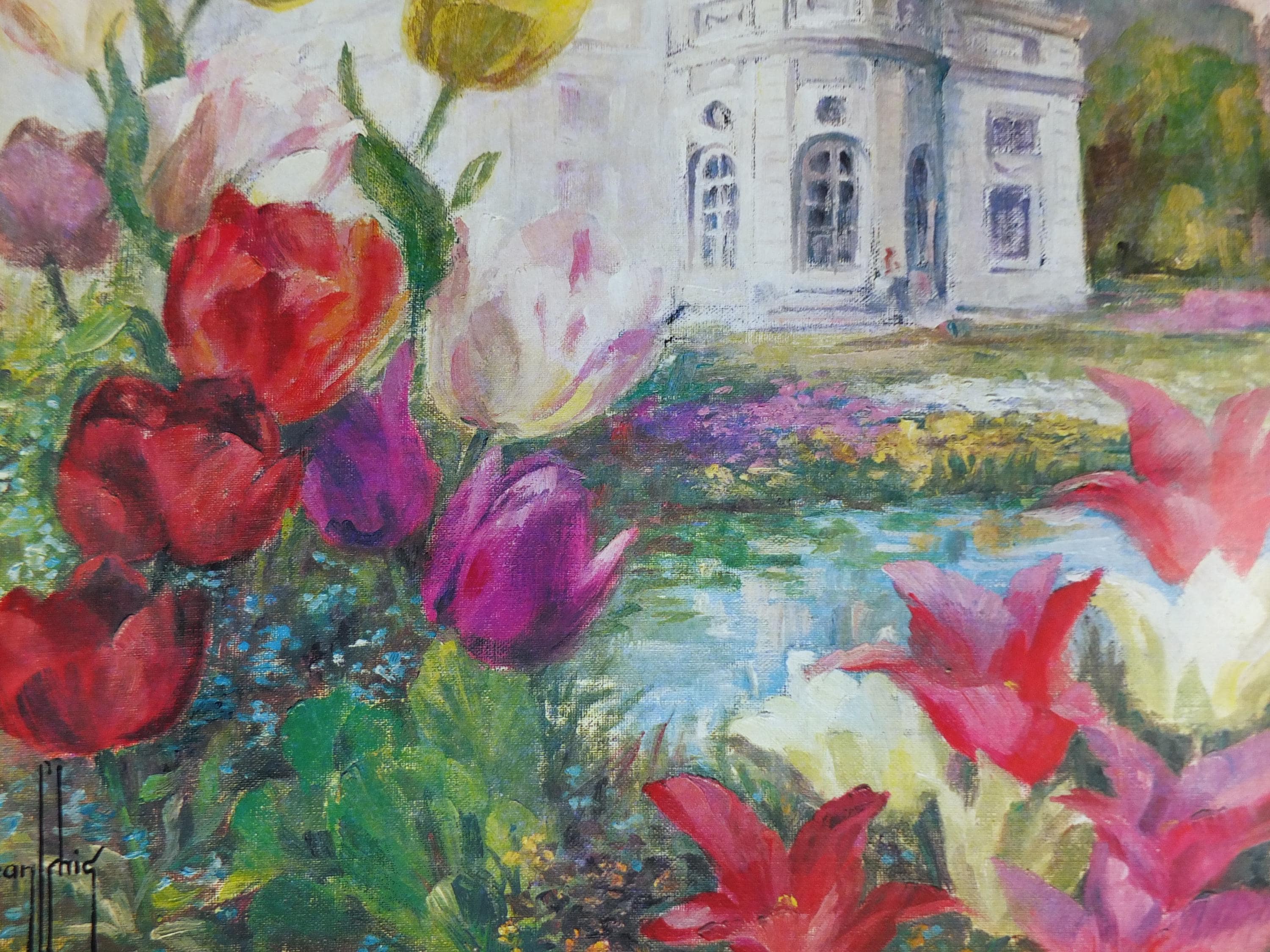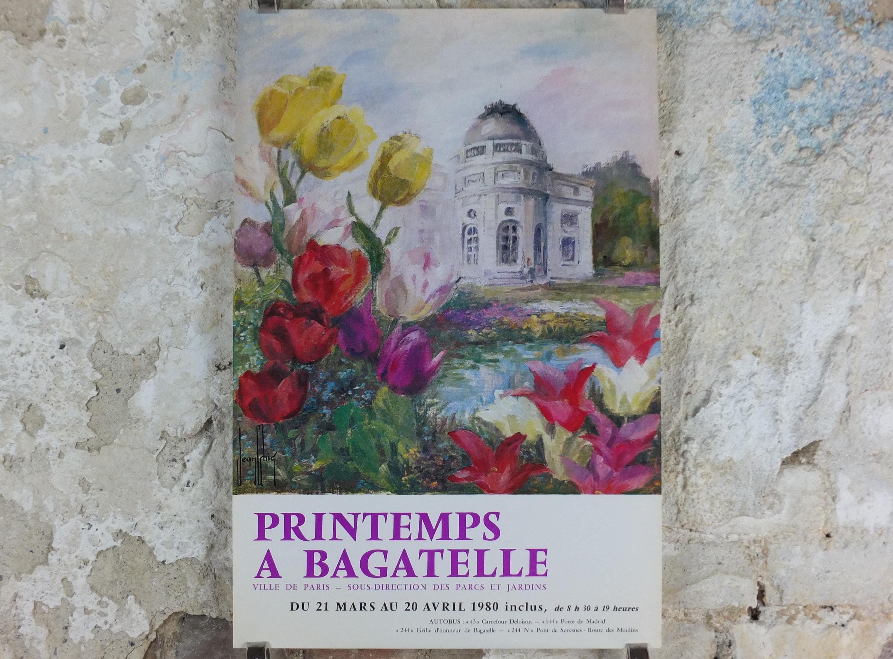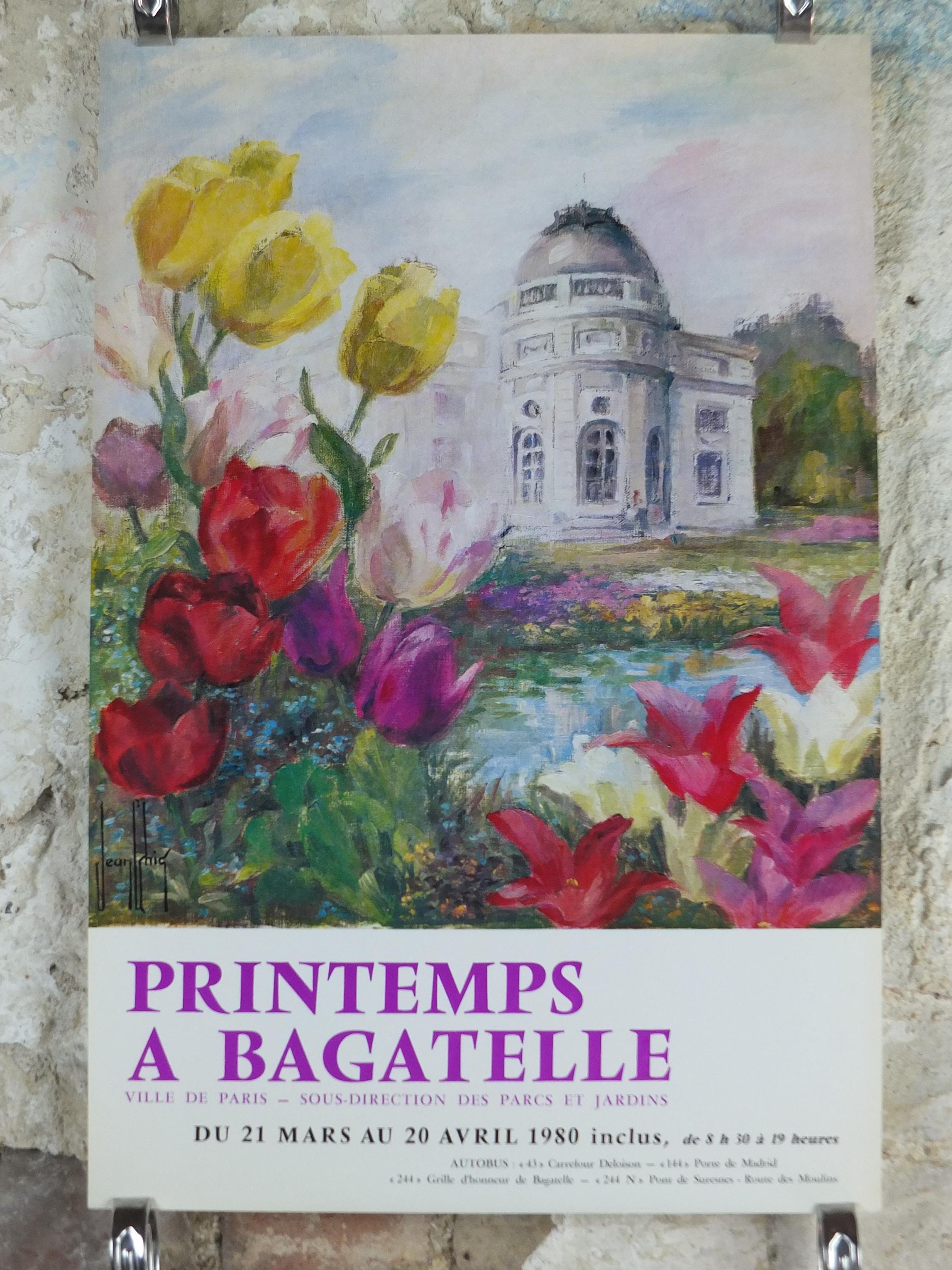 The Parc de Bagatelle, while perhaps most famous for its stunning rose garden in the summer, is a spectacular showcase of early season blooms, and the poster captures this perfectly. As a designated botanical garden for the City of Paris, the park dedicates large areas to vibrant bulb collections, including an extensive display of tulips, which herald the arrival of spring. The sight of these colorful, meticulously arranged tulip beds—like the ones dramatically painted in the foreground—provides a breathtaking contrast to the classical white-stone façade of the Château de Bagatelle, creating the picturesque atmosphere celebrated by the "Printemps à Bagatelle" event.