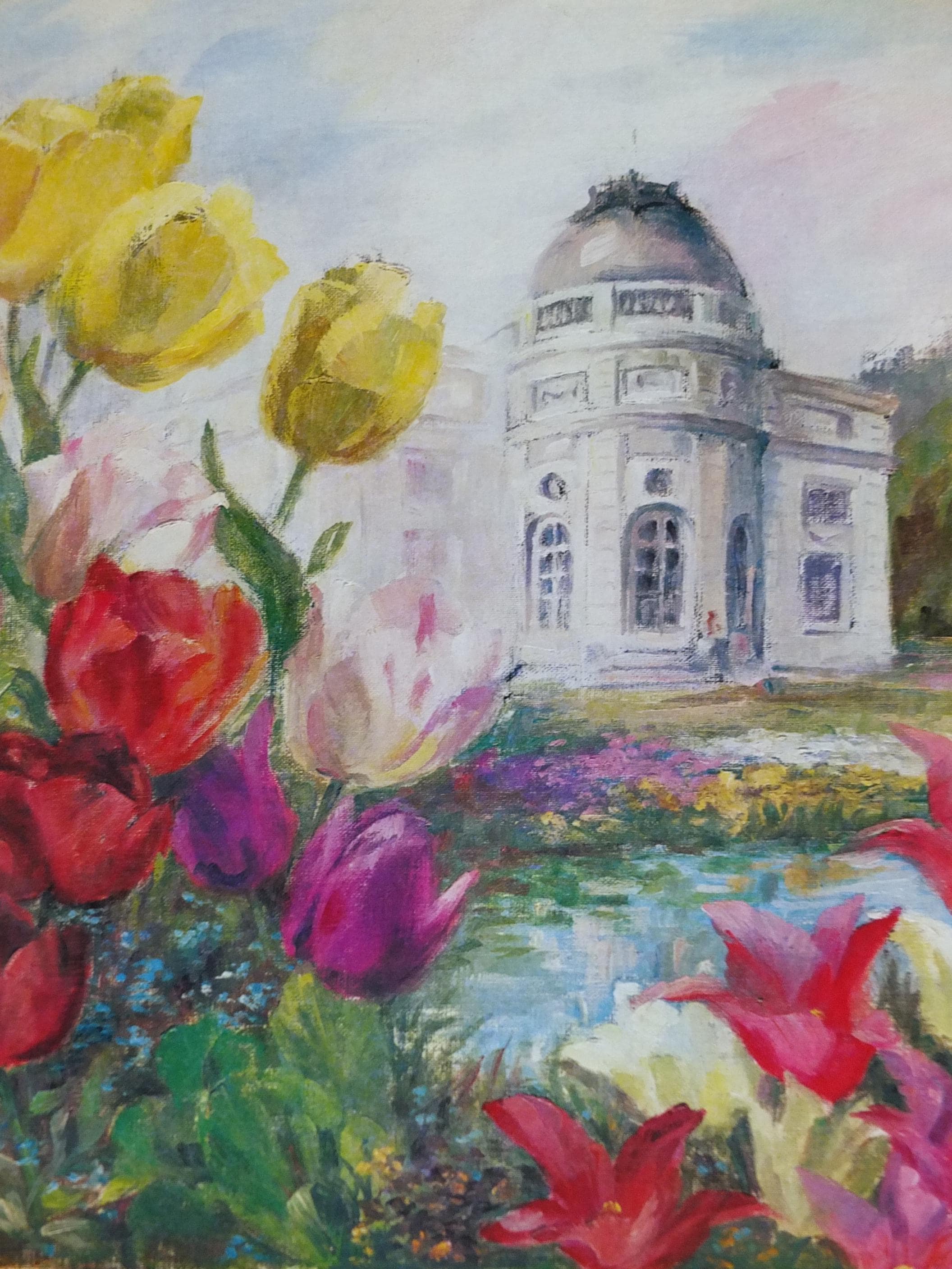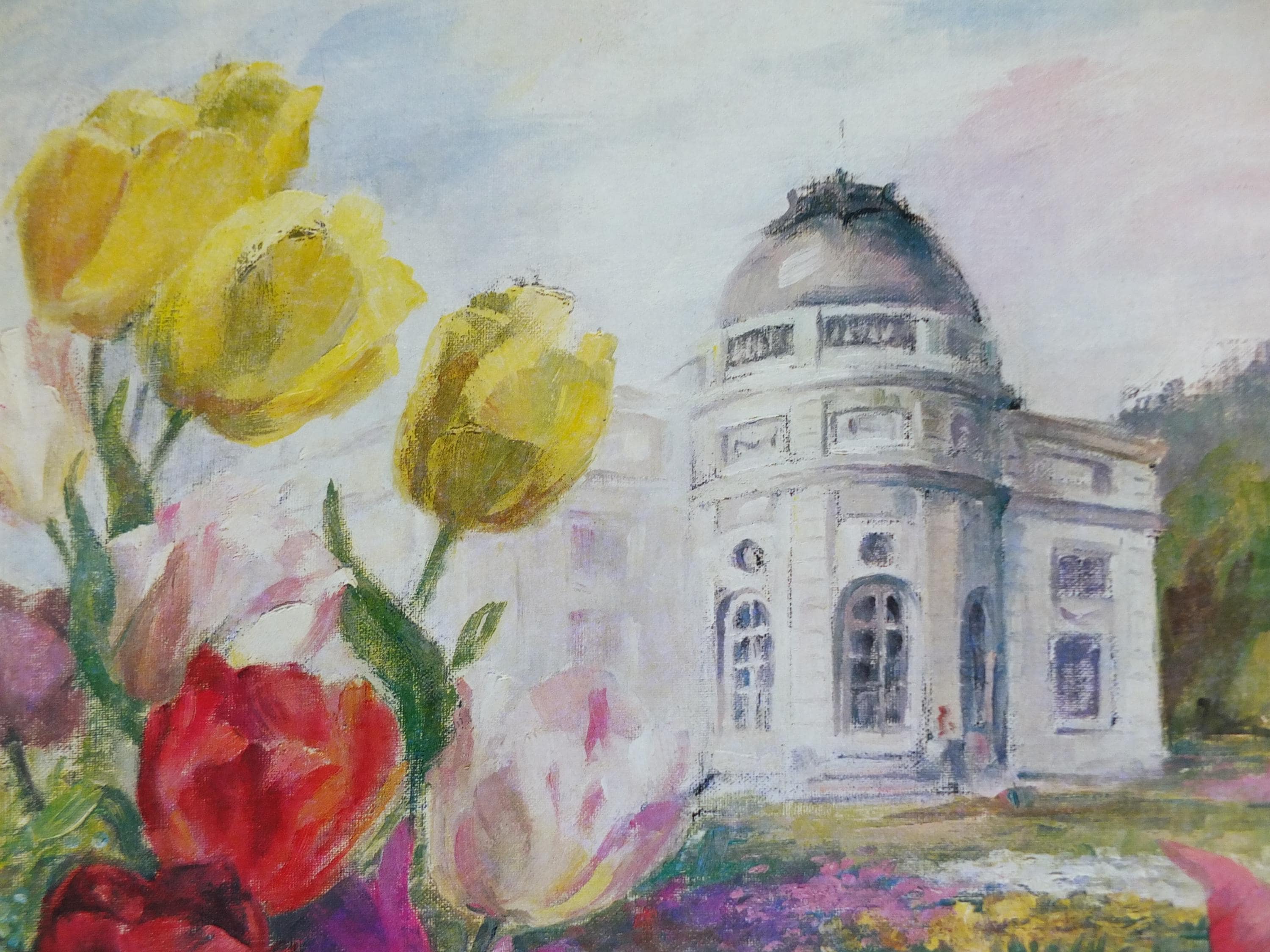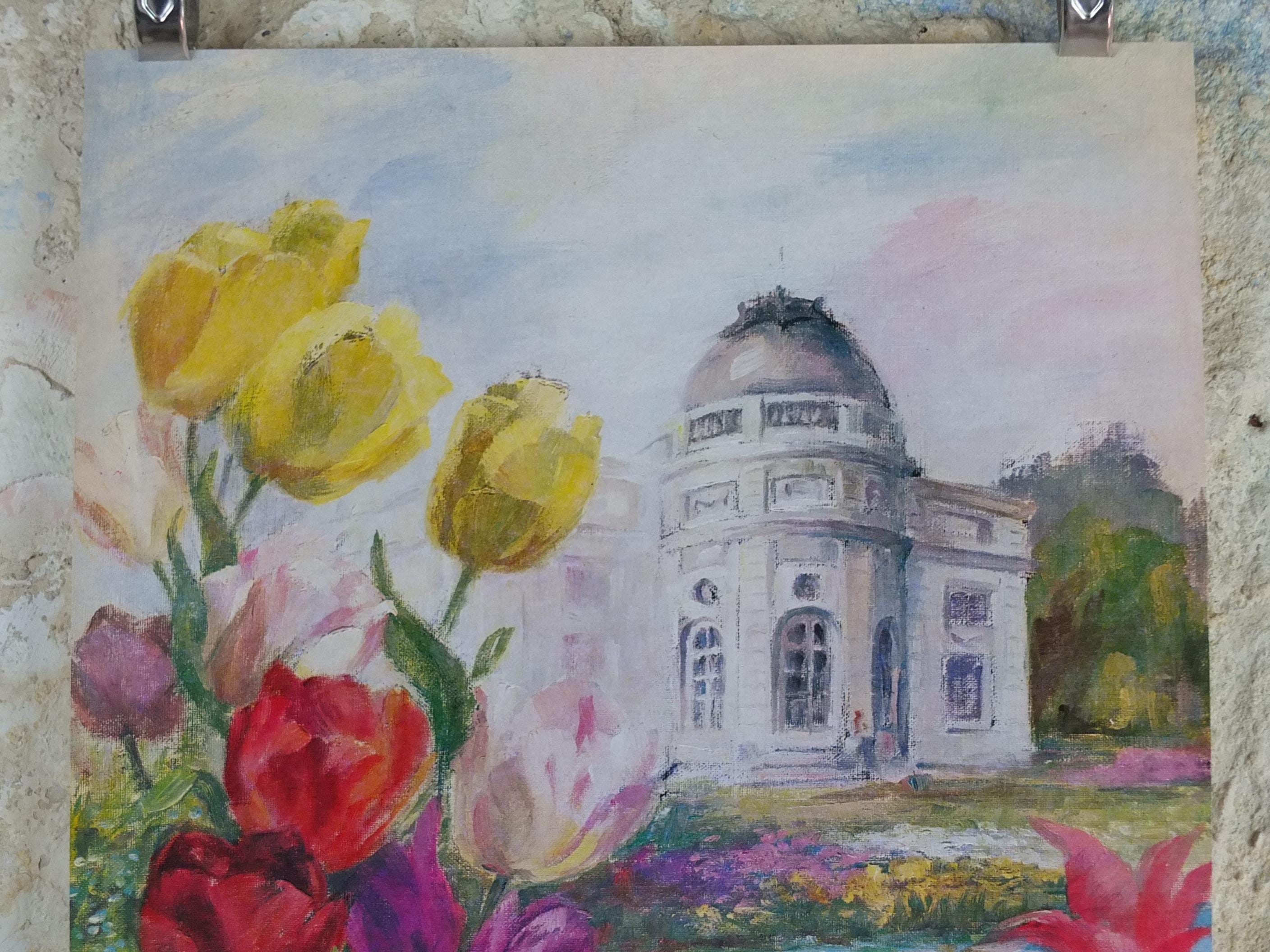 The Parc de Bagatelle, while perhaps most famous for its stunning rose garden in the summer, is a spectacular showcase of early season blooms, and the poster captures this perfectly. As a designated botanical garden for the City of Paris, the park dedicates large areas to vibrant bulb collections, including an extensive display of tulips, which herald the arrival of spring. The sight of these colorful, meticulously arranged tulip beds—like the ones dramatically painted in the foreground—provides a breathtaking contrast to the classical white-stone façade of the Château de Bagatelle, creating the picturesque atmosphere celebrated by the "Printemps à Bagatelle" event.