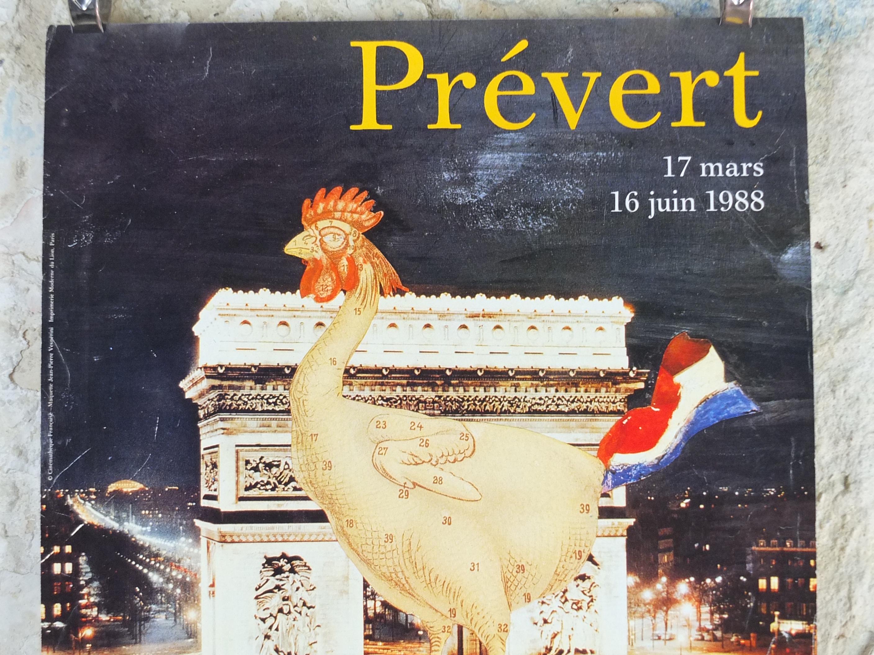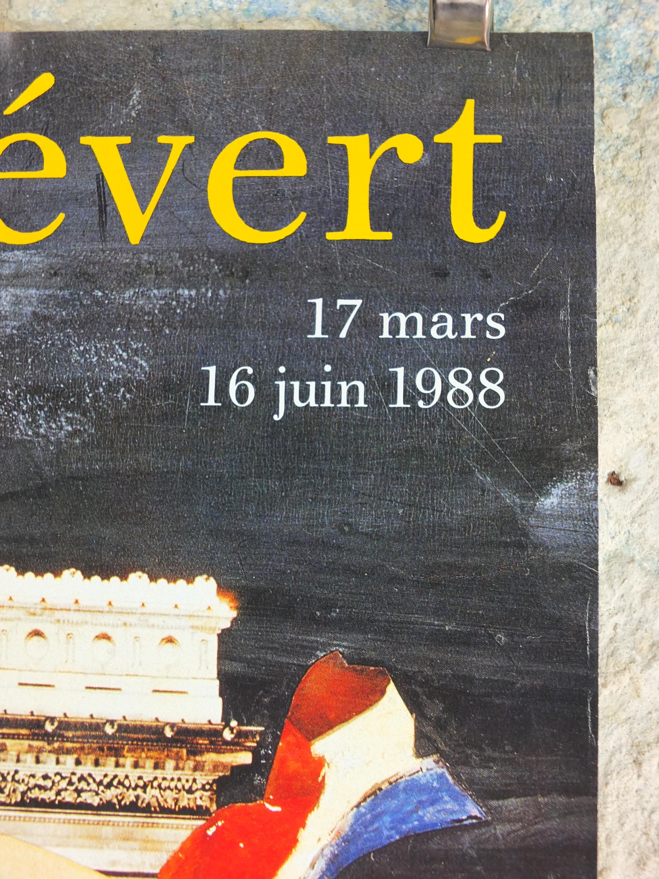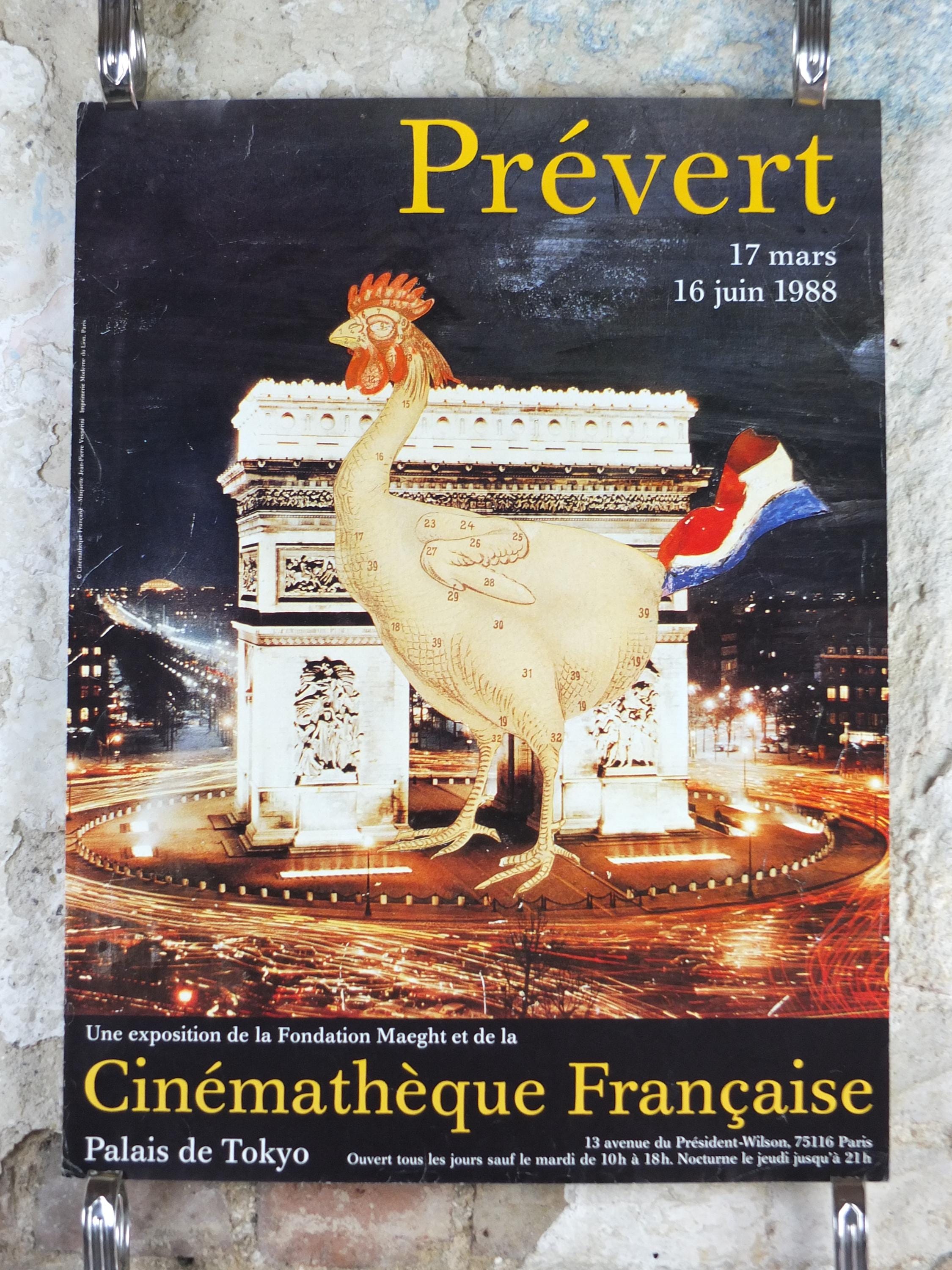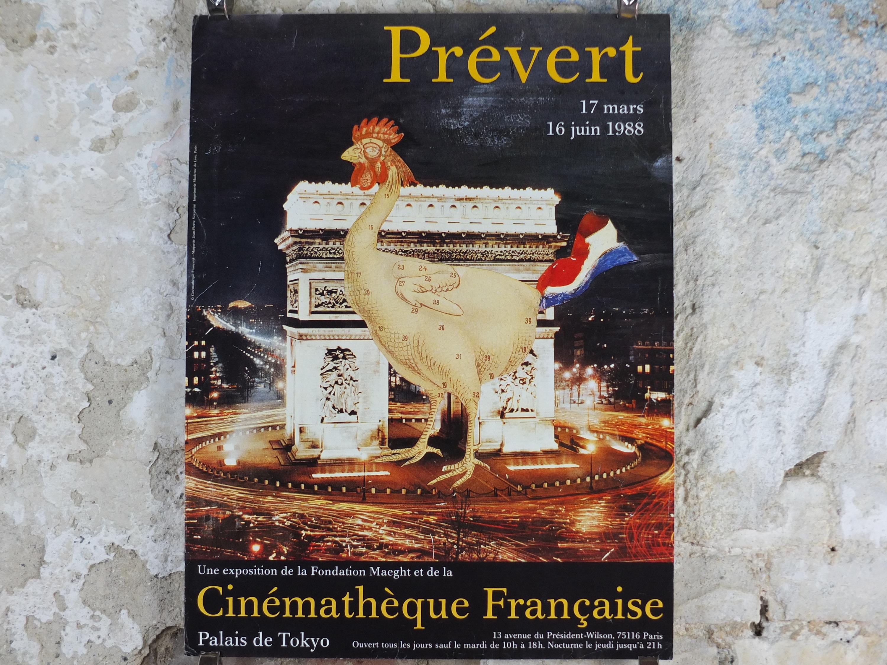 It's a visually memorable poster advertising a major cultural event from 1988 dedicated to the work of Jacques Prévert, highlighting his connection to both art (Fondation Maeght) and cinema (Cinémathèque Française).