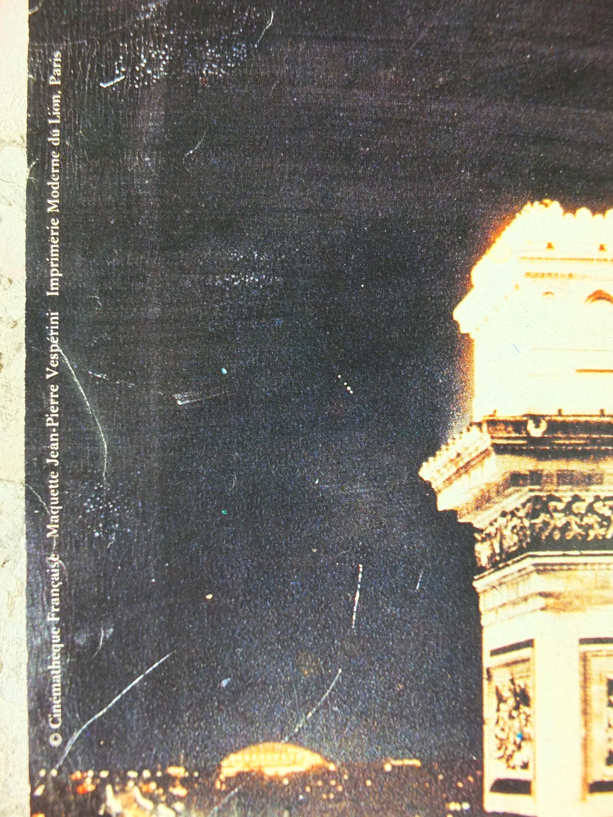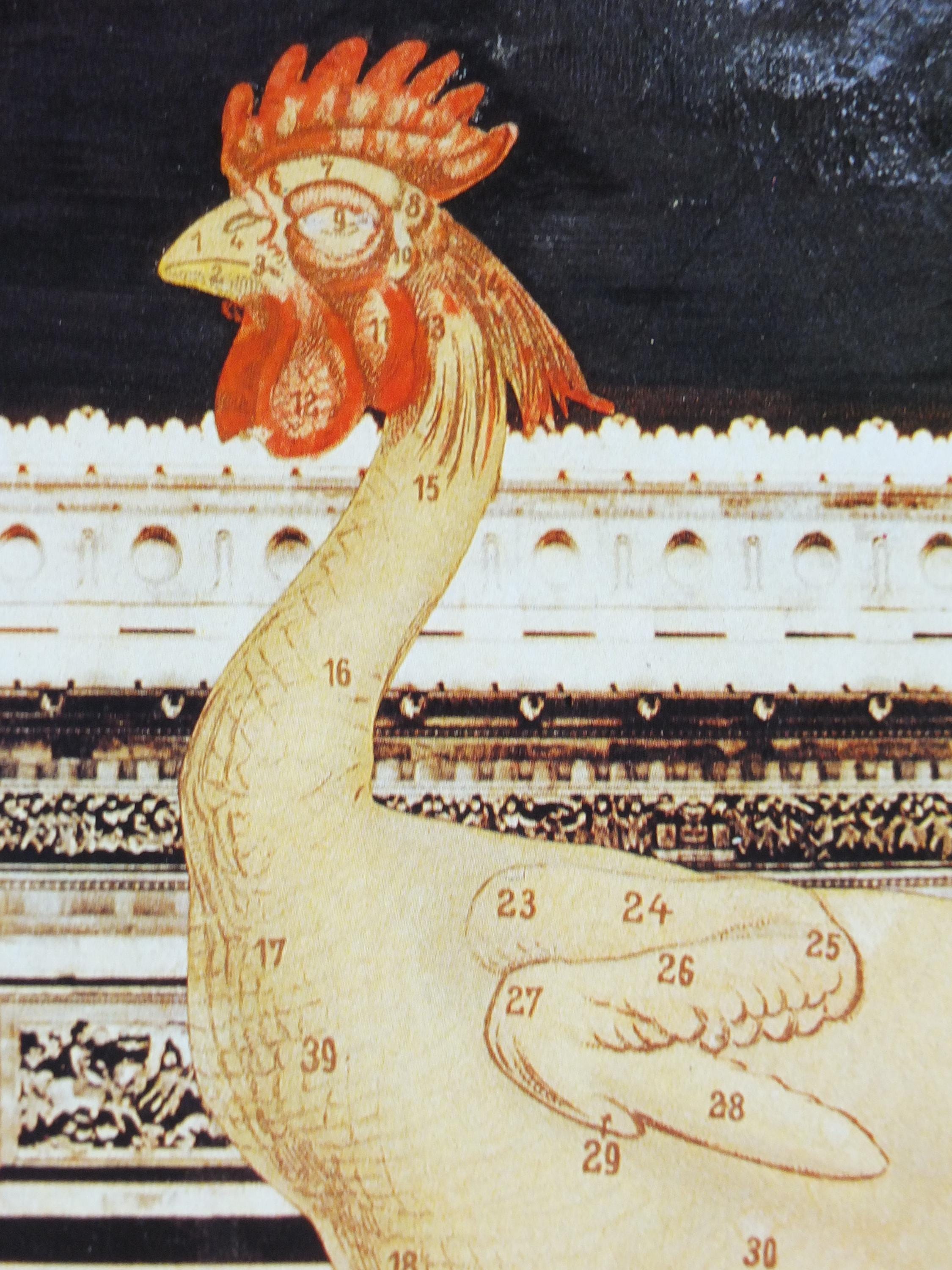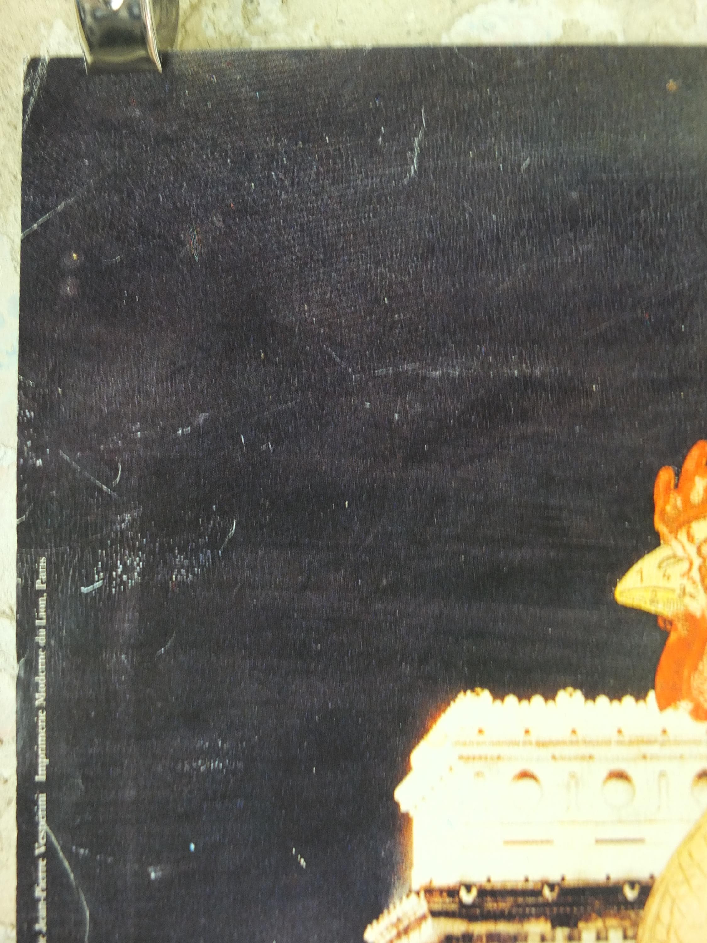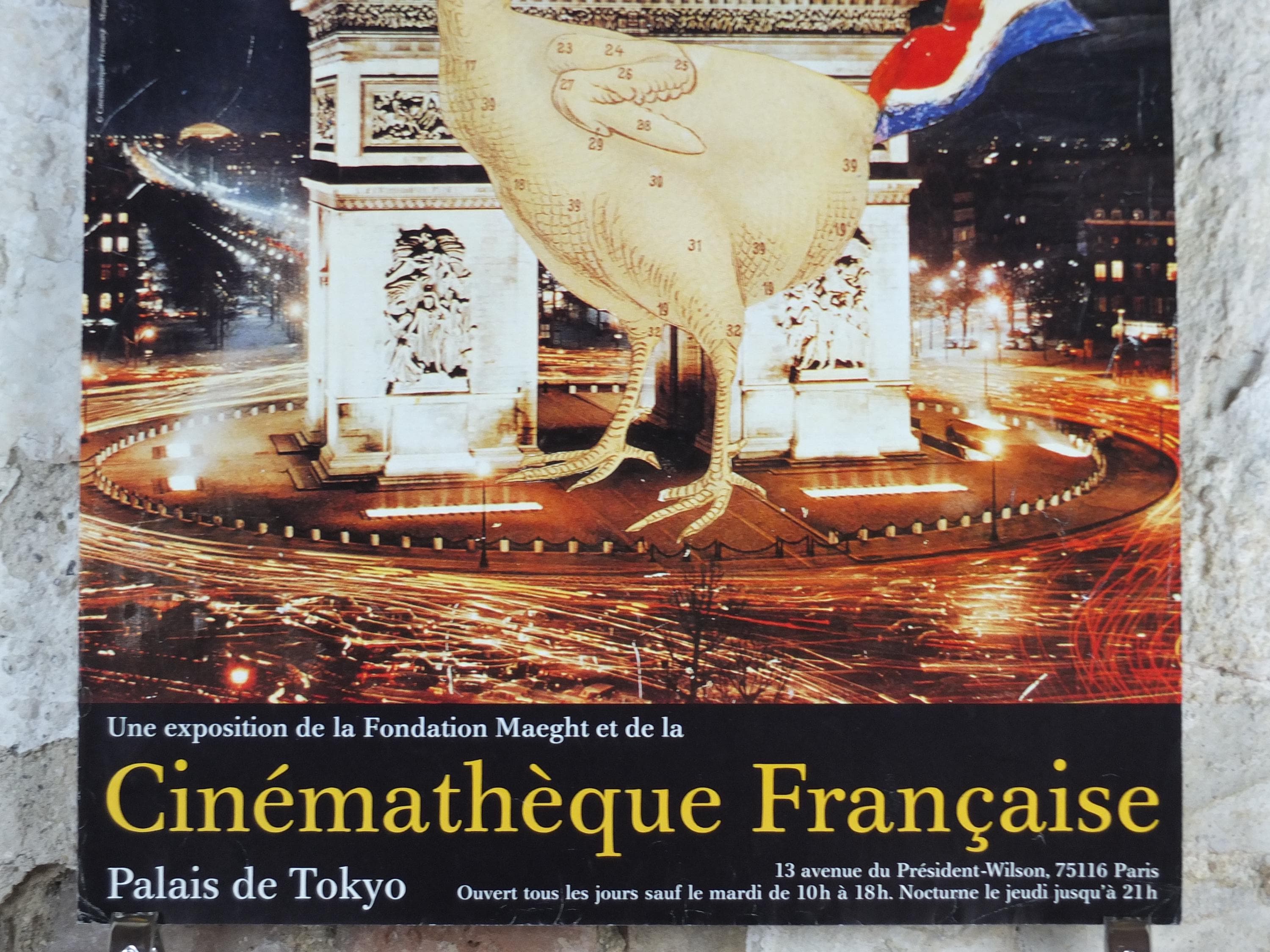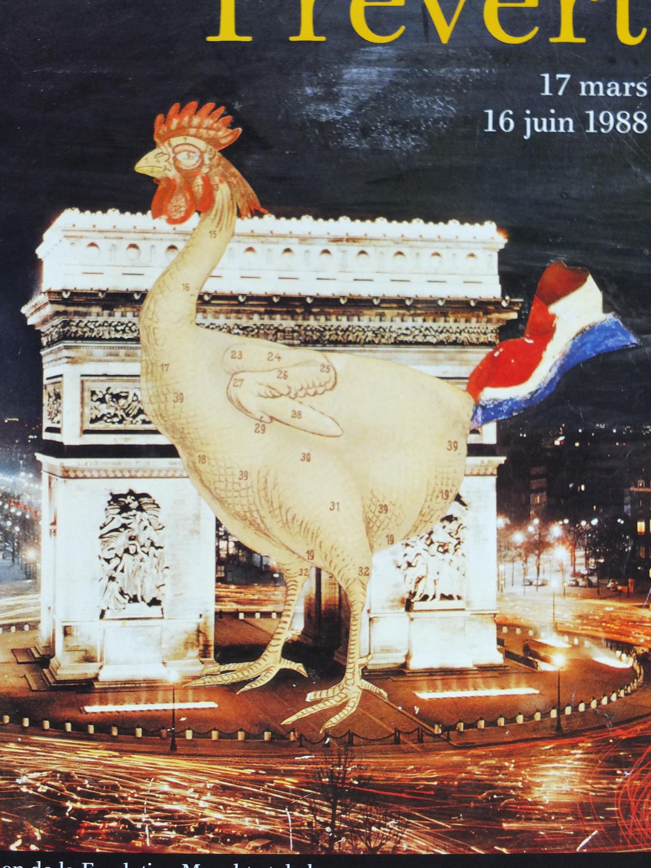 This is a peculiar French surrealist poster shows a giant rooster or coq, the French national bird against the backdrop of the Arc de Triomphe.