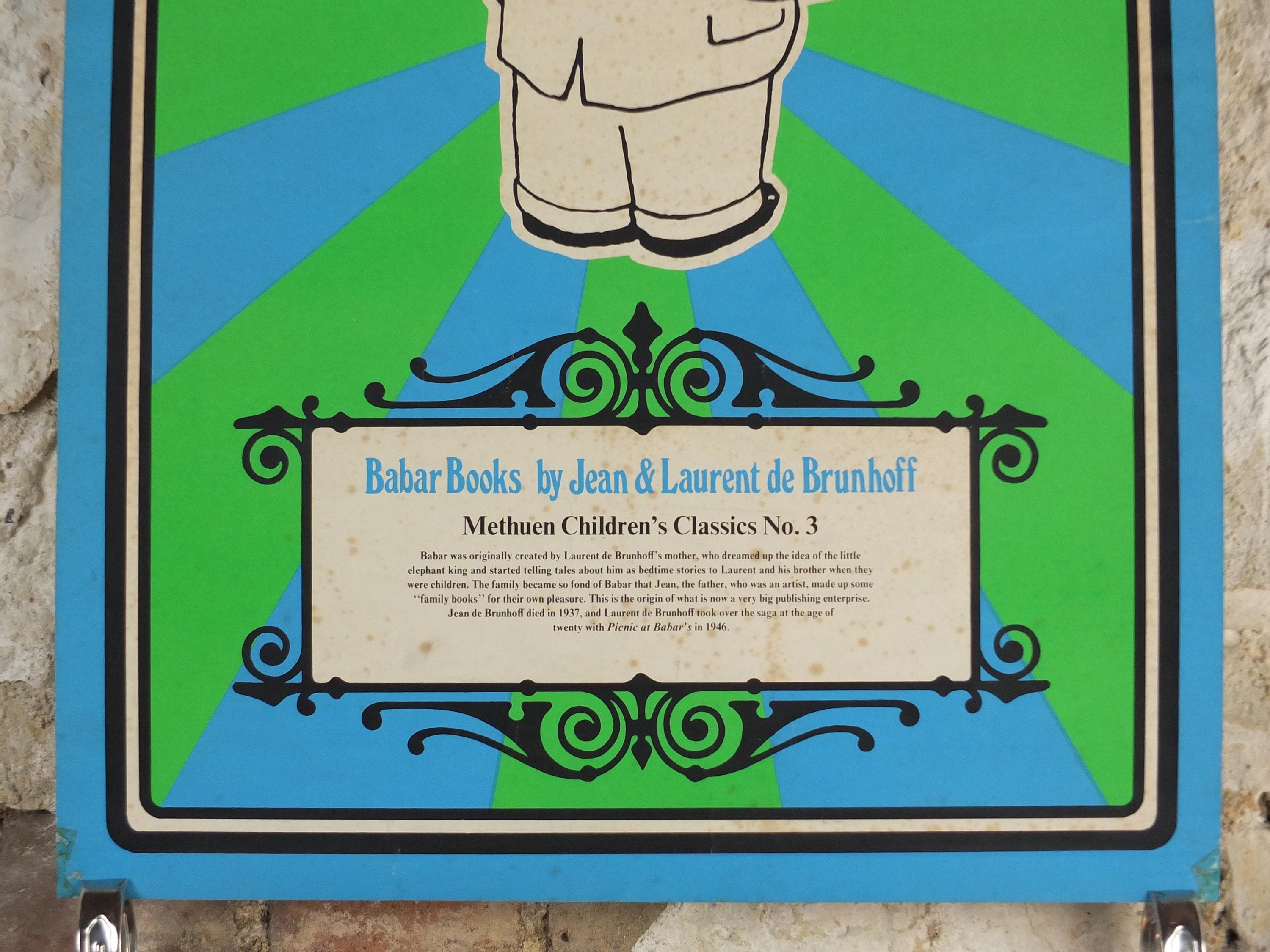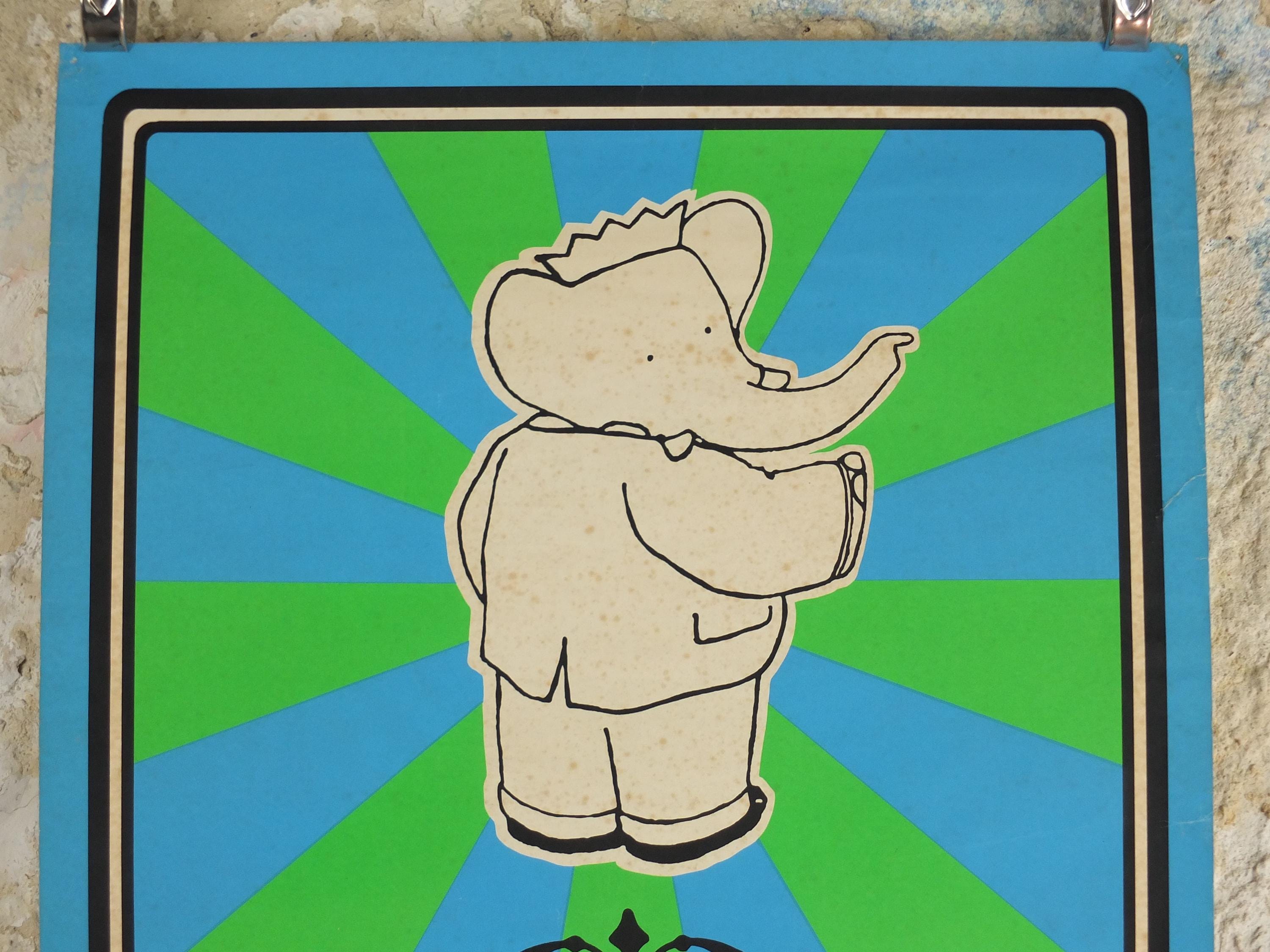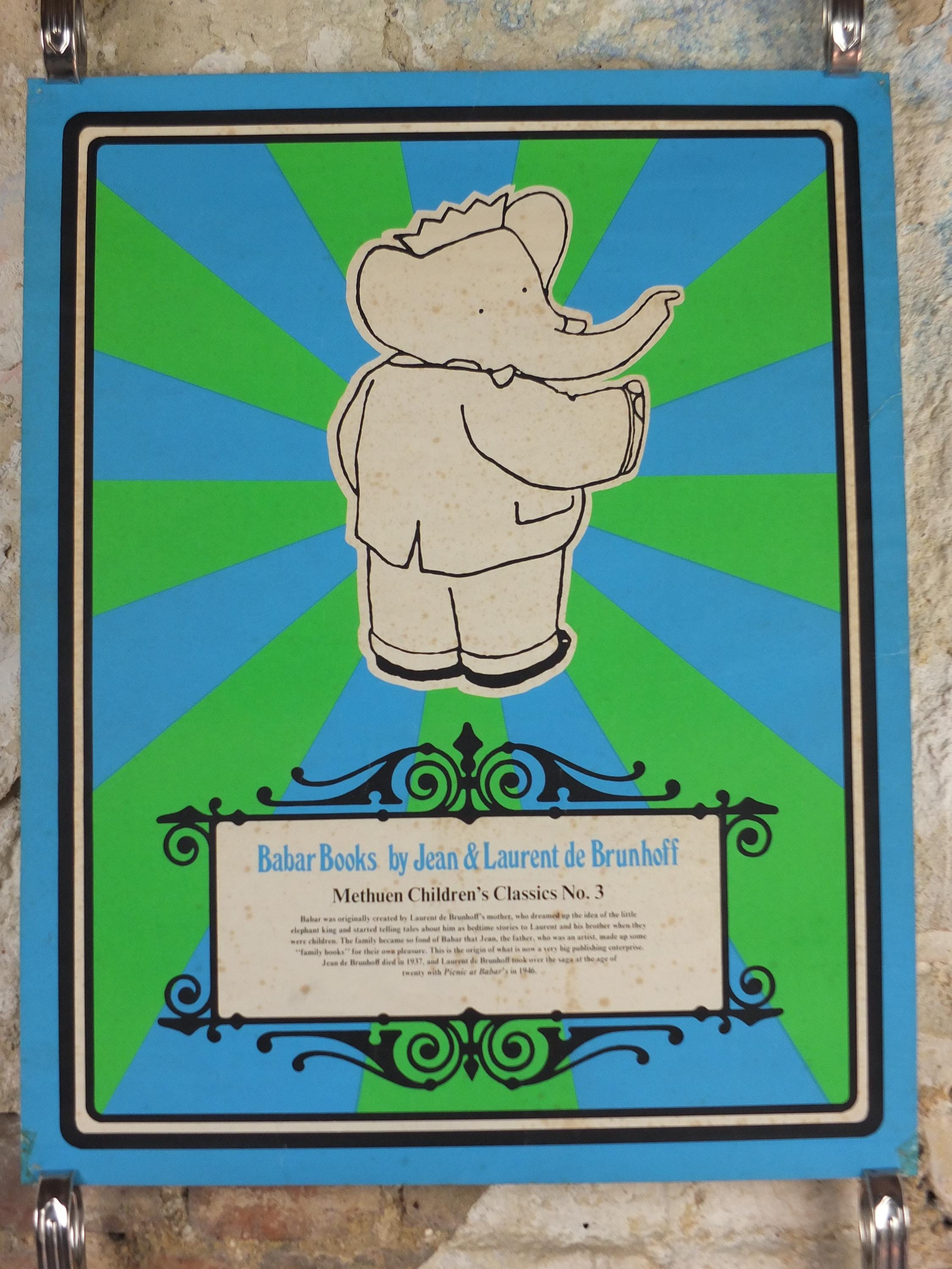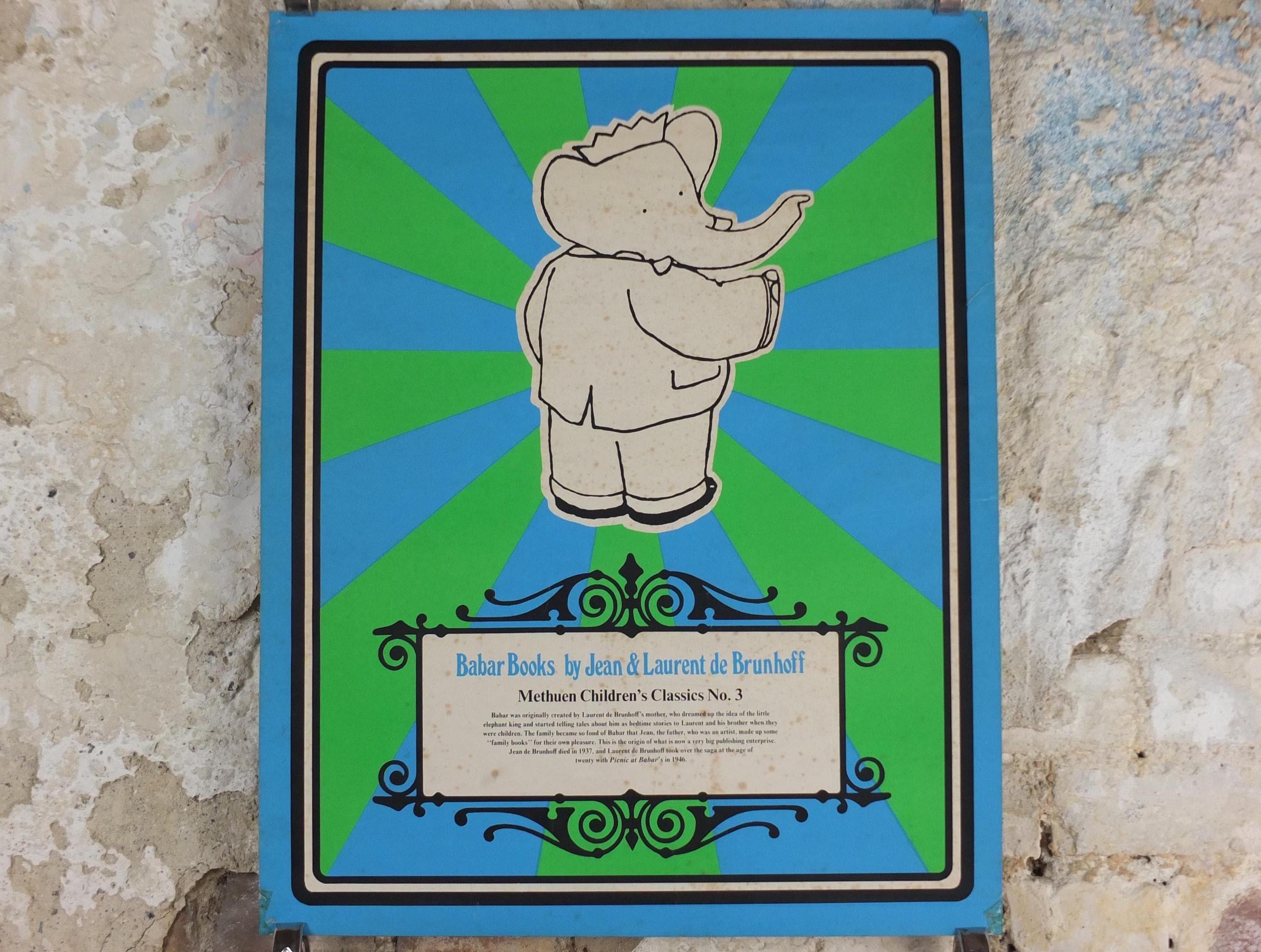 Jean de Brunhoff's Barbarr is a favourite of children across the world. This 1970s poster is advertising a book release from Methuen Childrens Classics No 3. Laurent de Brunhoff continued the tales from his father.