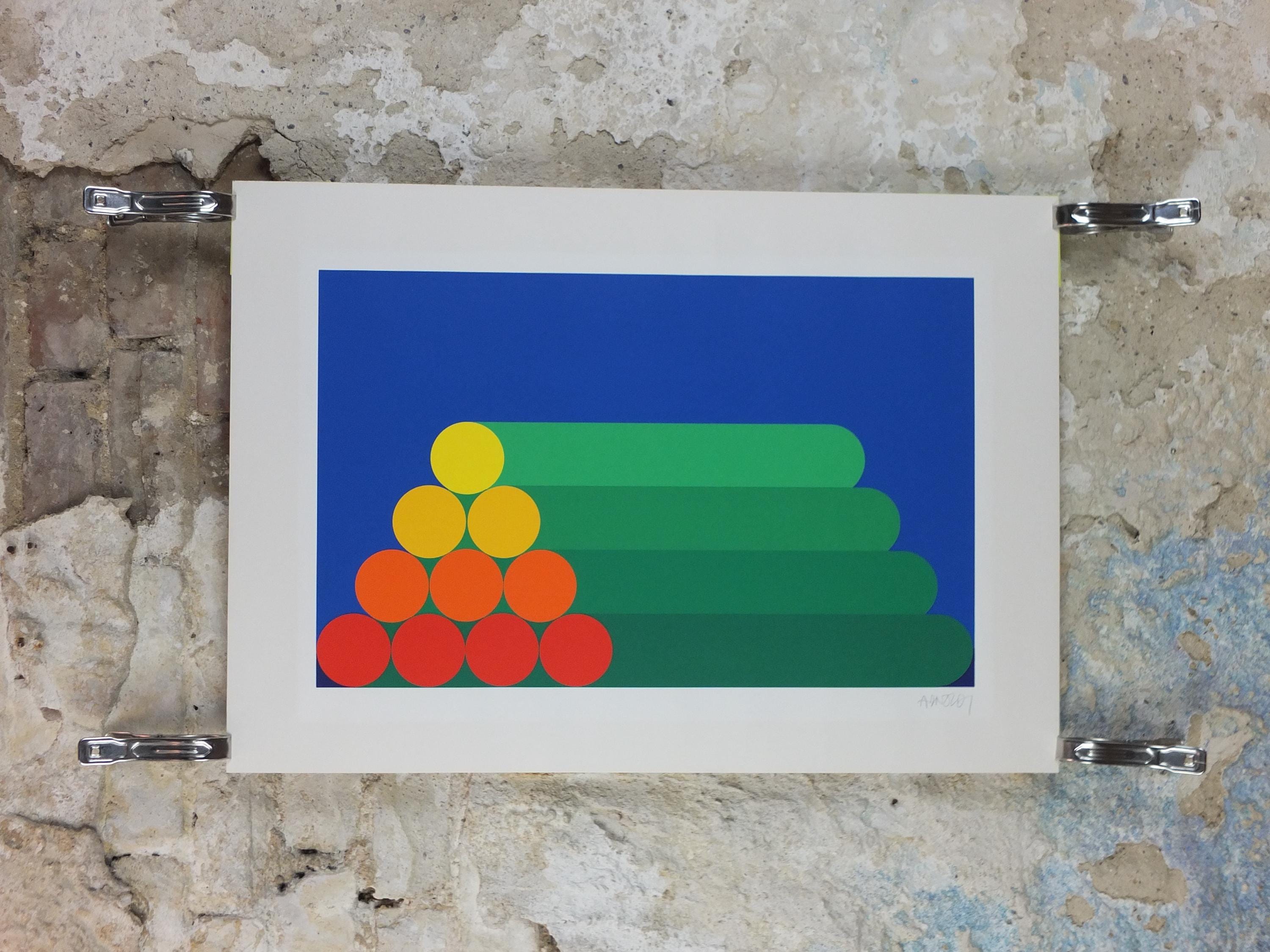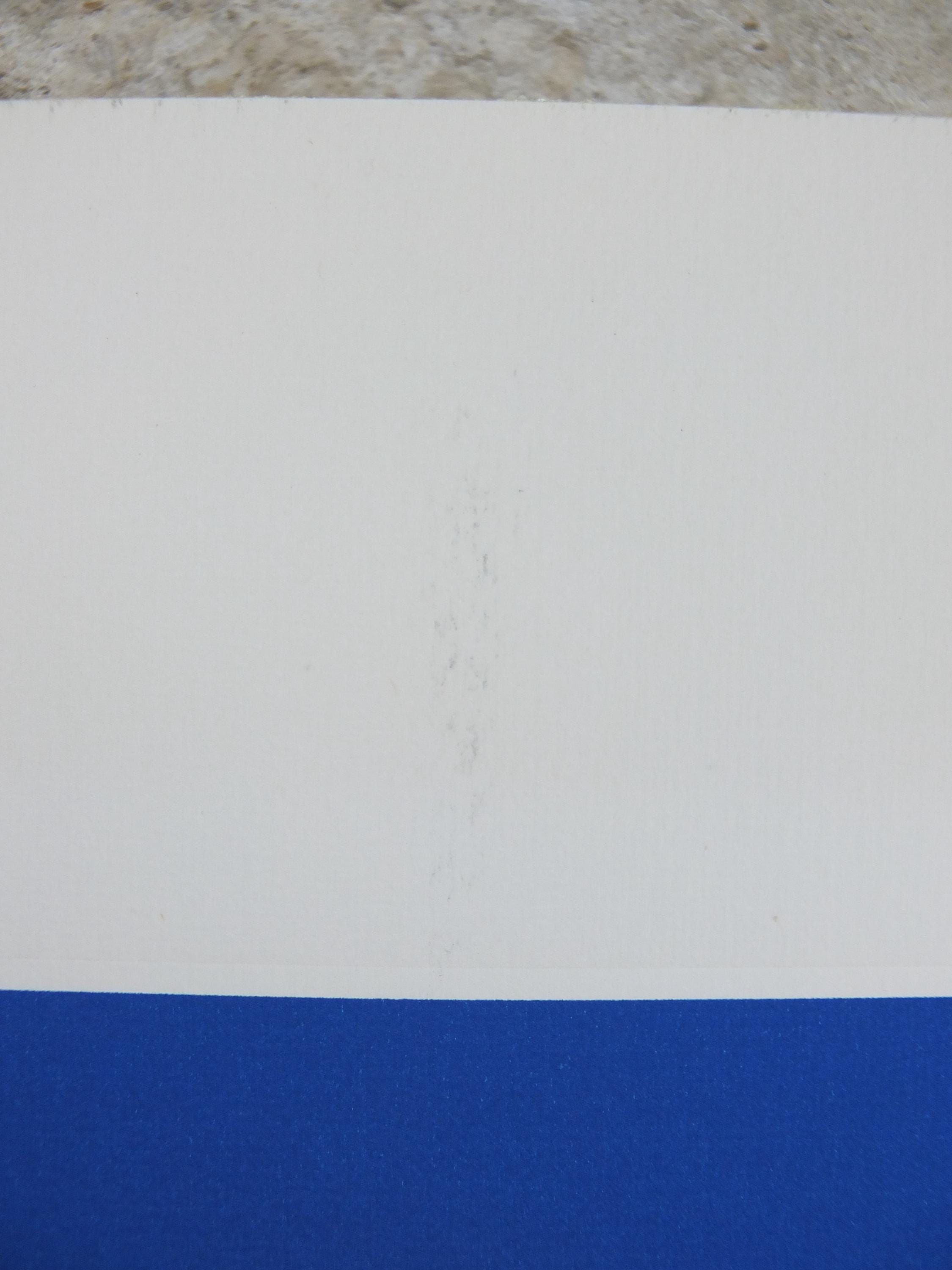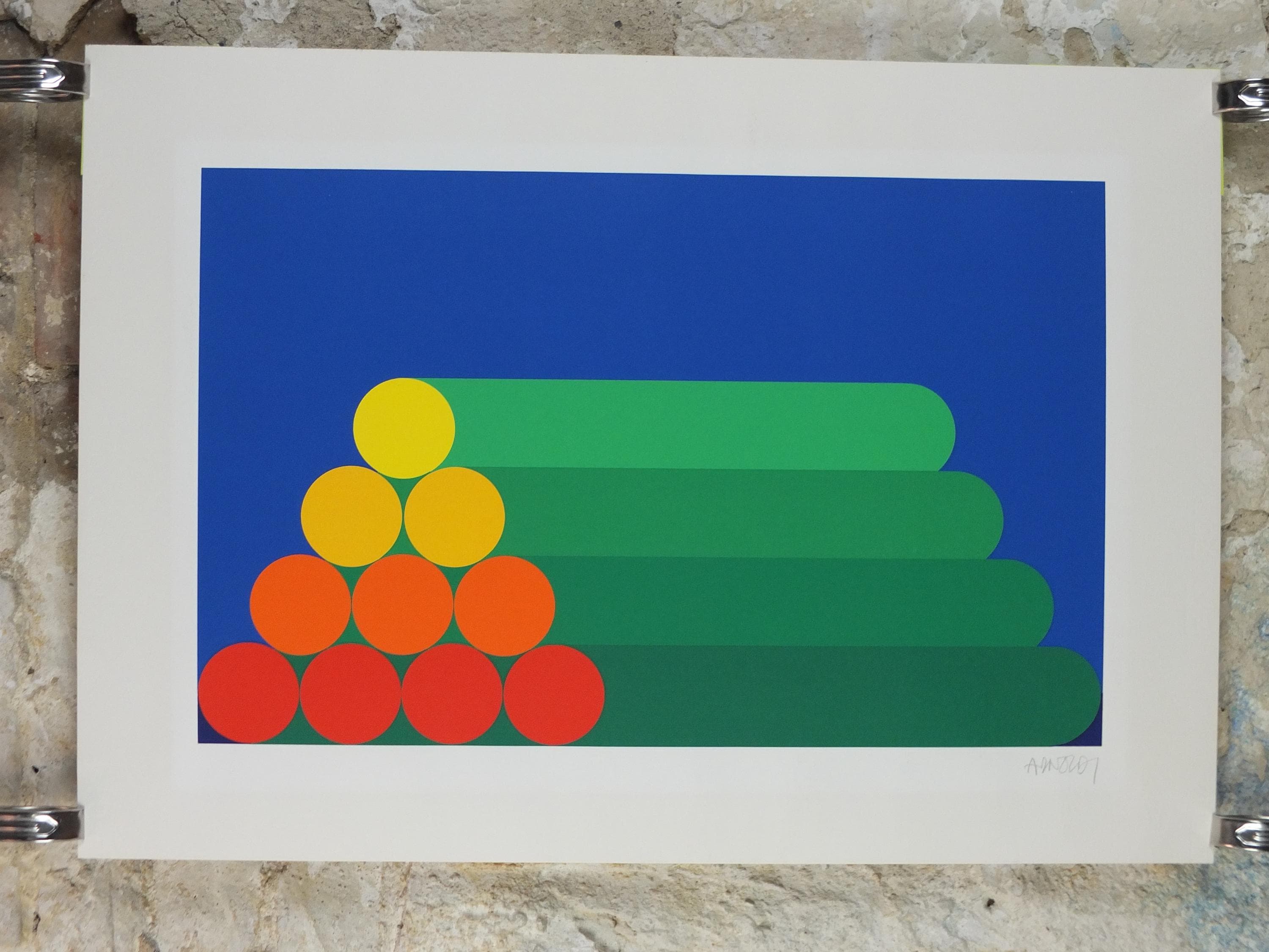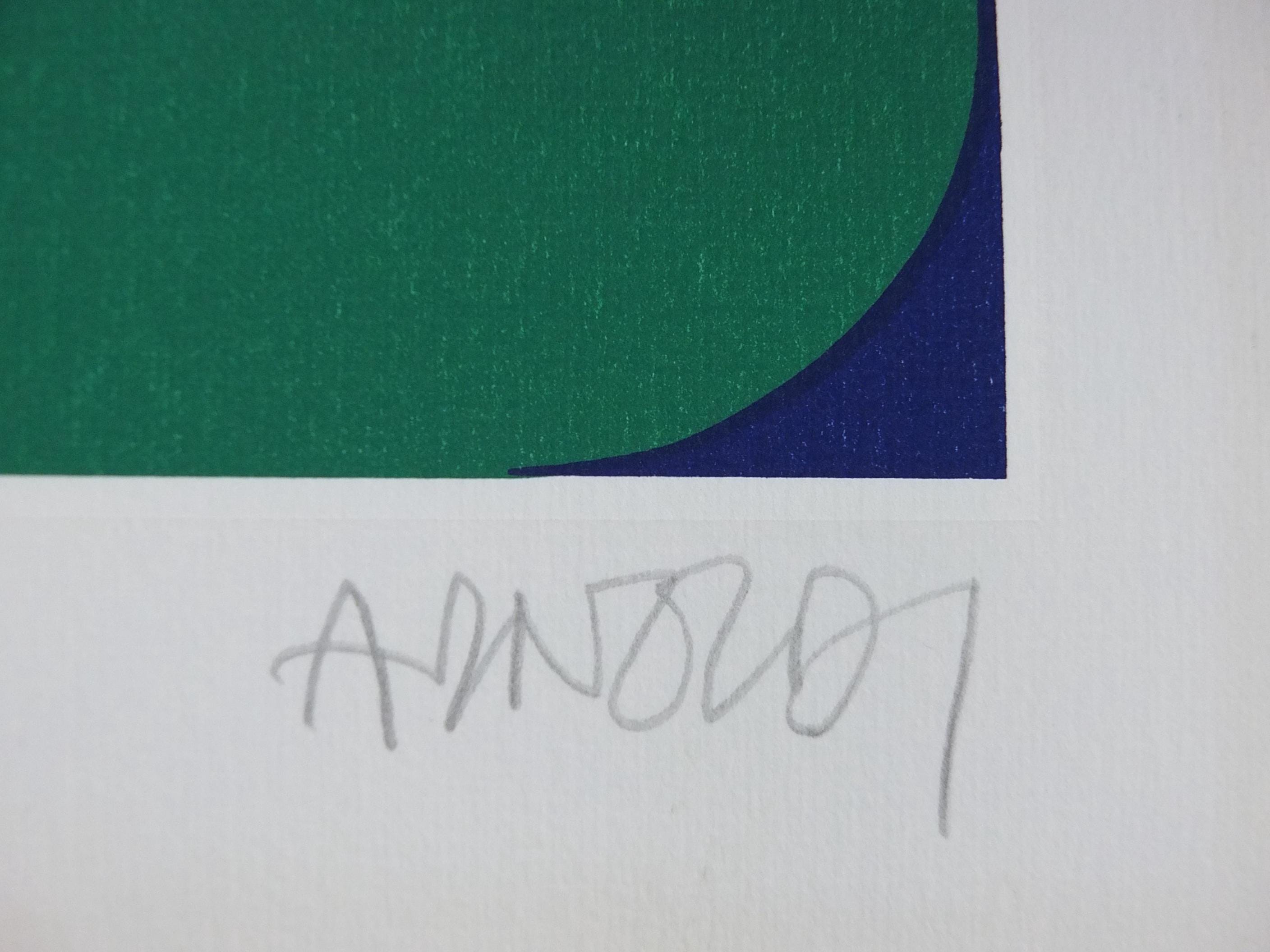 This is an original hand signed poster for Per Arnoldi's minimalist and geometric abstraction style, which uses simple geometric shapes, clean lines, and a limited palette of bold, often primary, colors.