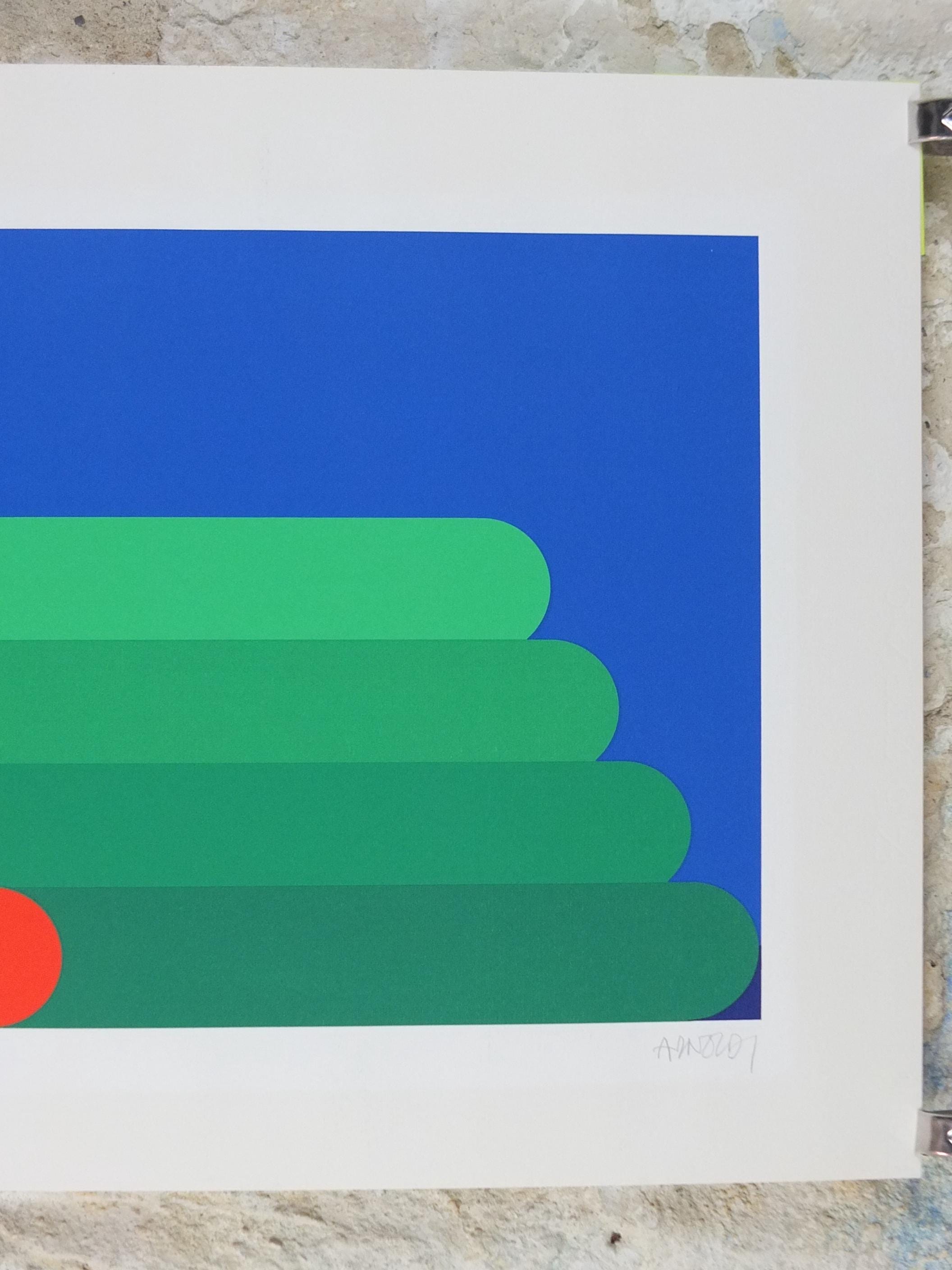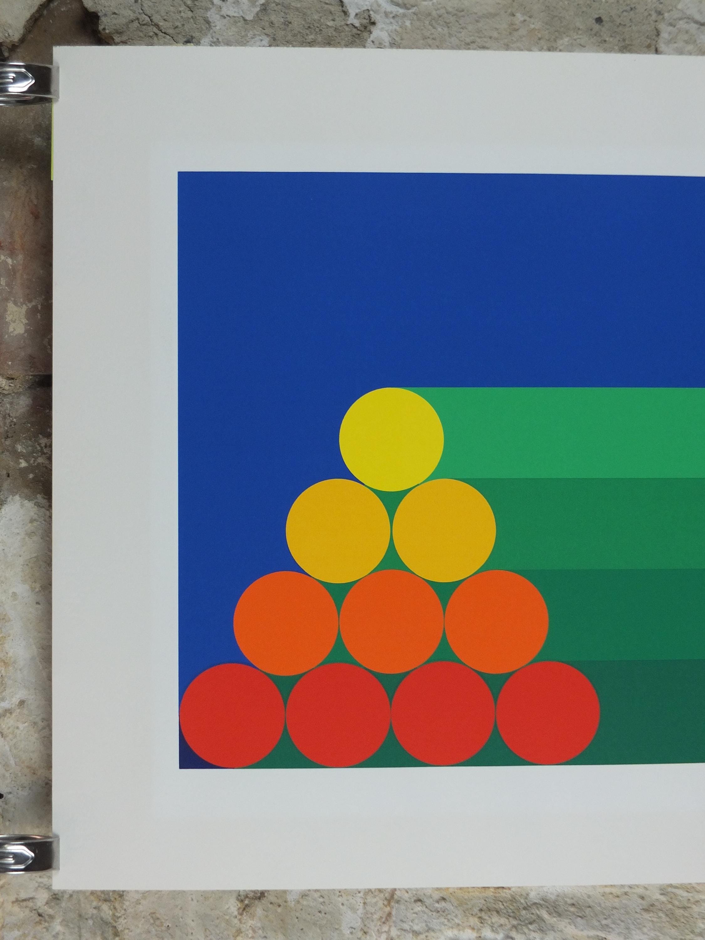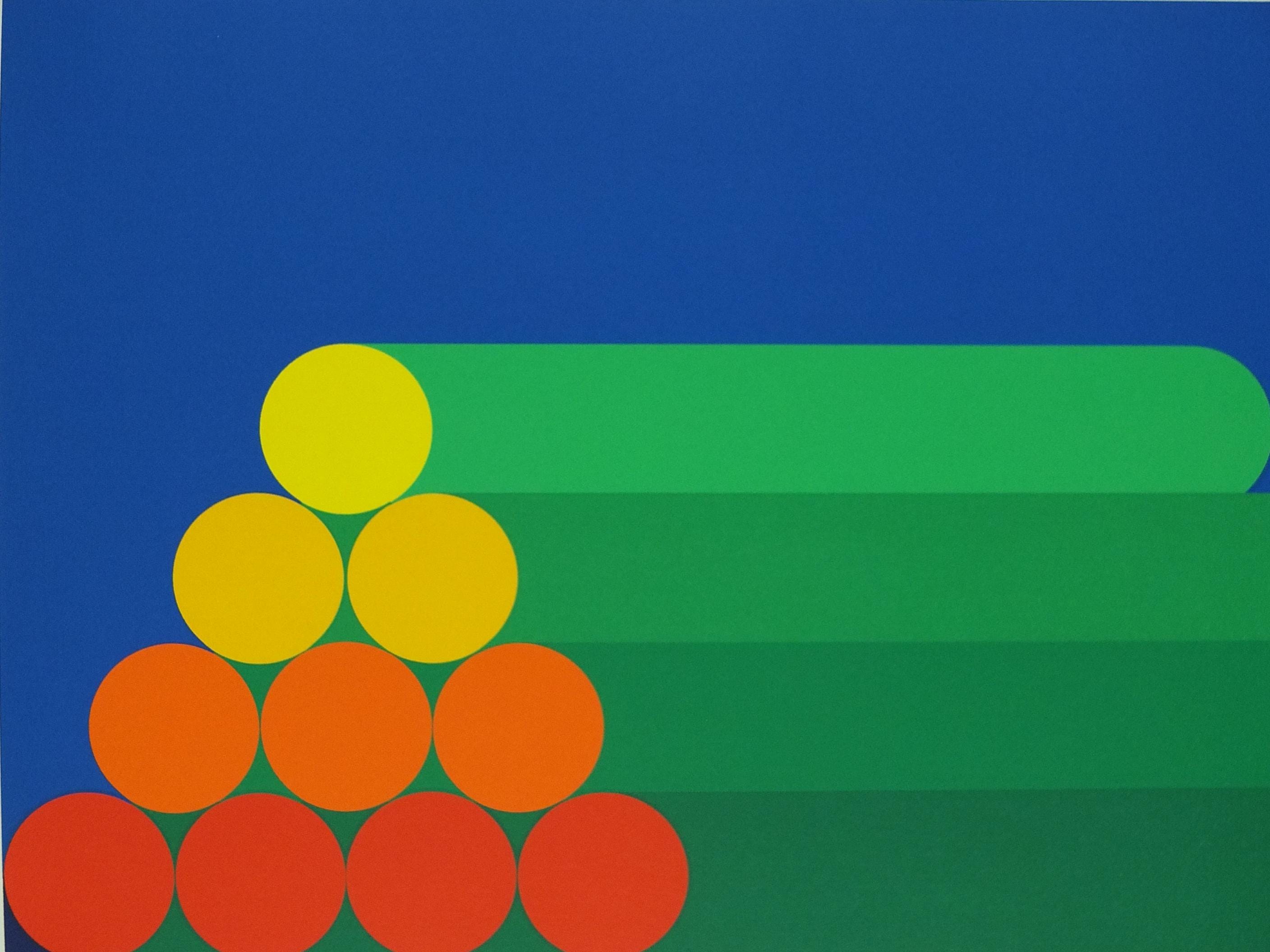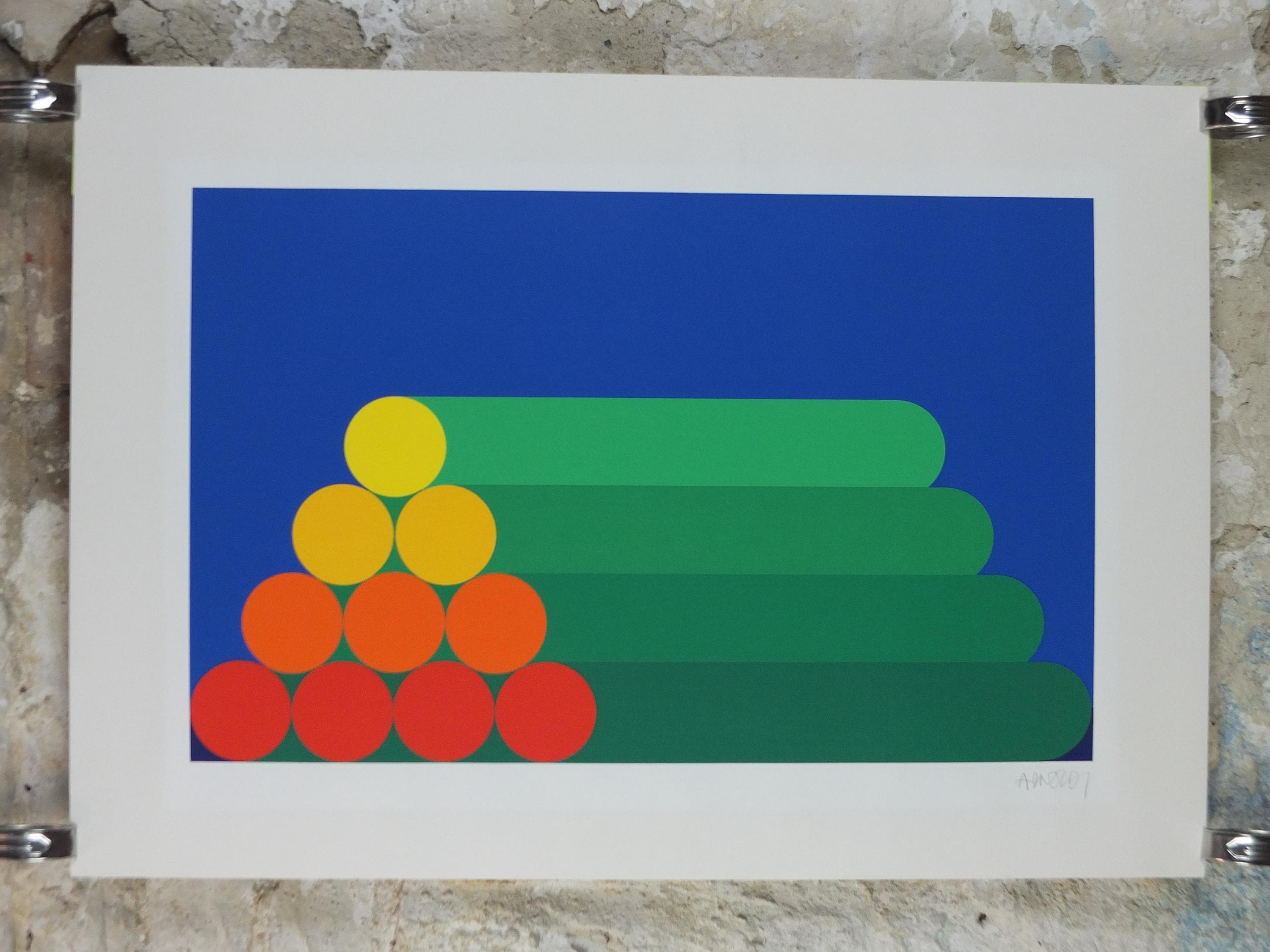 This is an original hand signed poster for Per Arnoldi's minimalist and geometric abstraction style, which uses simple geometric shapes, clean lines, and a limited palette of bold, often primary, colors.
