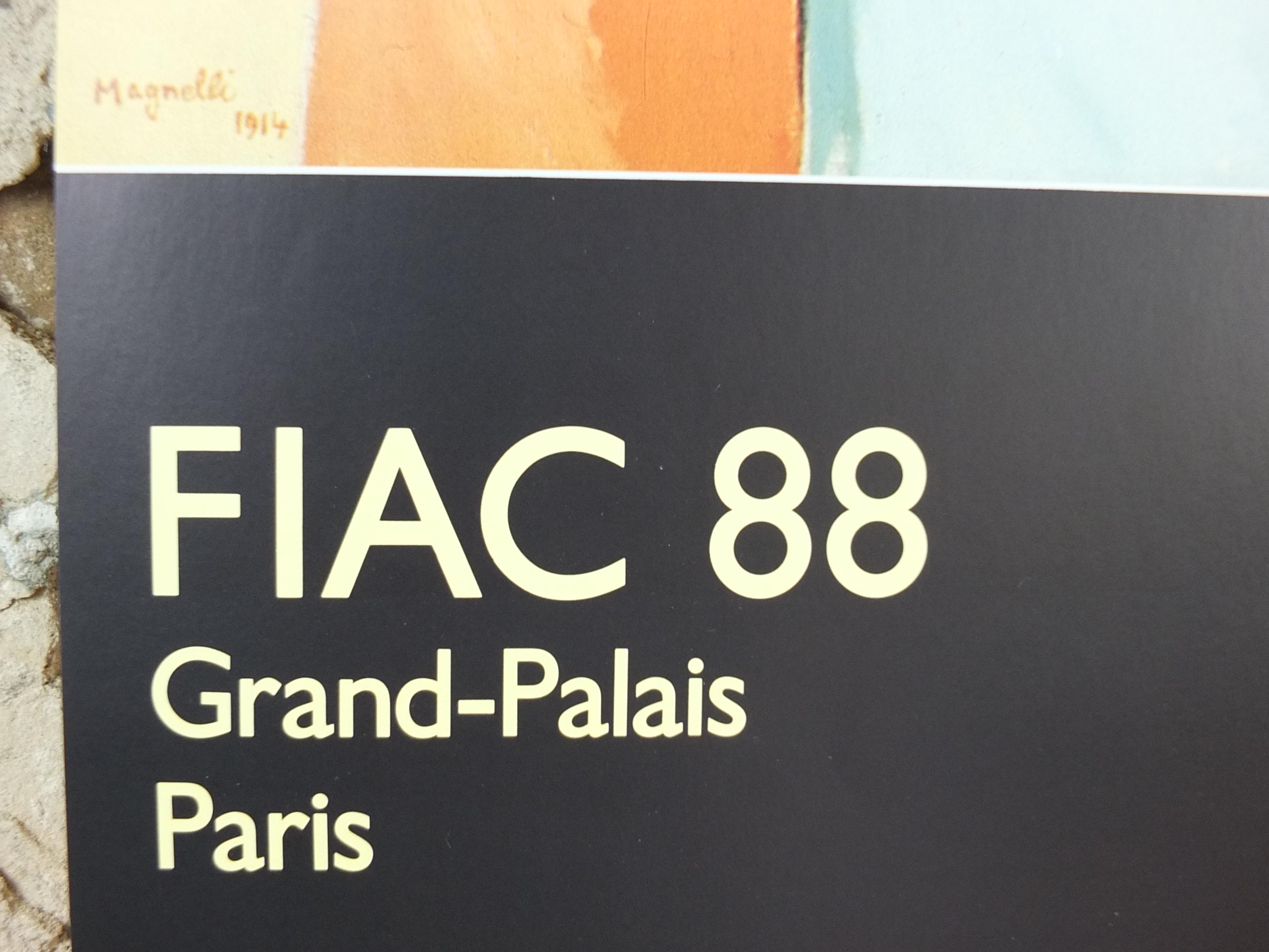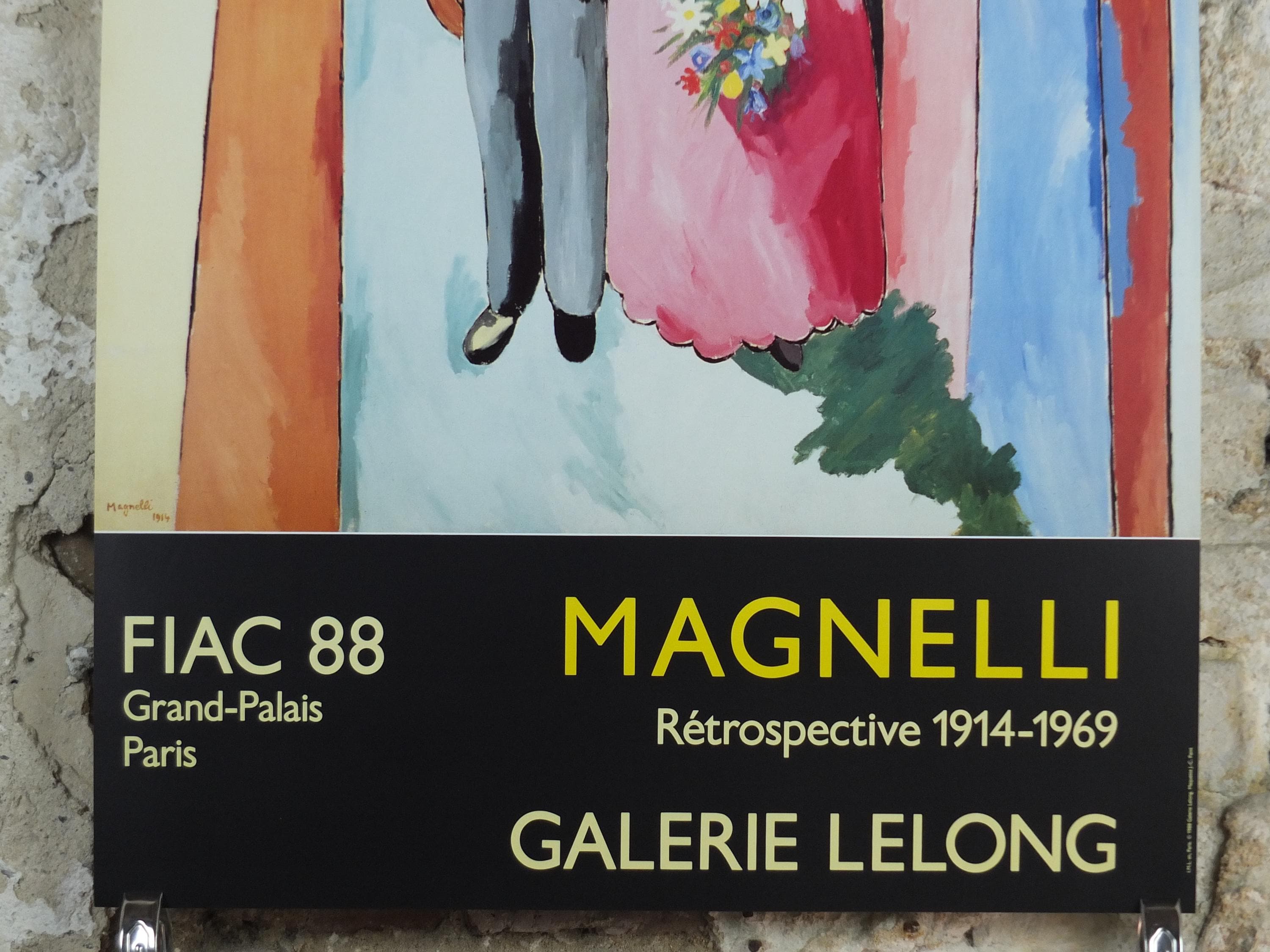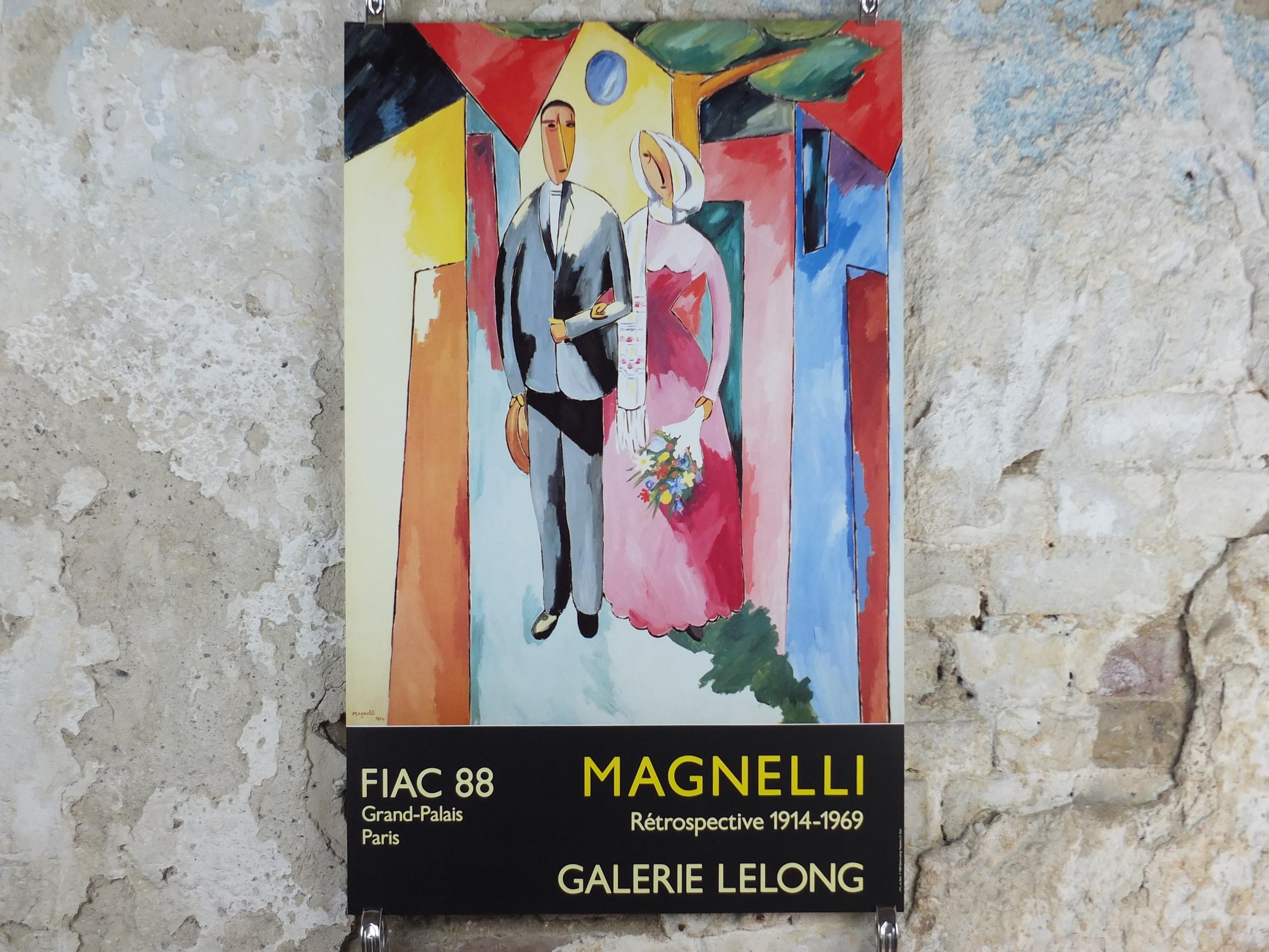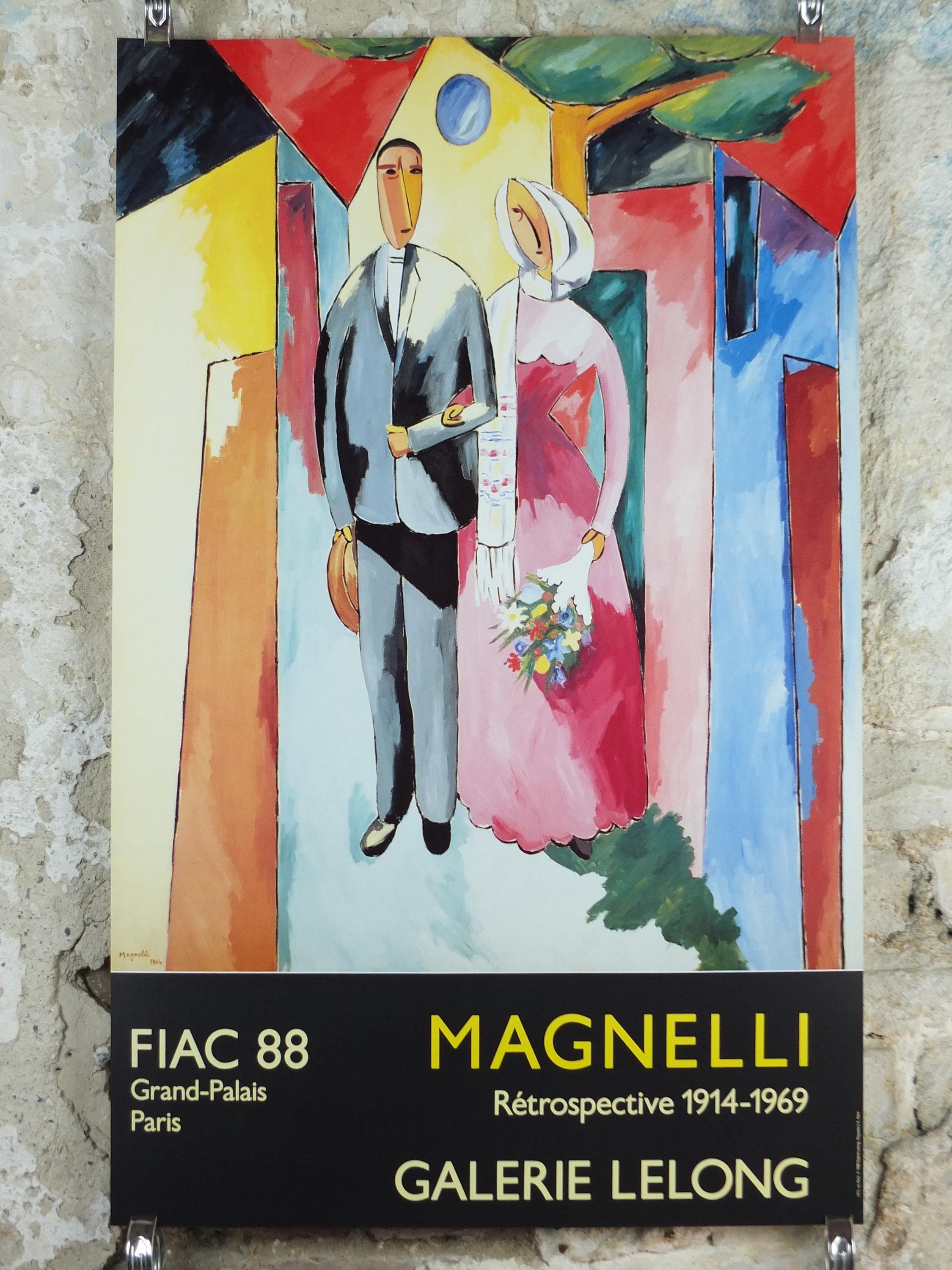 This original Alberto Magnelli exhibition poster is from Galerie Lelong in the Grand Palais in Paris for a 1988 exhibition. it shows a newly married young couple "hovering" against a wall of light.