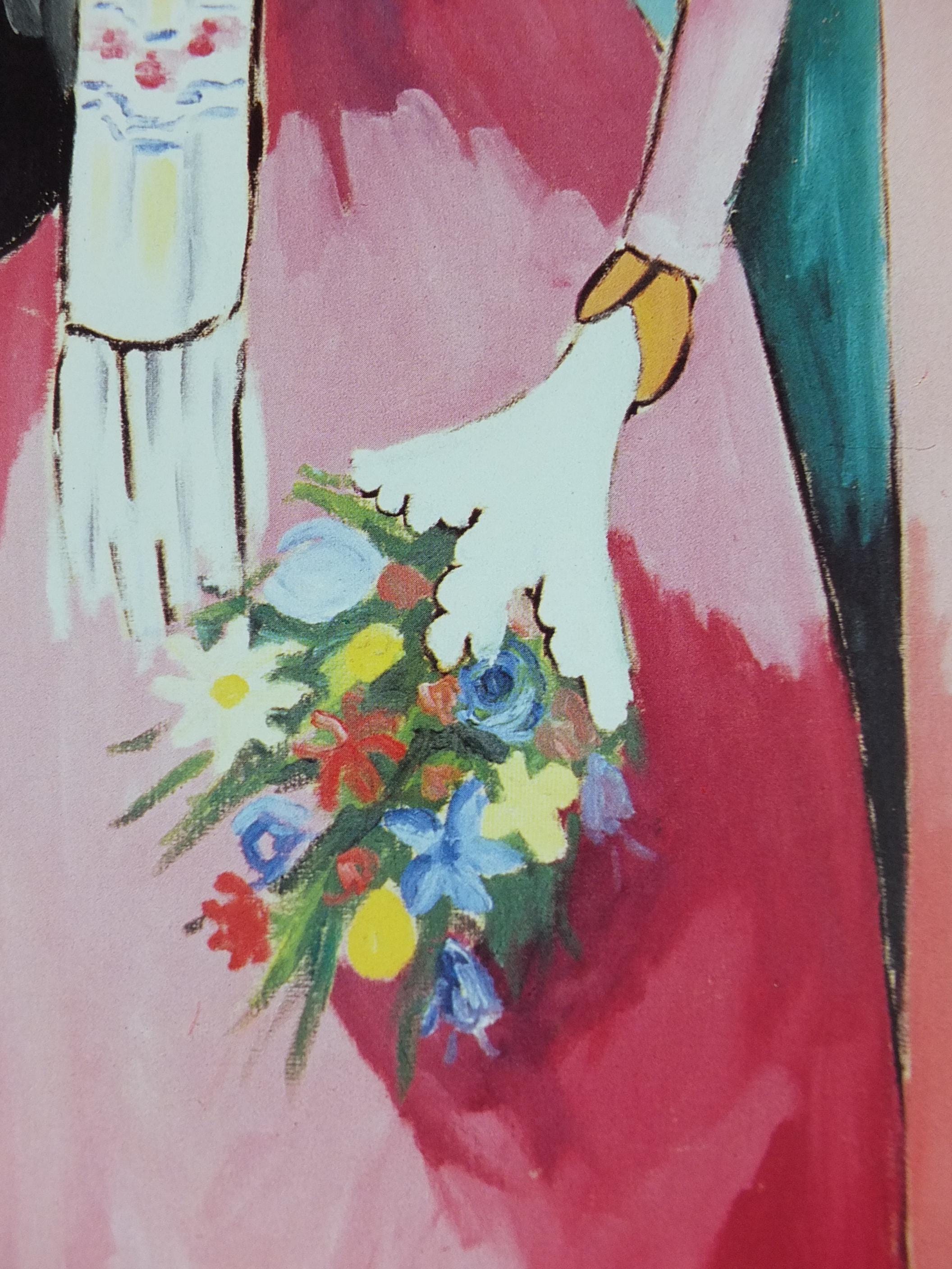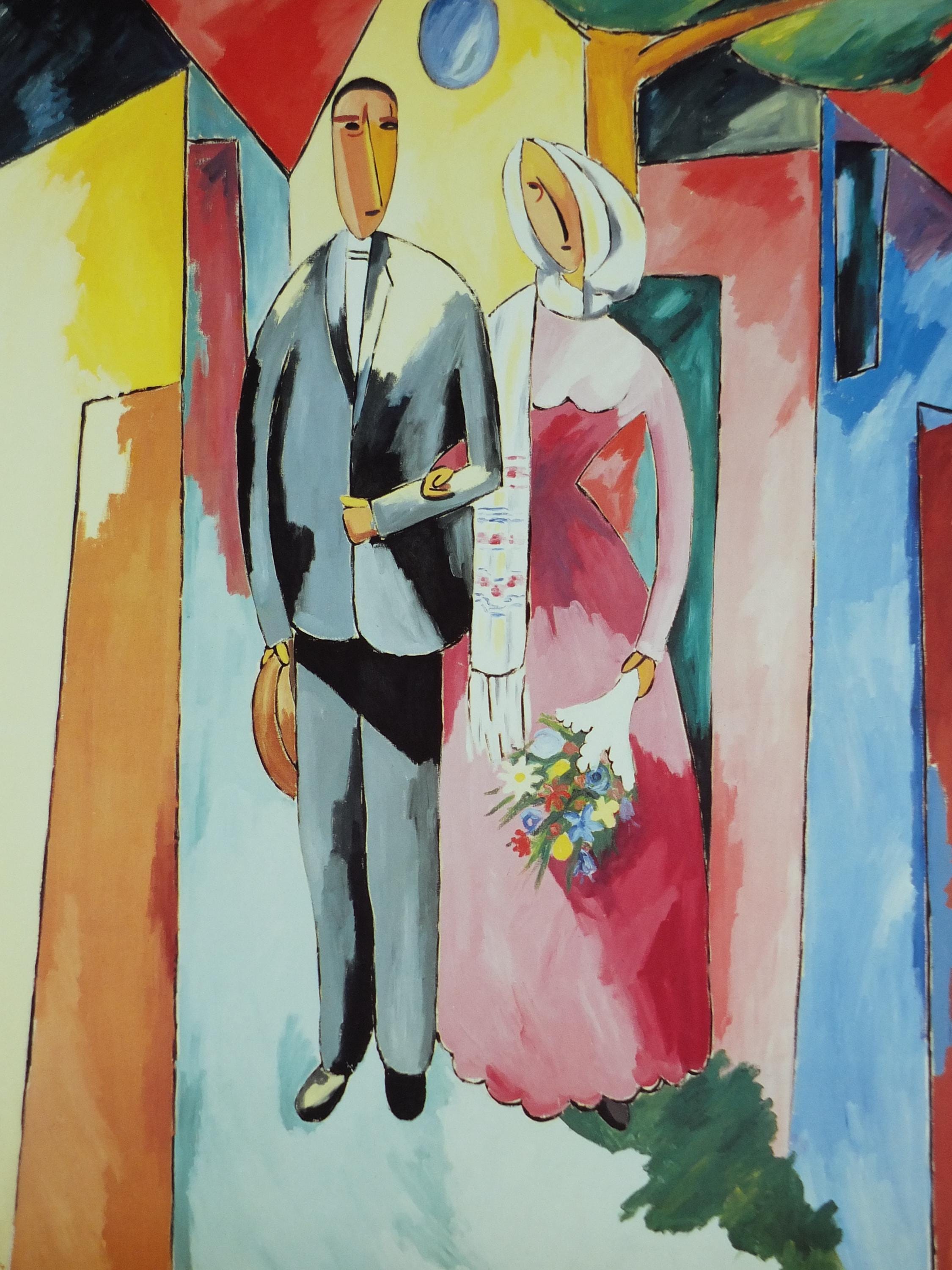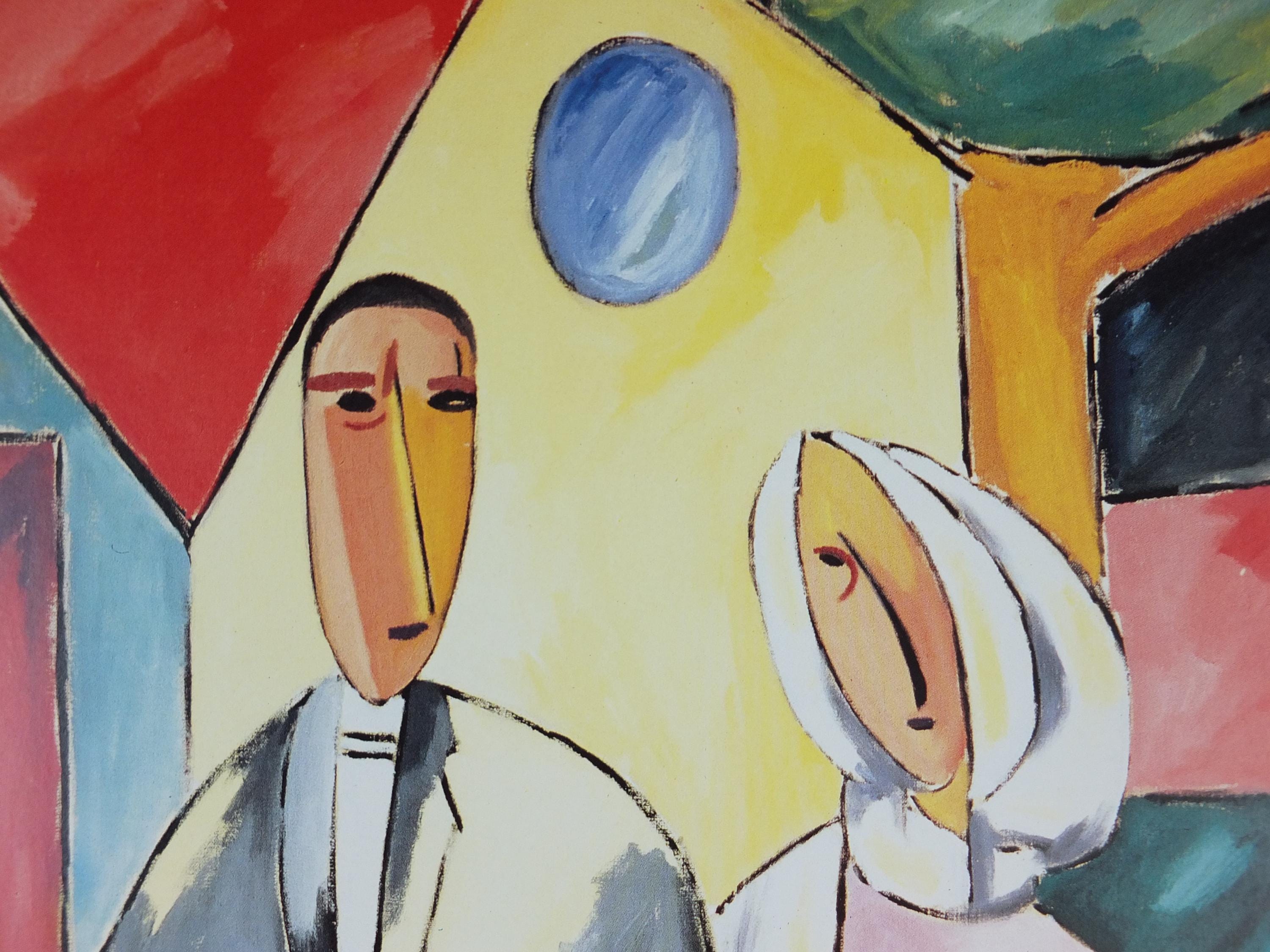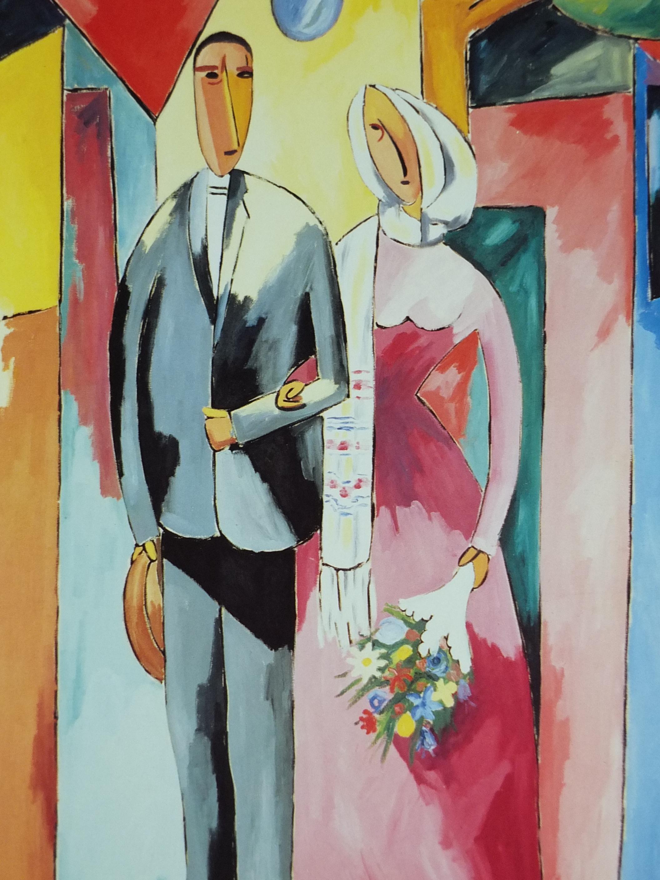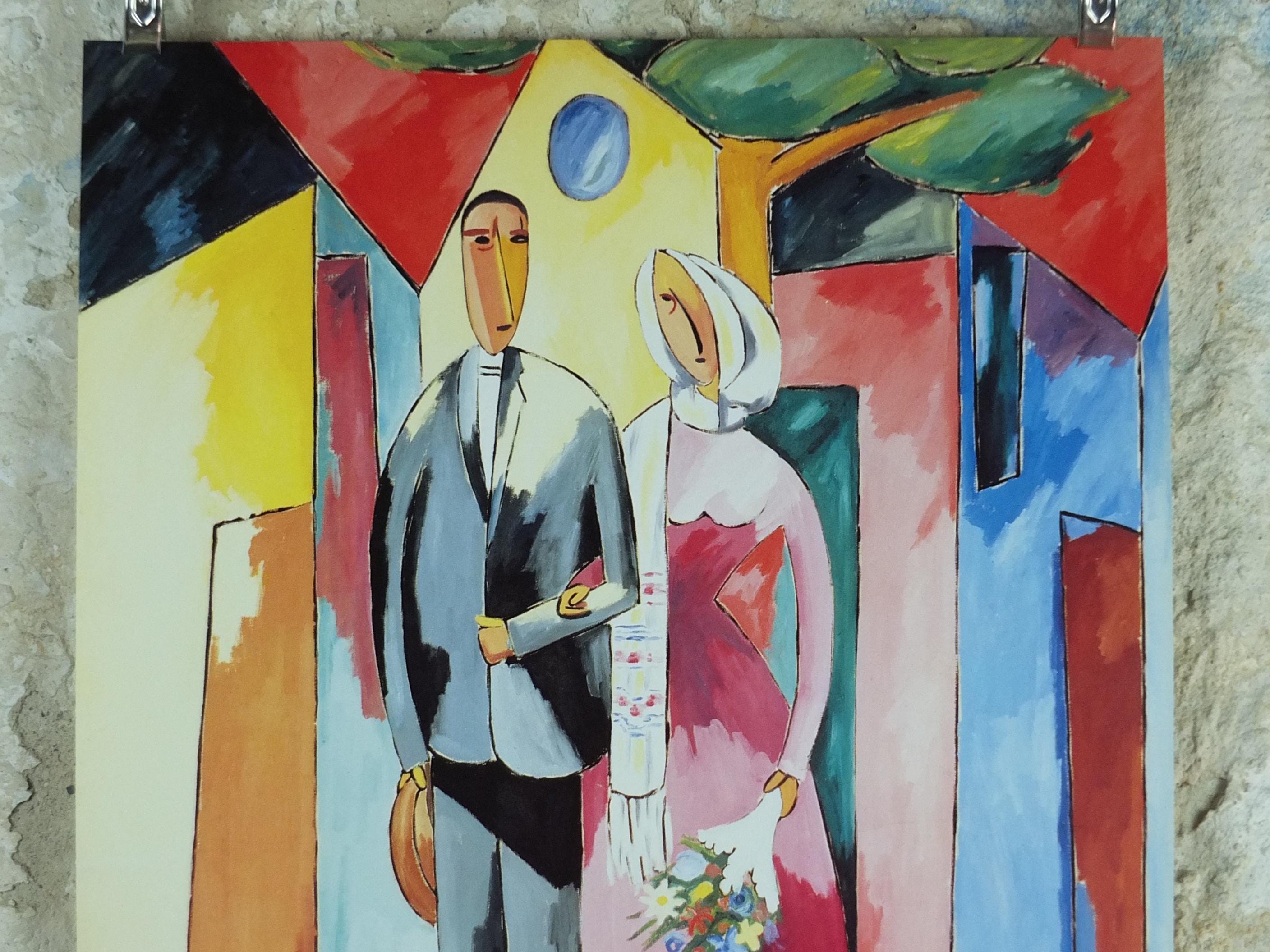 This original Alberto Magnelli exhibition poster is from Galerie Lelong in the Grand Palais in Paris for a 1988 exhibition. it shows a newly married young couple "hovering" against a wall of light.