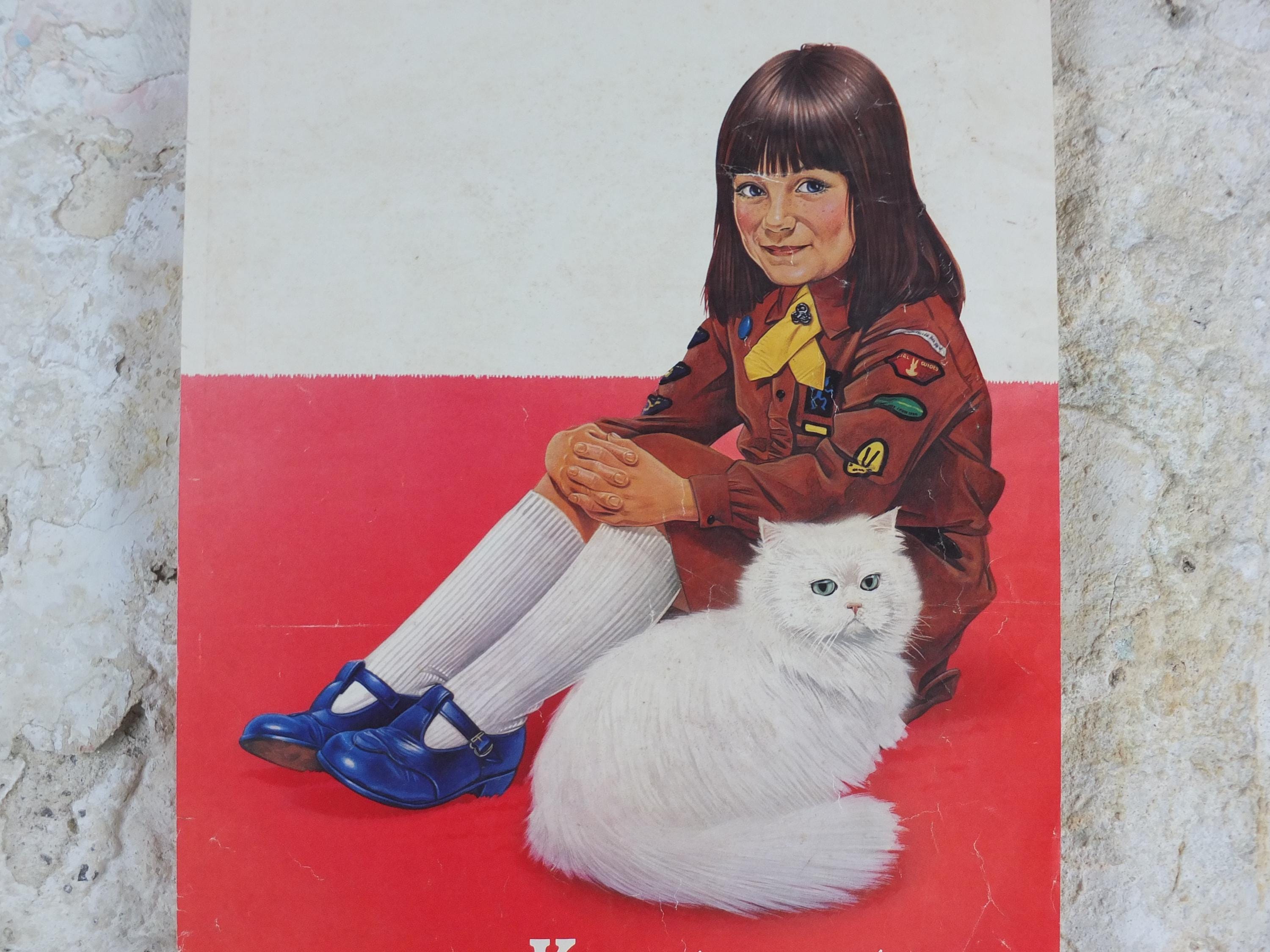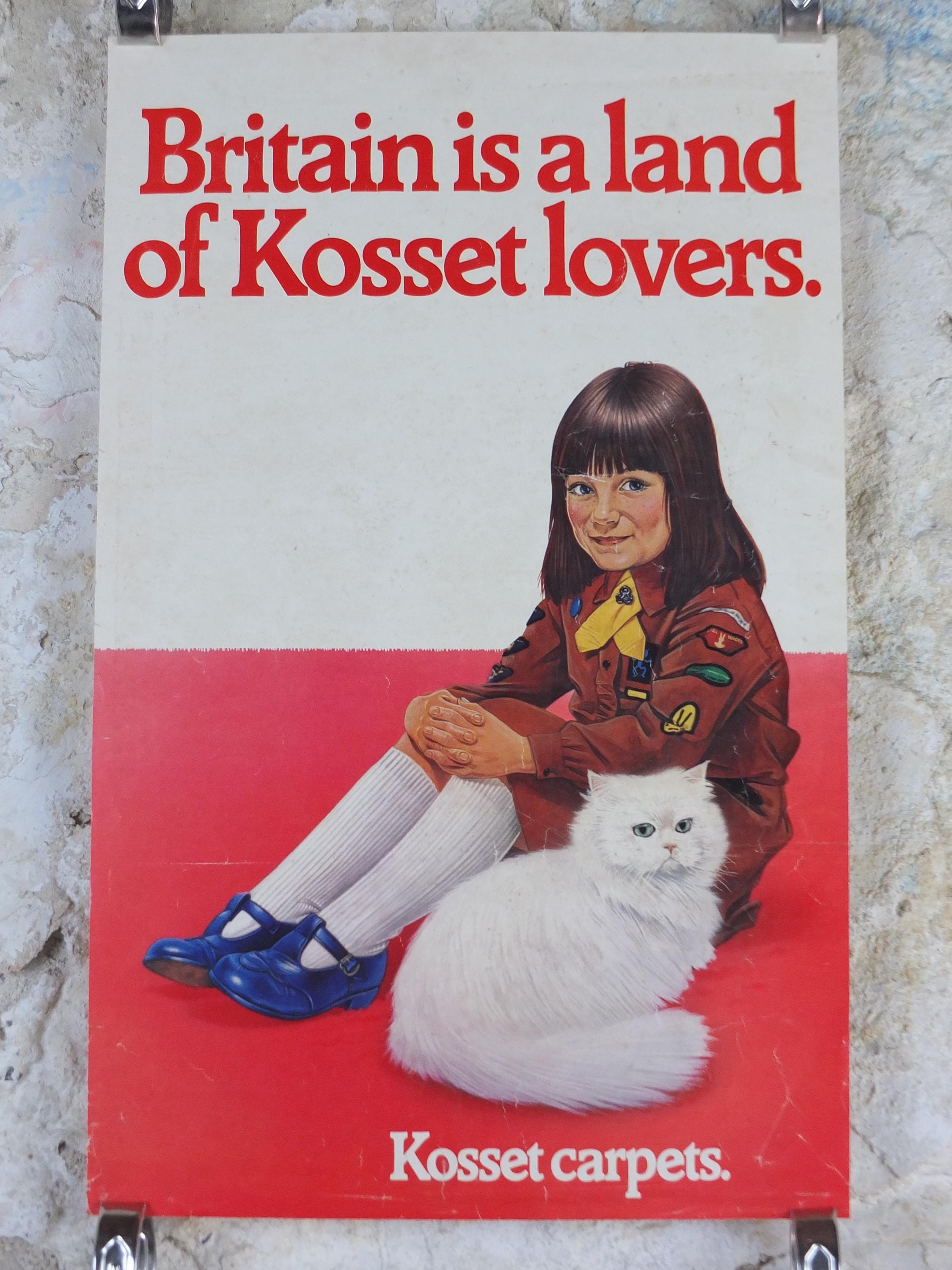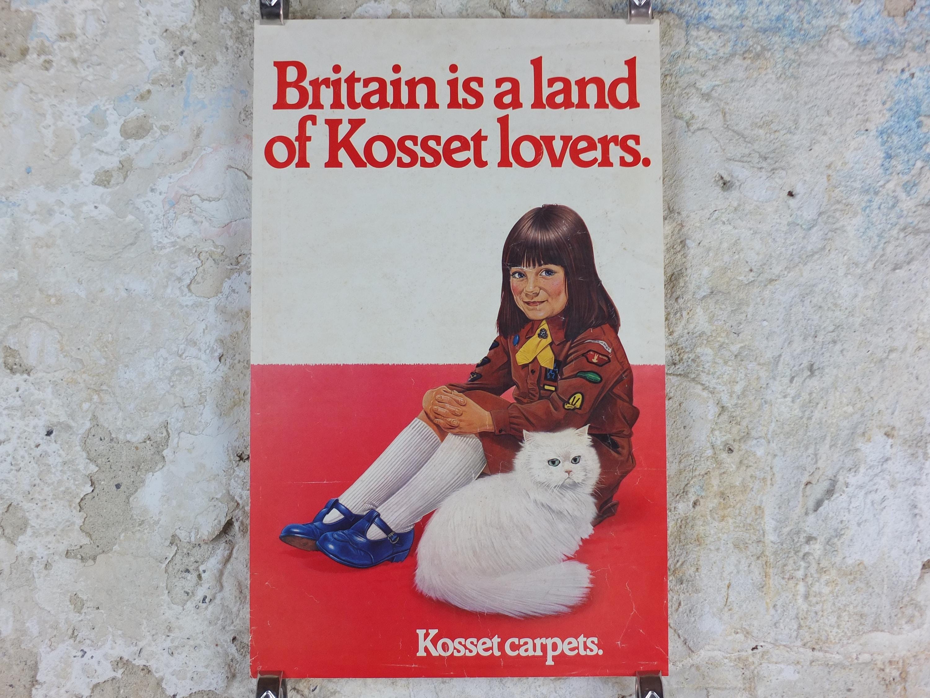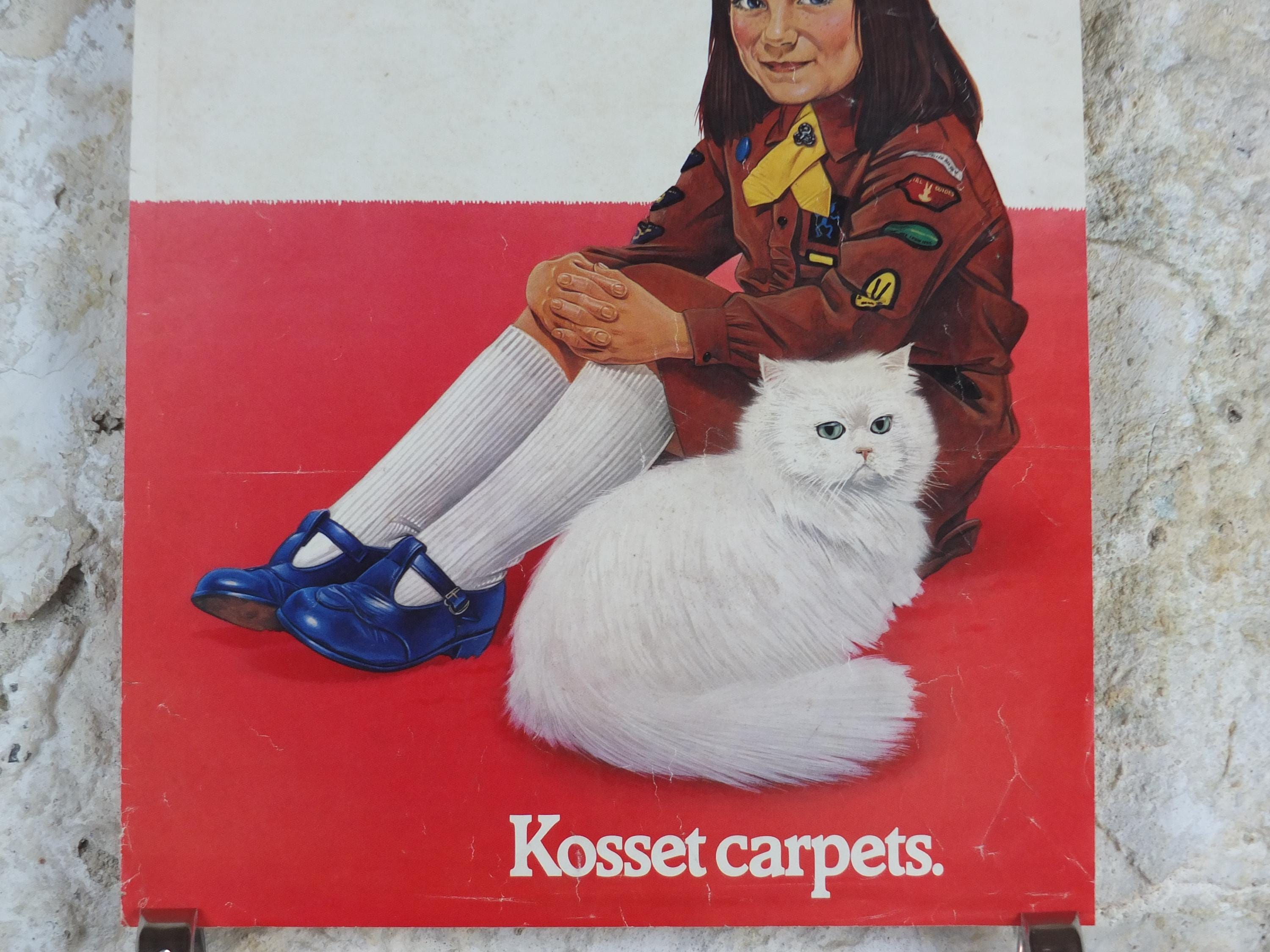 A 1970s advertising poster for Kosset Carpets, showing an image of a beautiful Persian cat next to a girl in a brown scouting uniform. Very 70s.