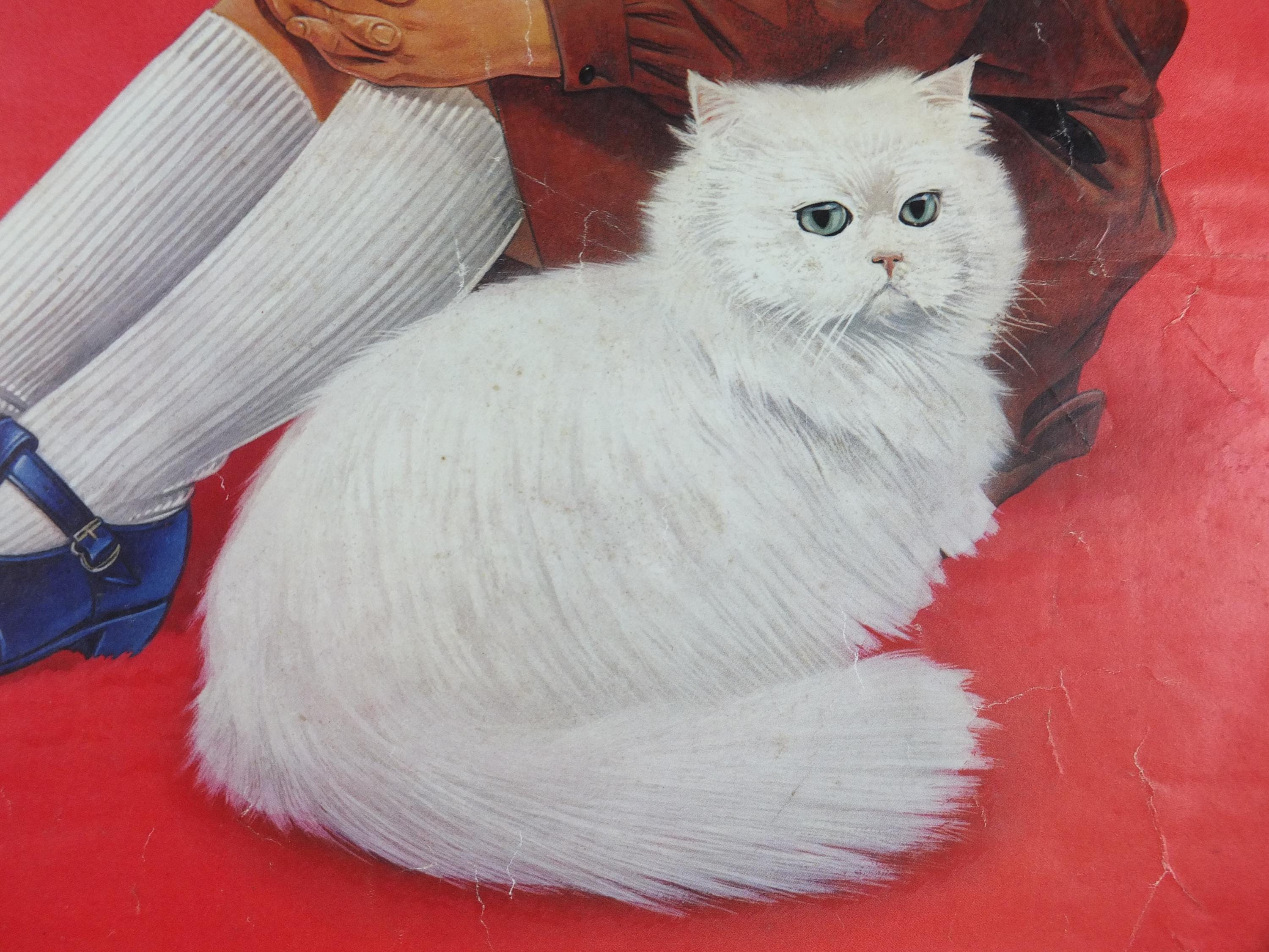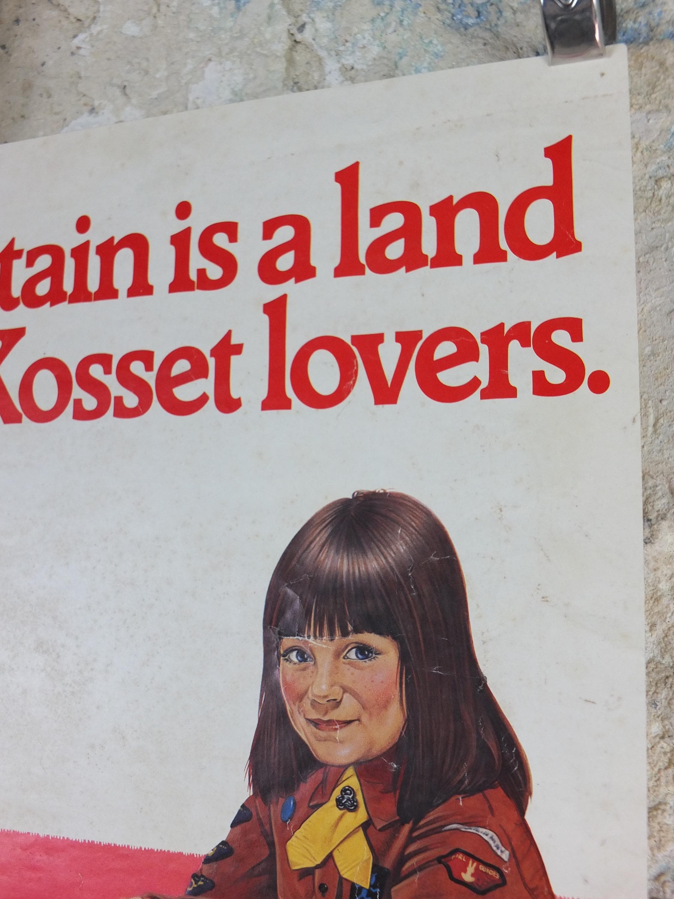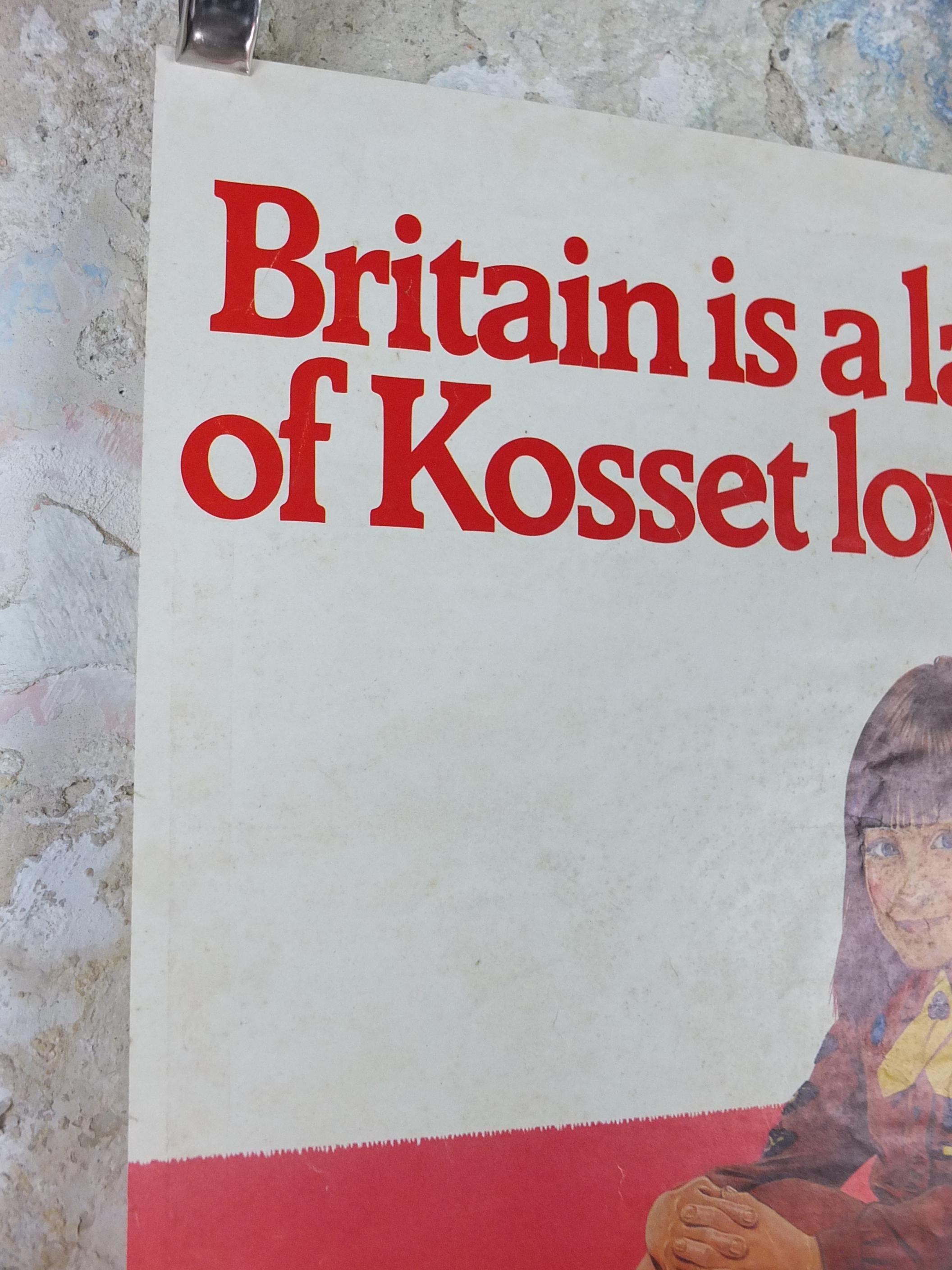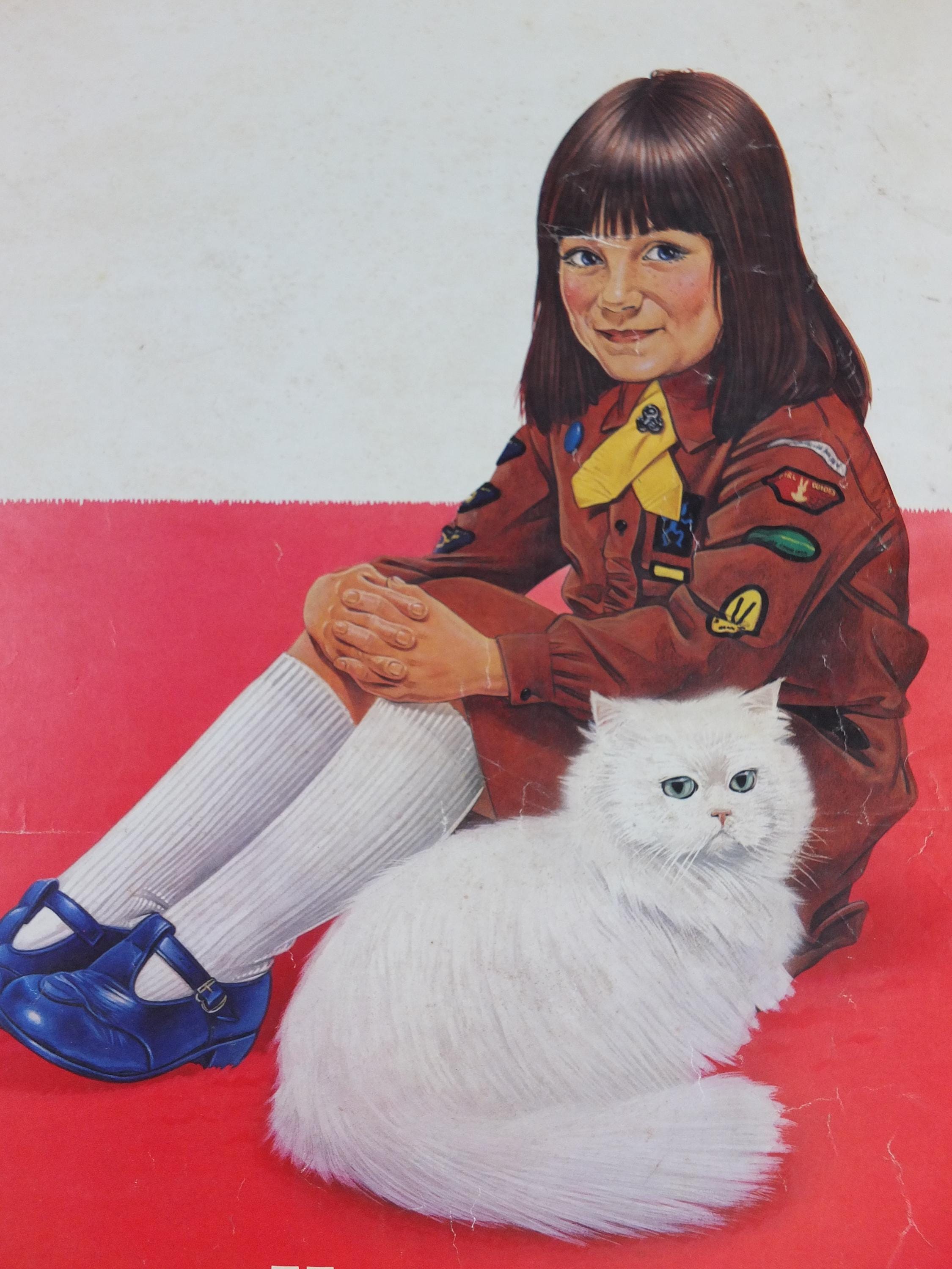 A 1970s advertising poster for Kosset Carpets, showing an image of a beautiful Persian cat next to a girl in a brown scouting uniform. Very 70s.