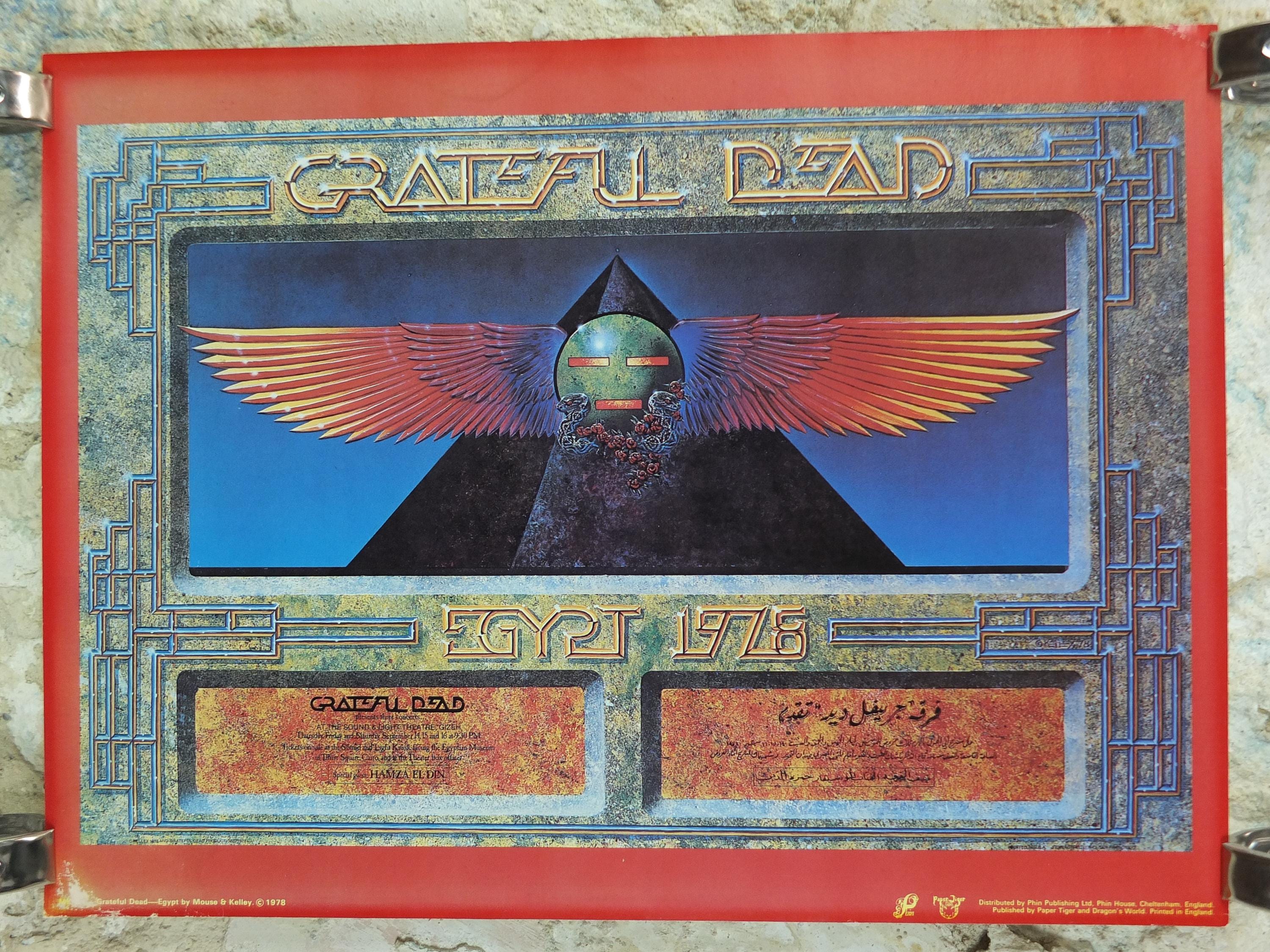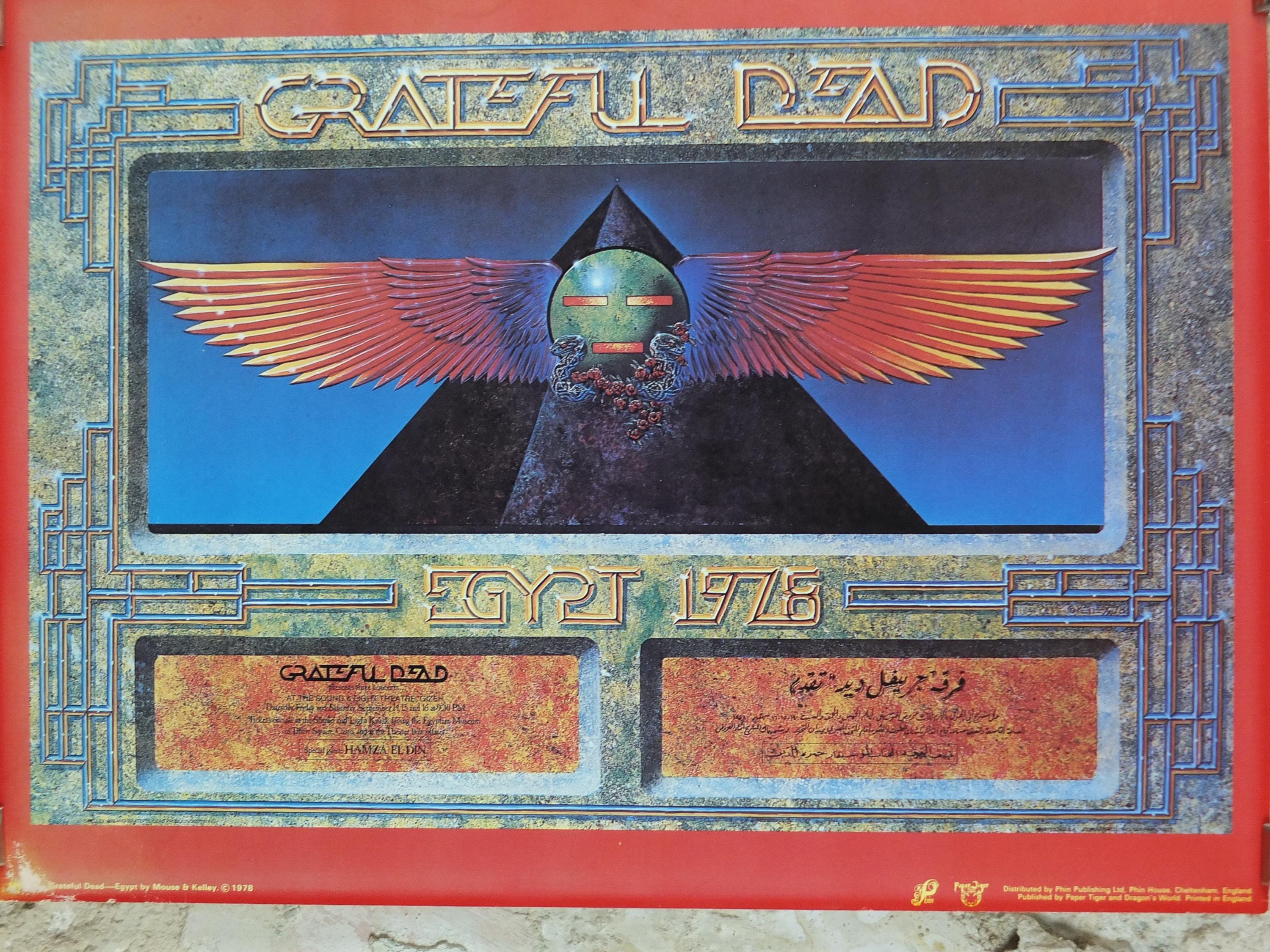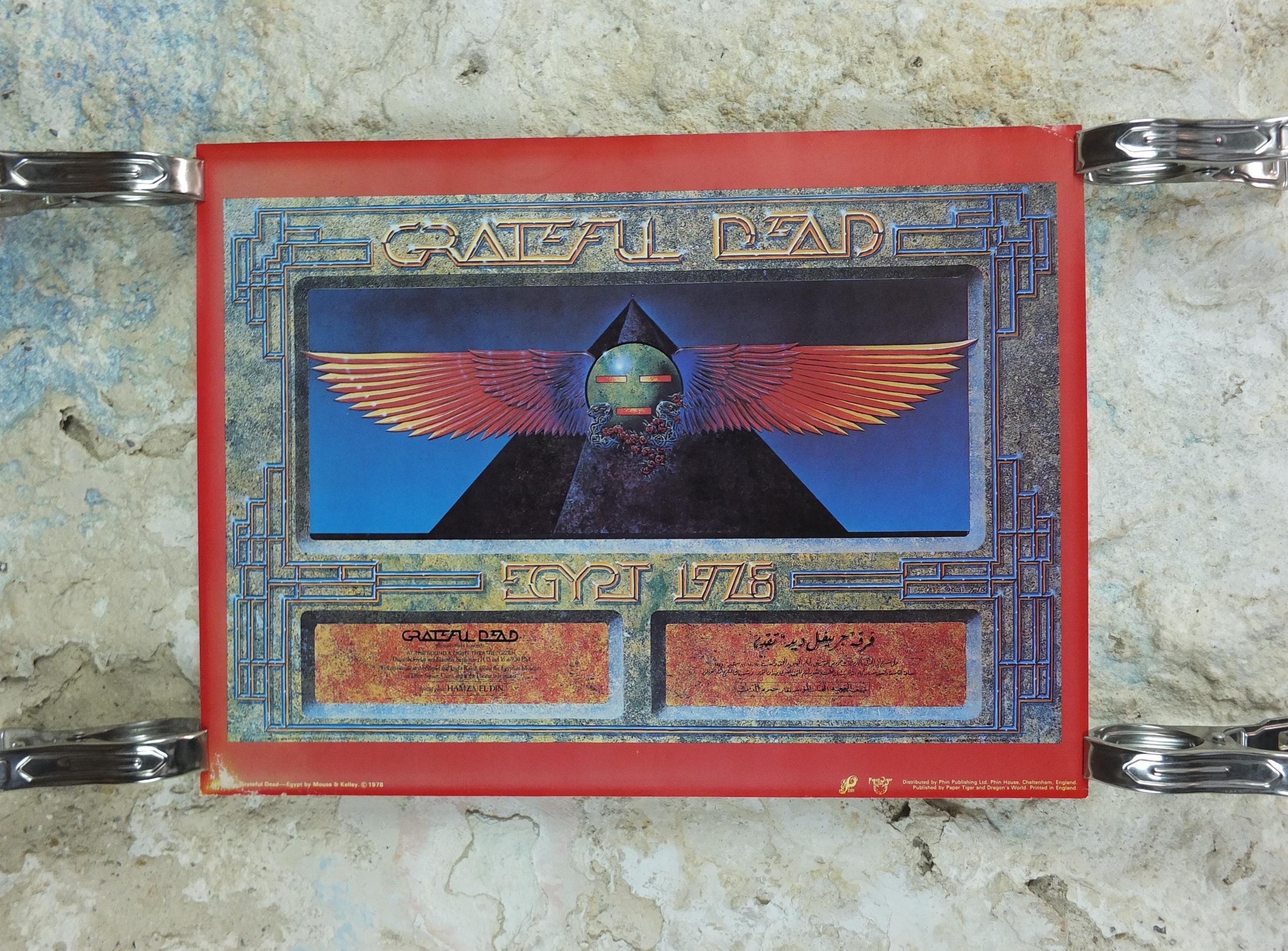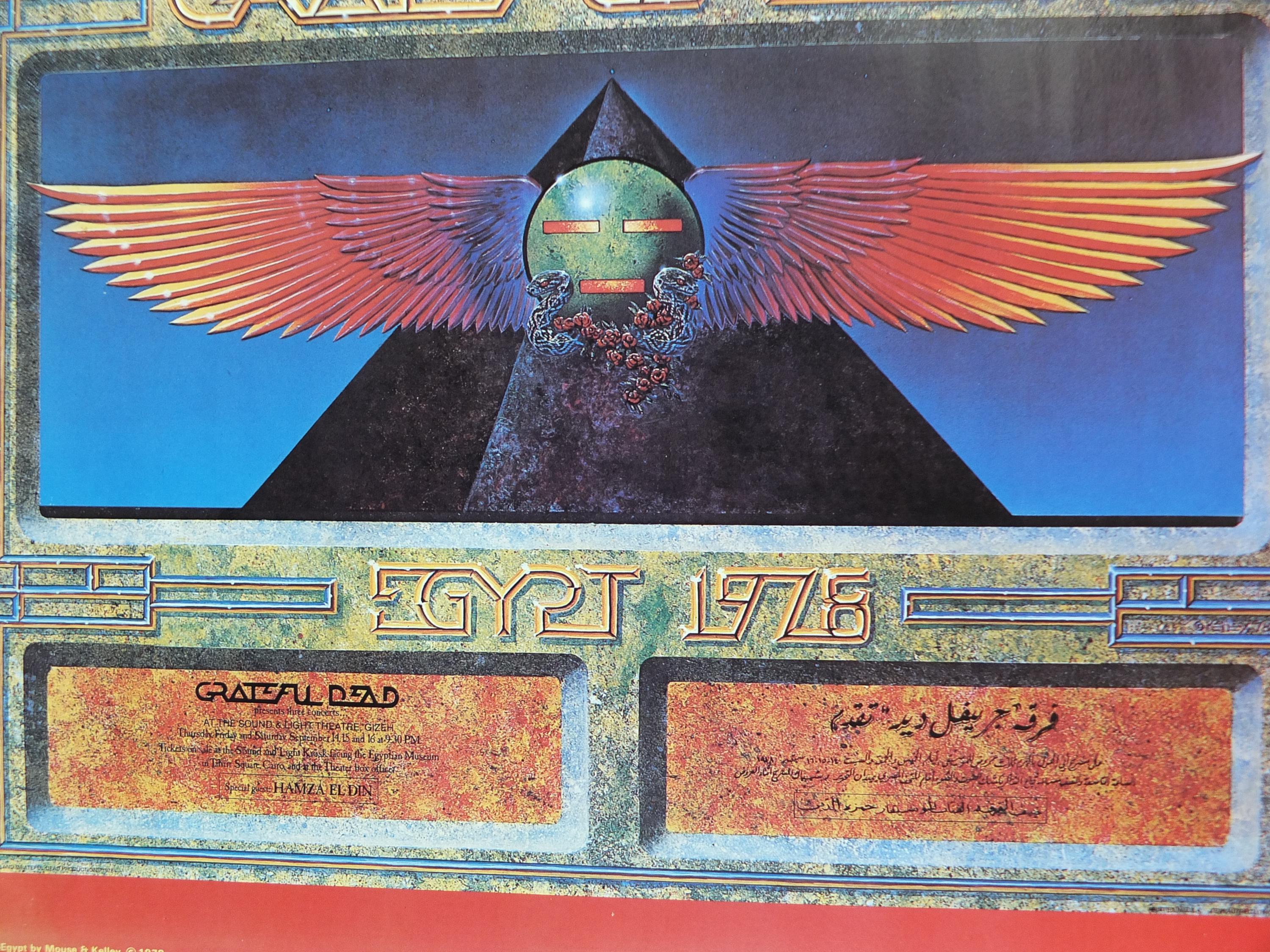This is a 1978 poster of the Grateful Dead and their Egypt Tour they performed under the pyramids in 1978. The design on the poster is a blend of their signature style and Ancient Egyptian motifs, featuring a stylized winged sun disc and a pyramid with an eye.