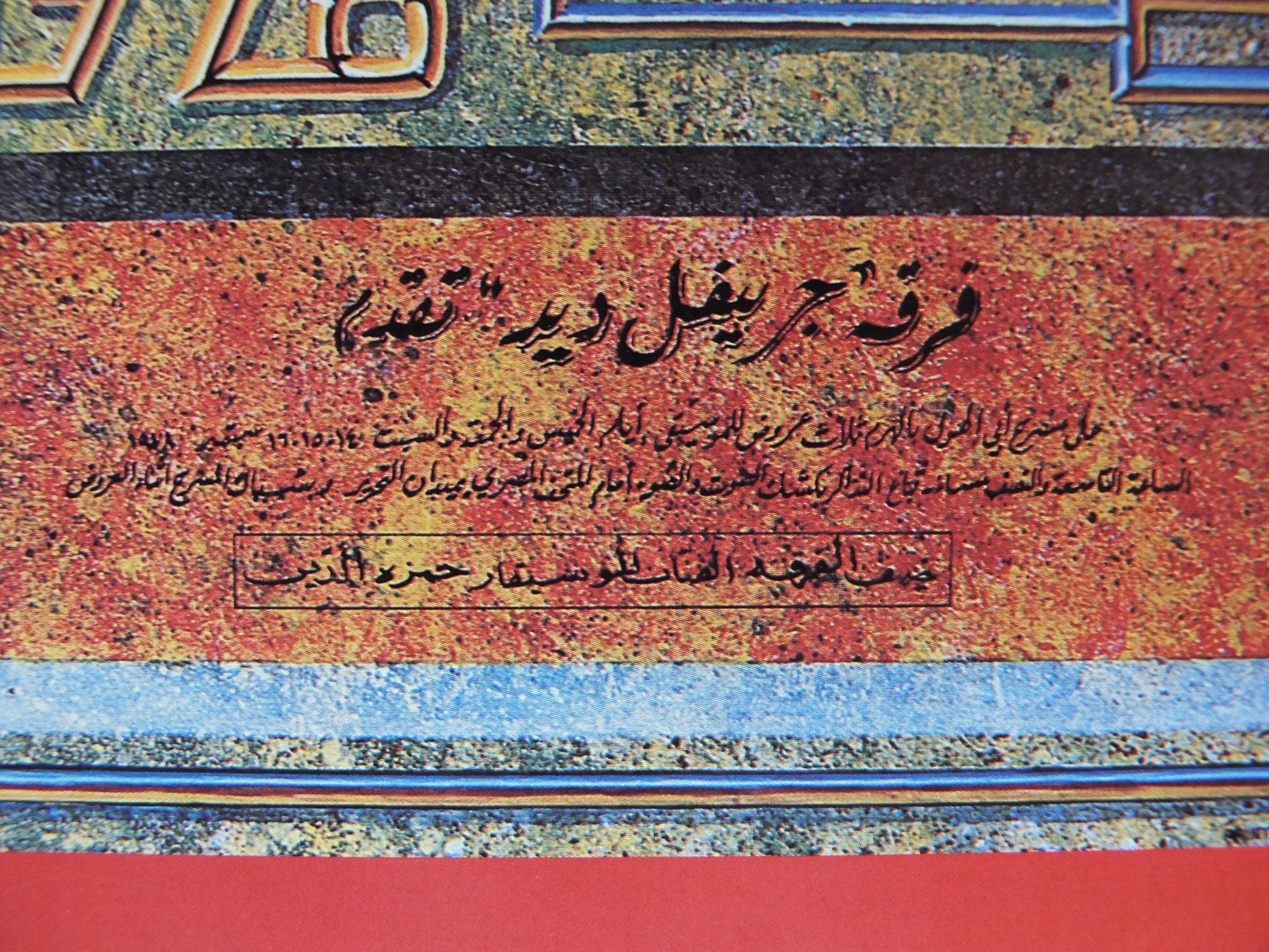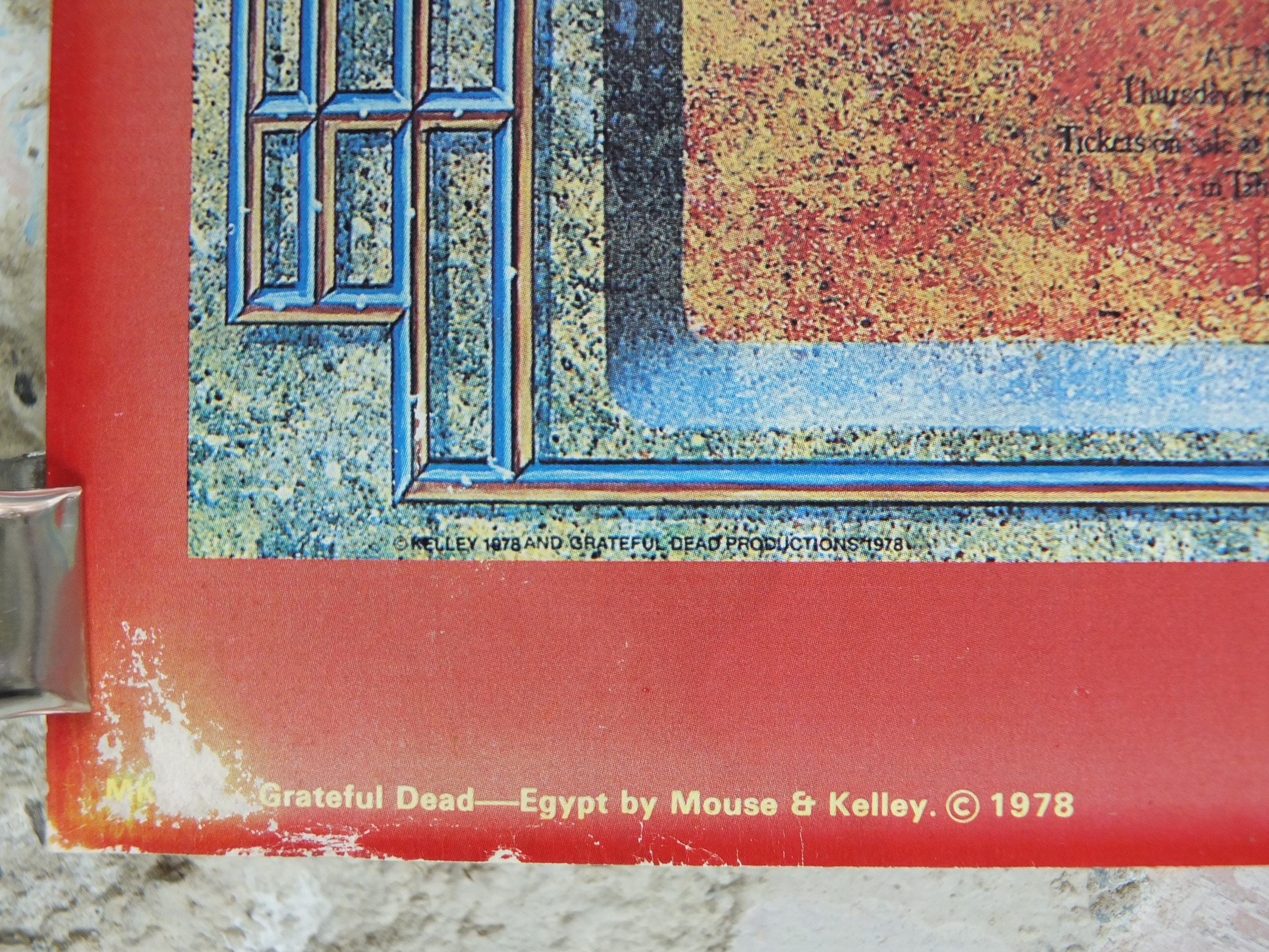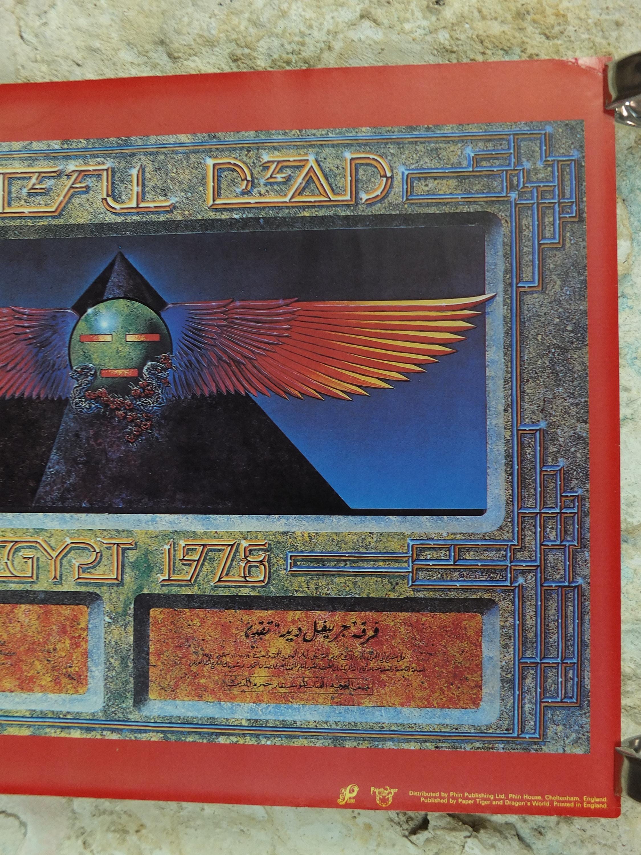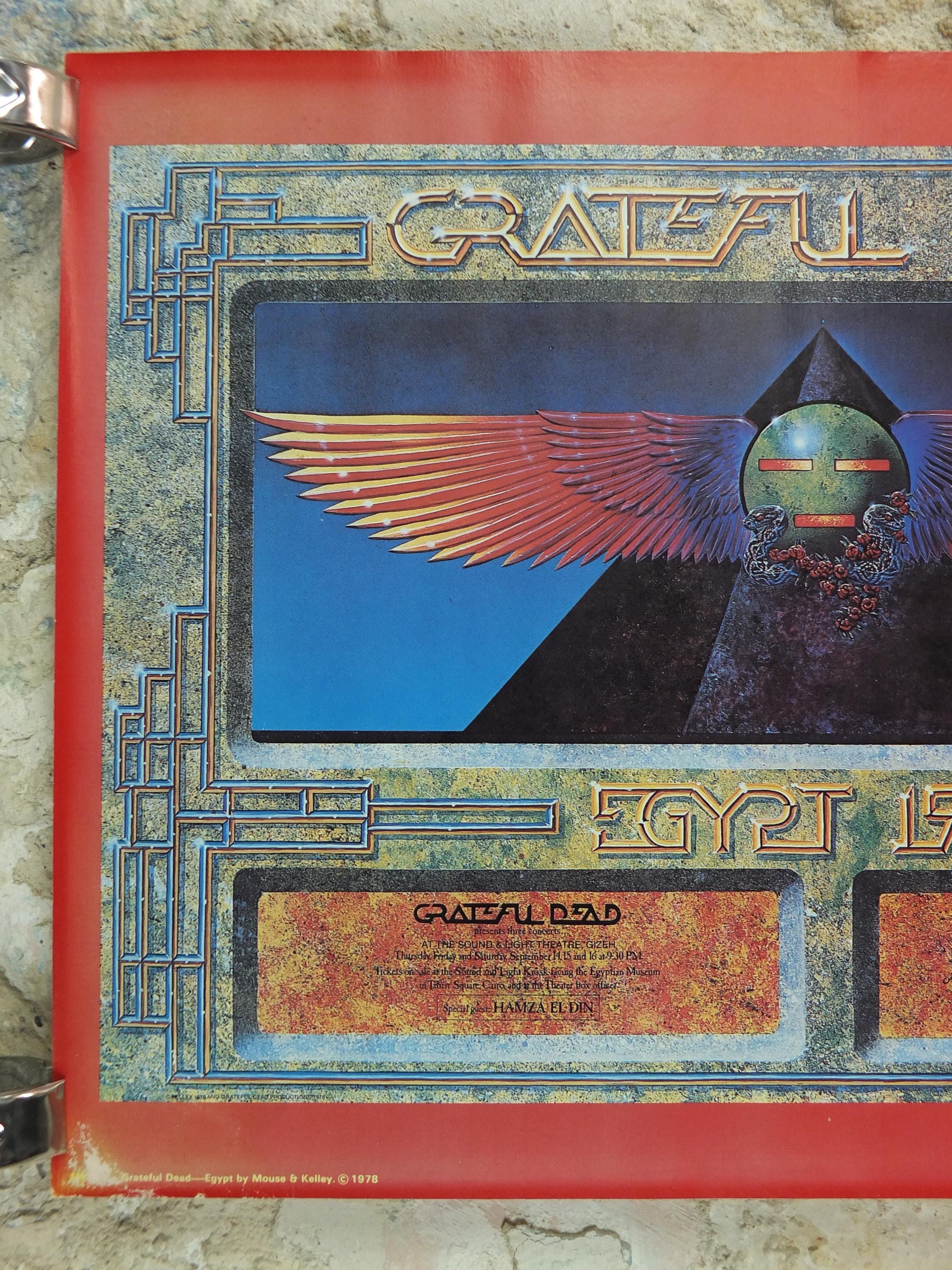 This is a 1978 poster of the Grateful Dead and their Egypt Tour they performed under the pyramids in 1978. The design on the poster is a blend of their signature style and Ancient Egyptian motifs, featuring a stylized winged sun disc and a pyramid with an eye.