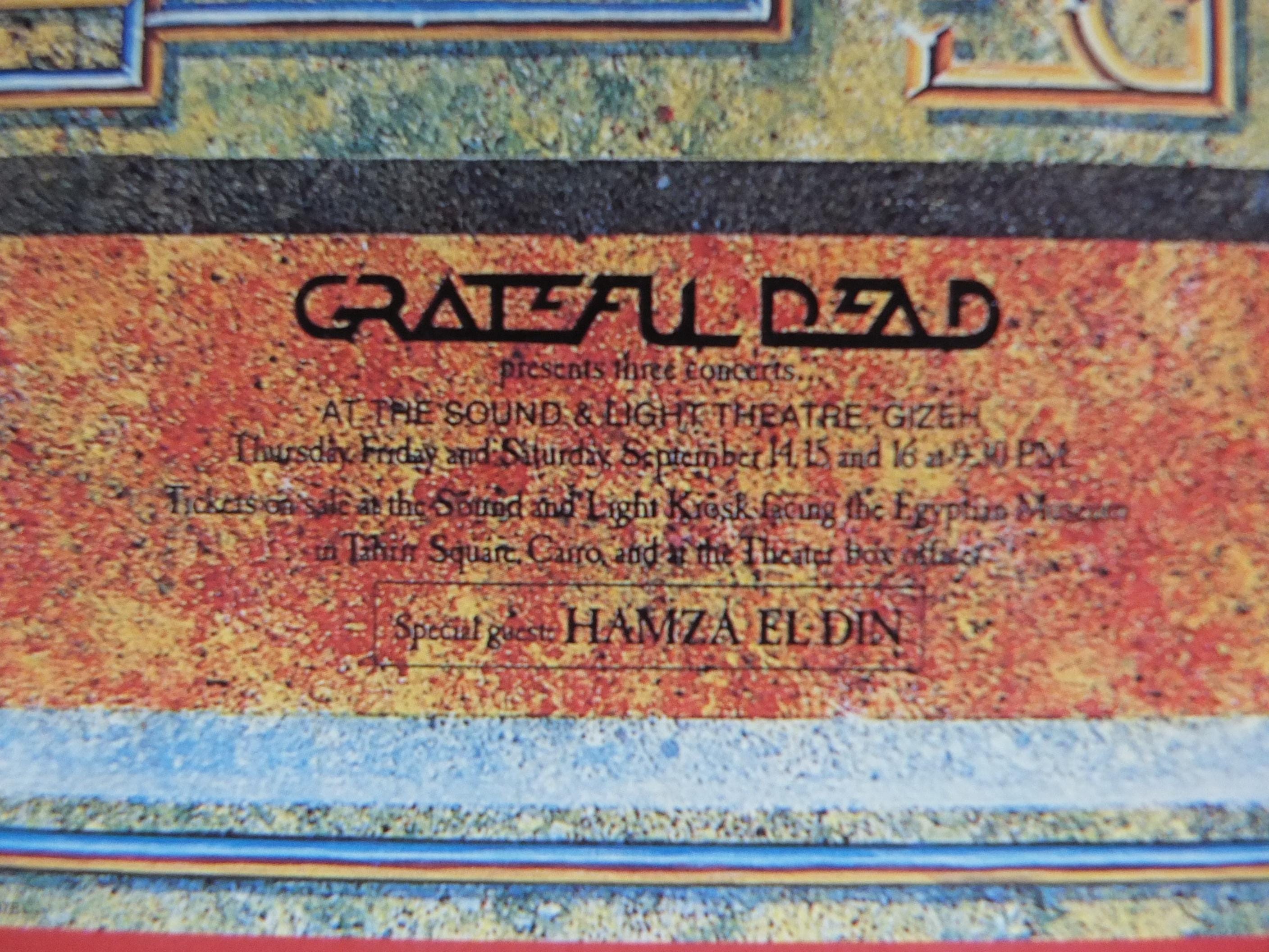 A poster for the Grateful Dead's legendary concerts in Egypt in 1978—an iconic event where they played in the shadow of the Pyramids and the Sphinx. This artwork was created by the famous psychedelic art duo Stanley "Mouse" Miller and Alton Kelley, who were responsible for much of the Grateful Dead's most iconic imagery (including the "Skeleton and Roses" logo).