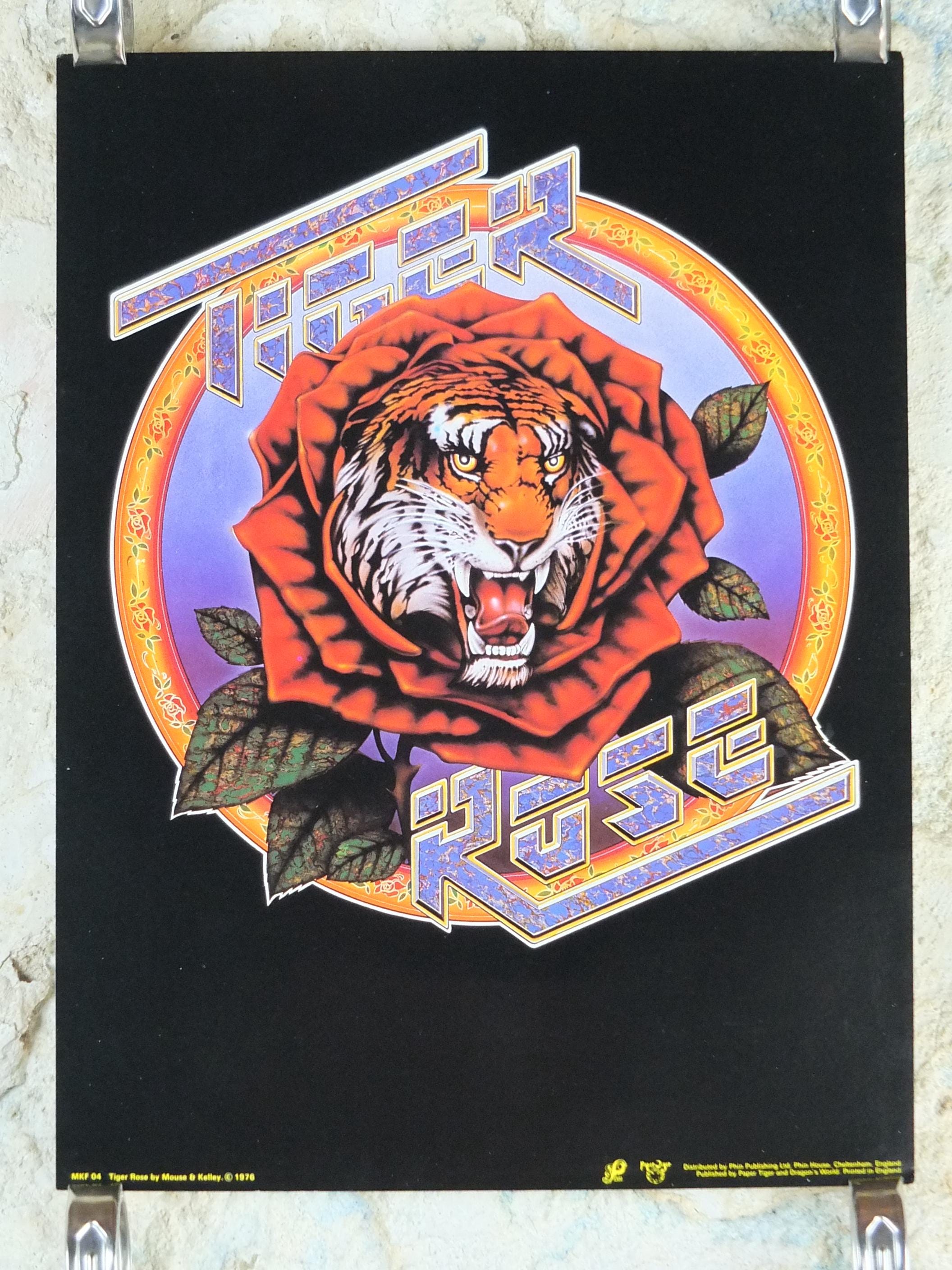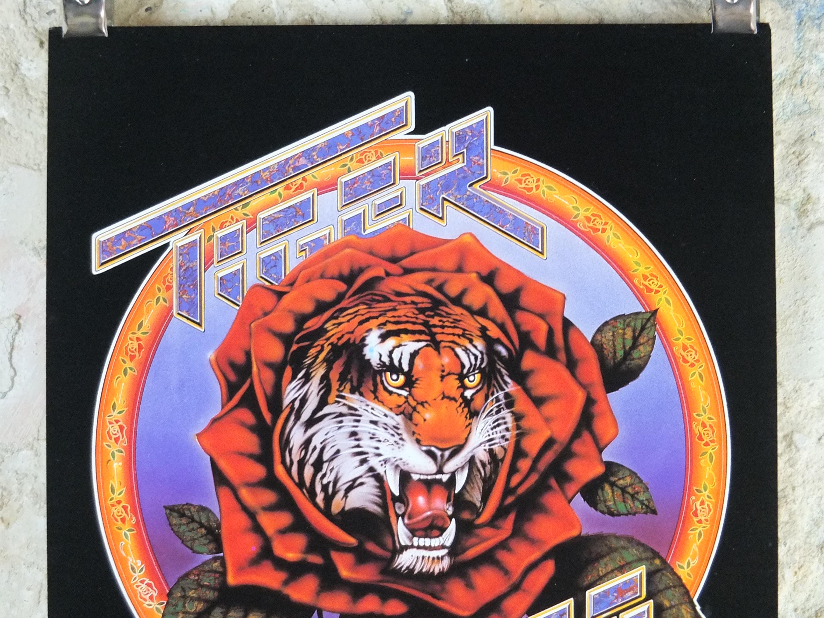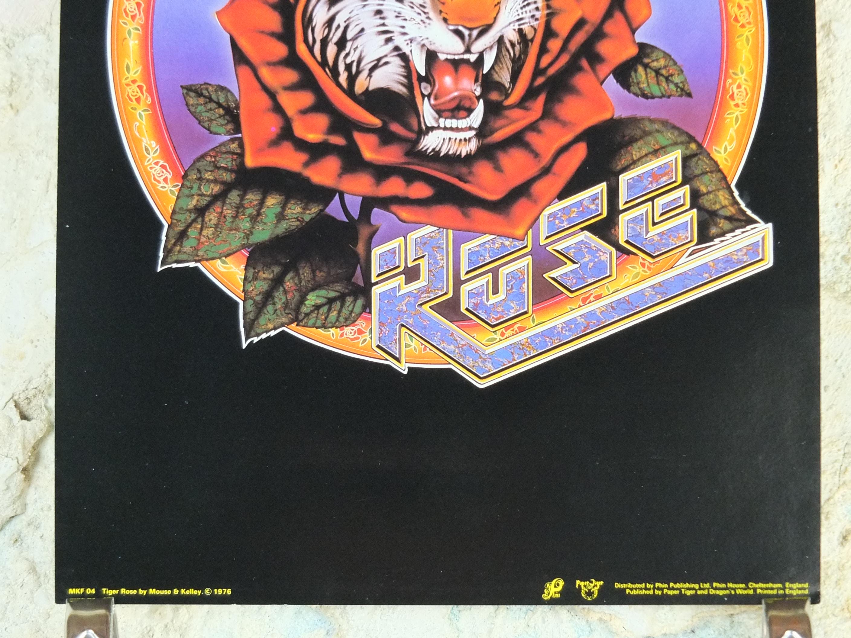 This is a 1976 poster of the Grateful Dead artists Jerry Garcia and Robert Unter. The "Tiger Rose" project is Robert Hunter's 1975 solo album. The album was produced by Jerry Garcia and featured contributions from Grateful Dead members, including Garcia and drummer Mickey Hart. The artwork was done by Kelley & Mouse, the same artists who created the famous Grateful Dead "Skull and Roses" logo.