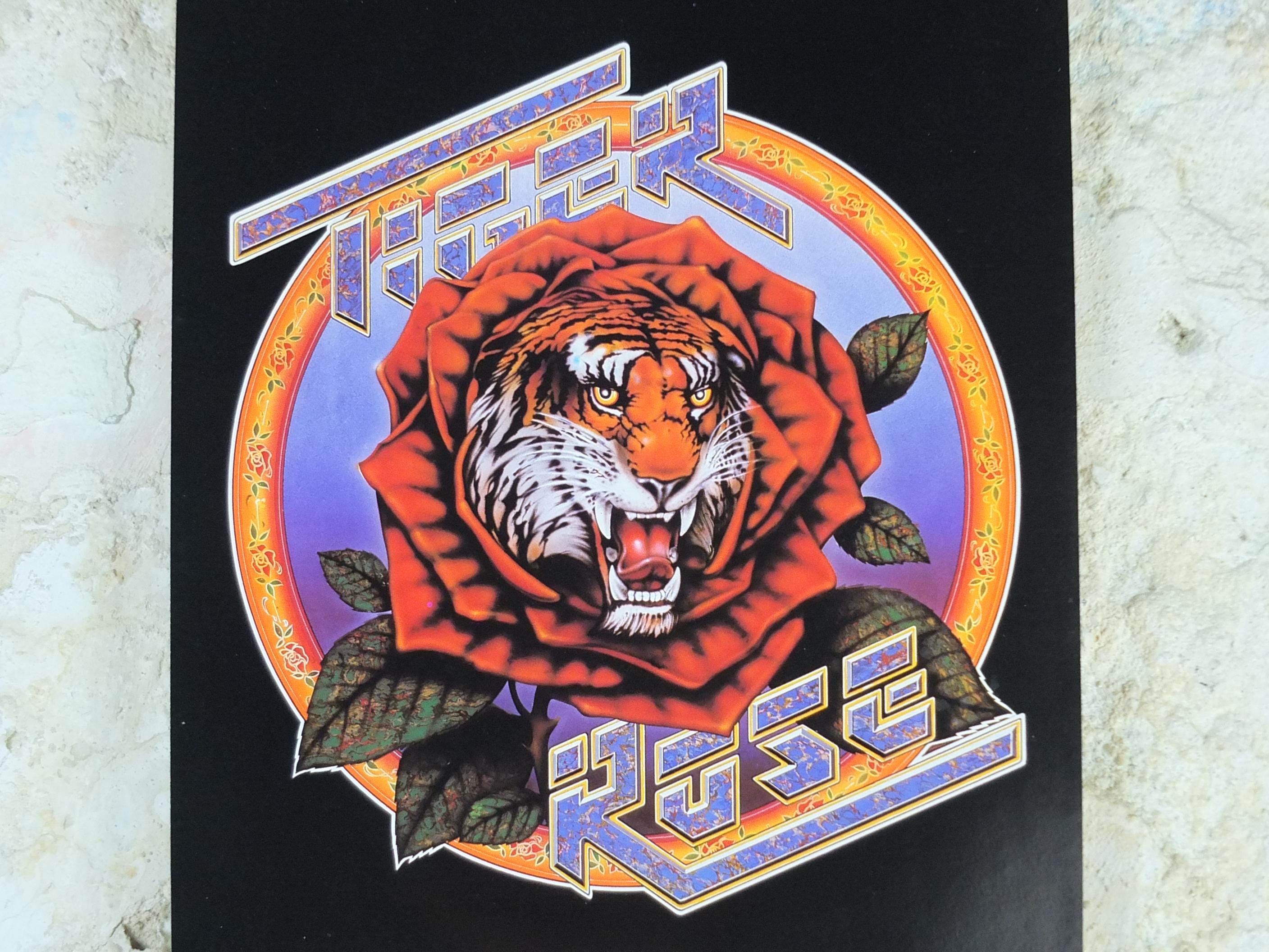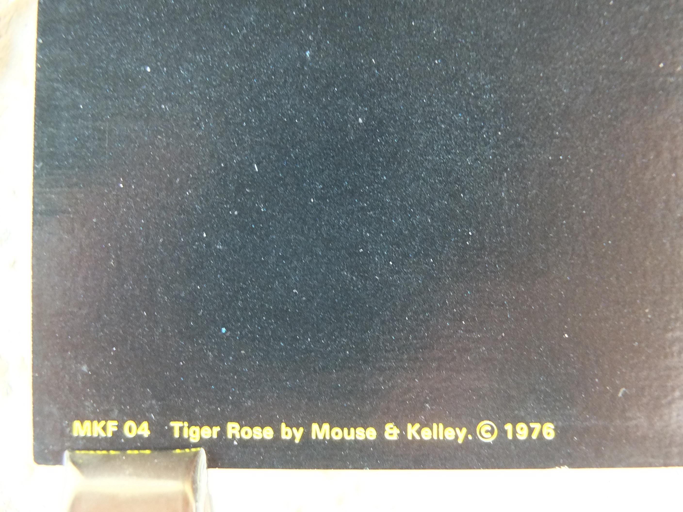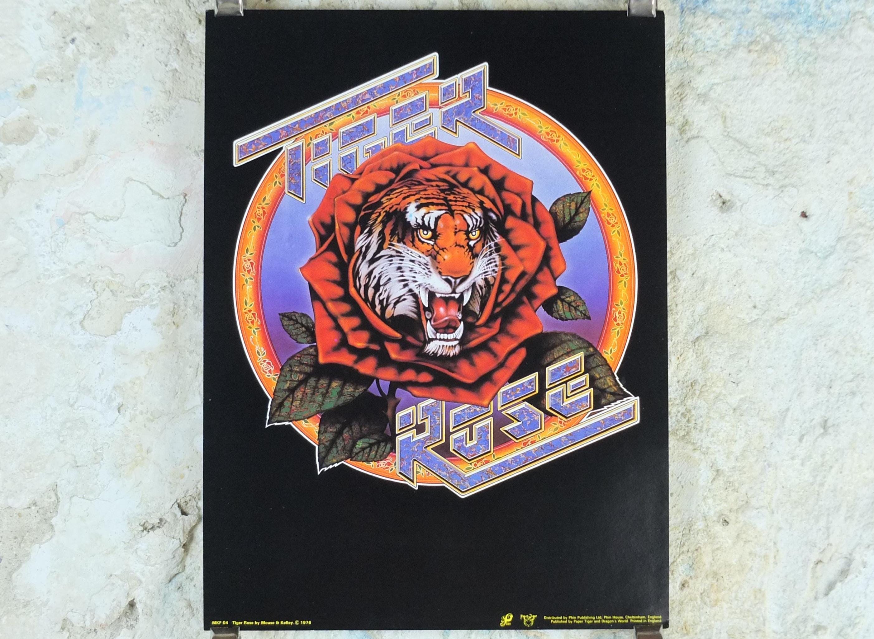 This is a 1976 poster of the Grateful Dead artists Jerry Garcia and Robert Unter. The "Tiger Rose" project is Robert Hunter's 1975 solo album. The album was produced by Jerry Garcia and featured contributions from Grateful Dead members, including Garcia and drummer Mickey Hart. The artwork was done by Kelley & Mouse, the same artists who created the famous Grateful Dead "Skull and Roses" logo.