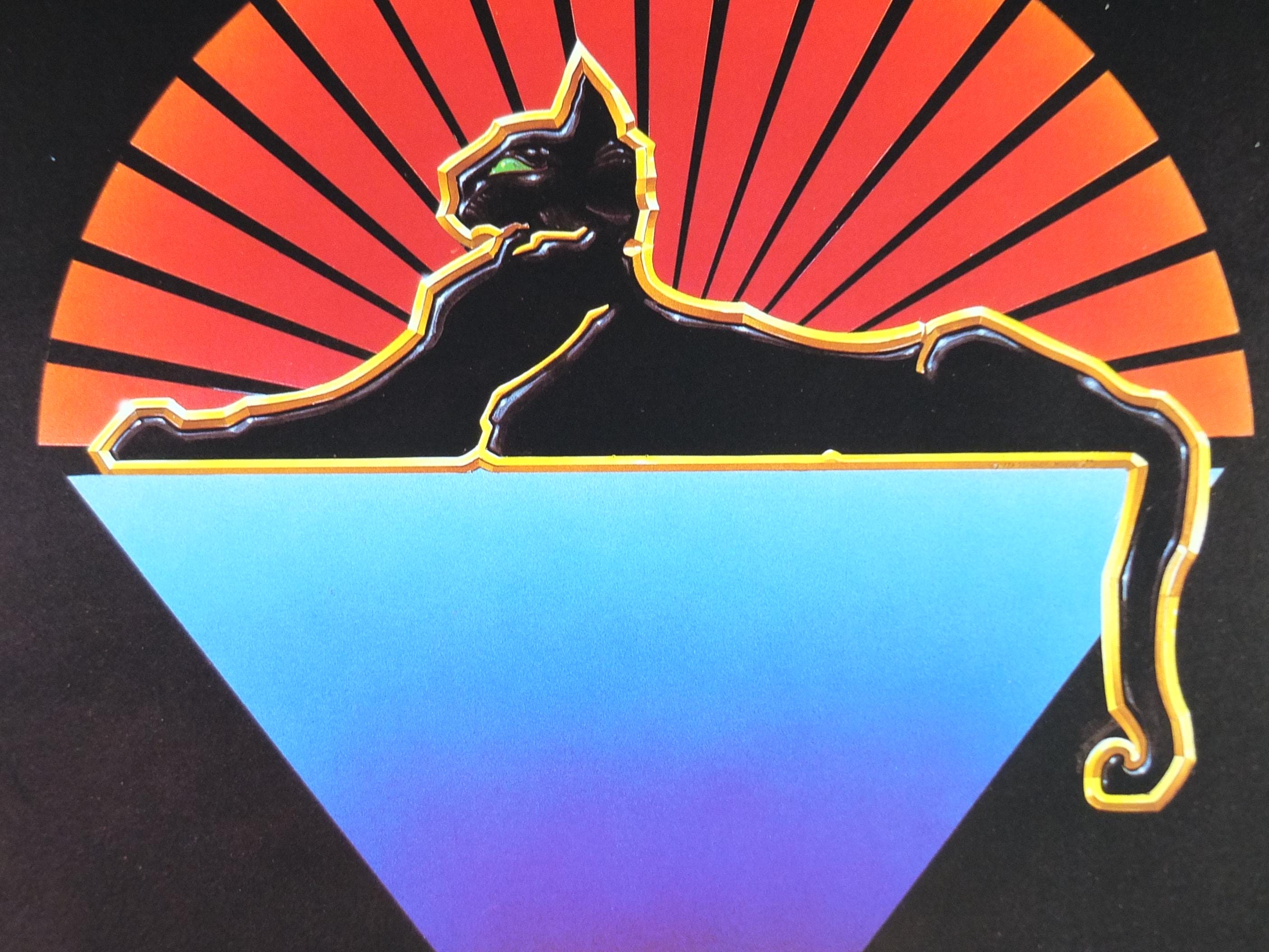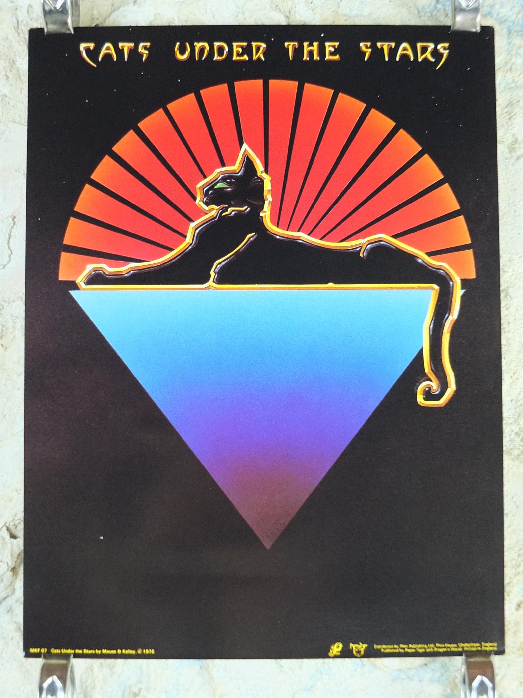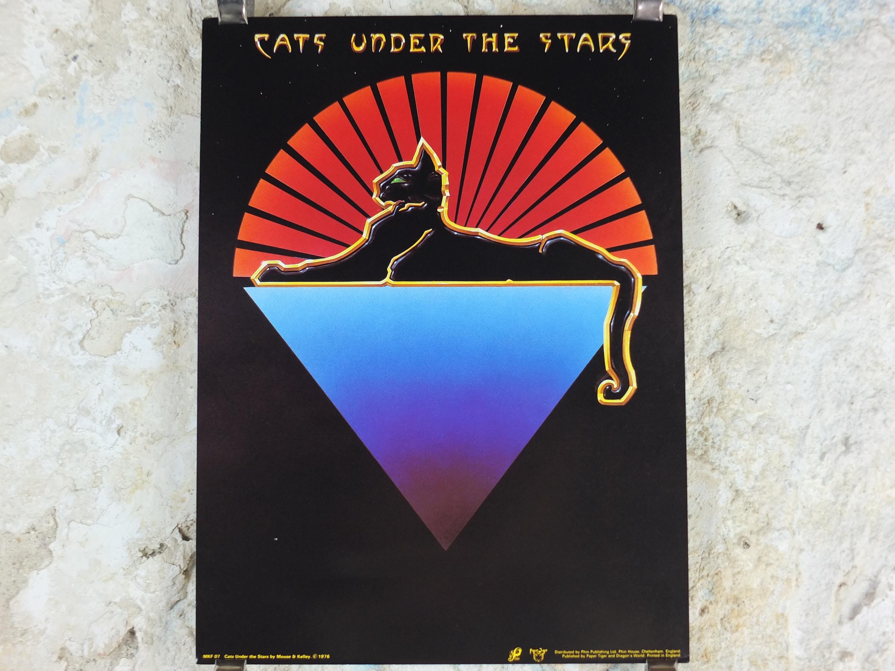 This is a 1976 poster of the Jerry Garcia Band album "Cats under the Stars". Jerry Garcia of the Grateful Dead. It features a striking, stylized black cat silhouetted against a vibrant, radiating orange and red sunset/sunburst that emerges from a large, glowing blue and purple geometric triangle.