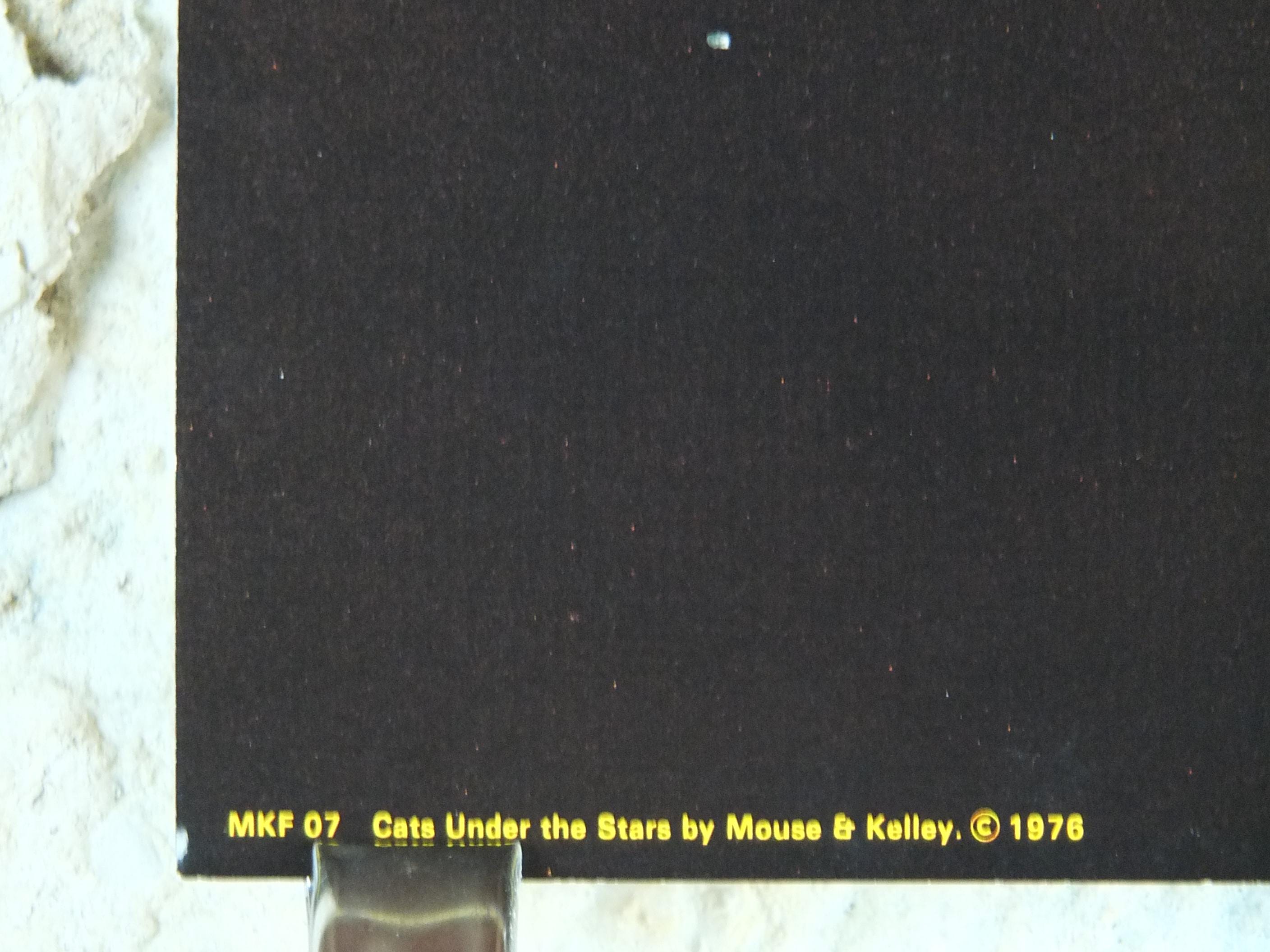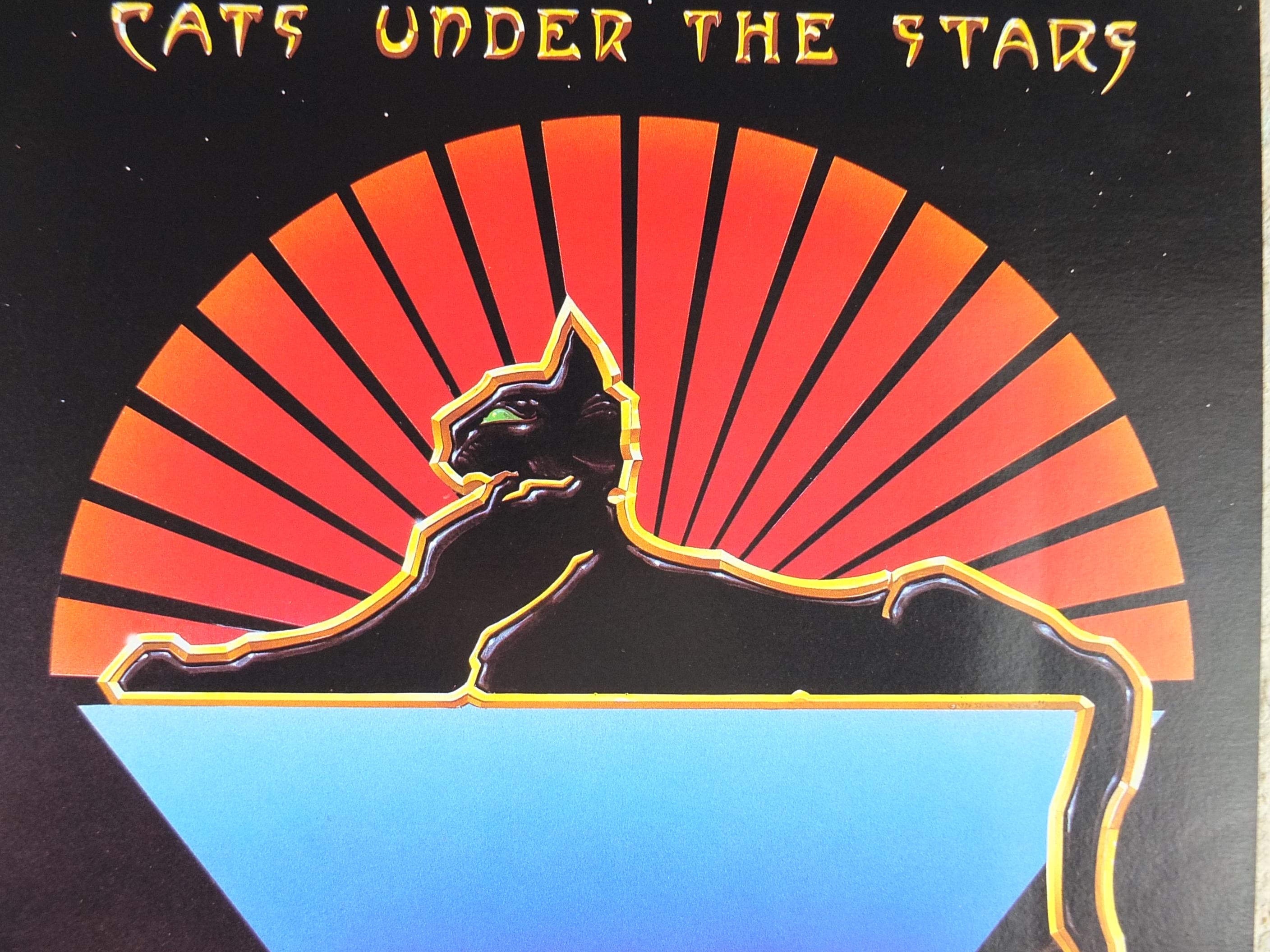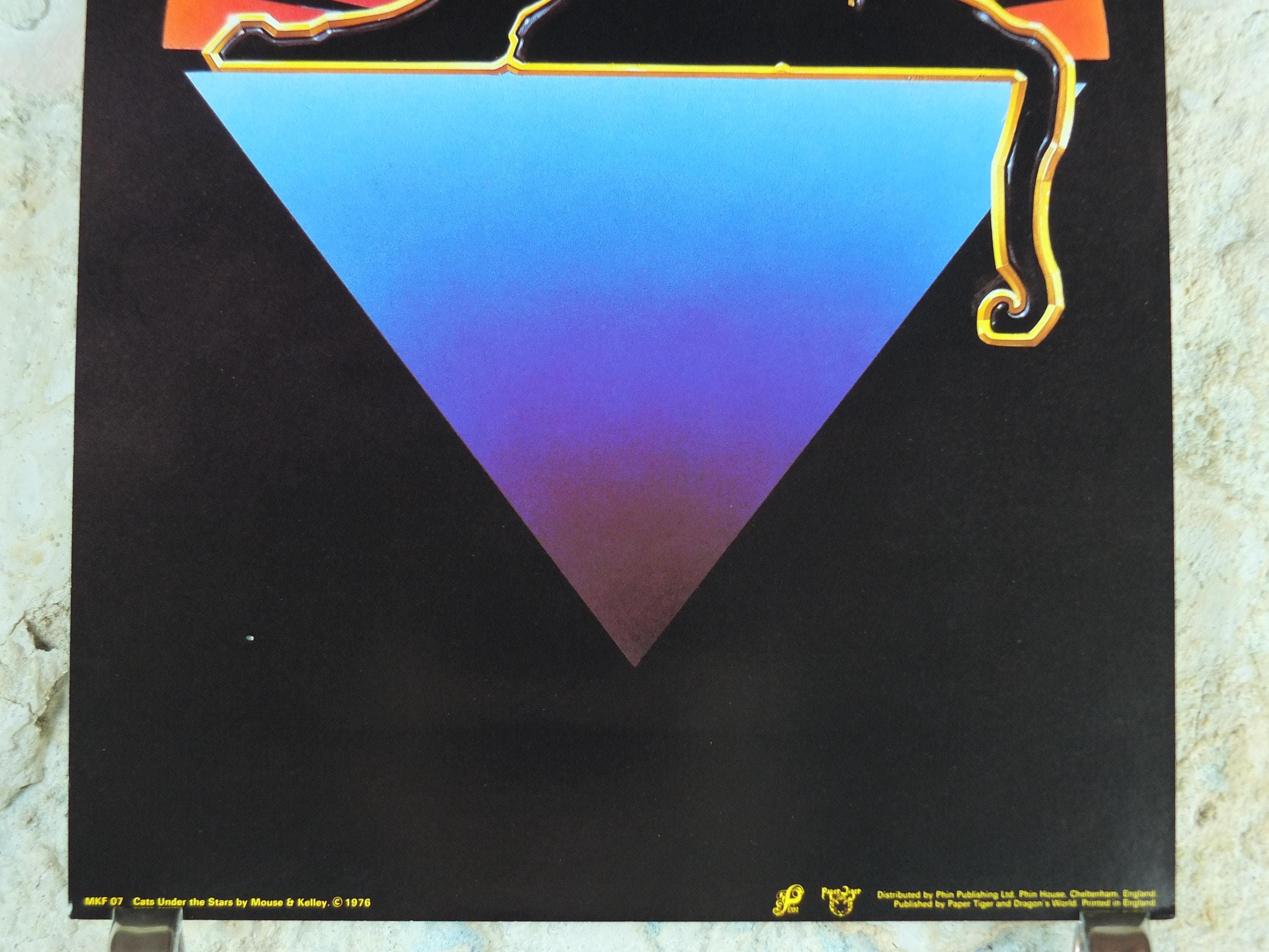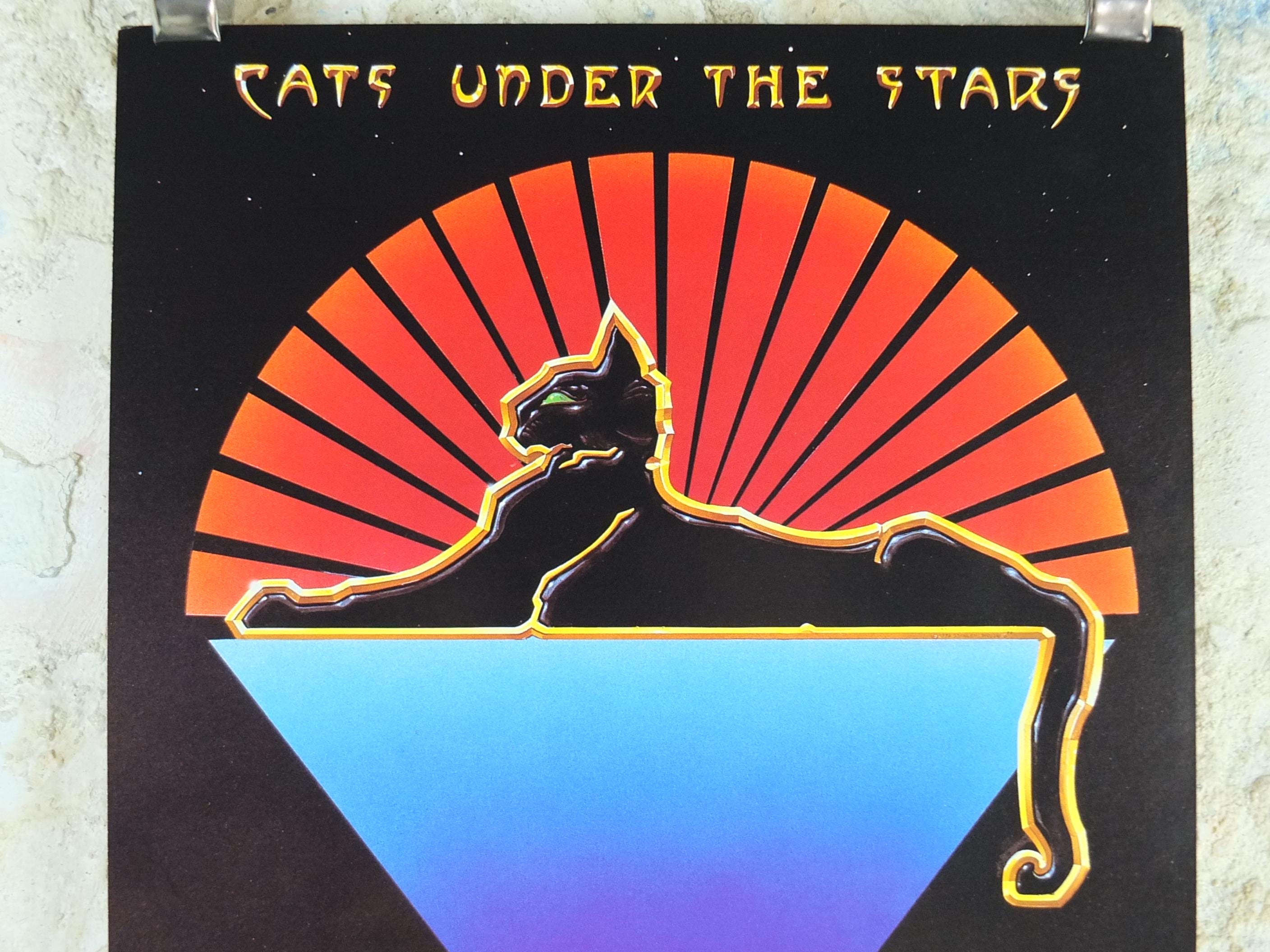 This is a 1976 poster of the Jerry Garcia Band album "Cats under the Stars". Jerry Garcia of the Grateful Dead. It features a striking, stylized black cat silhouetted against a vibrant, radiating orange and red sunset/sunburst that emerges from a large, glowing blue and purple geometric triangle.