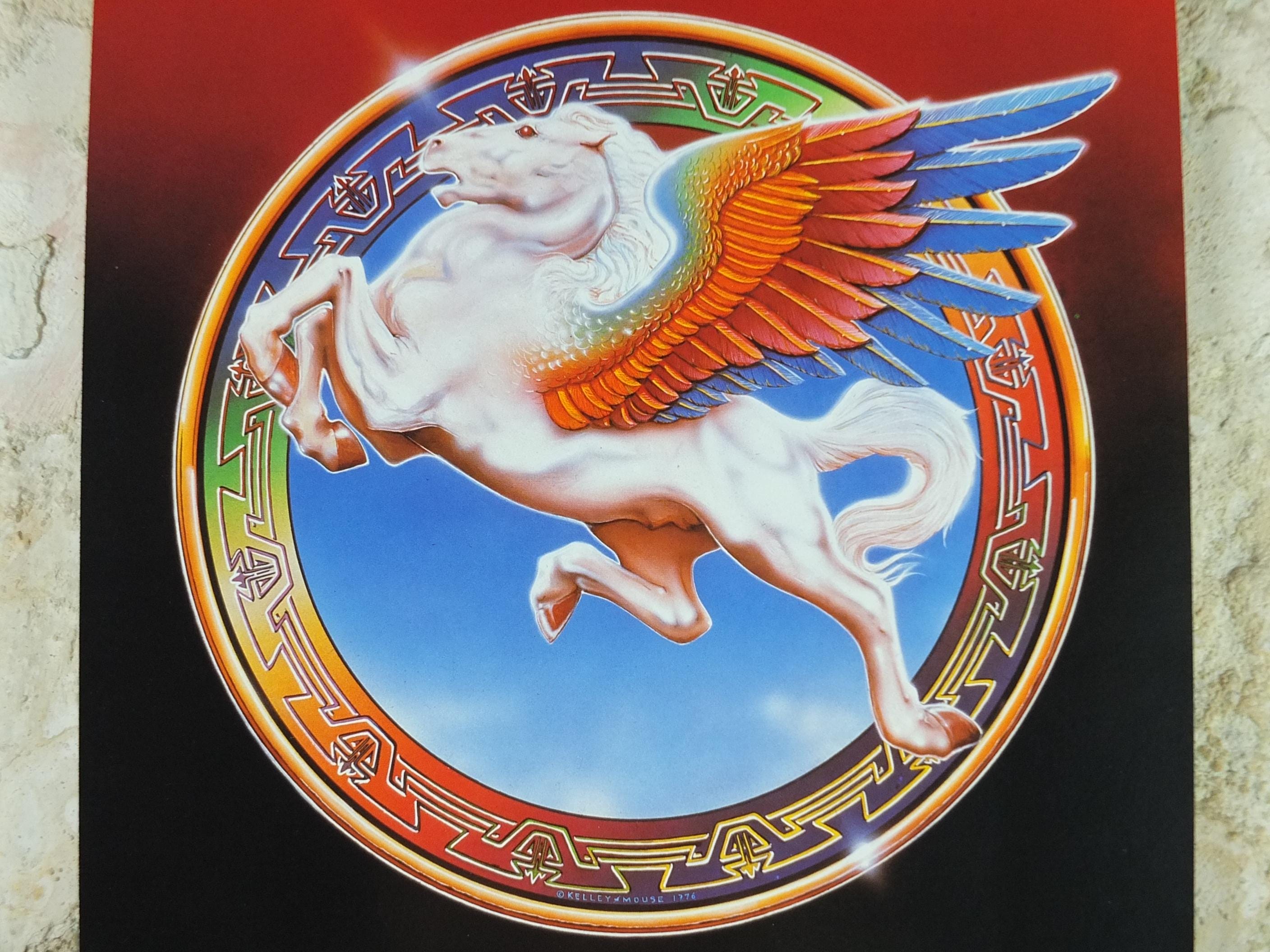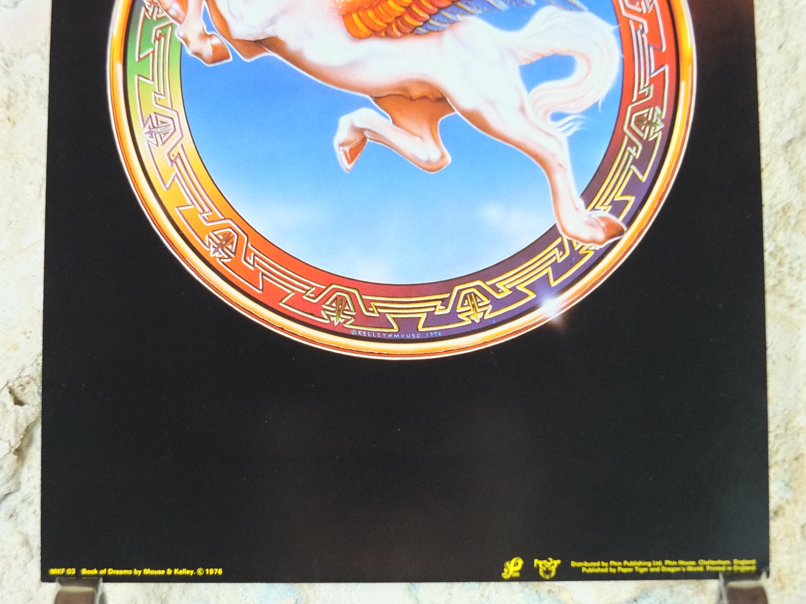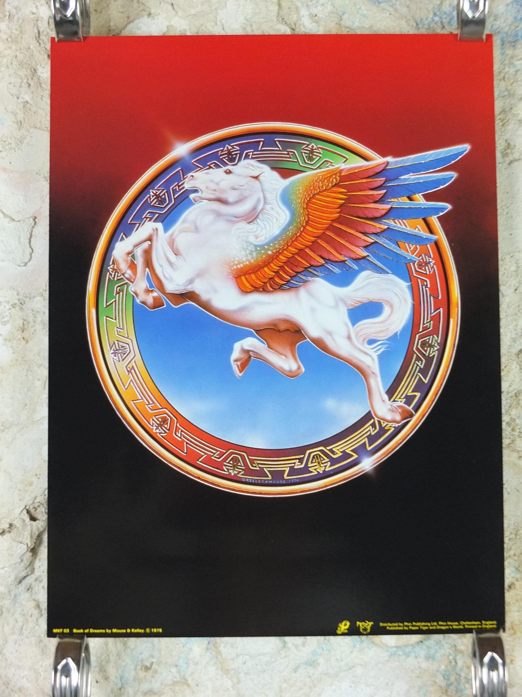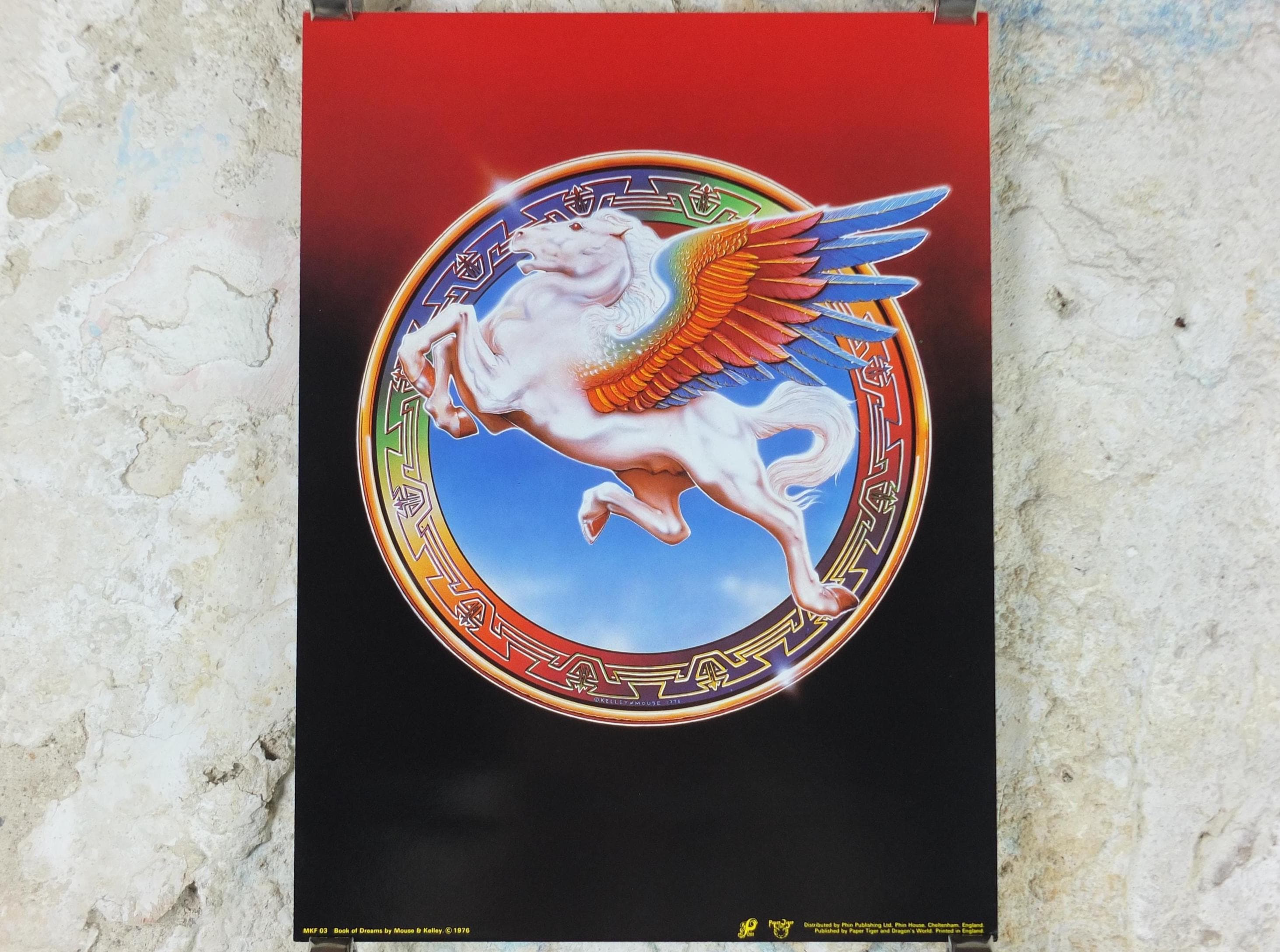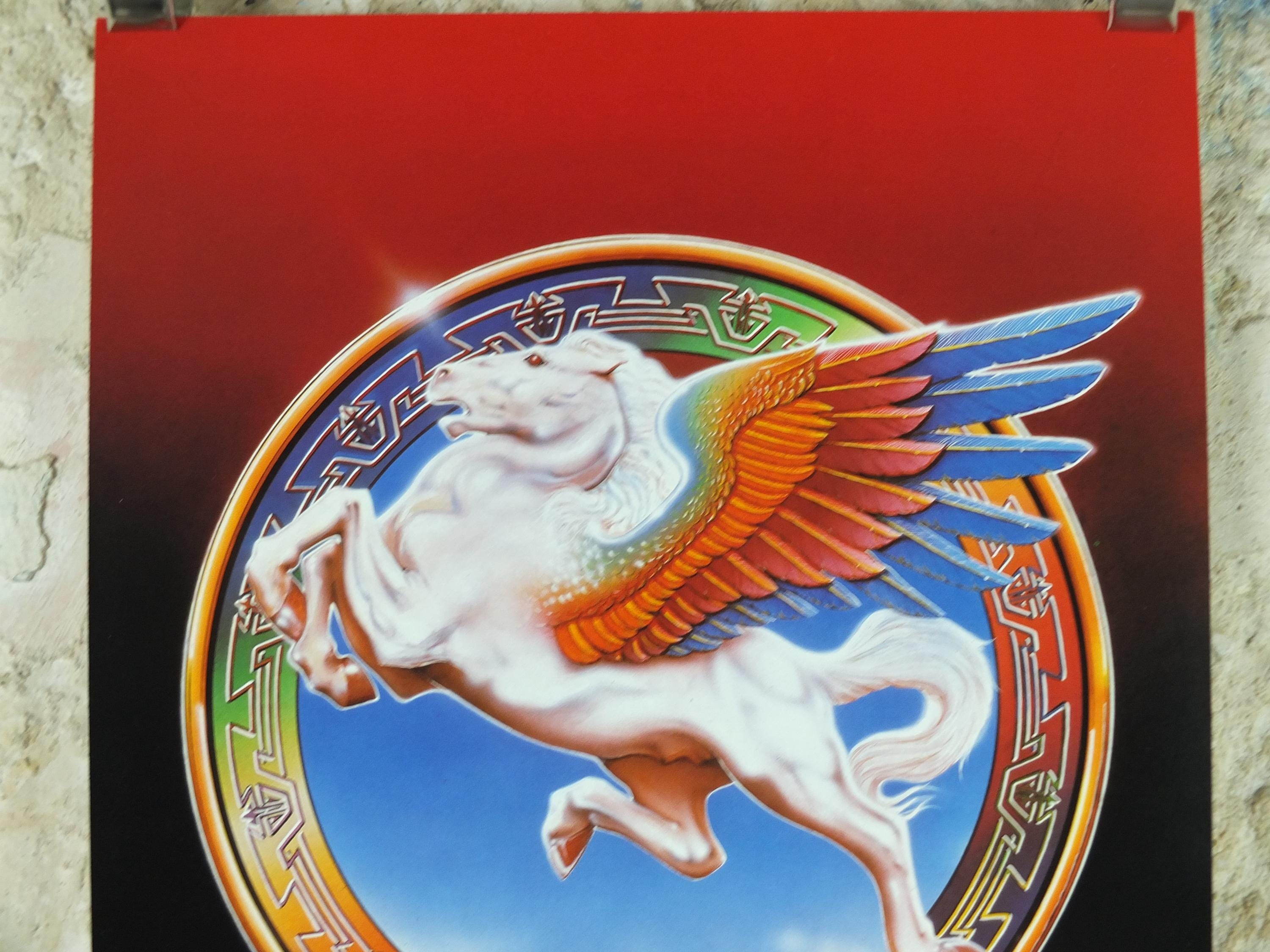 This is a 1976 poster of the Steve Miller Band. It depicts a Pegasus or winged horse within a circular, ornate frame, set against a background that fades from red at the top to black at the bottom, with a blue sky visible behind the horse.