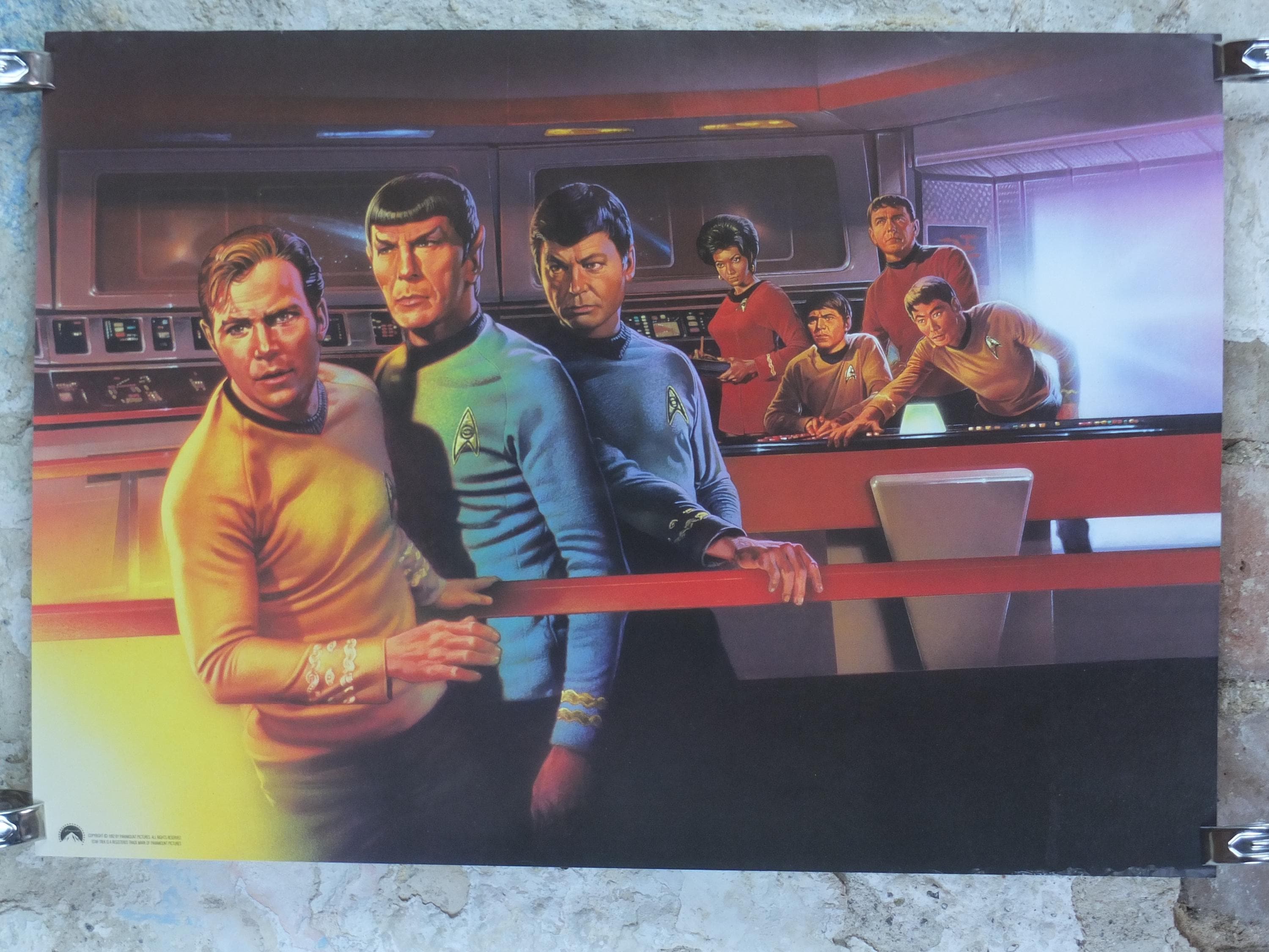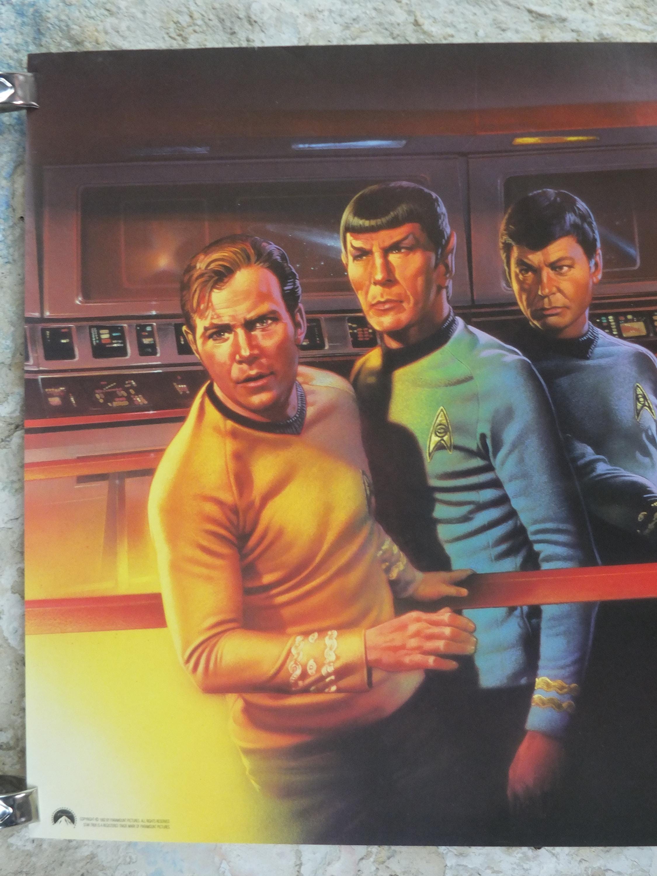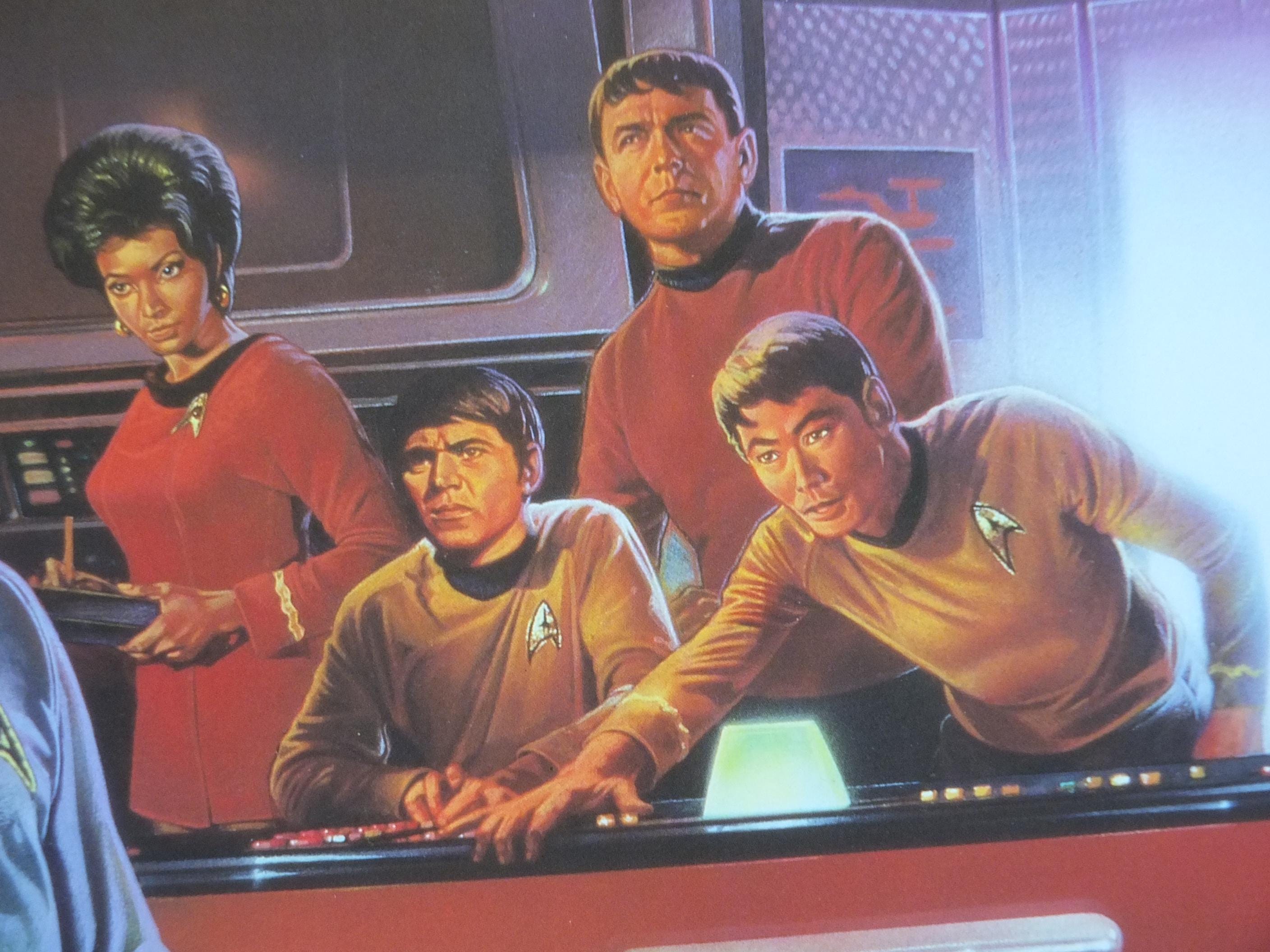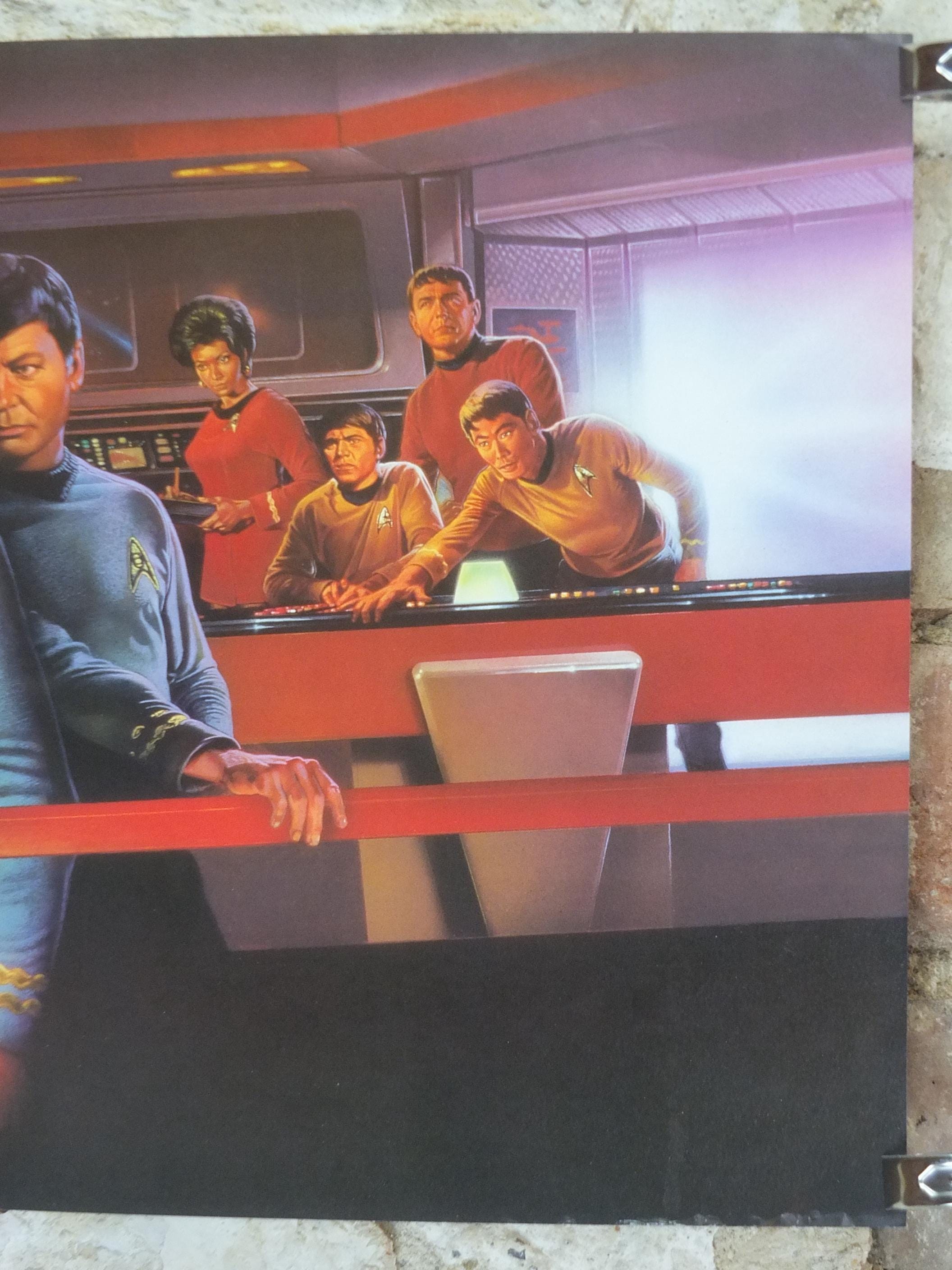 This is Drew Struzan's rendition of the crew of the USS Enterprise from the original Star Trek series from 1992. These science fiction posters were made to commemorate the 25th anniversary of the original Star Trek television show and were available to those who purchased Star Trek VHS tapes.