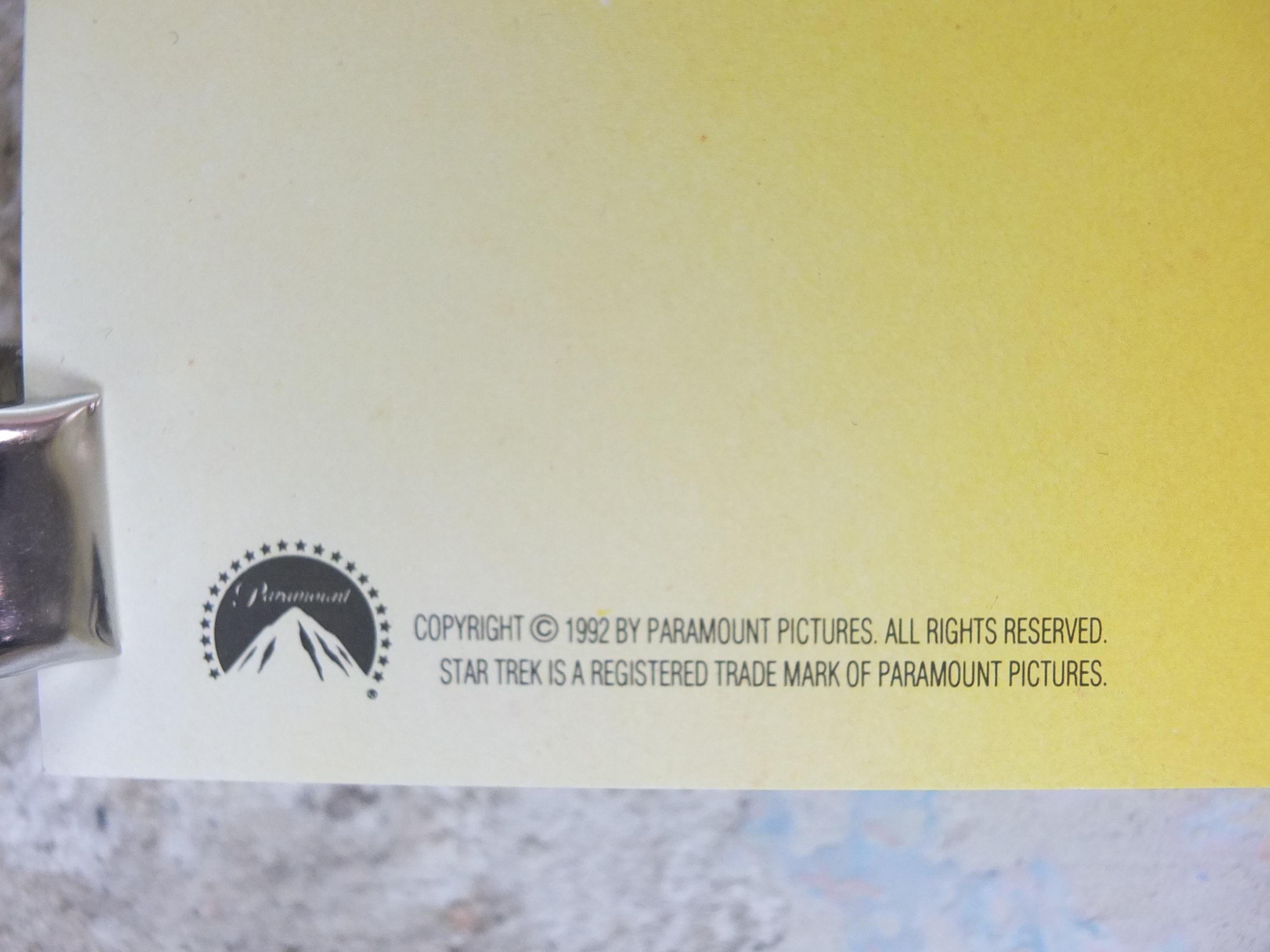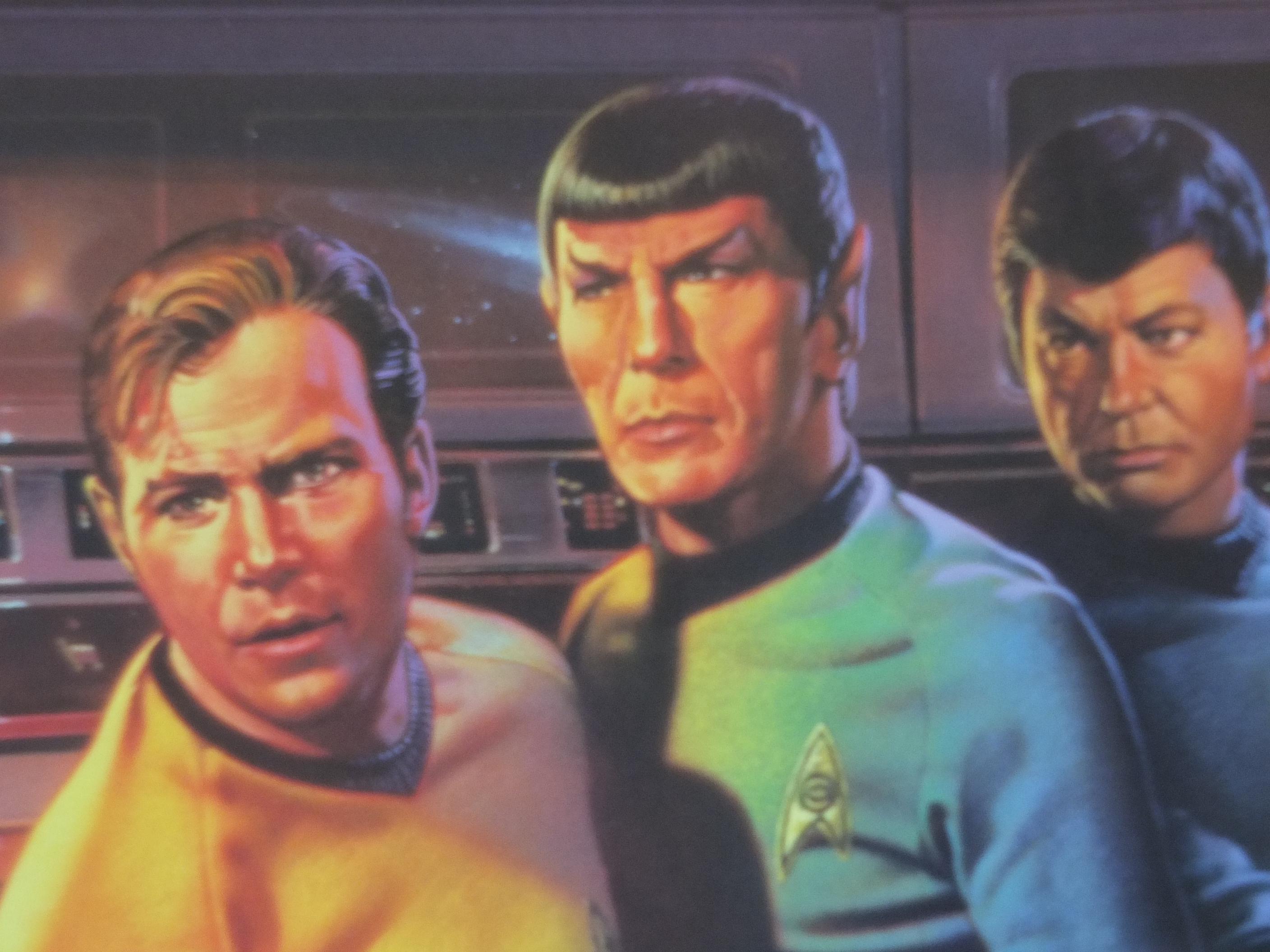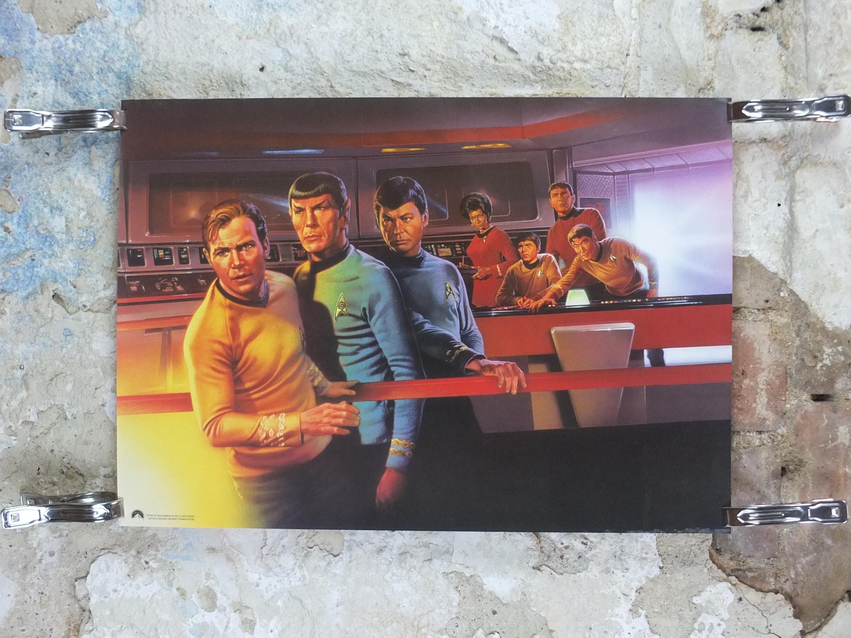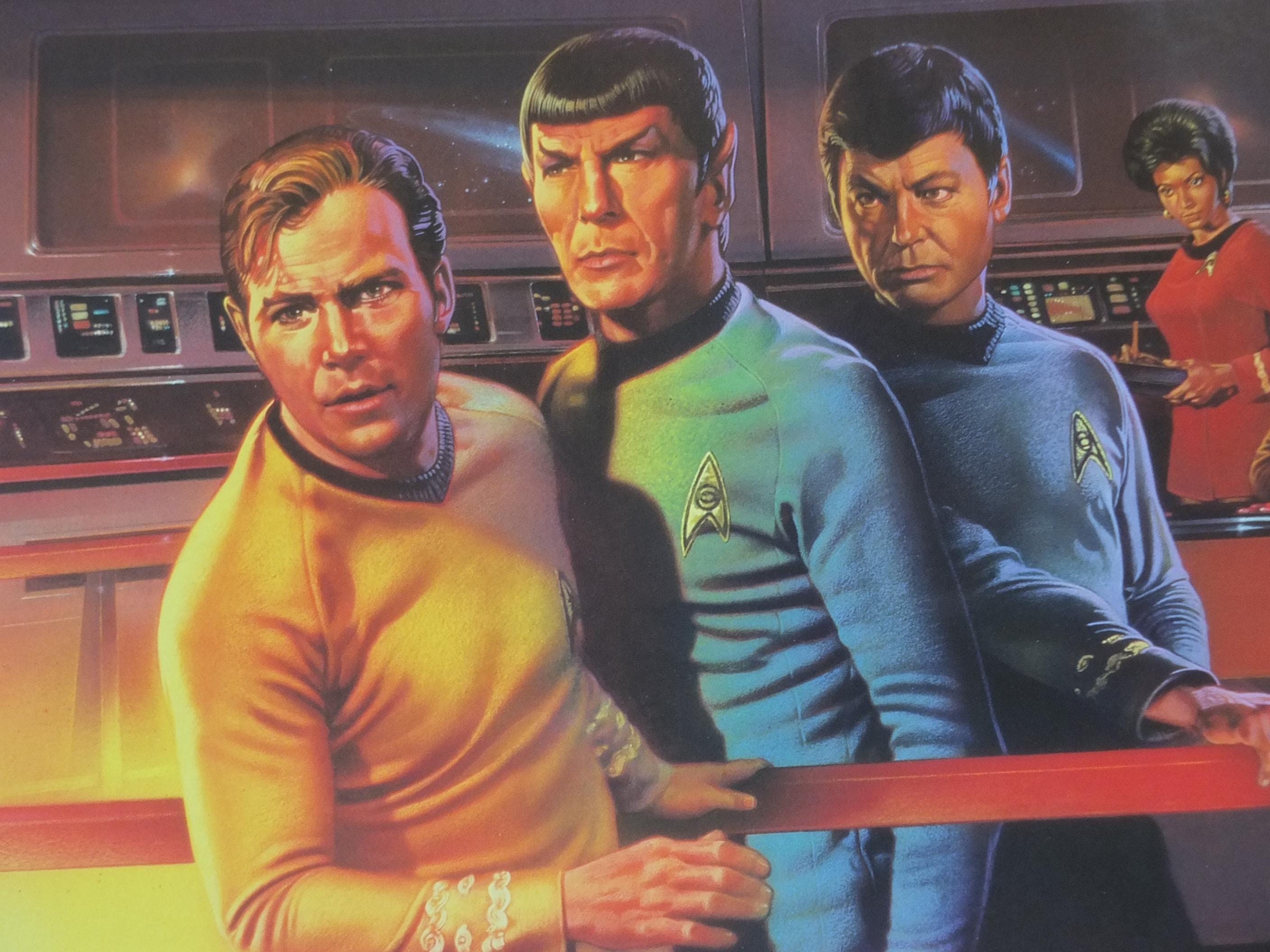 This is Drew Struzan's rendition of the crew of the USS Enterprise from the original Star Trek series from 1992. These science fiction posters were made to commemorate the 25th anniversary of the original Star Trek television show and were available to those who purchased Star Trek VHS tapes.