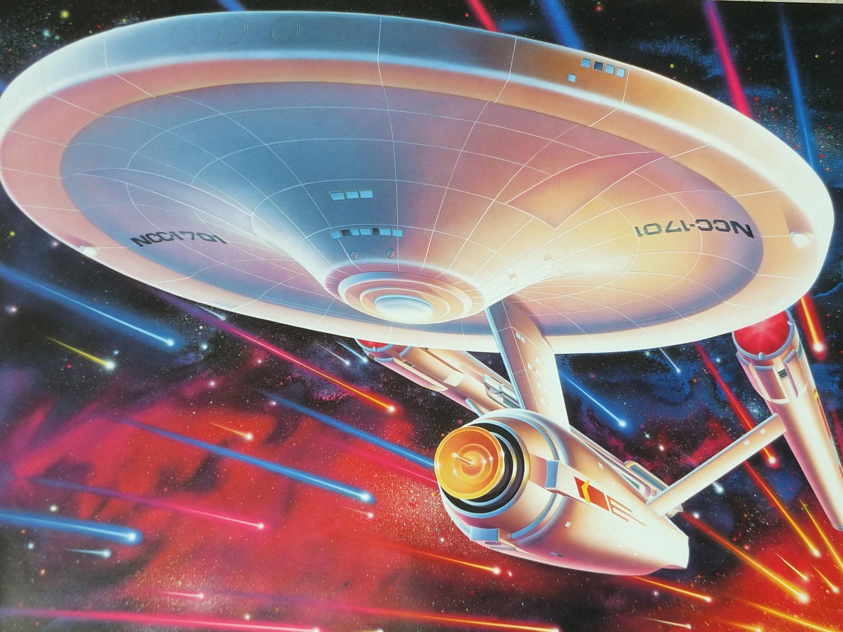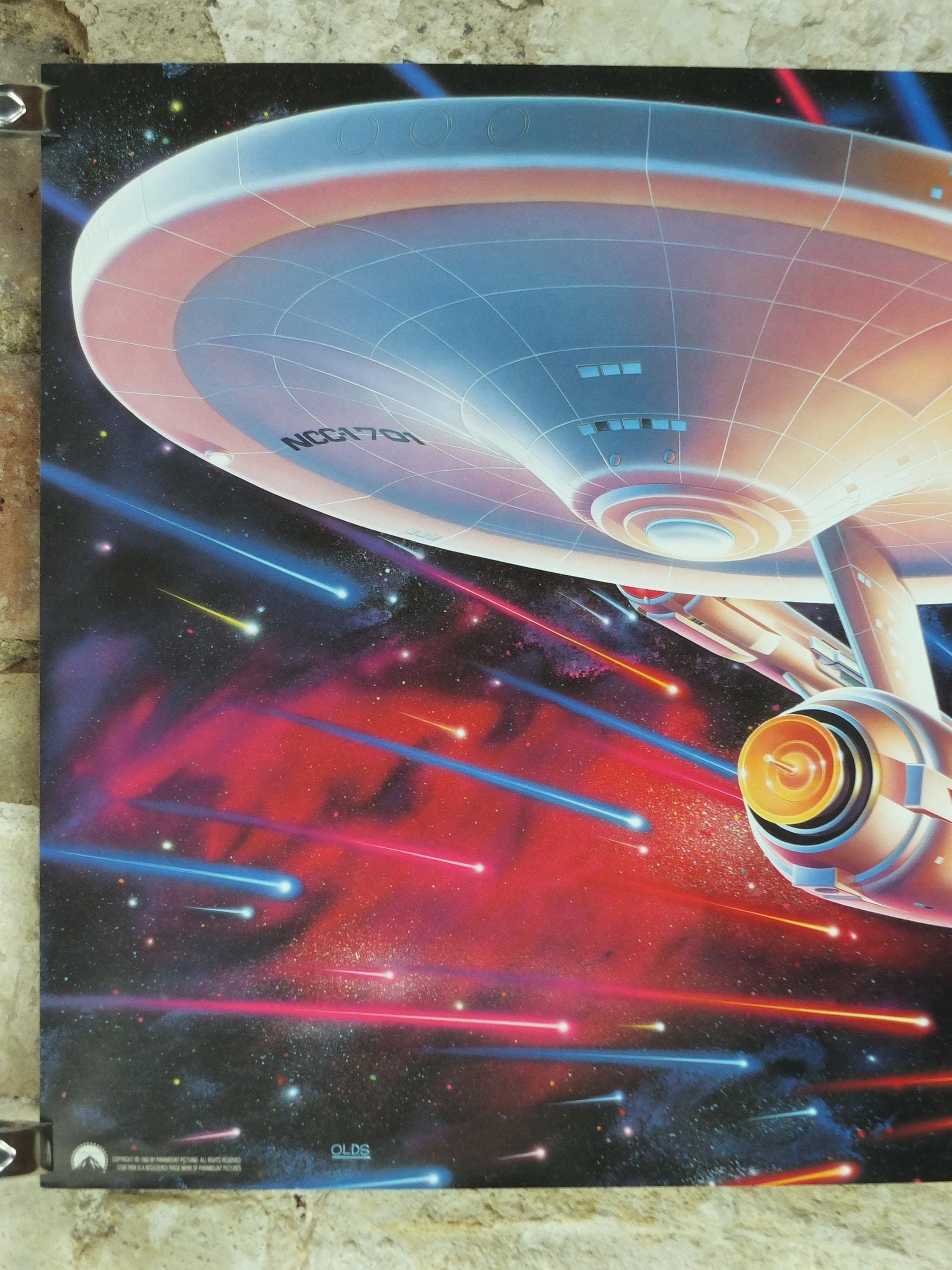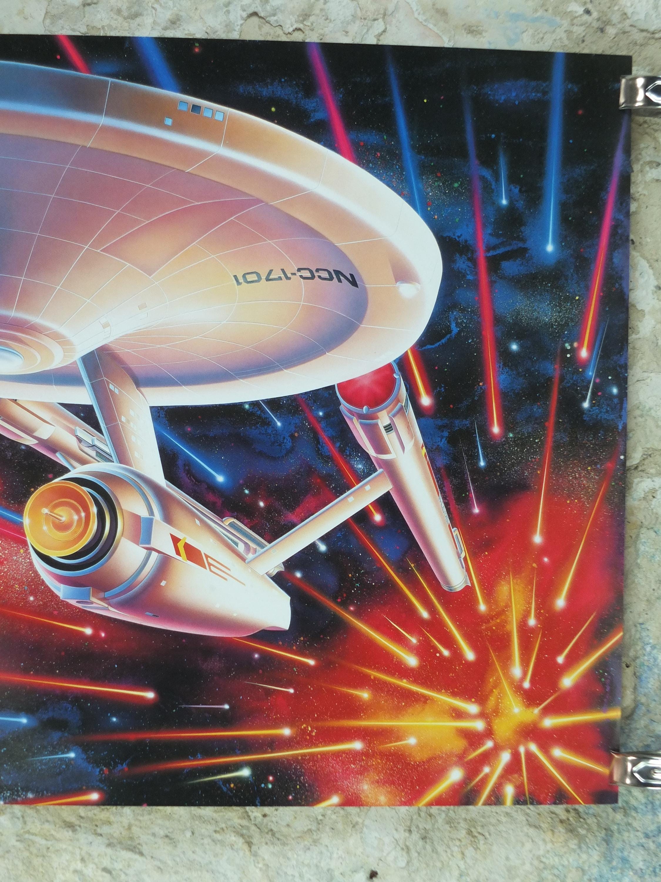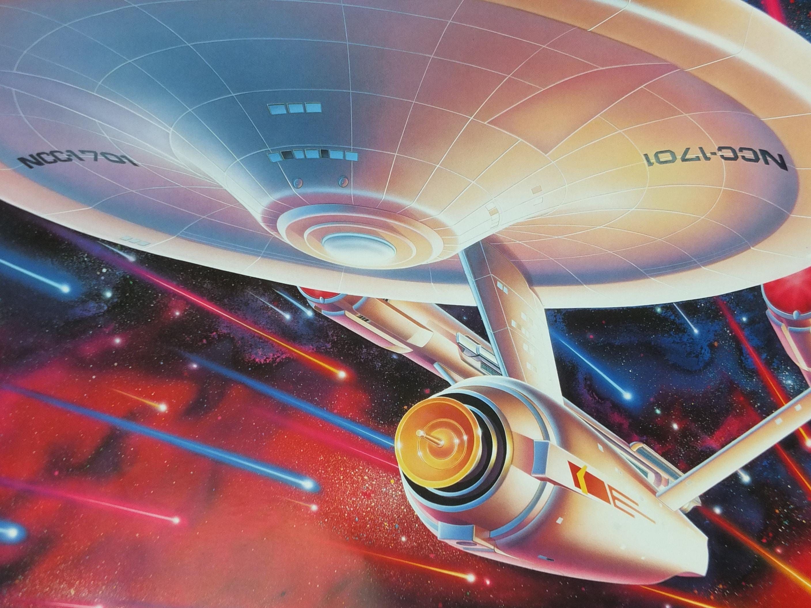This is Drew Struzan's rendition of the the USS Enterprise from the original Star Trek series from 1992. These science fiction posters were made to commemorate the 25th anniversary of the original Star Trek television show and were available to those who purchased Star Trek VHS tapes.